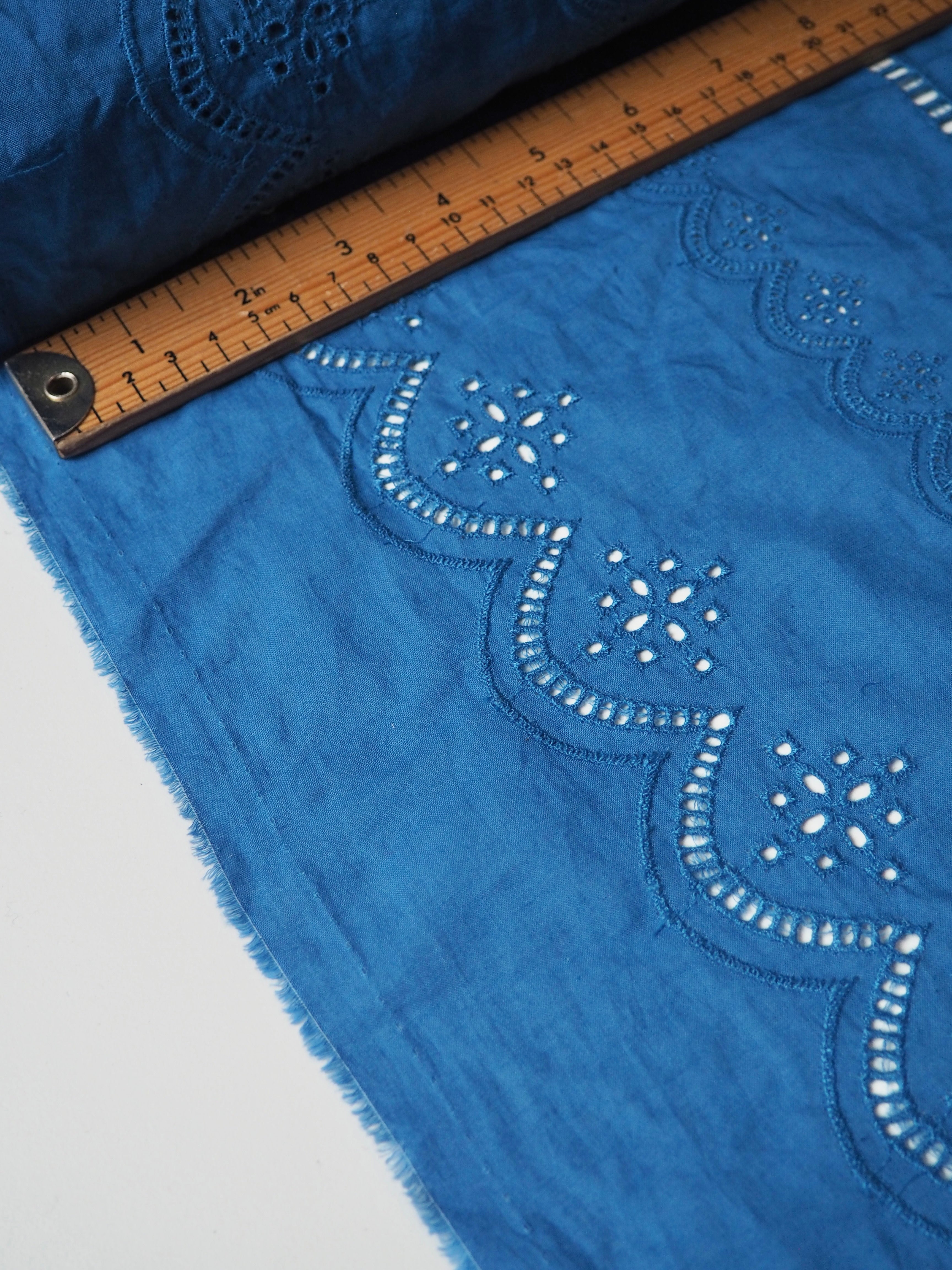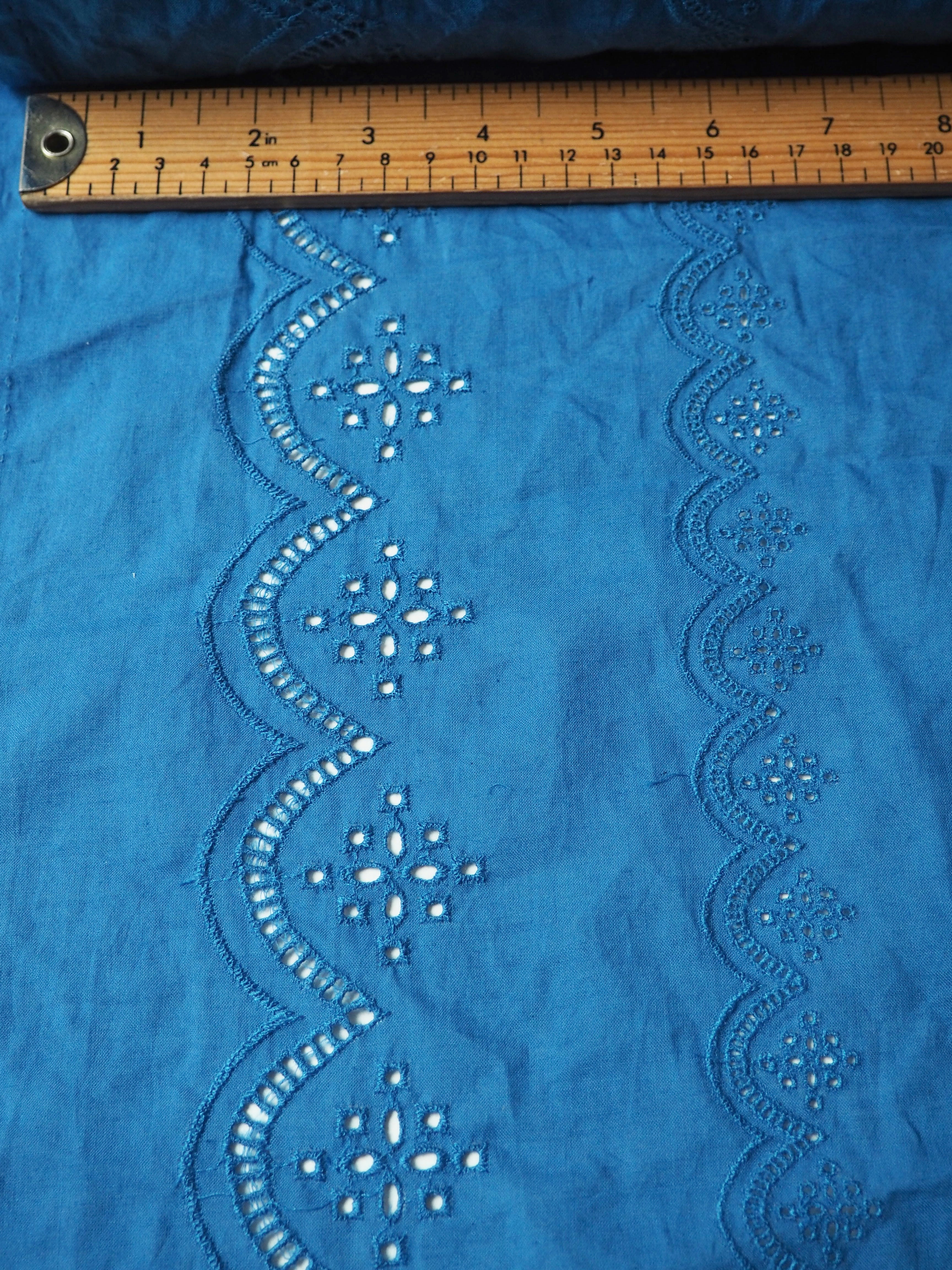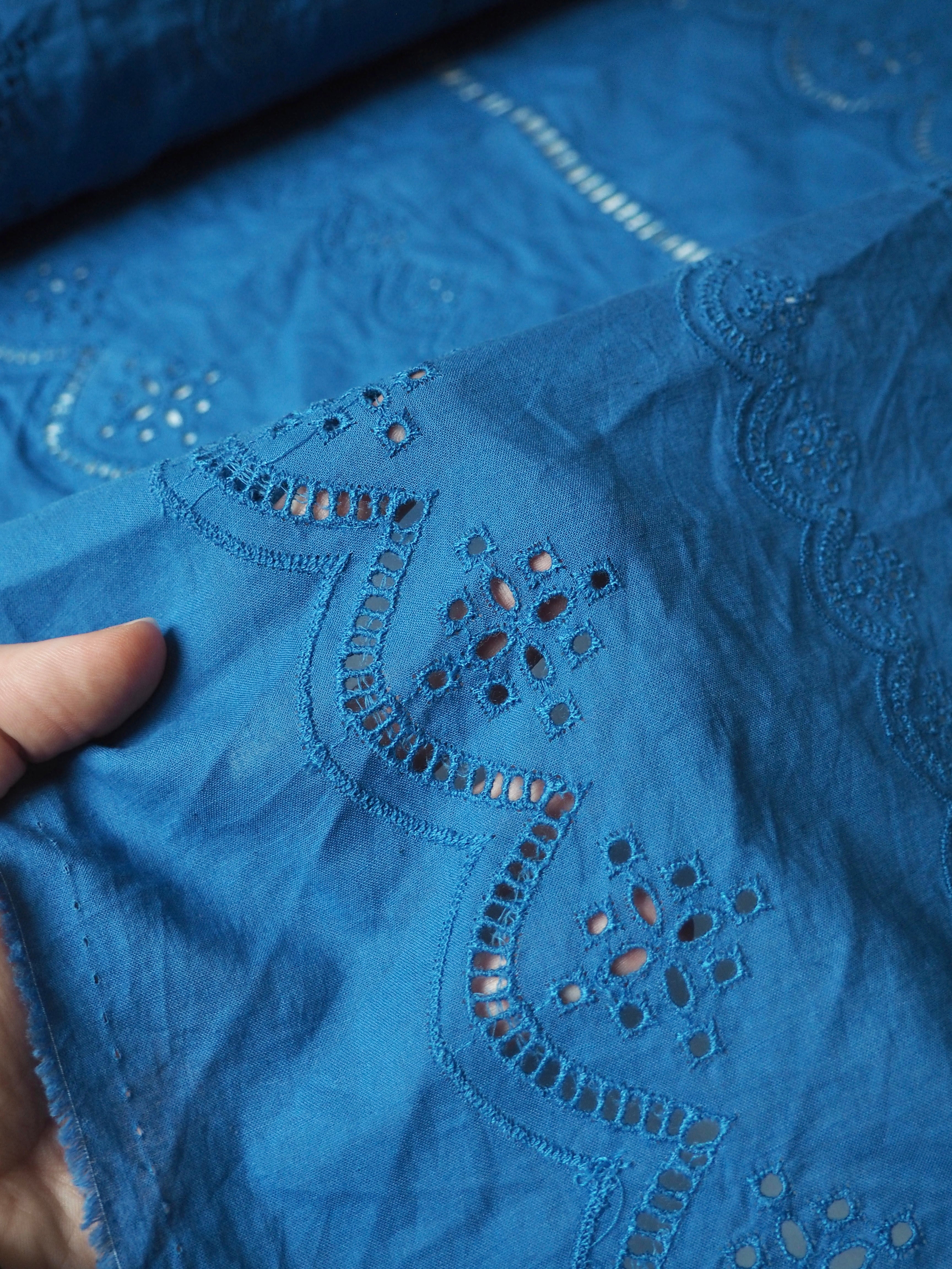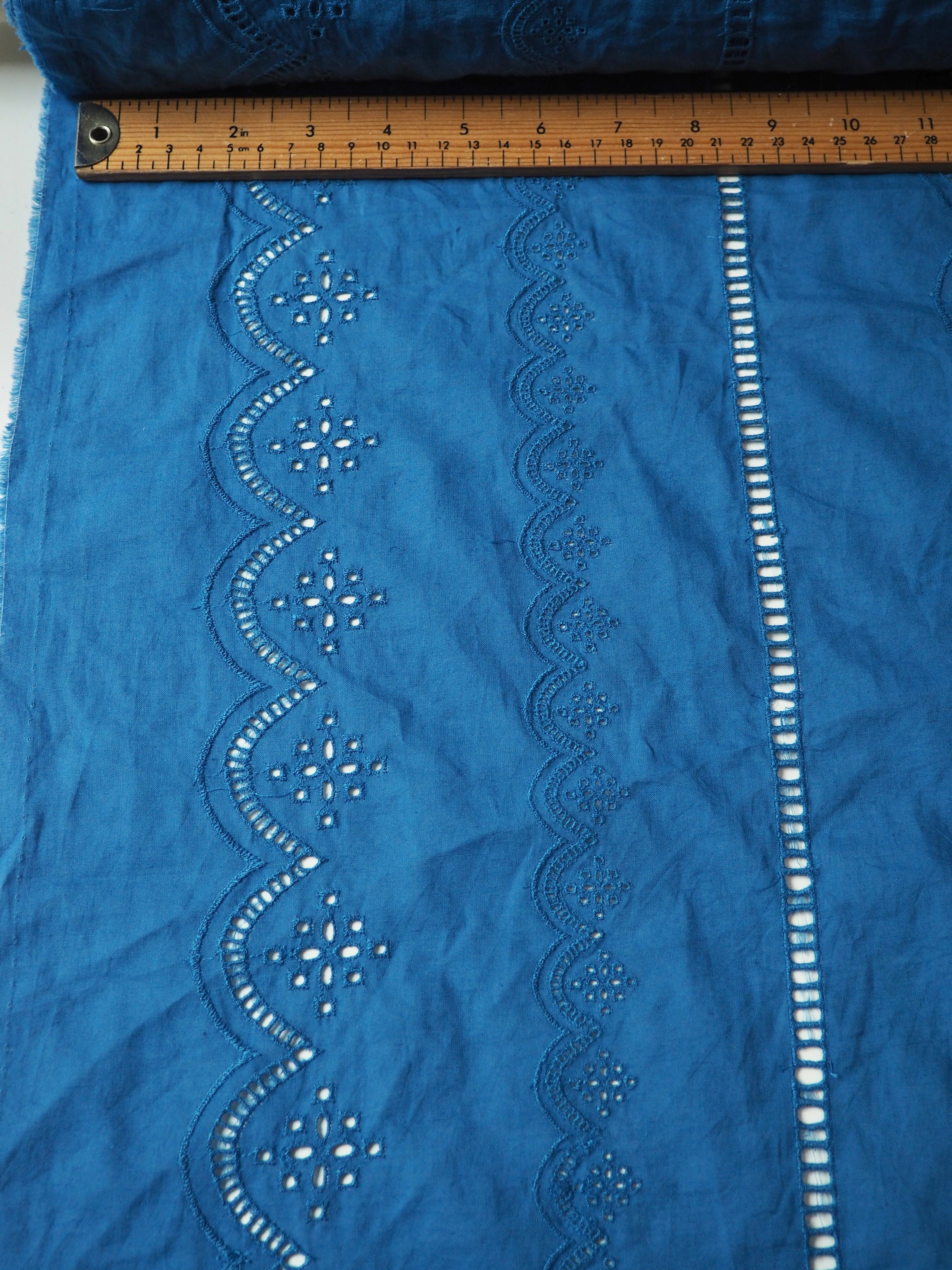 This ex-designer fabric is an embroidered cotton. This lovely cloth is embroidered in stripes with scalloping and straight detail with blue on blue. Lightweight, with a super soft handle. Embroidered sections create a sheer finish that might need lining. Drapes beautifully! Would look great as a simple top or Everyday Dress to show off the design!