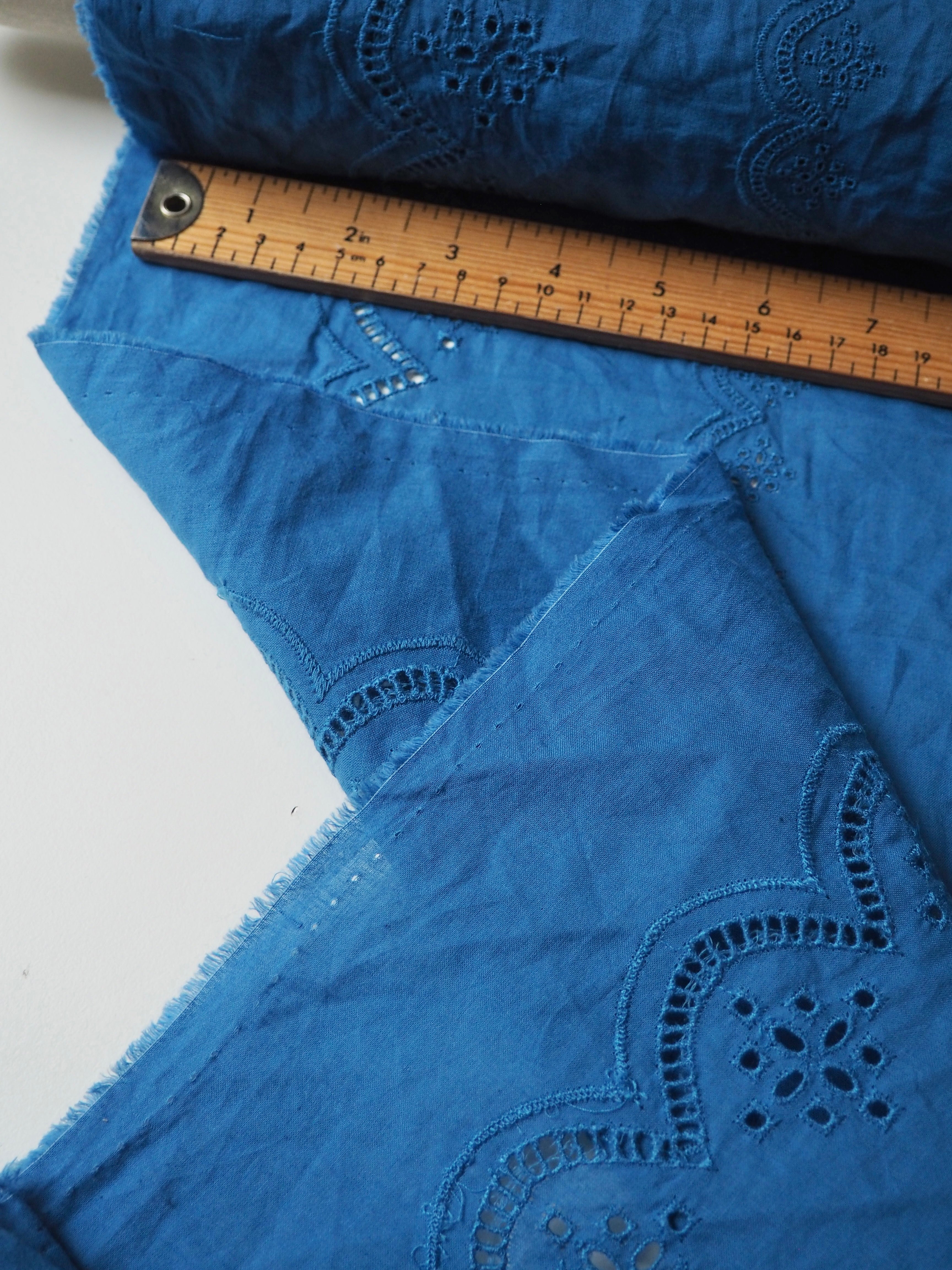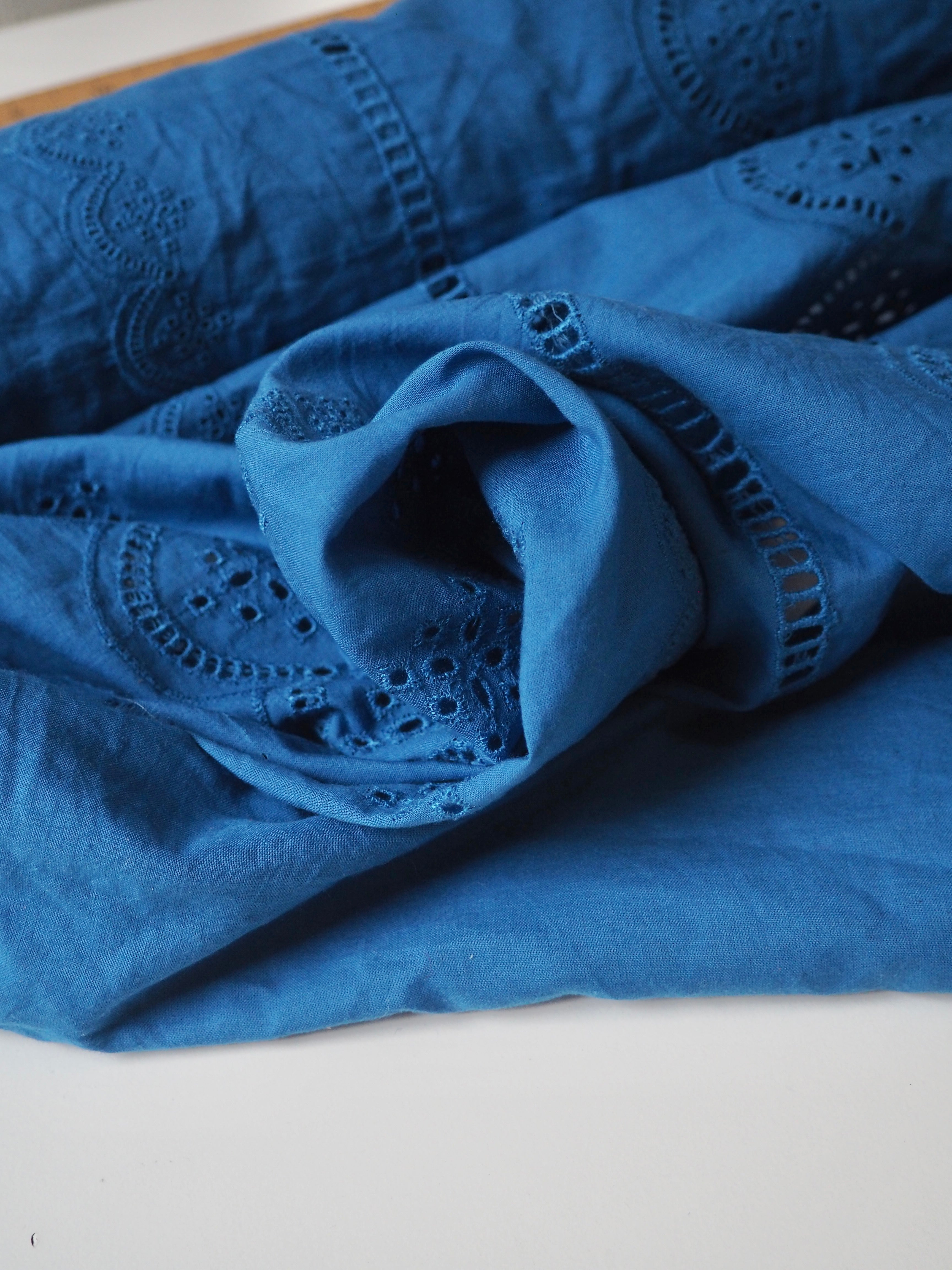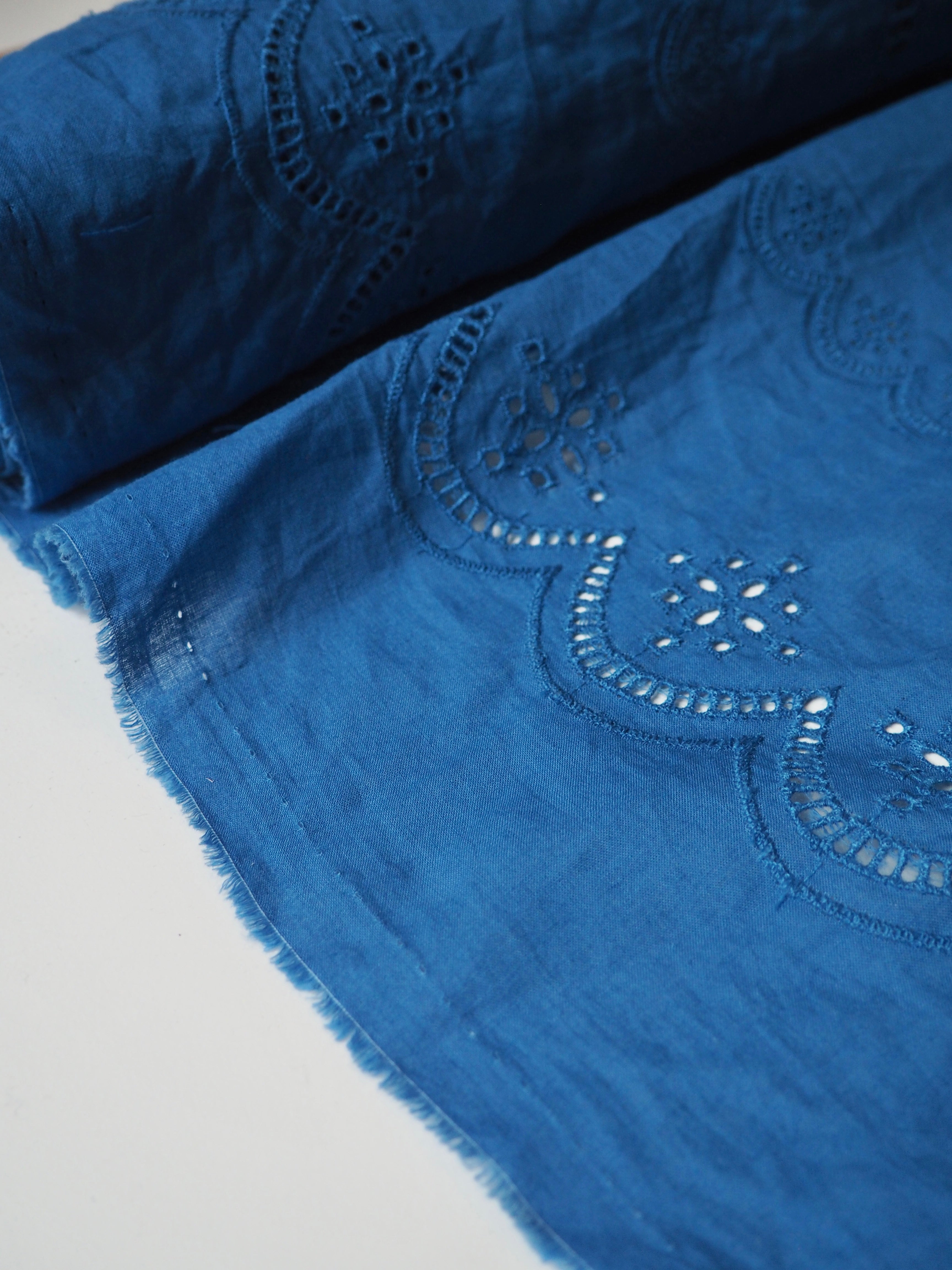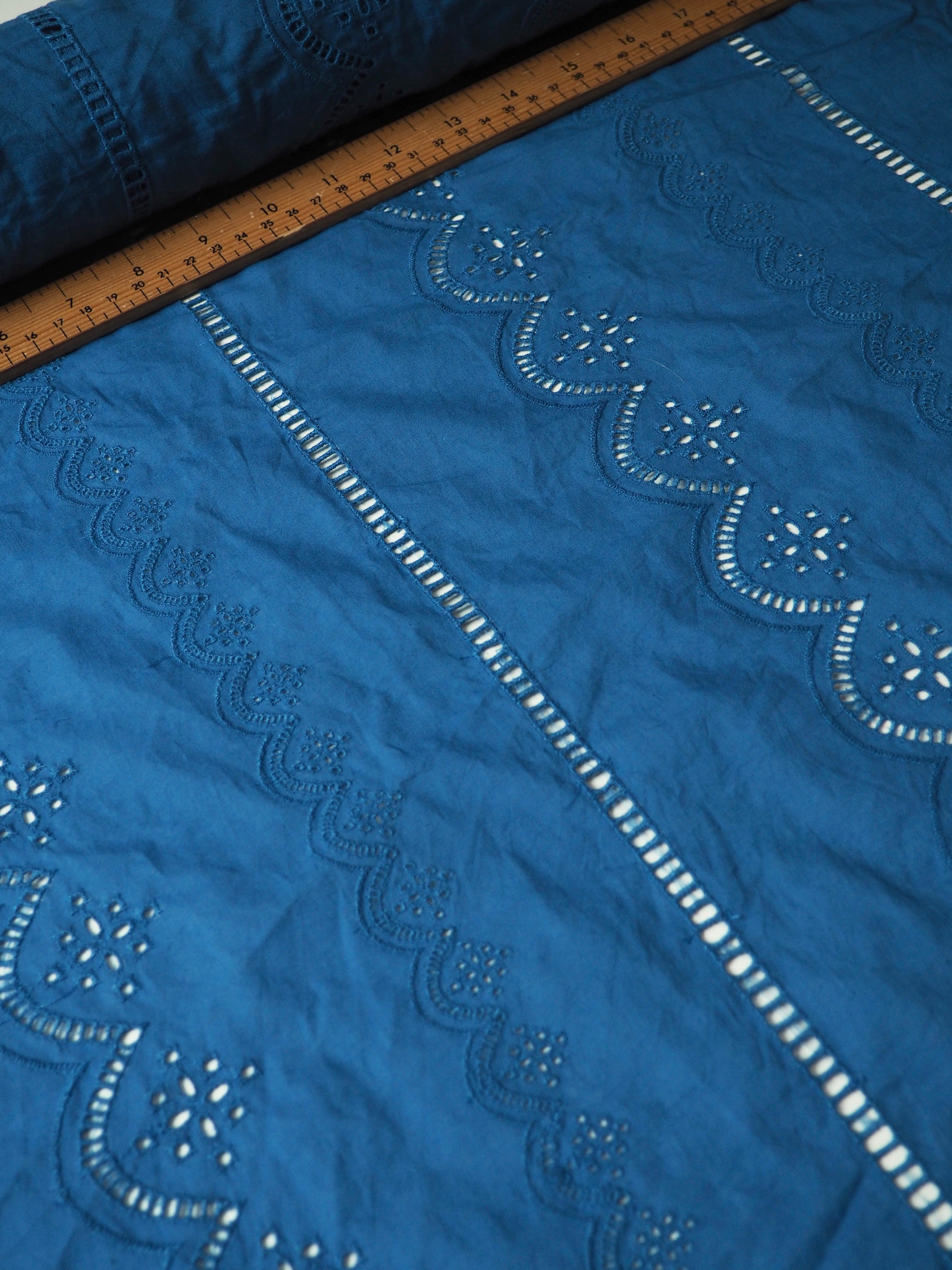 This ex-designer fabric is an embroidered cotton. This lovely cloth is embroidered in stripes with scalloping and straight detail with blue on blue. Lightweight, with a super soft handle. Embroidered sections create a sheer finish that might need lining. Drapes beautifully! Would look great as a simple top or Everyday Dress to show off the design!