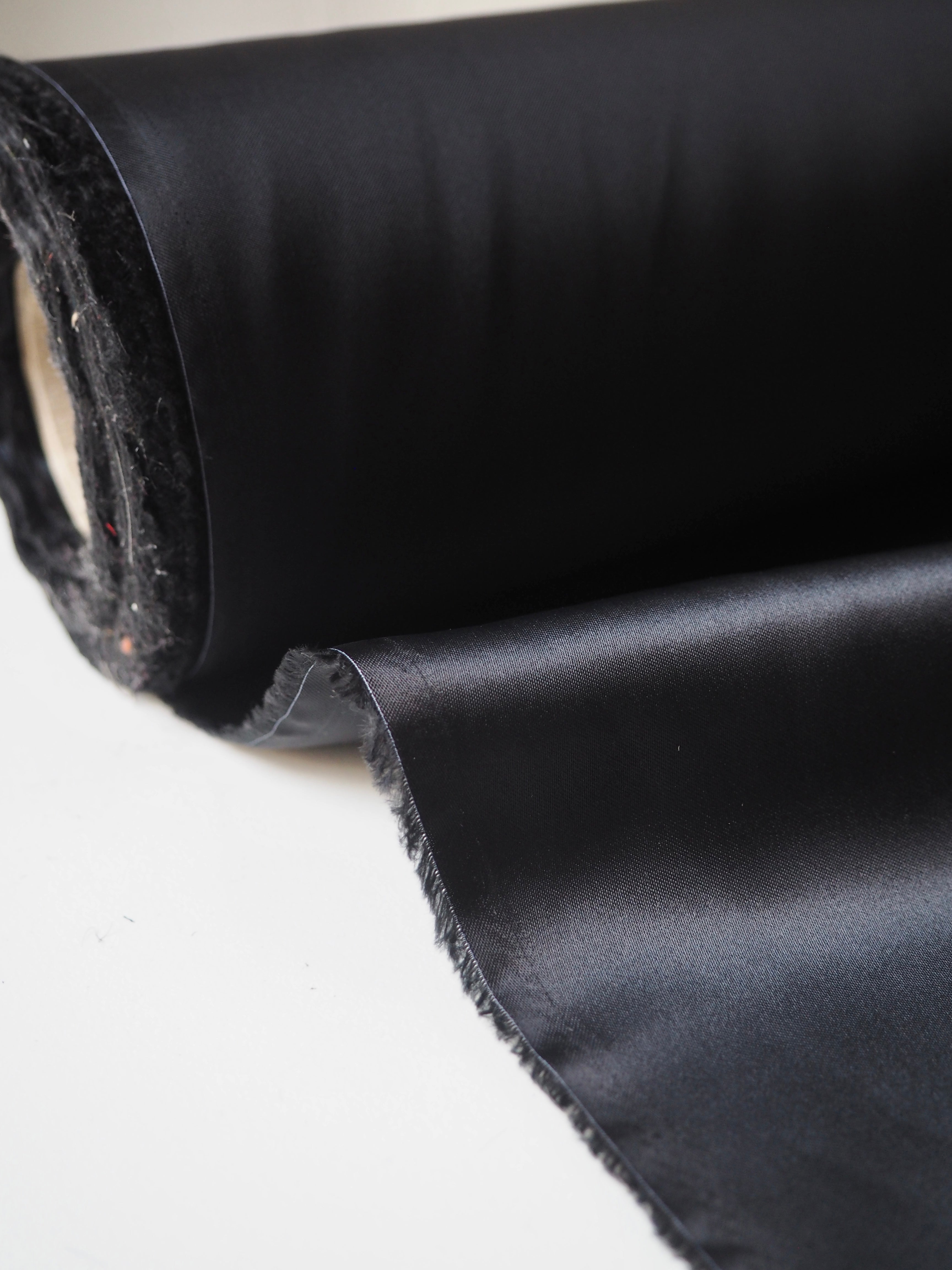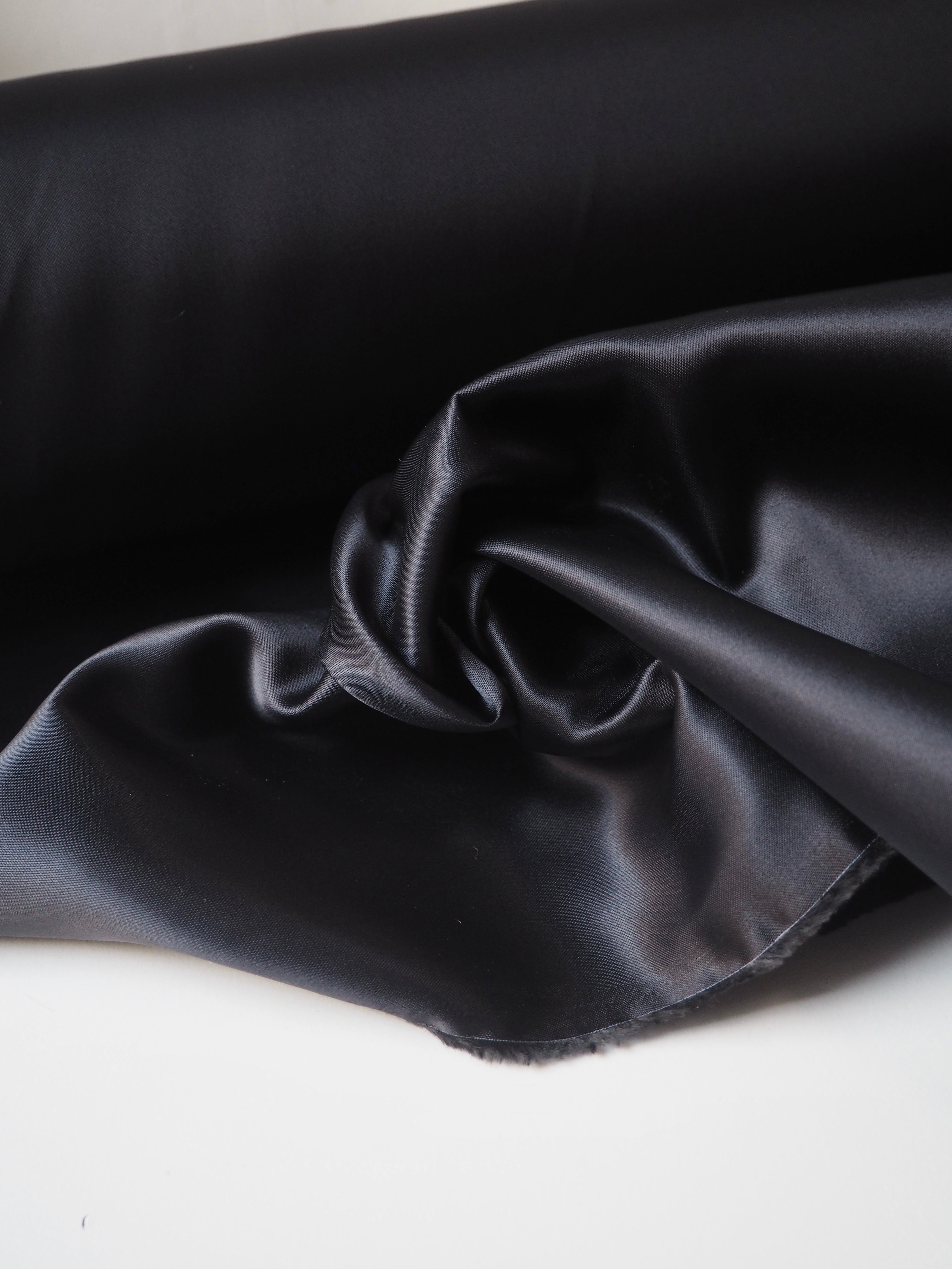 This ex-designer fabric is a lining. It has a satin weave with a gentle drape. Lightweight with beautiful movement and medium bright sheen finish. Hold shape well, has a nice light structure. Fully opaque. In a deep blueish grey shade. Ideal for lining any garment!