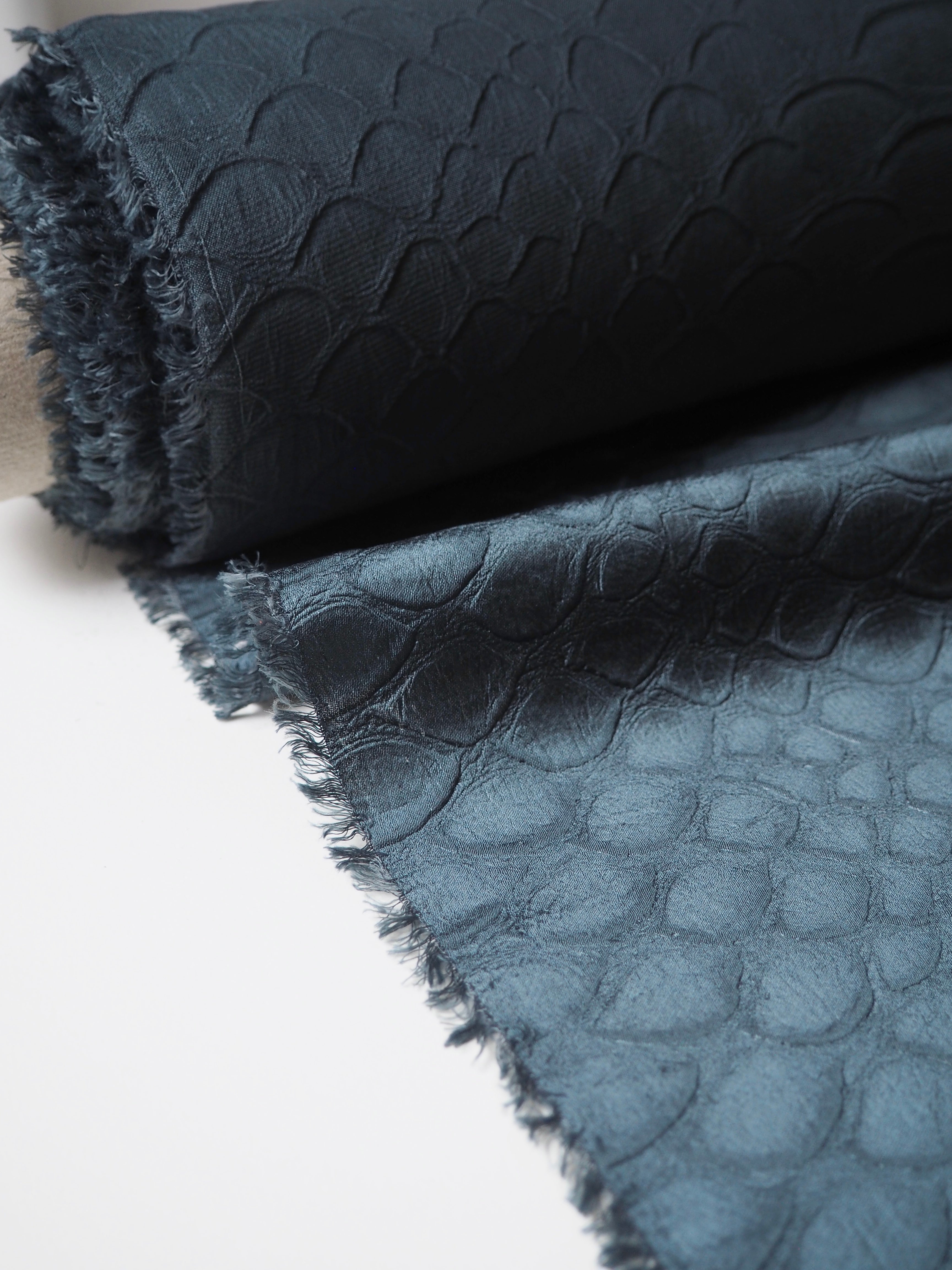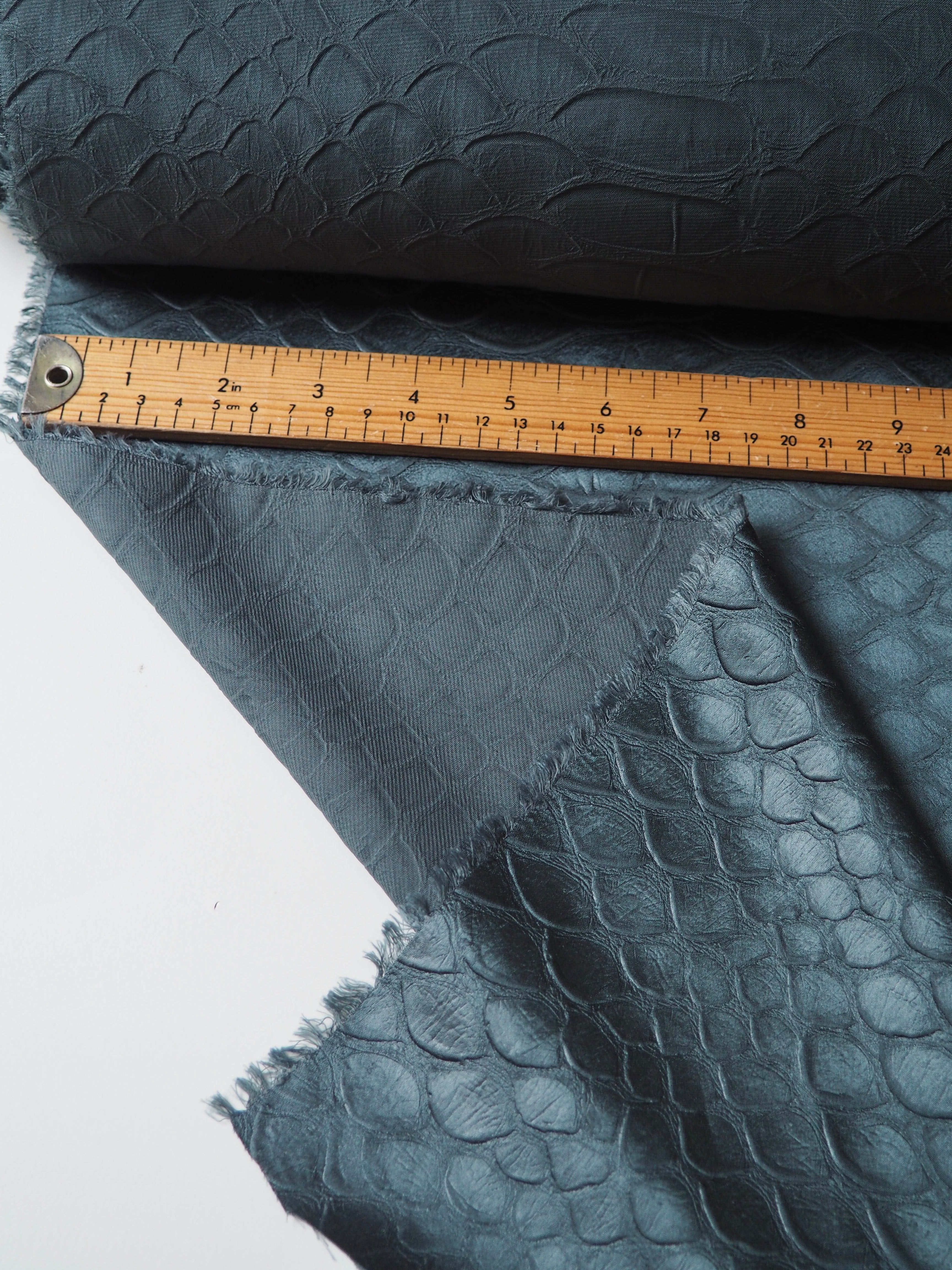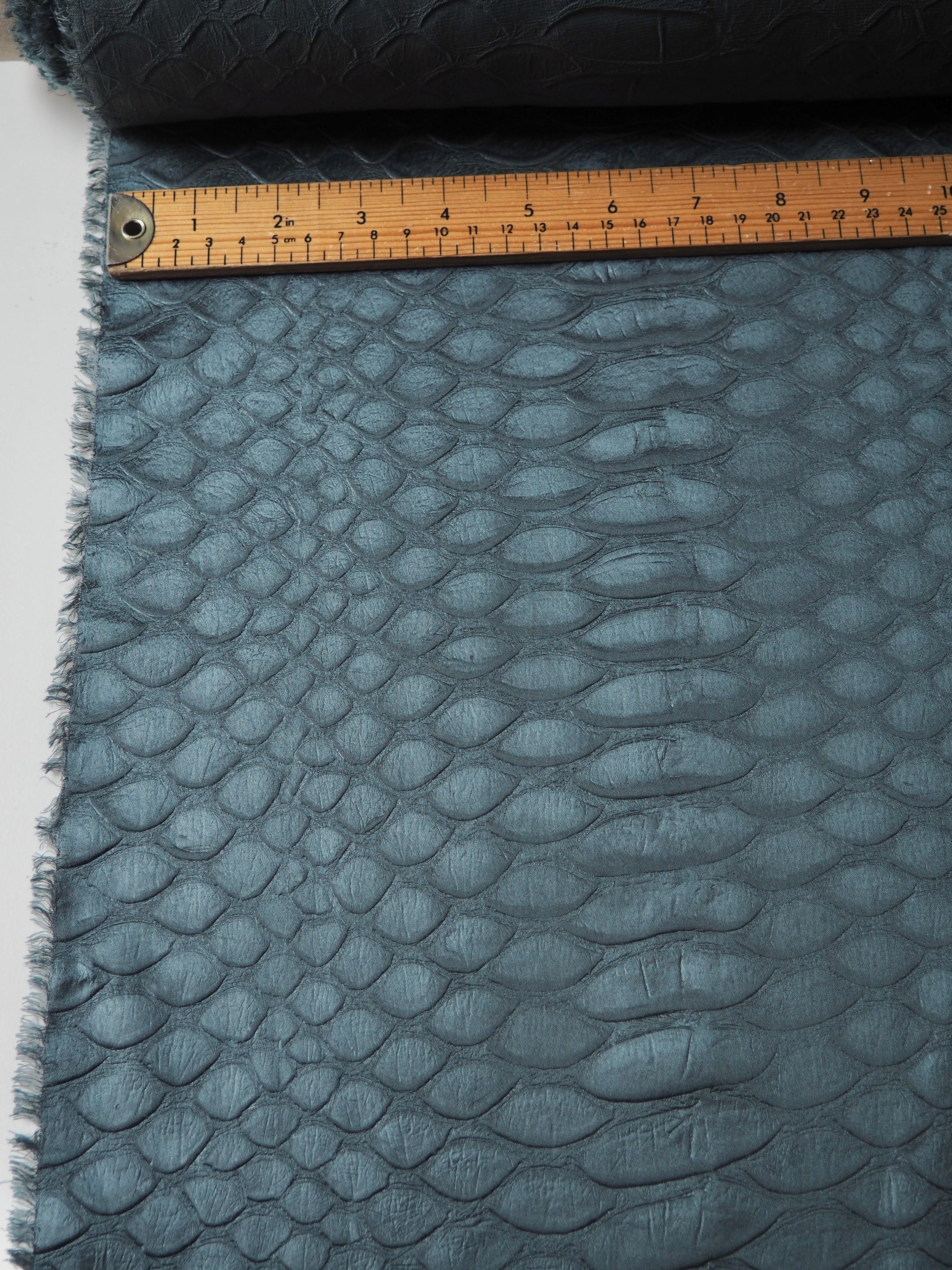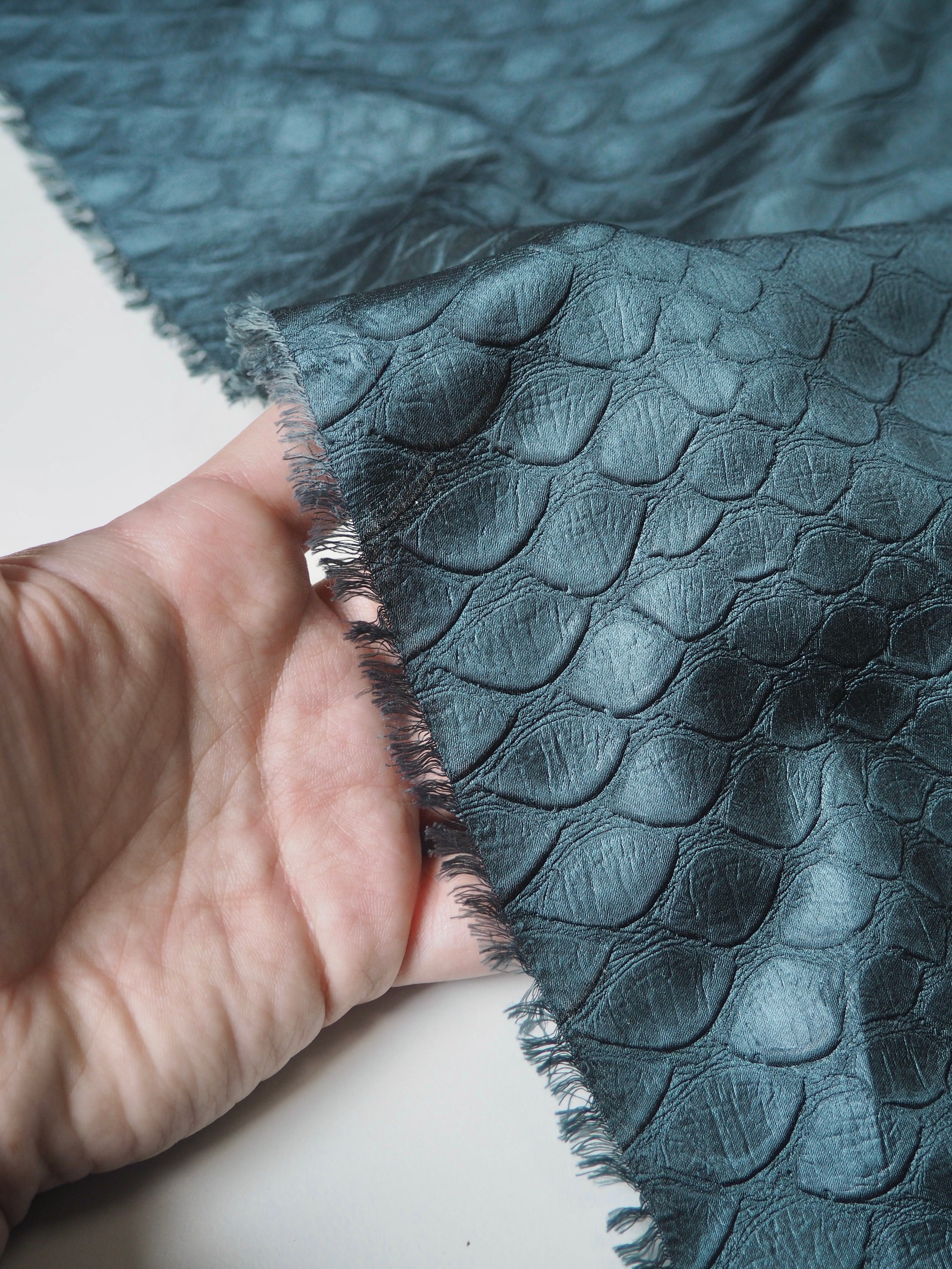 This ex-designer fabric is a unique cloth! It's a green polyester, with an armadillo embossed texture in repeating pattern. It has a medium shine, with a fantastic texture. Has a soft handle and great drape. Opaque and super lightweight. Perfect for a top or dress!