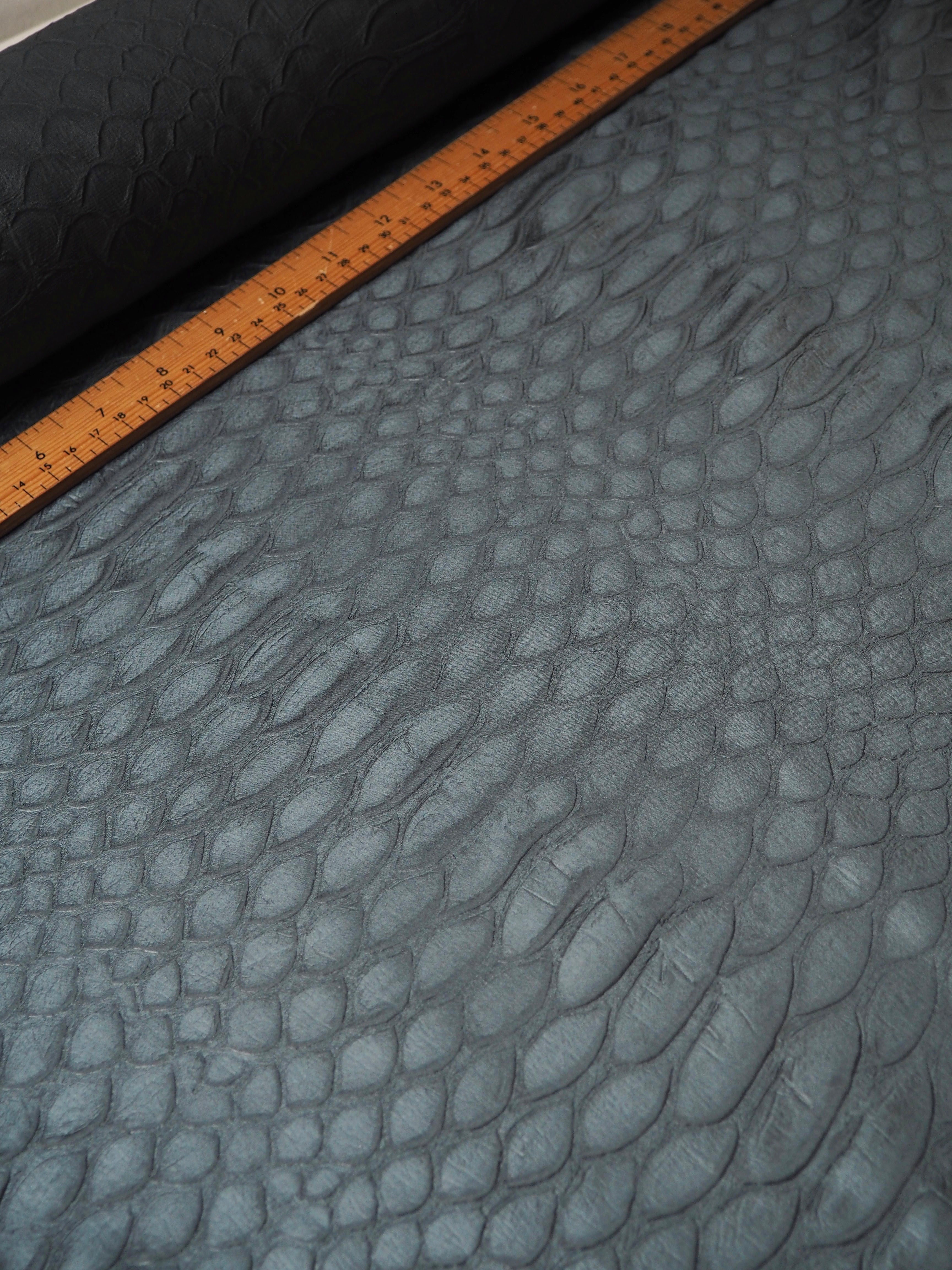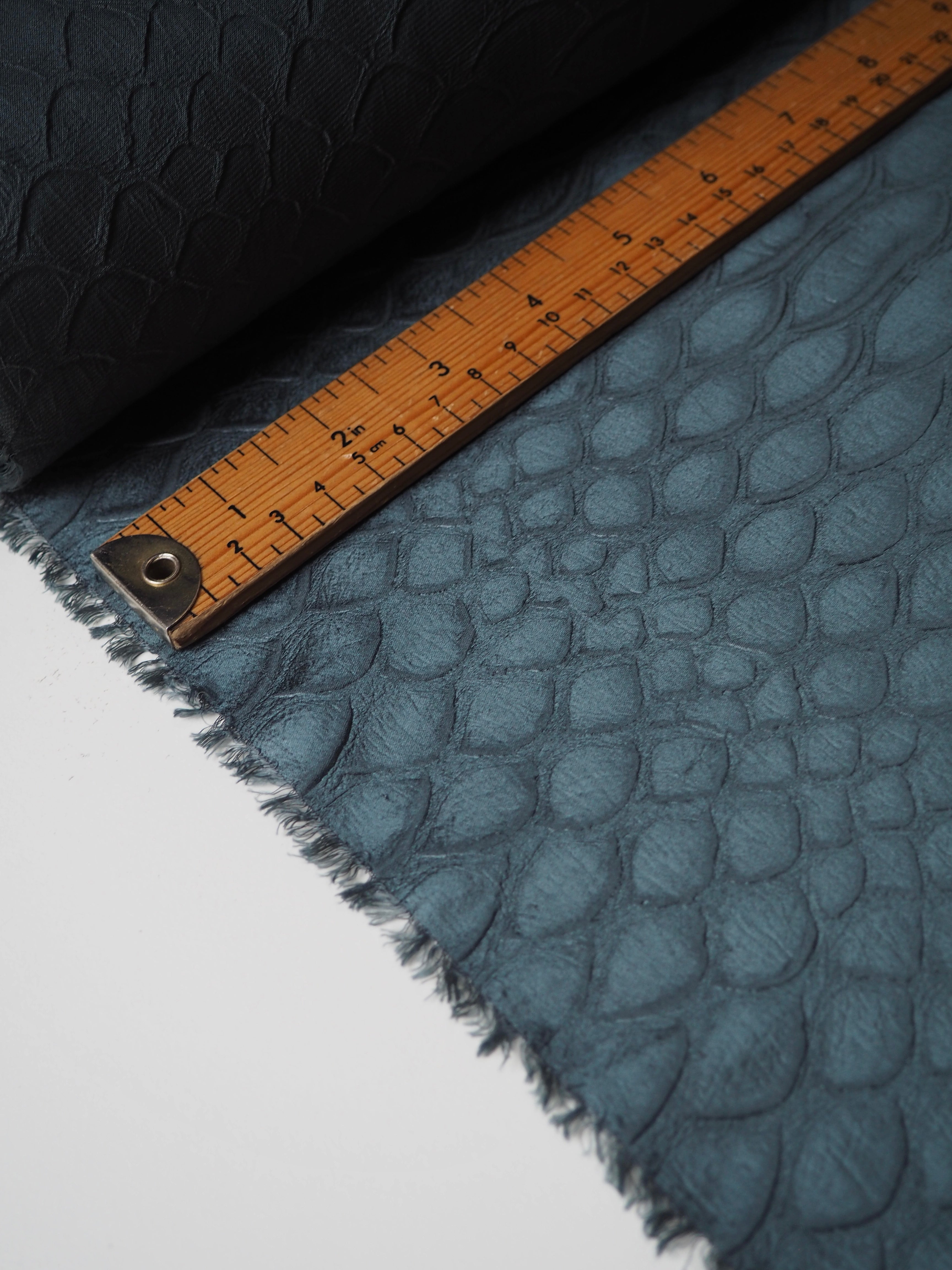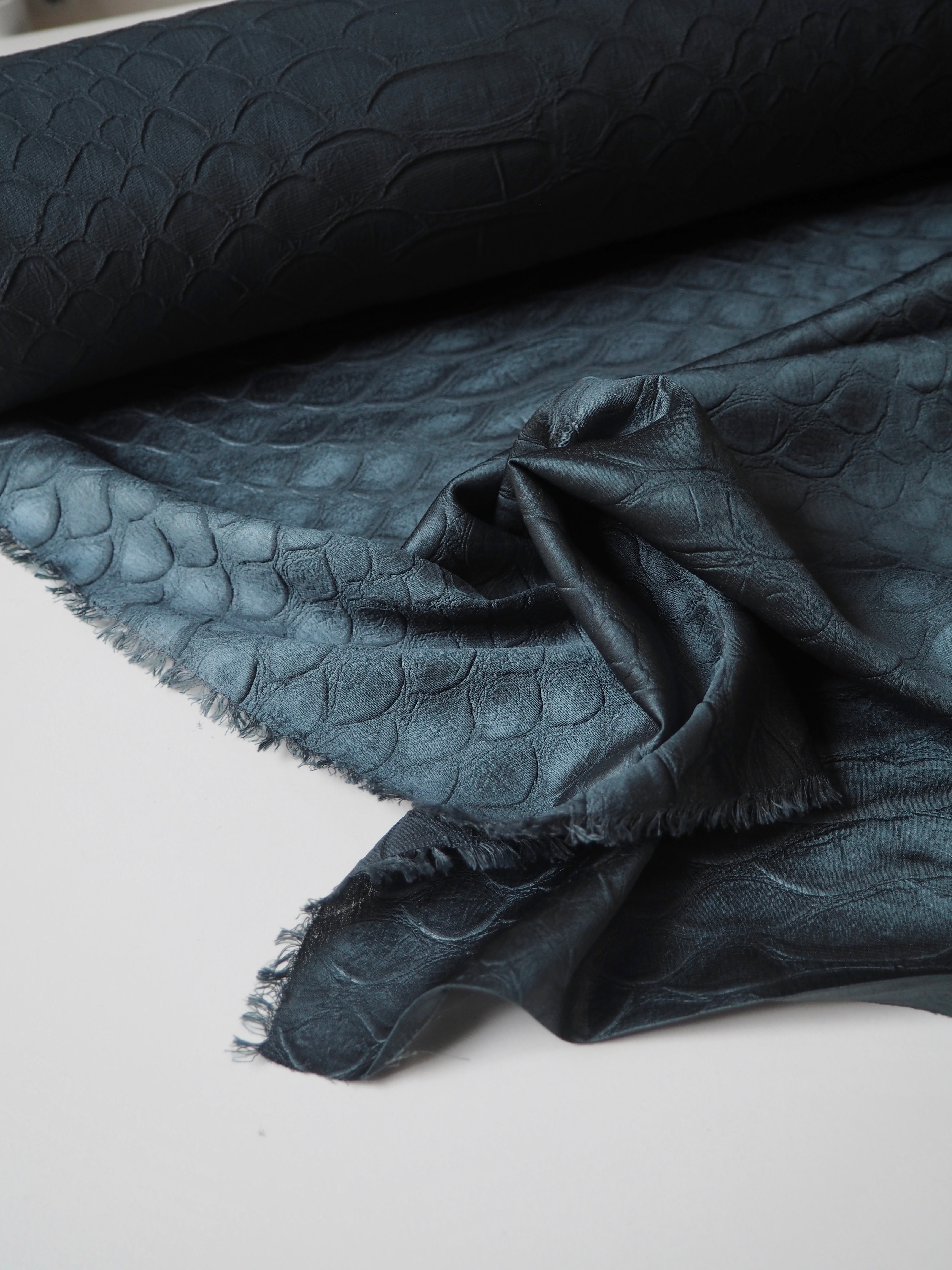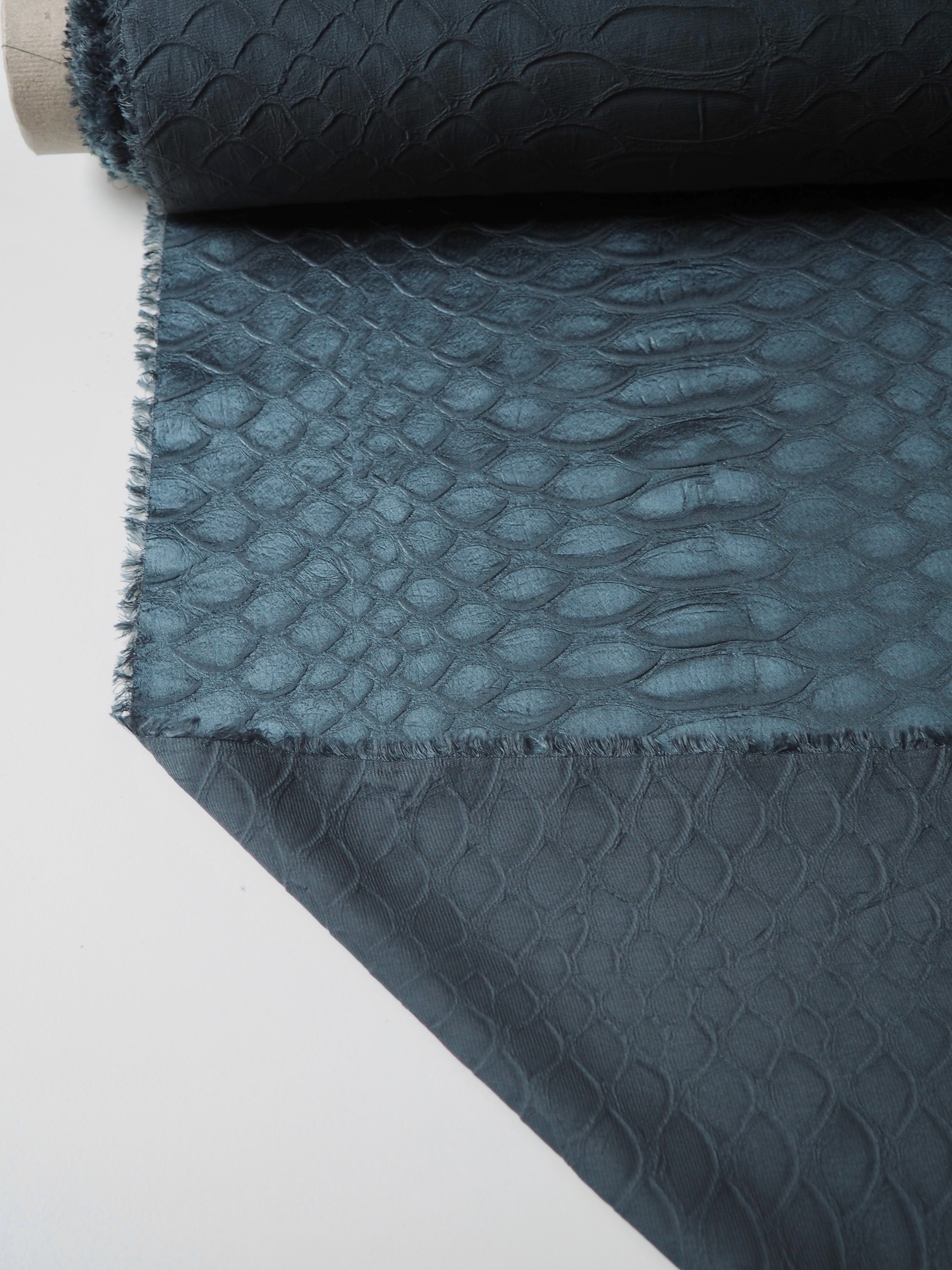 This ex-designer fabric is a unique cloth! It's a green polyester, with an armadillo embossed texture in repeating pattern. It has a medium shine, with a fantastic texture. Has a soft handle and great drape. Opaque and super lightweight. Perfect for a top or dress!