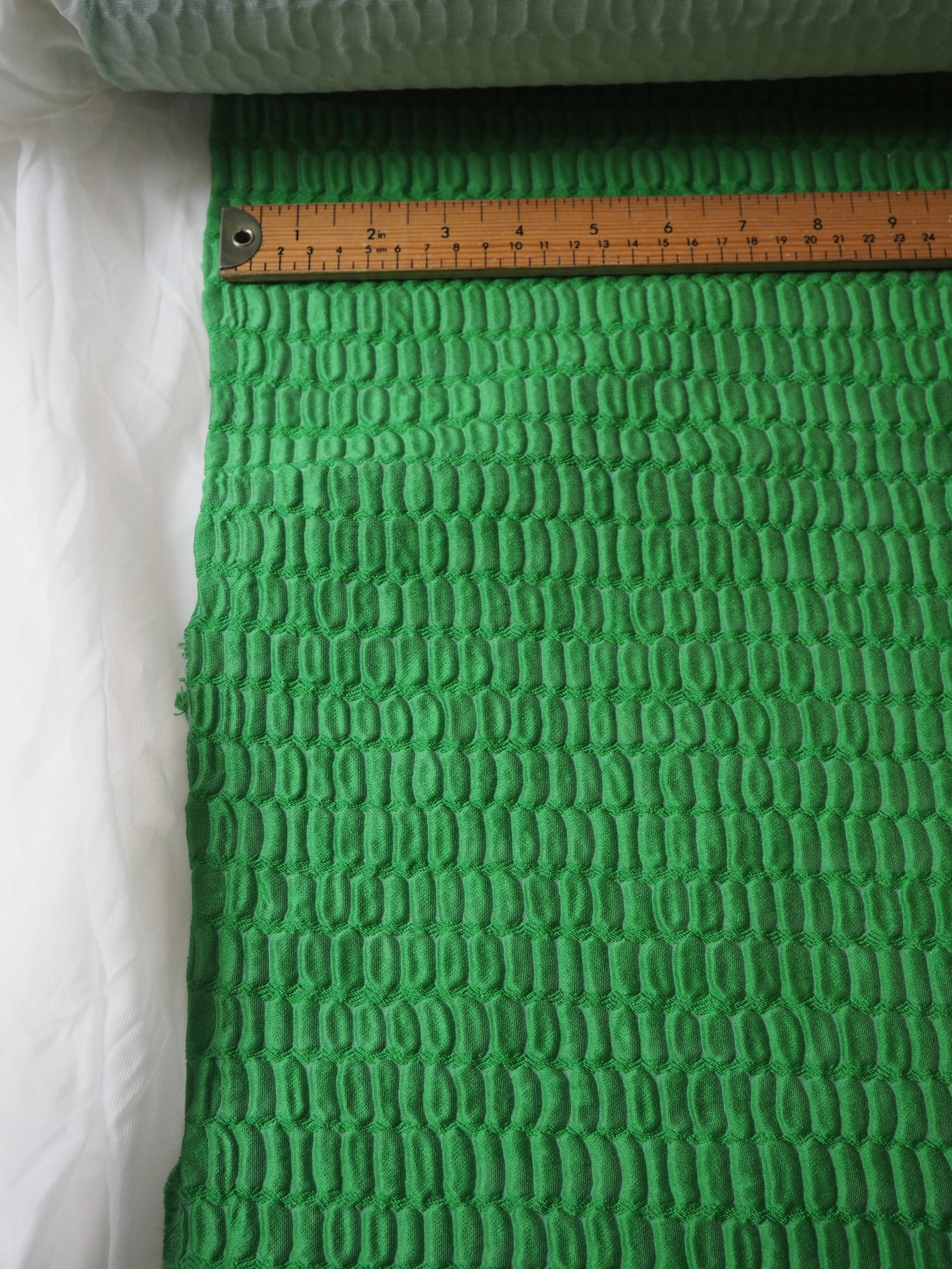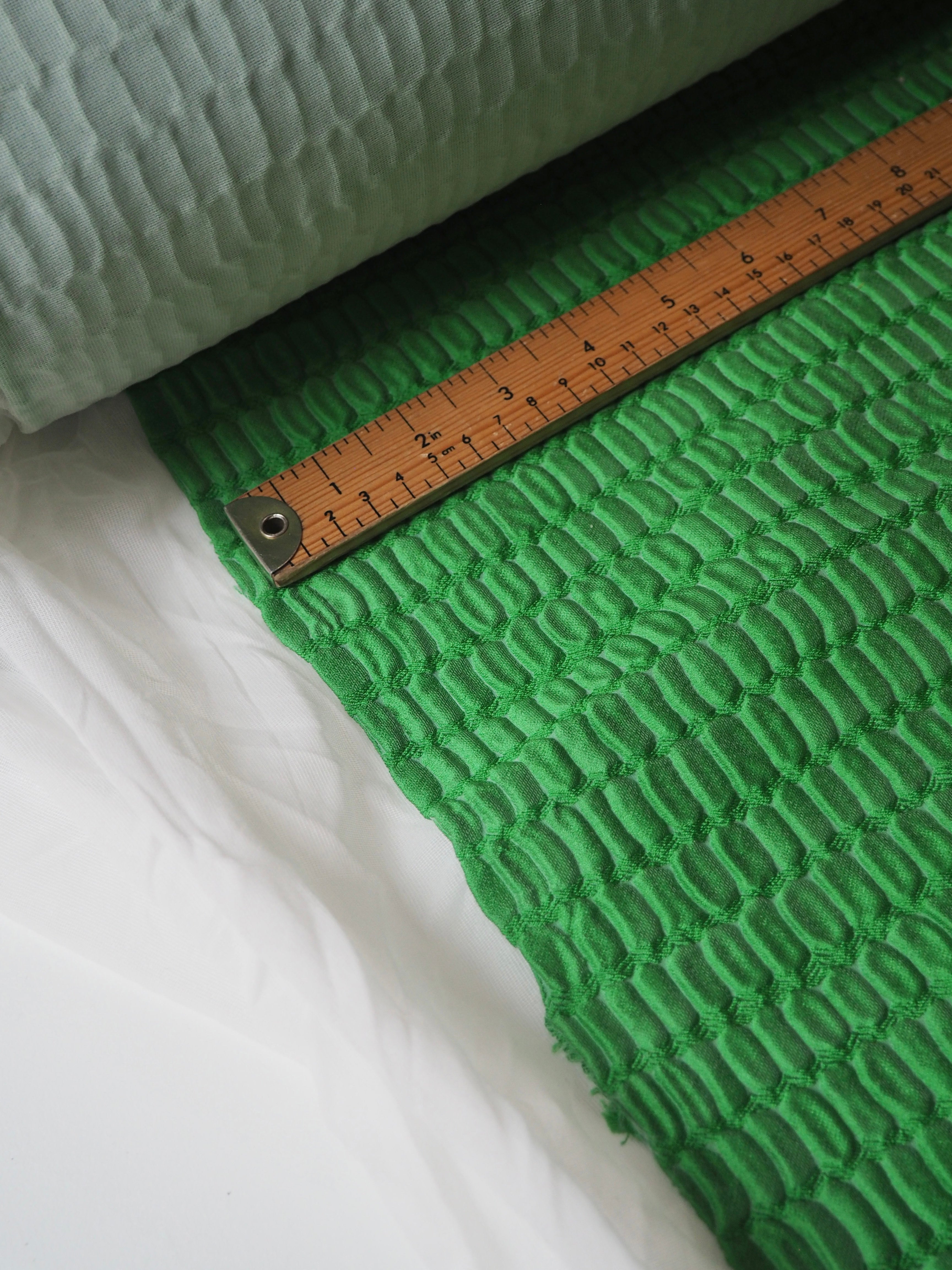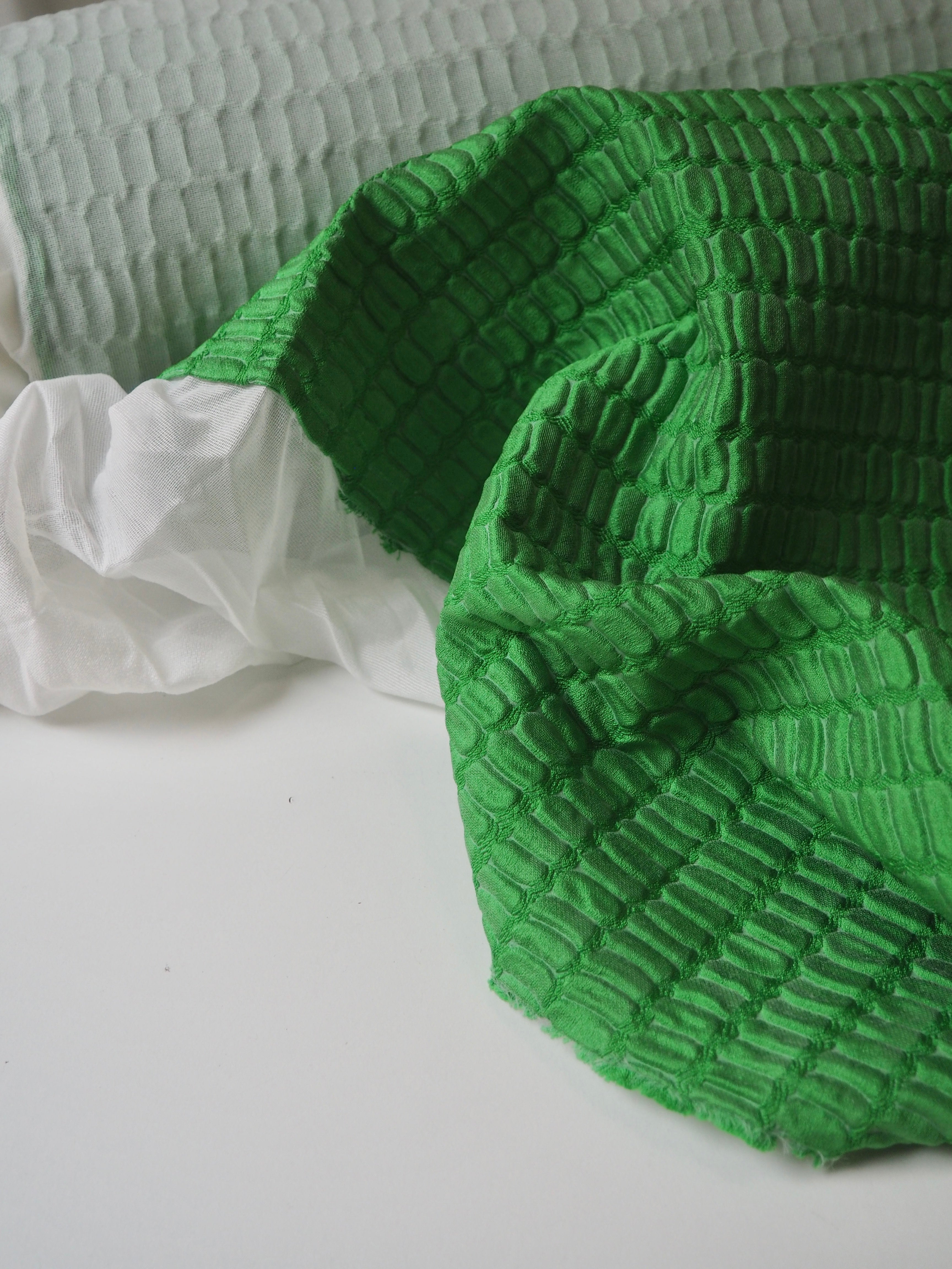 This ex-designer fabric is a stunning cloqué. This cloqué is a rich medium green shade, with a crocodile embossed looking weave. It has a plush risen texture and wonderful nylon/silk blend handle. This one is pre-interfaced by the designer. Light to medium weight with an incredible airy structure and bouncy movement. Fully opaque. Finishes with a light sheen. Perfect for a special project!