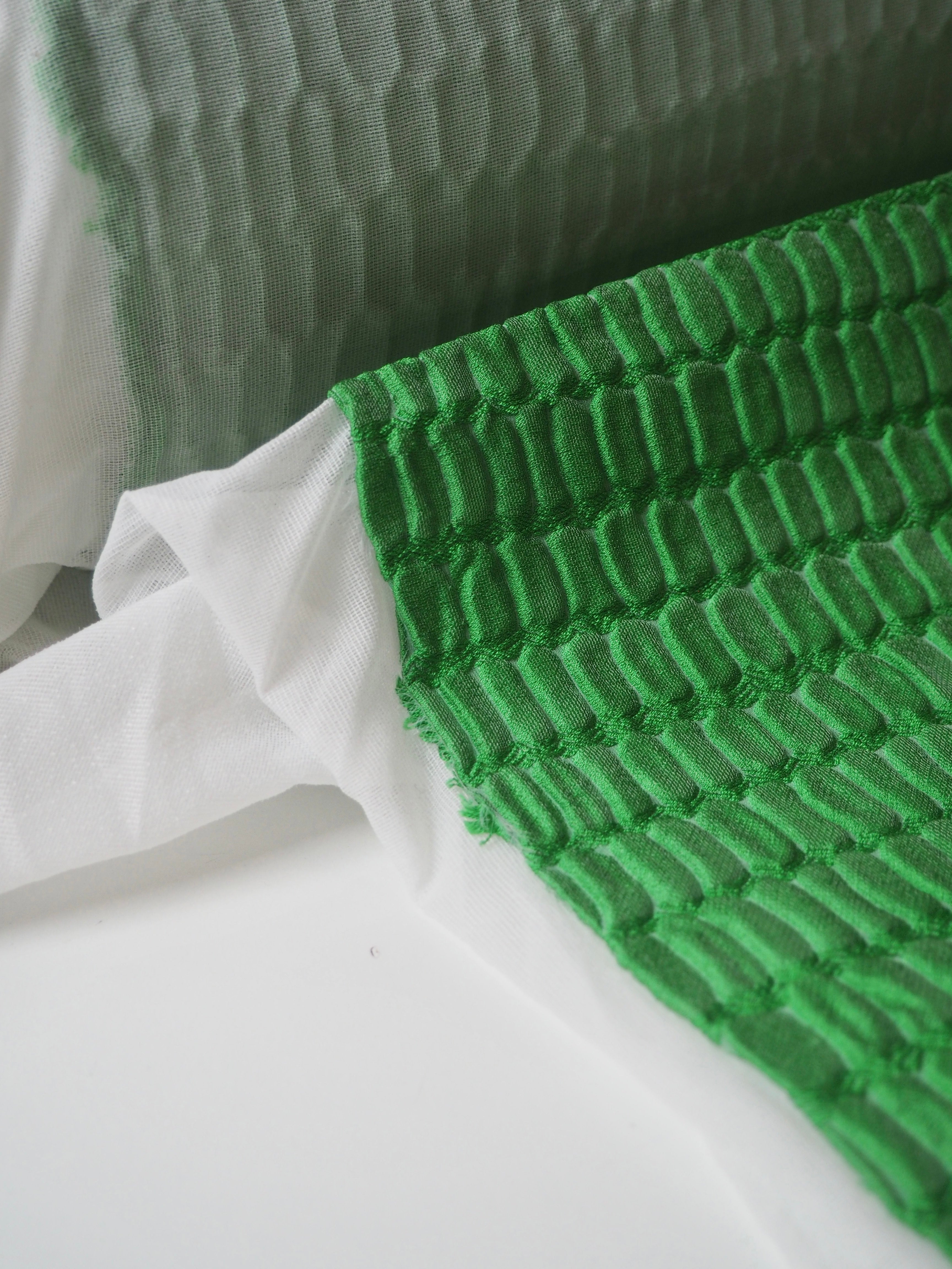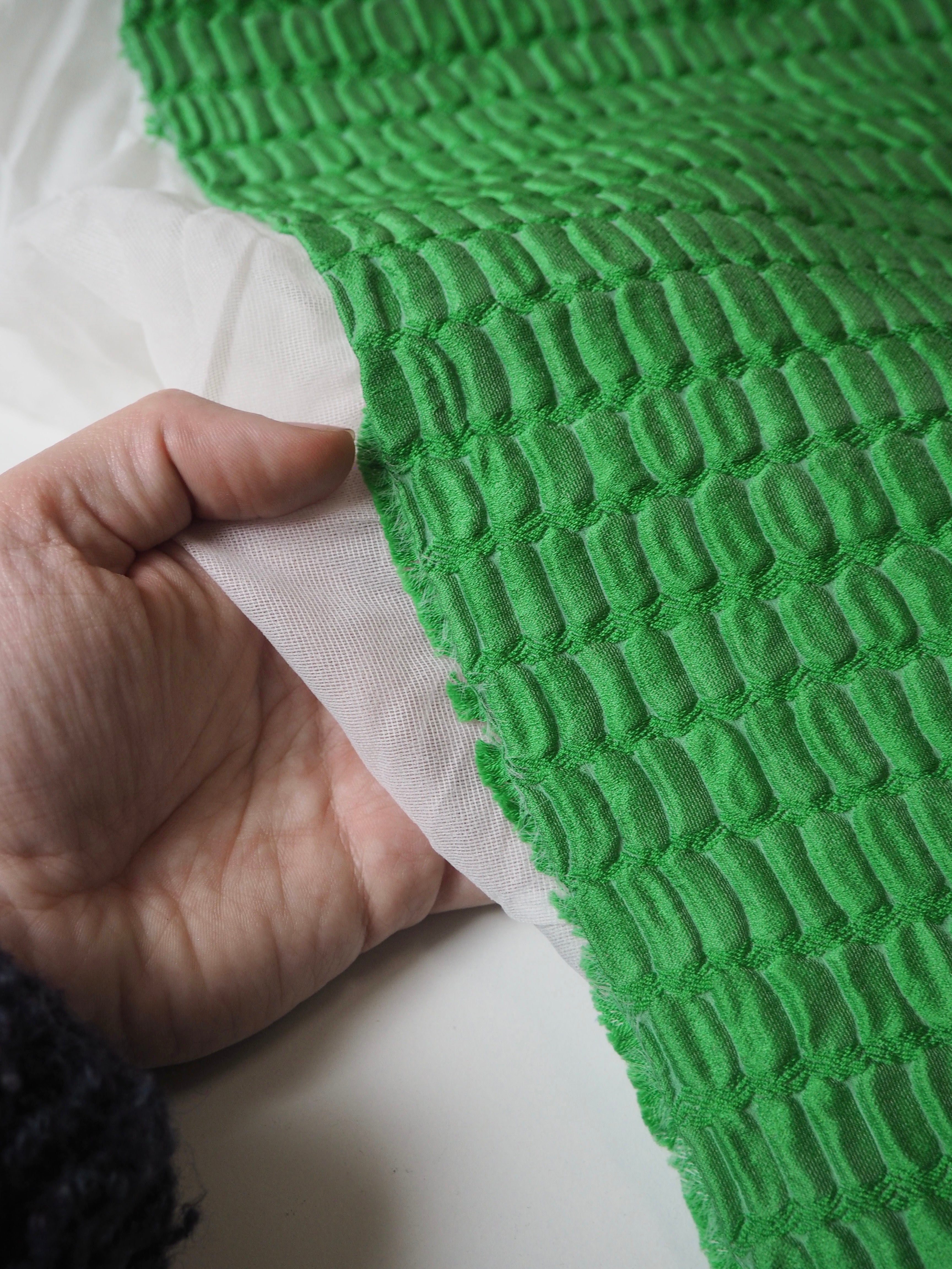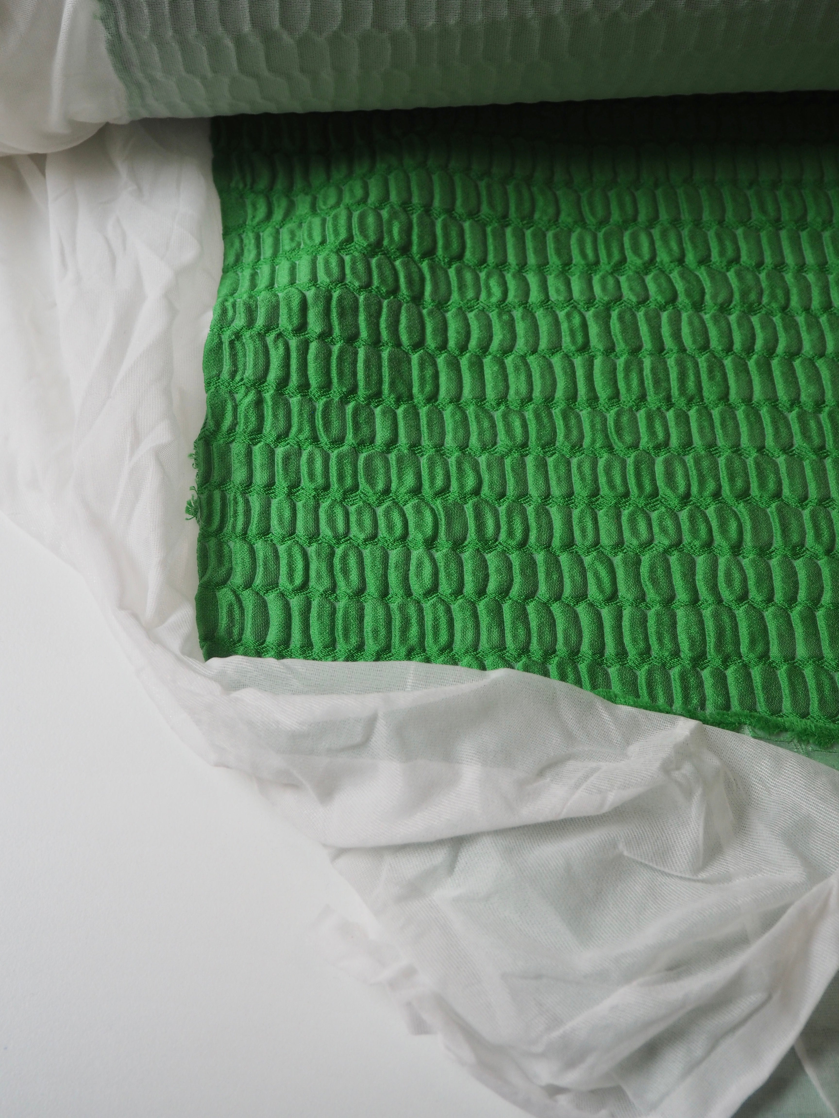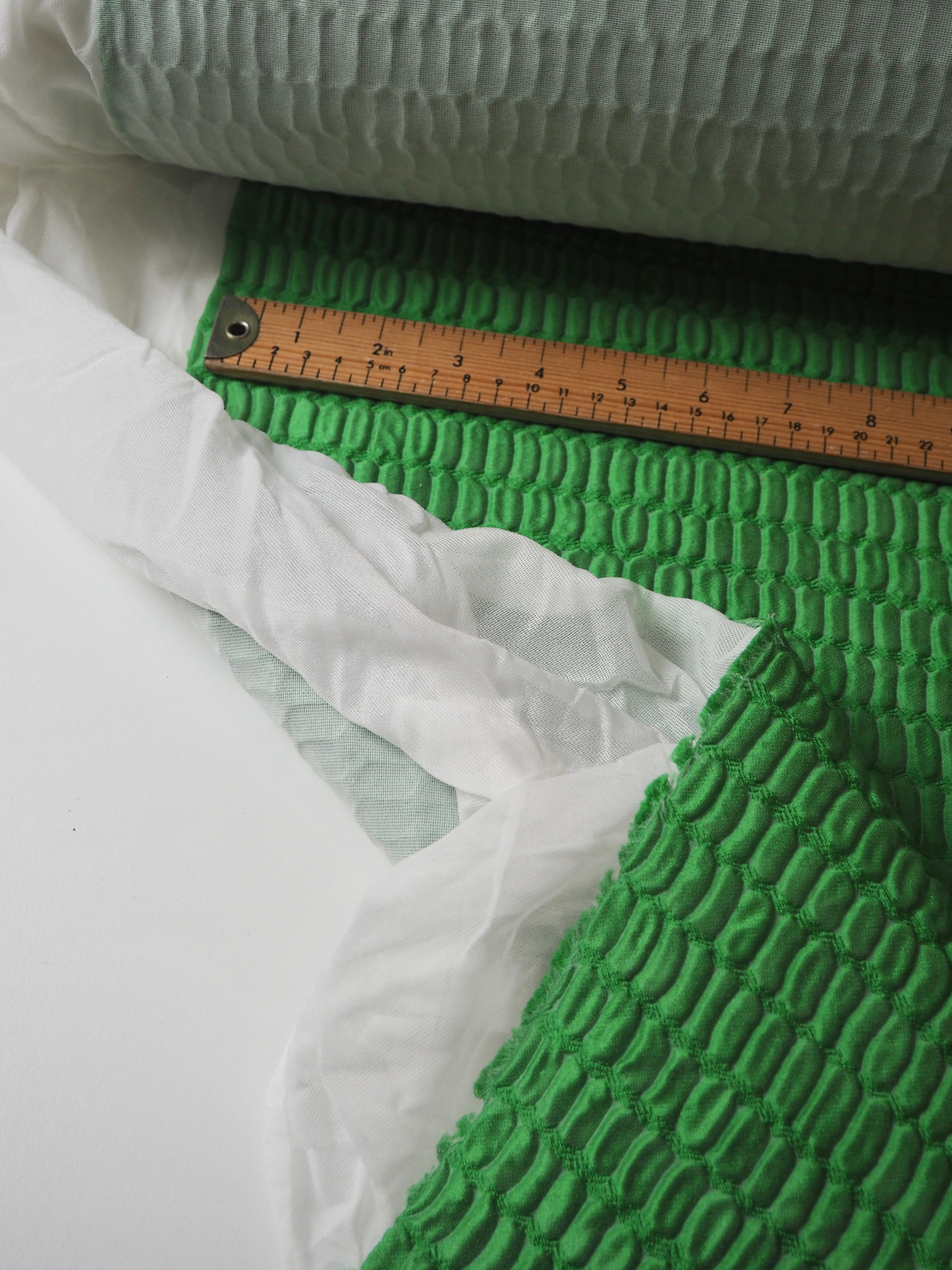 This ex-designer fabric is a stunning cloqué. This cloqué is a rich medium green shade, with a crocodile embossed looking weave. It has a plush risen texture and wonderful nylon/silk blend handle. This one is pre-interfaced by the designer. Light to medium weight with an incredible airy structure and bouncy movement. Fully opaque. Finishes with a light sheen. Perfect for a special project!