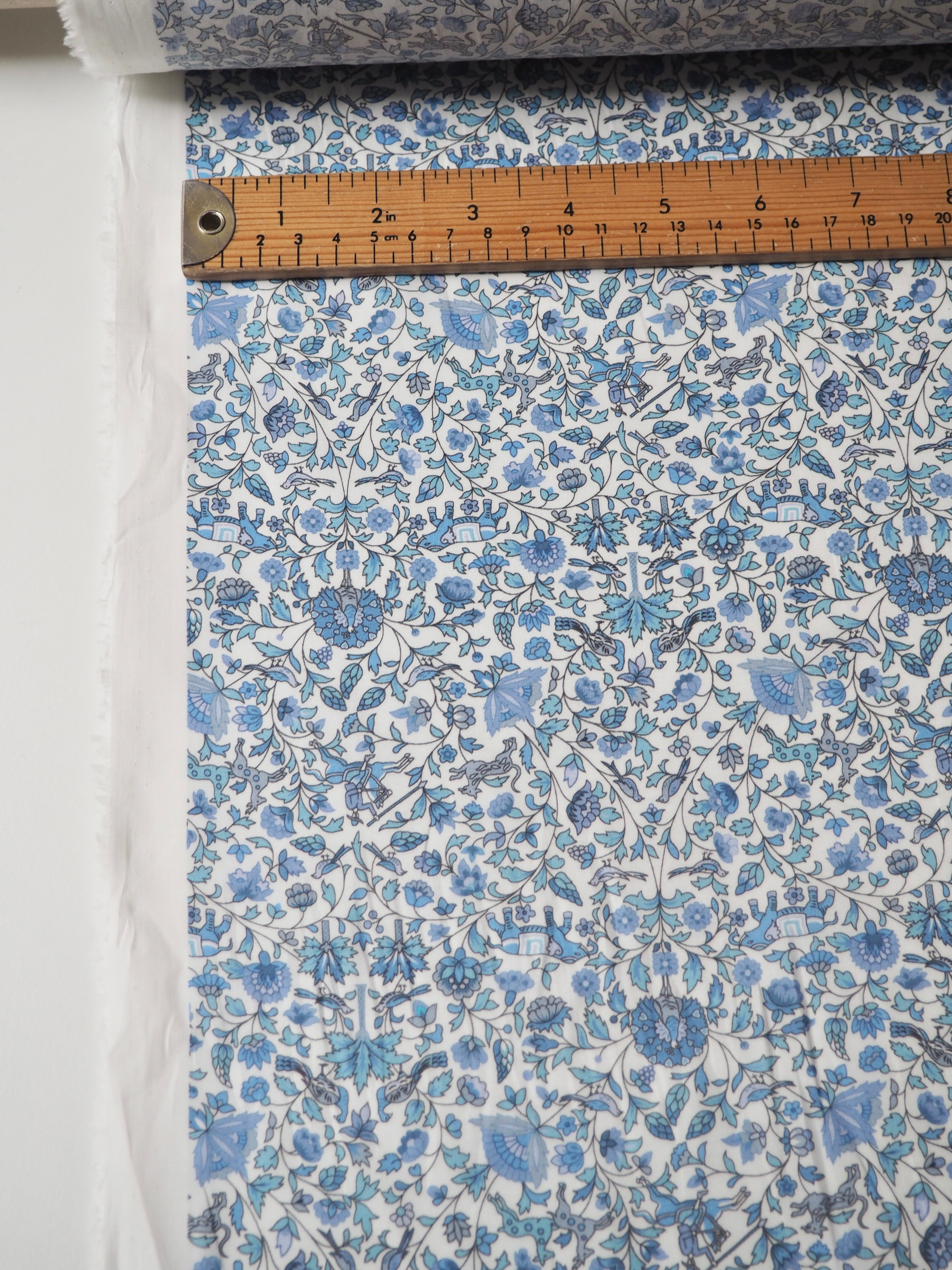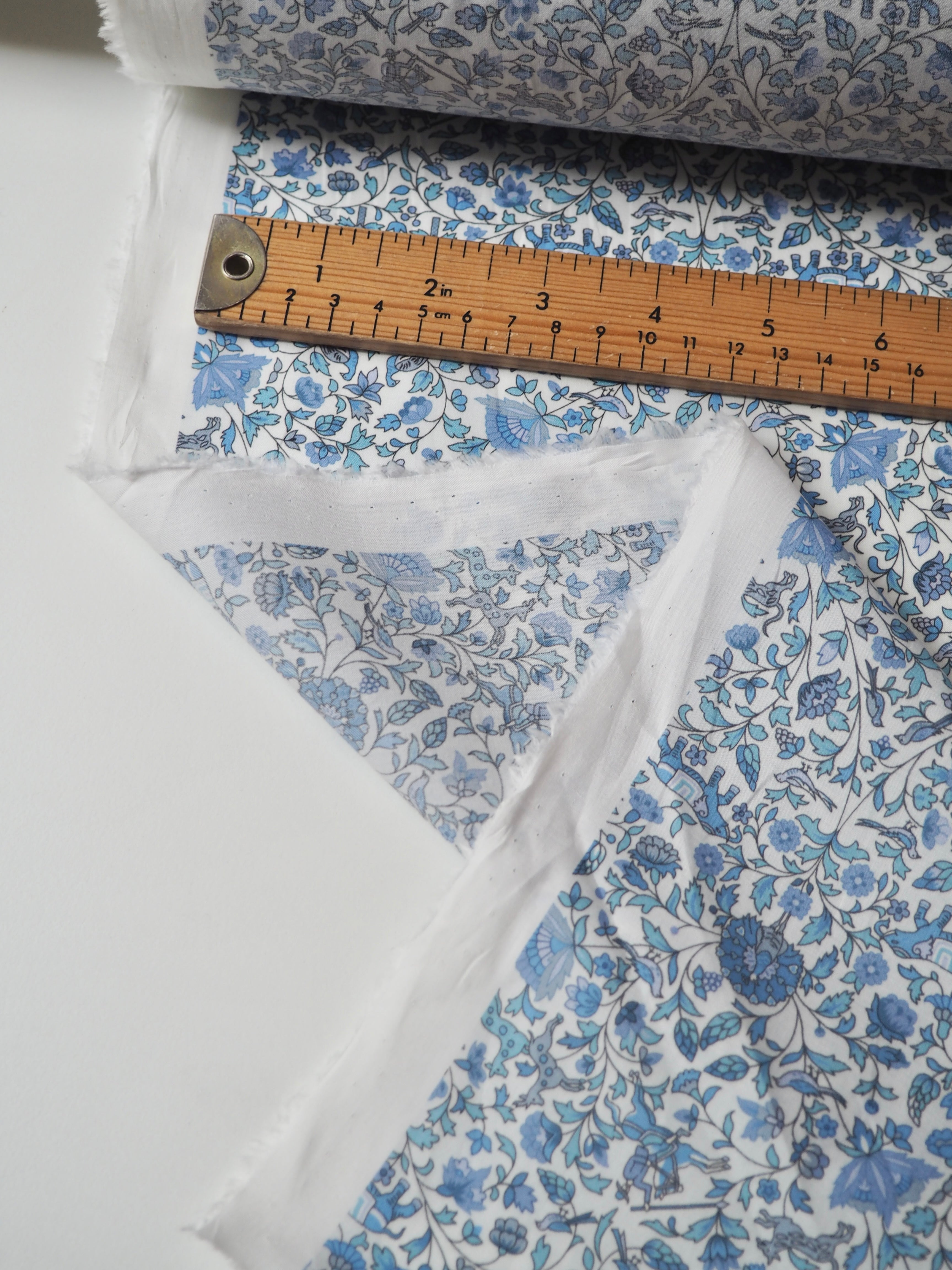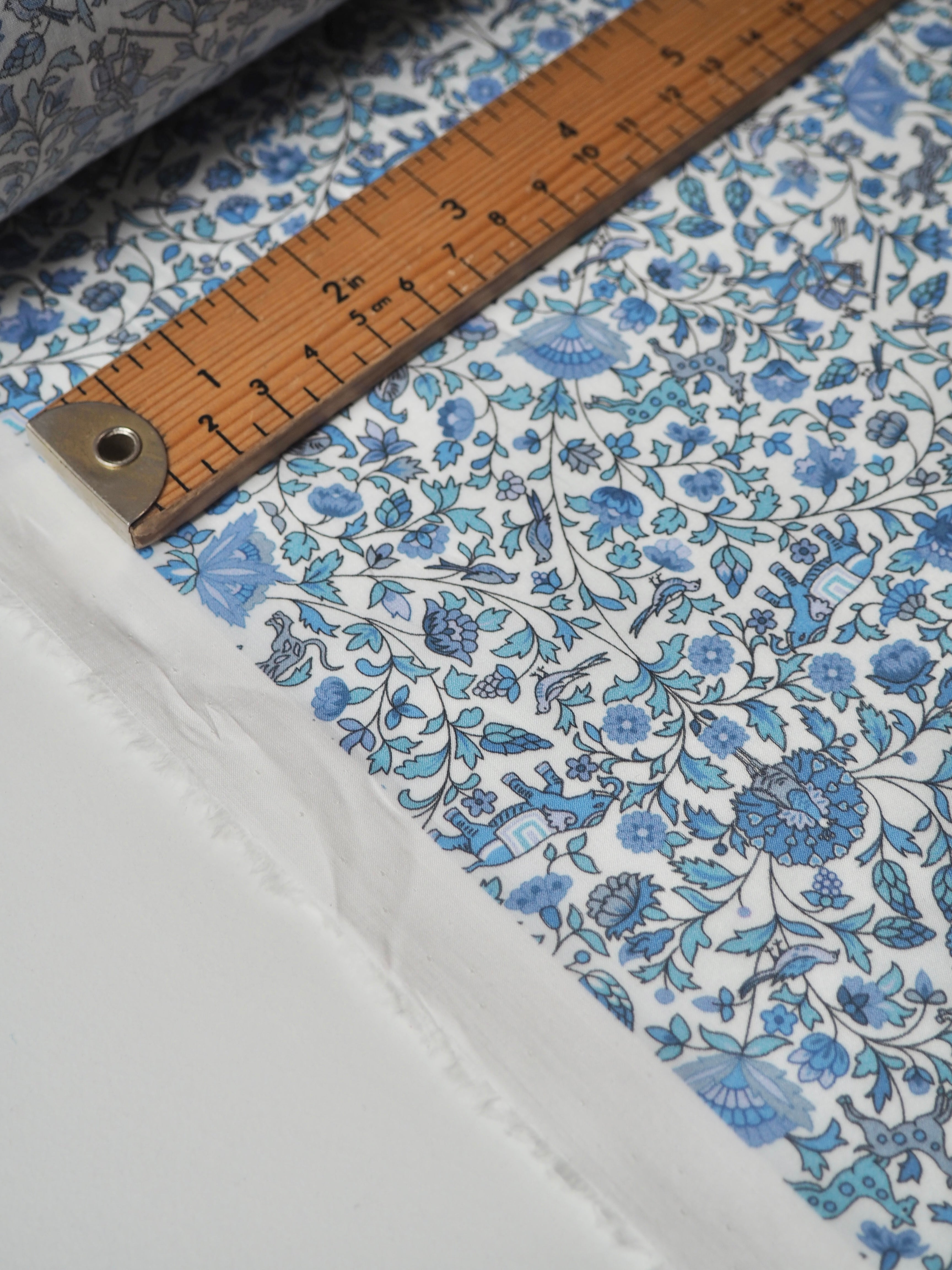 This ex-designer fabric is a classic Liberty Tana Lawn. It's in a classic light blue and white Imran print of elephants, peacocks, and leaves. A top-quality Liberty cotton, and super lightweight! Soft with a lovely drape and slight crispness. Has a wonderful cotton handle. Mostly opaque but lets a little light in. We would love to see it in a blouse or even for quilting!
