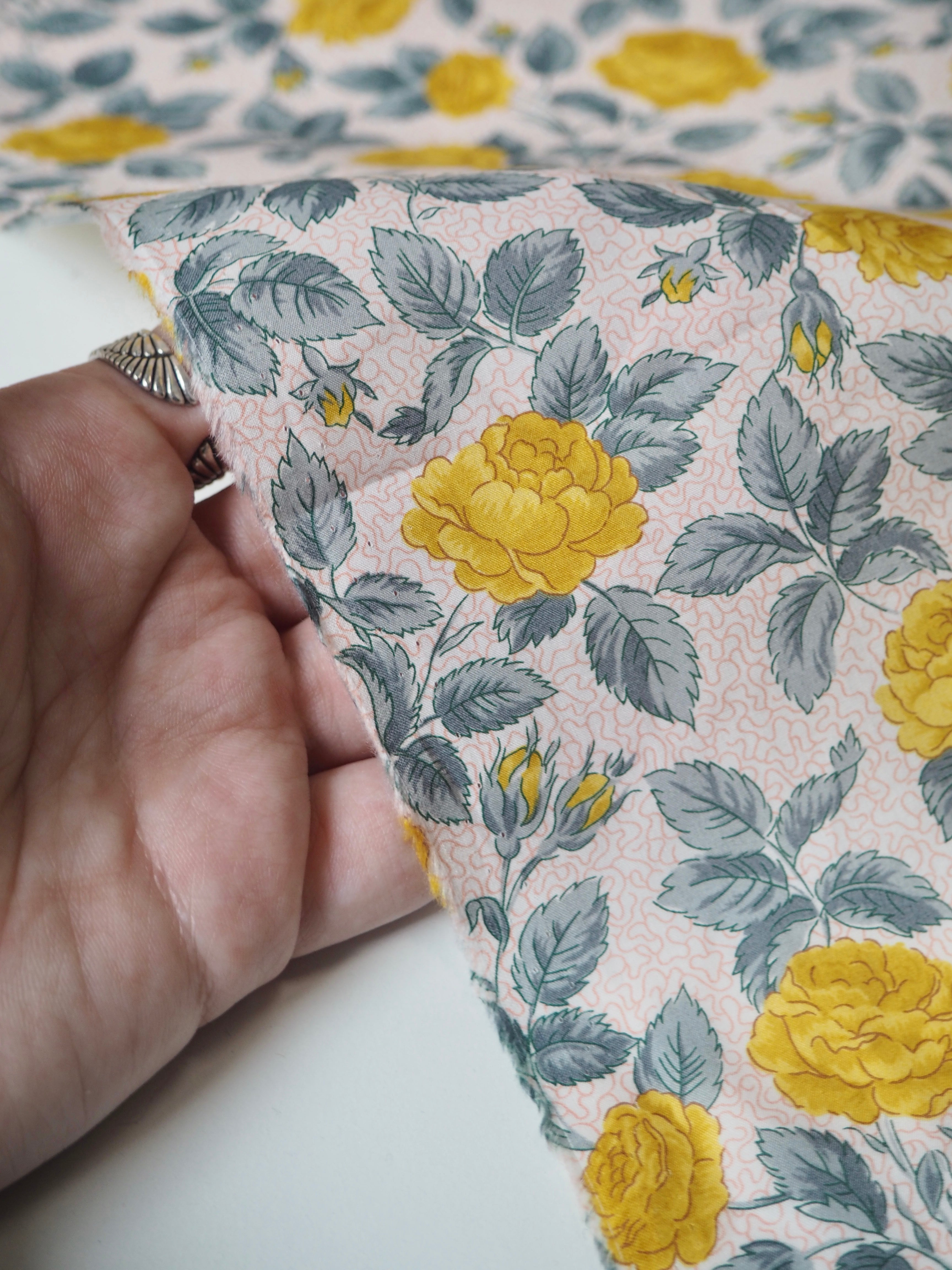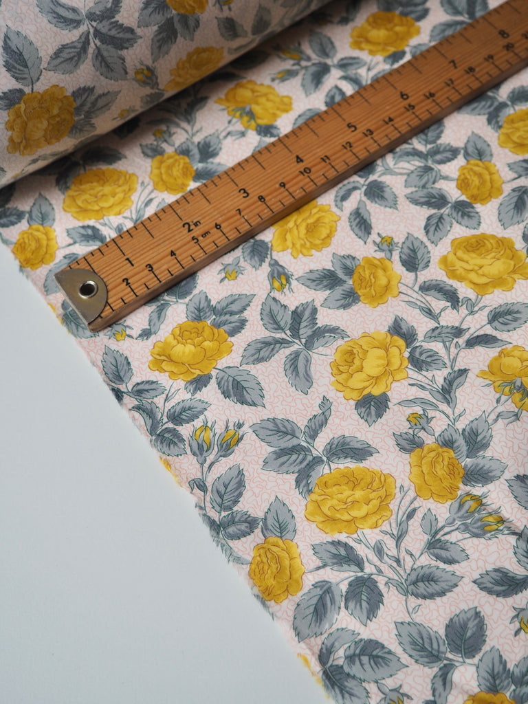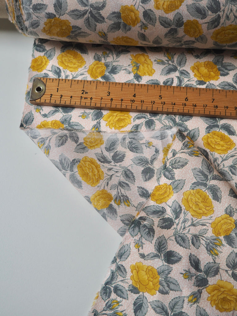 This ex-designer fabric is a classic Liberty Tana Lawn. It's in an exclusive print of yellow roses and grey leaves on a light background. A top quality Liberty cotton, and super lightweight! Soft with a lovely drape and slight crispness. Has a wonderful cotton handle. Mostly opaque but lets a little light in. We would love to see it in a blouse or even for quilting!