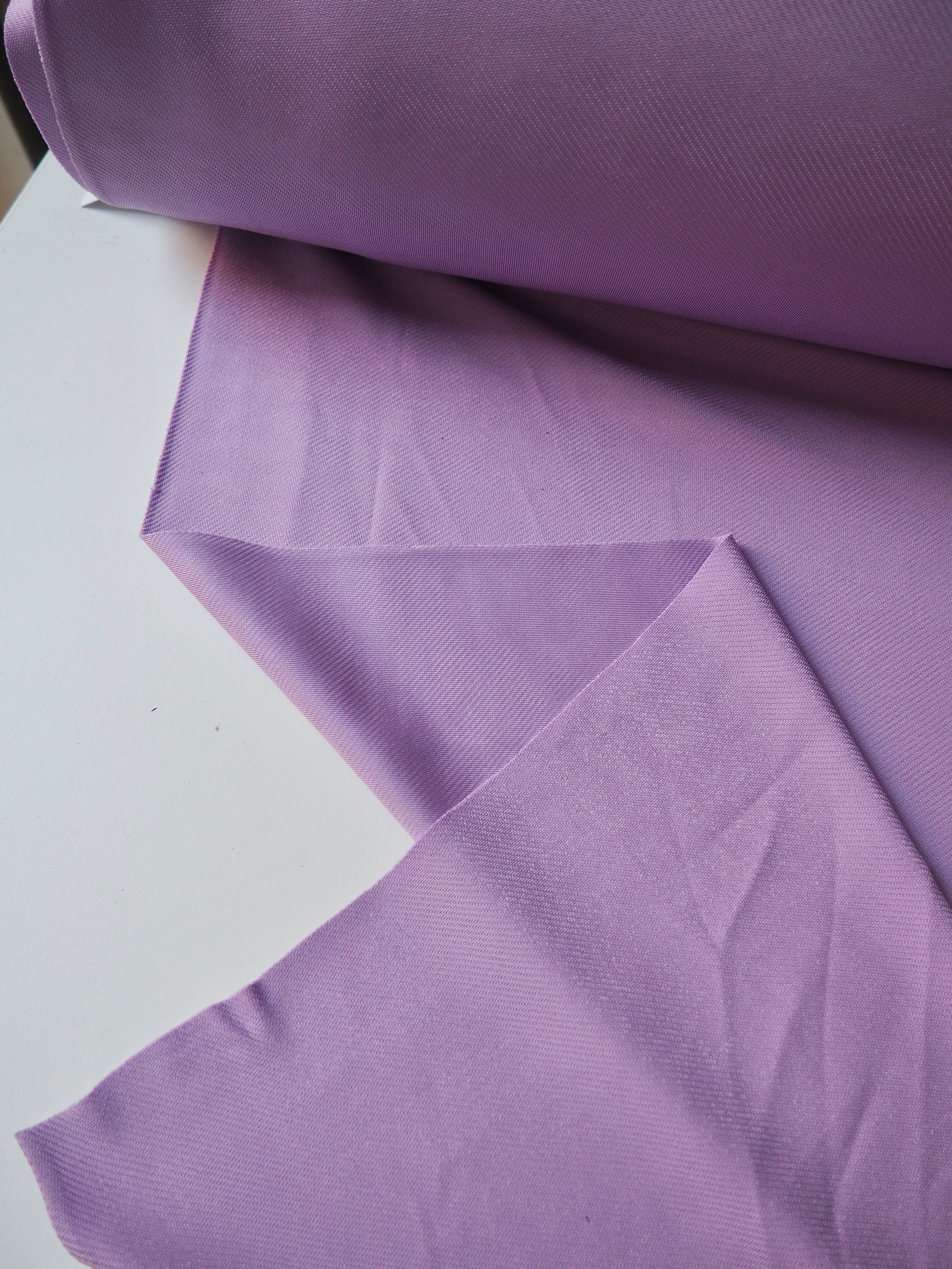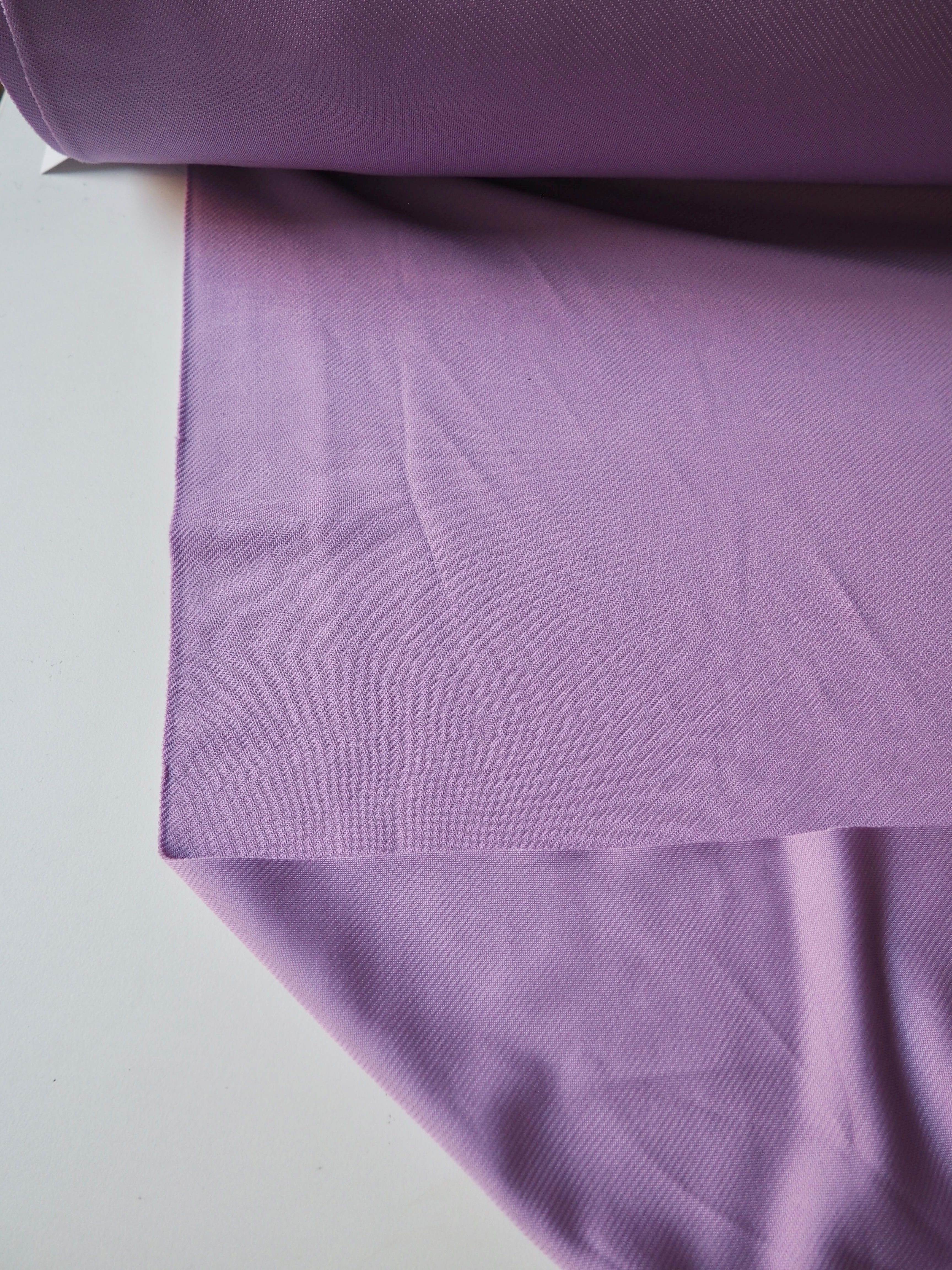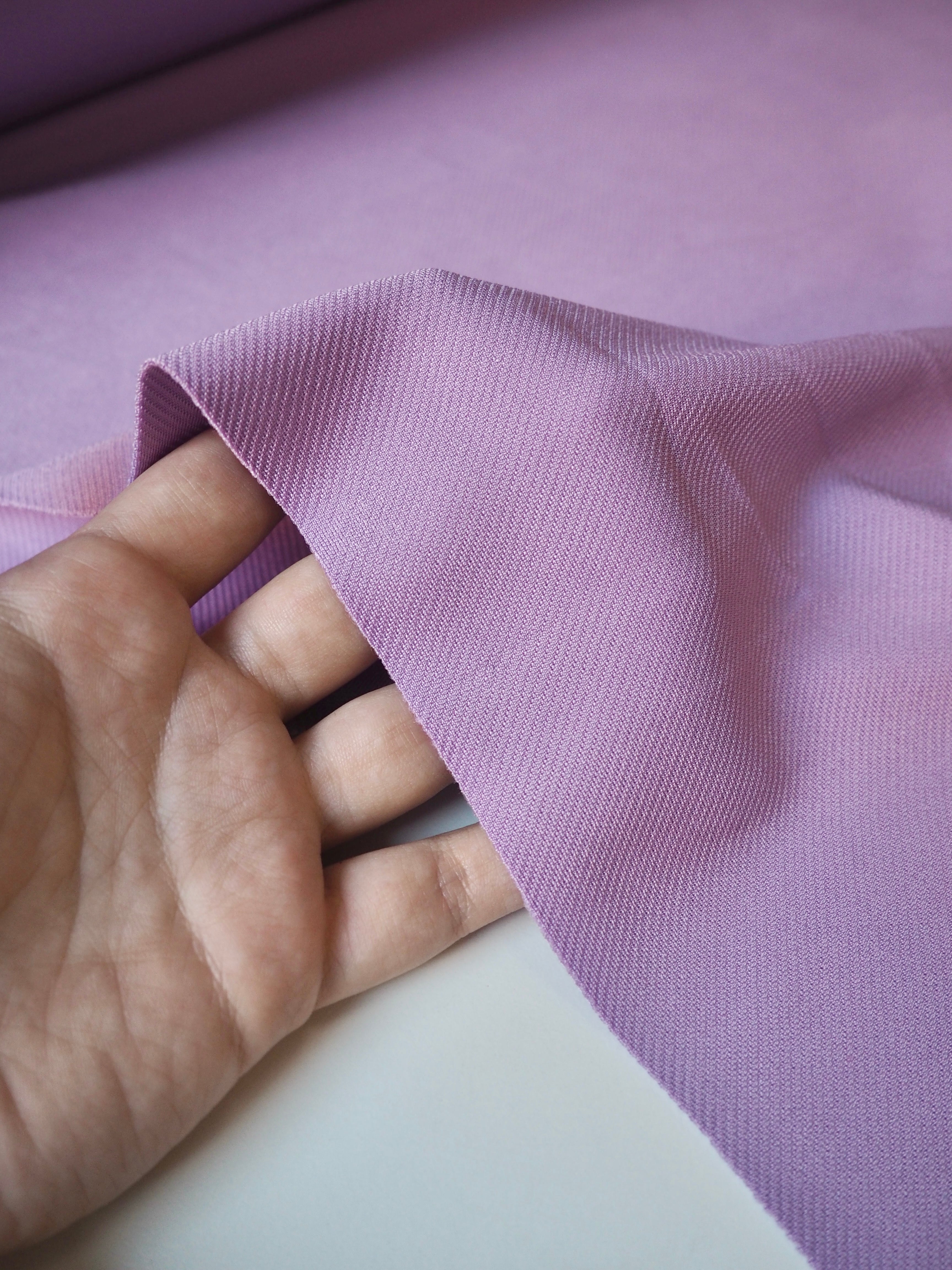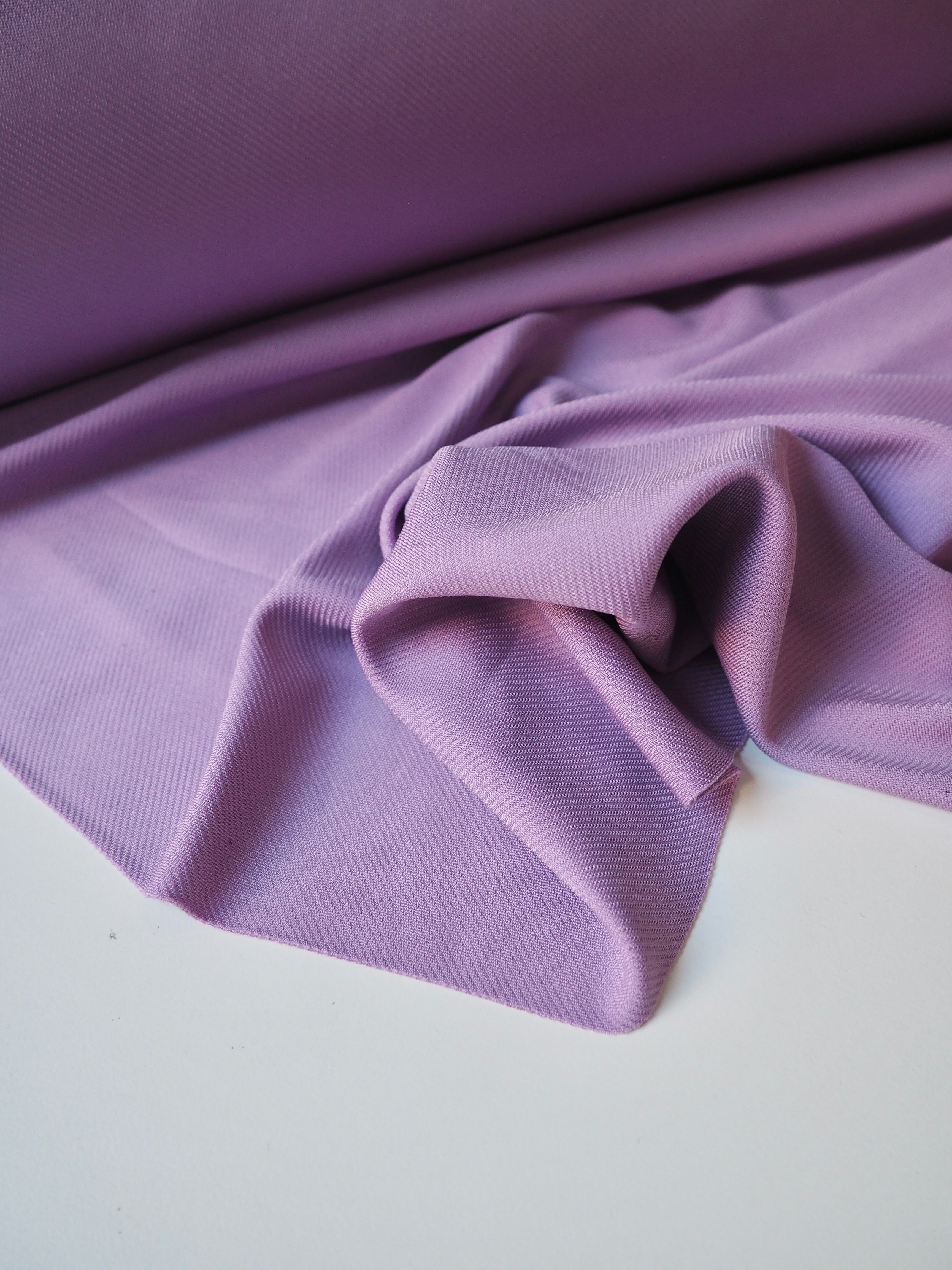 This ex-designer fabric is a jersey. It has a twill knit structure, which gives it an interesting texture and enhanced sheen. Completely opaque, quite slinky, with a lovely finish. Has a great drape and approximately 20% width-ways stretch, and slight length ways stretch. Perfect for an elevated basic!