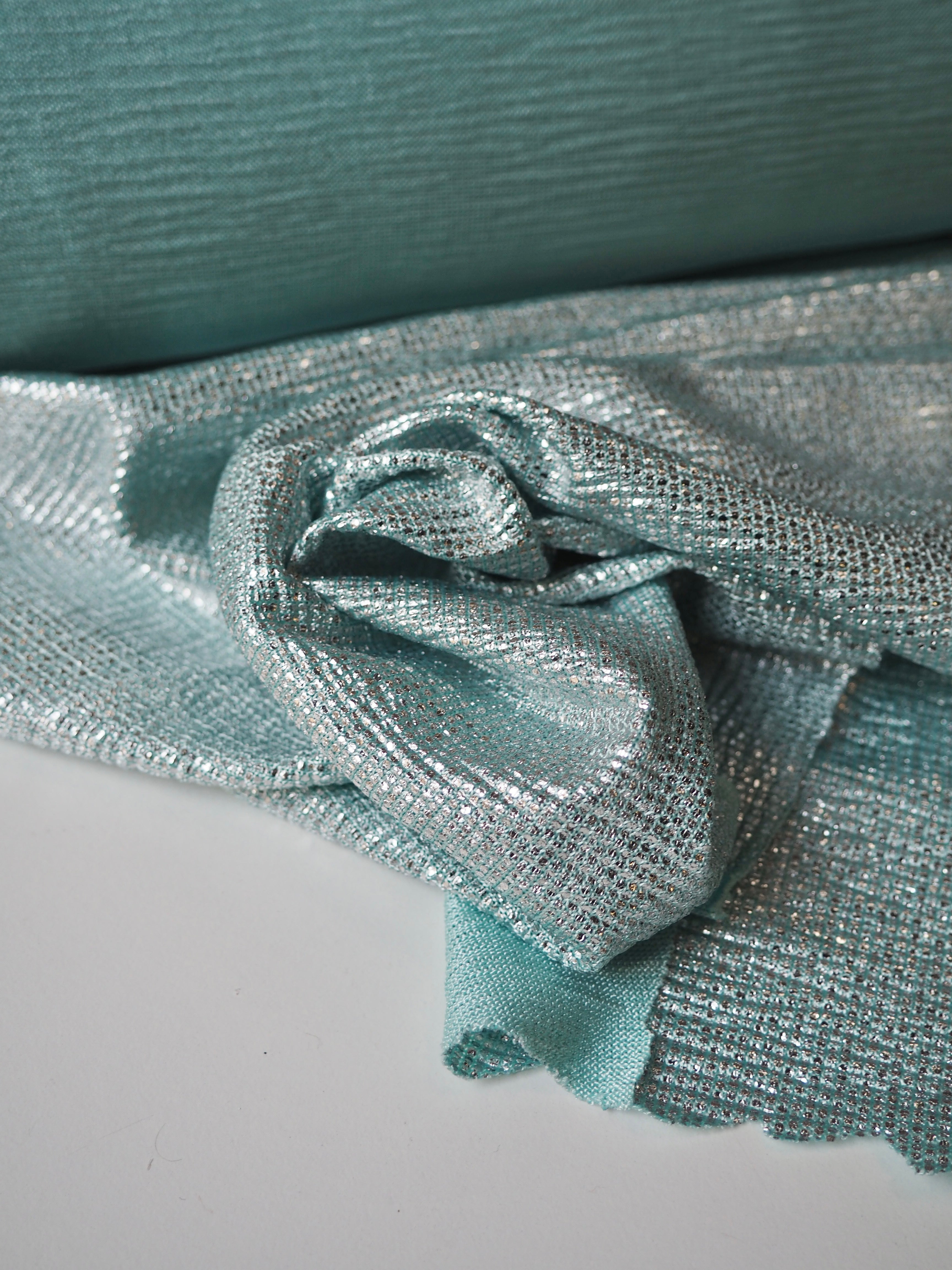 This ex-designer fabric is a metallic jersey. This eye-popping jersey has a mint green base, with a silver metallic printed sheen. It has a great 40% widths-way stretch and recovery. Lightweight, and with a great drape, a soft but metallic textured handle. Would make the perfect party wrap dress and festive wear!