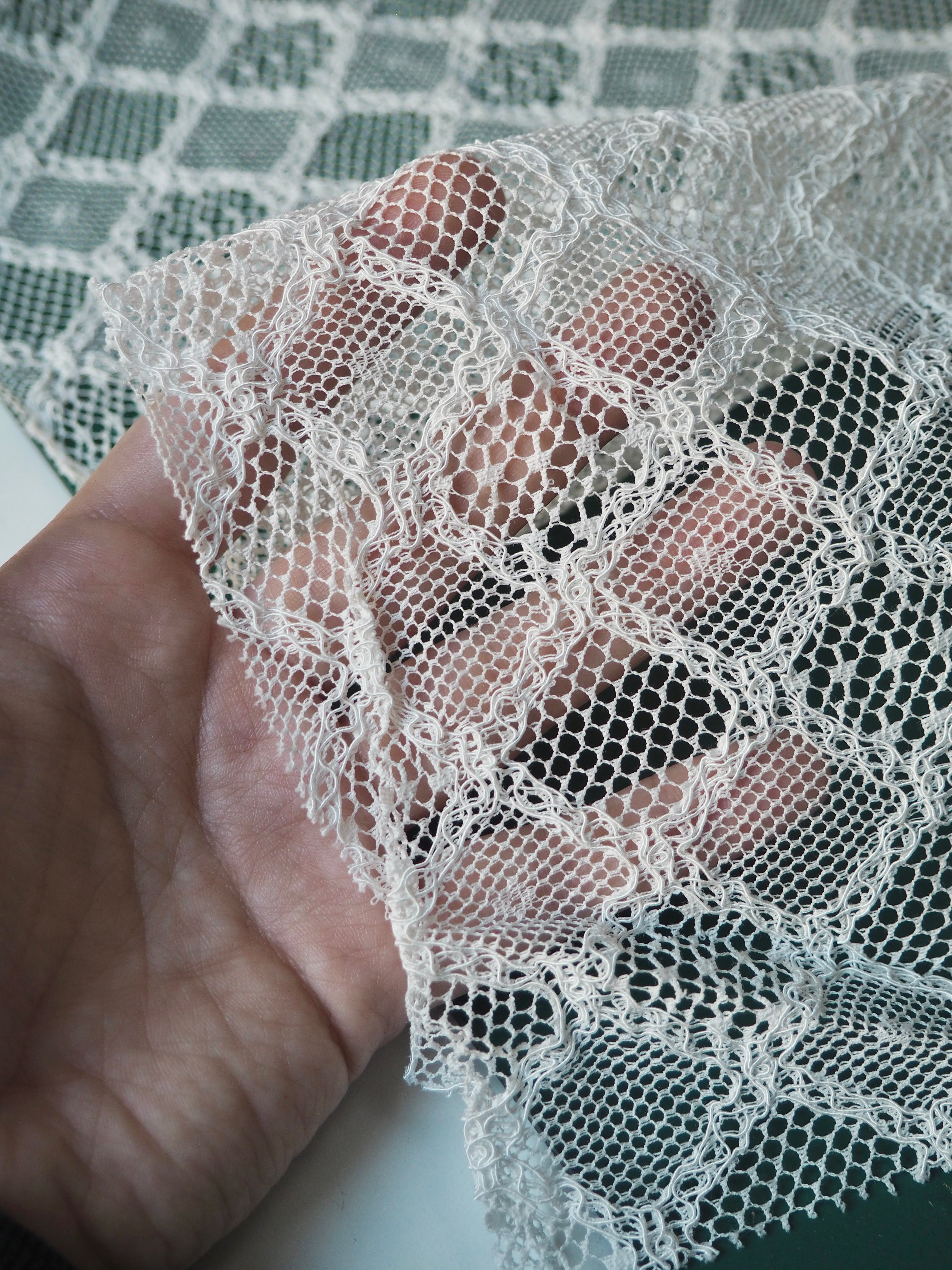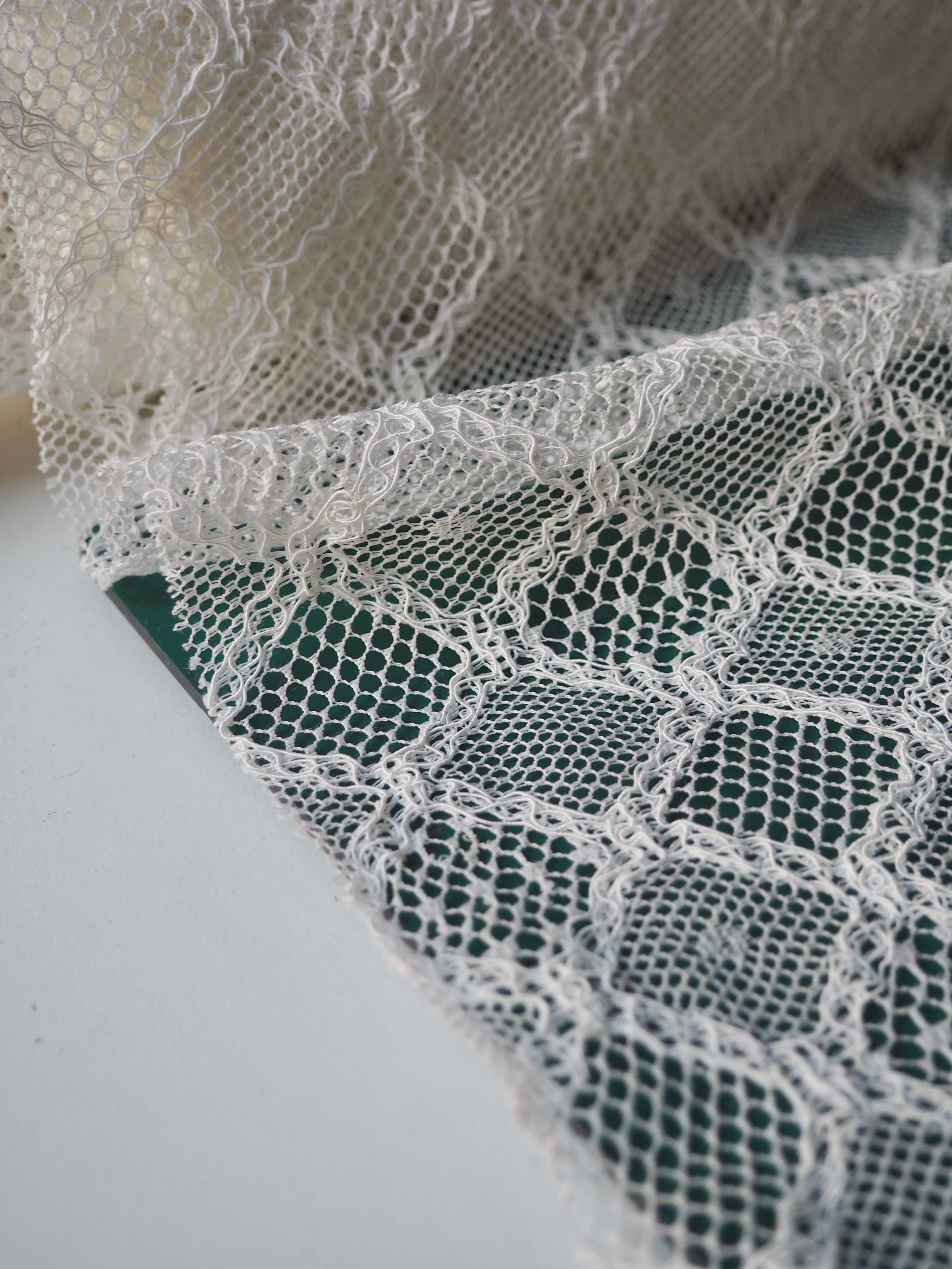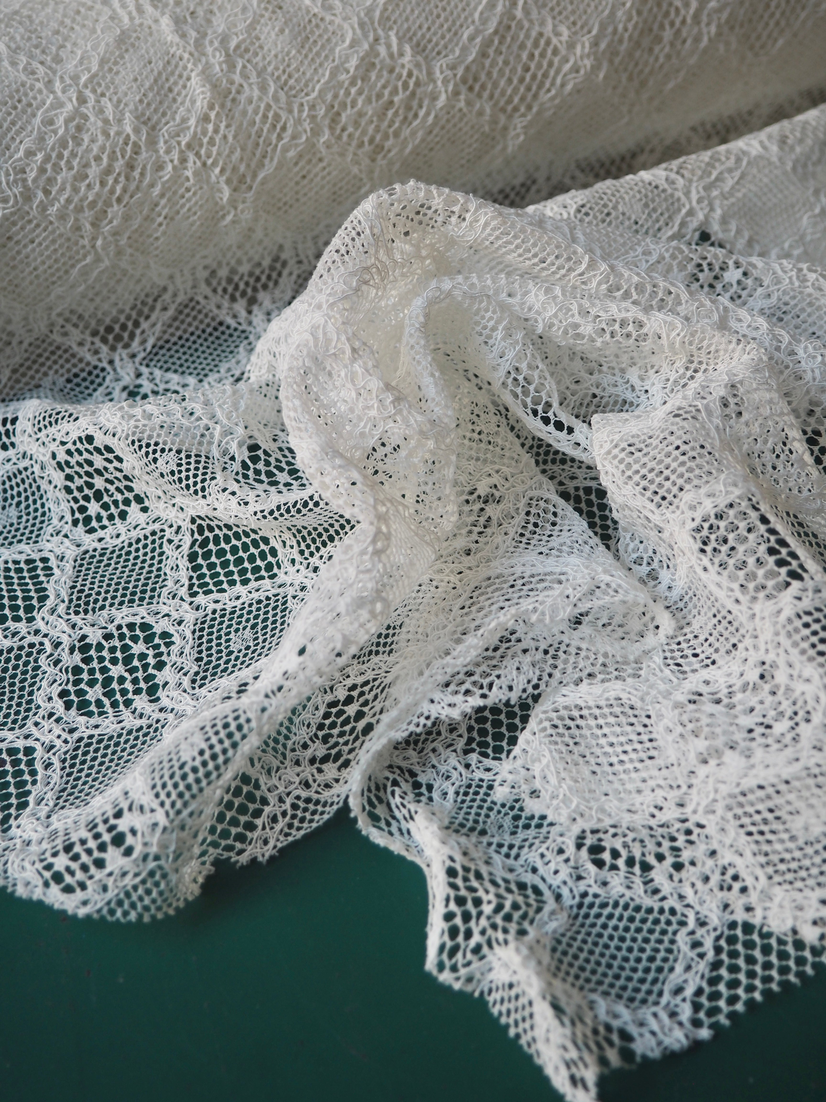 This ex-designer fabric is an exquisite lace. It is delicate, with a corded lattice design. In a soft, slightly off-white shade with a flat finish. It's lightweight and has such a lovely textured handle. Drapes so well and has a gentle structure. Would make a gorgeous dress or top overlay!