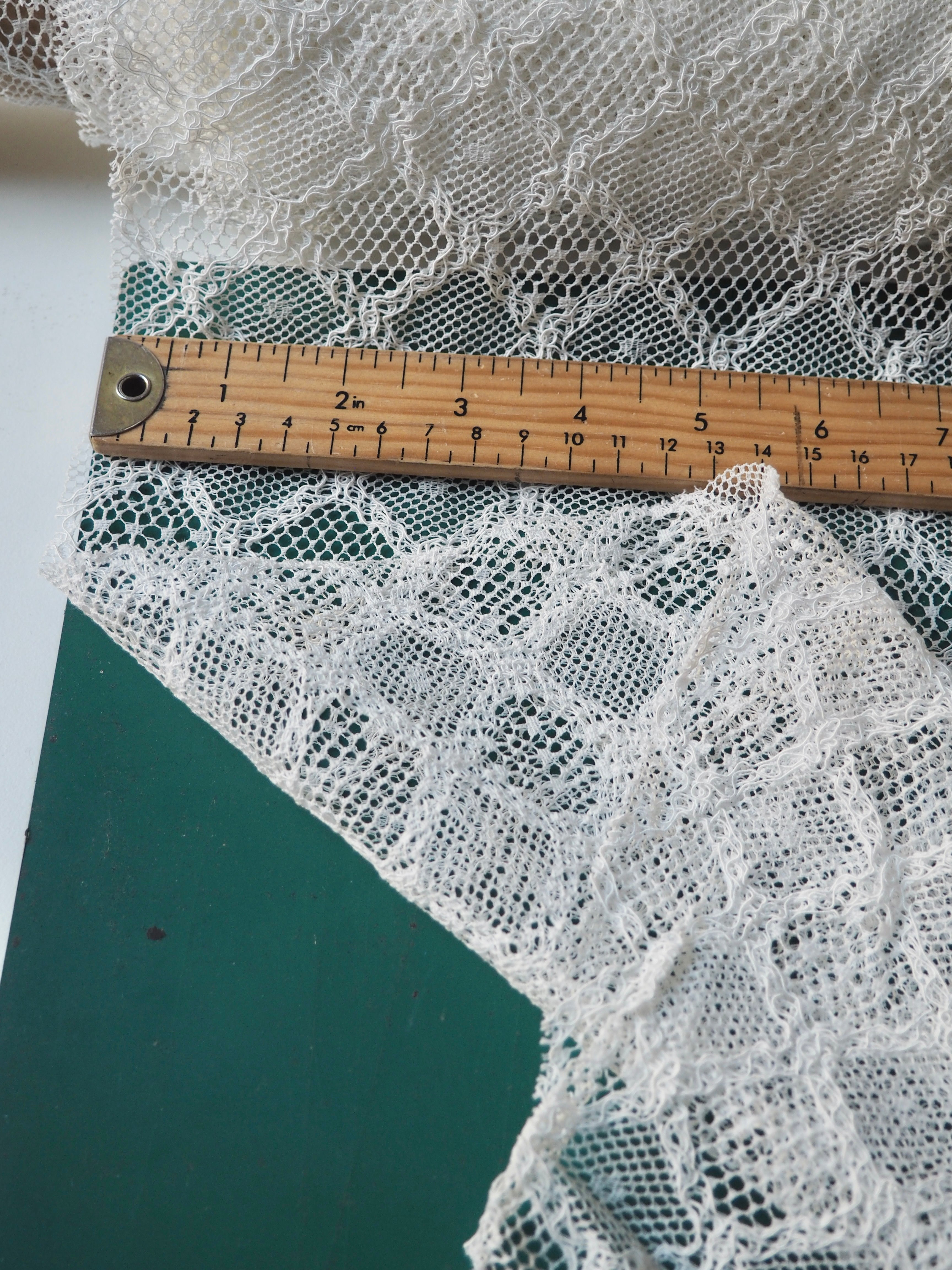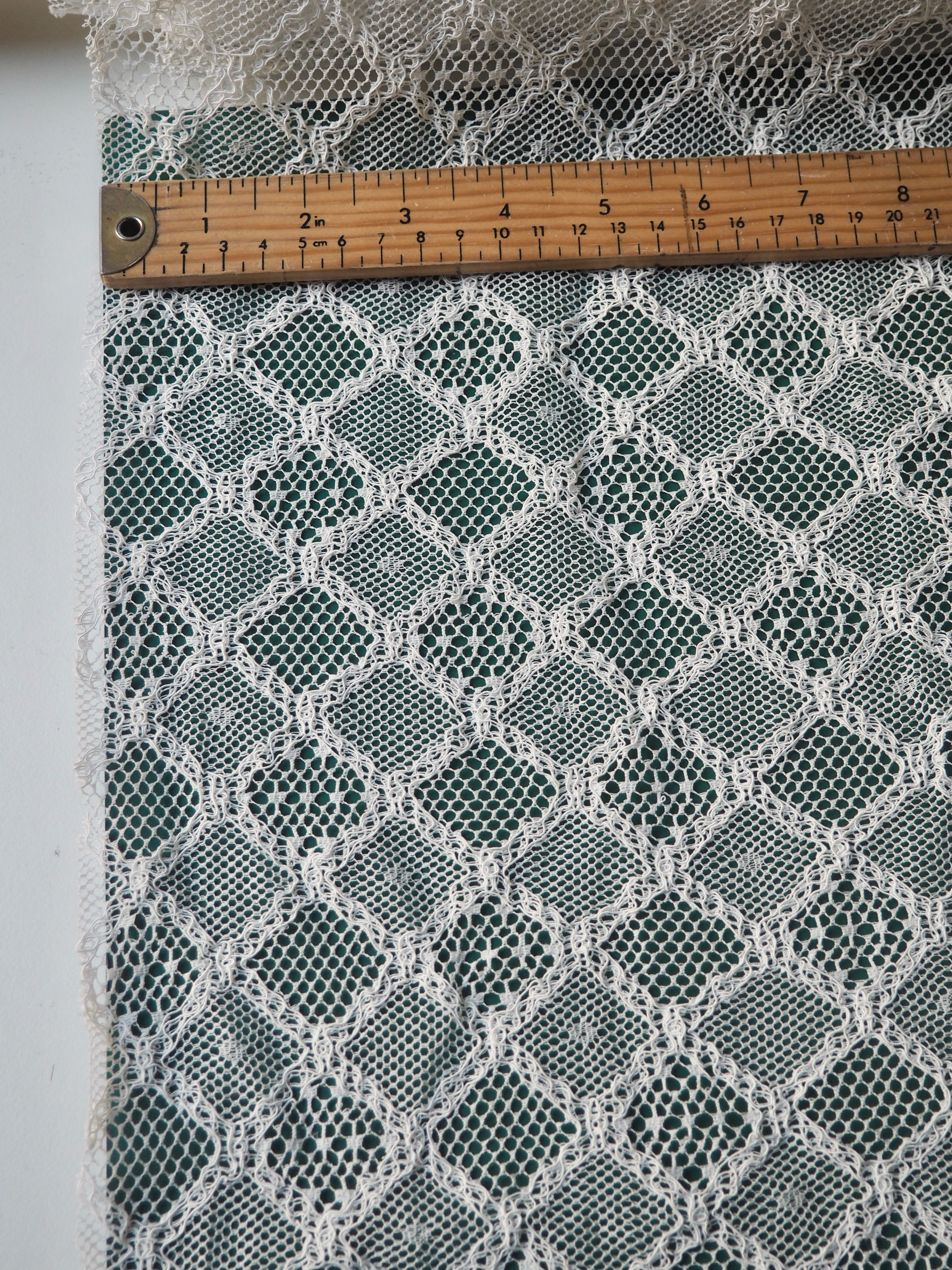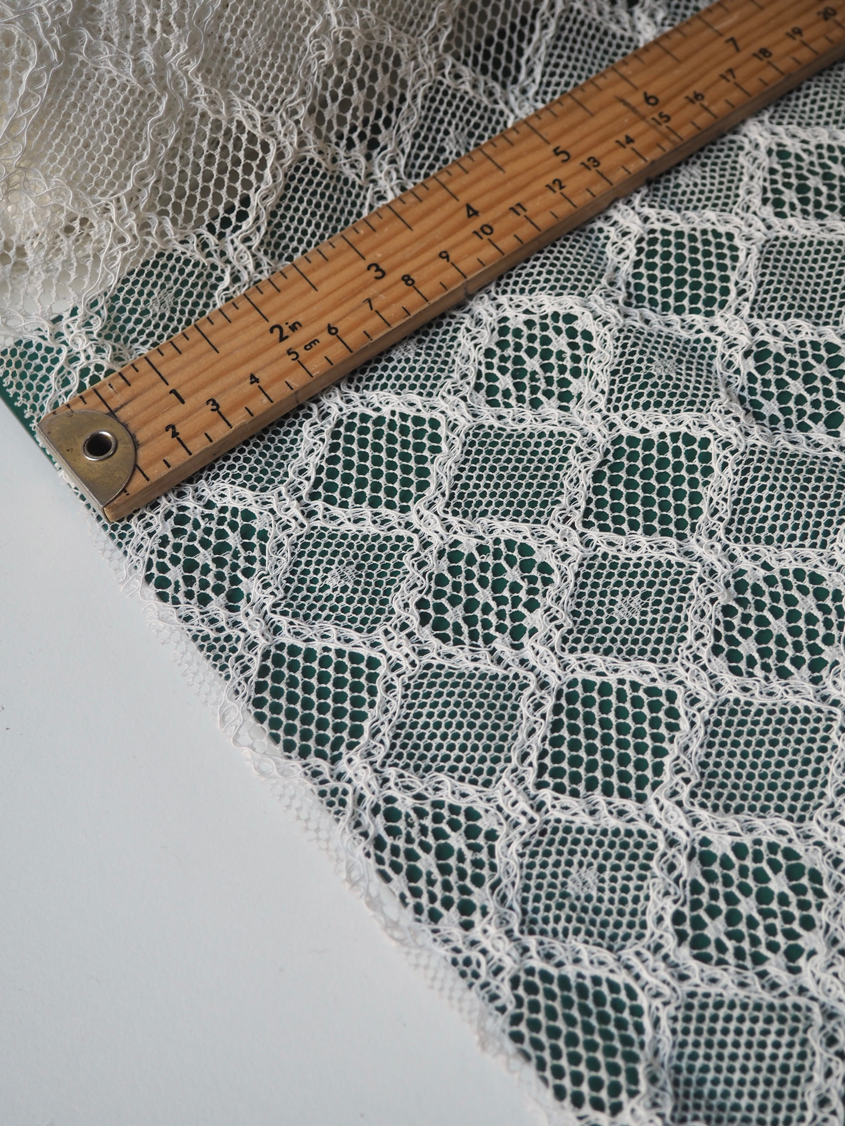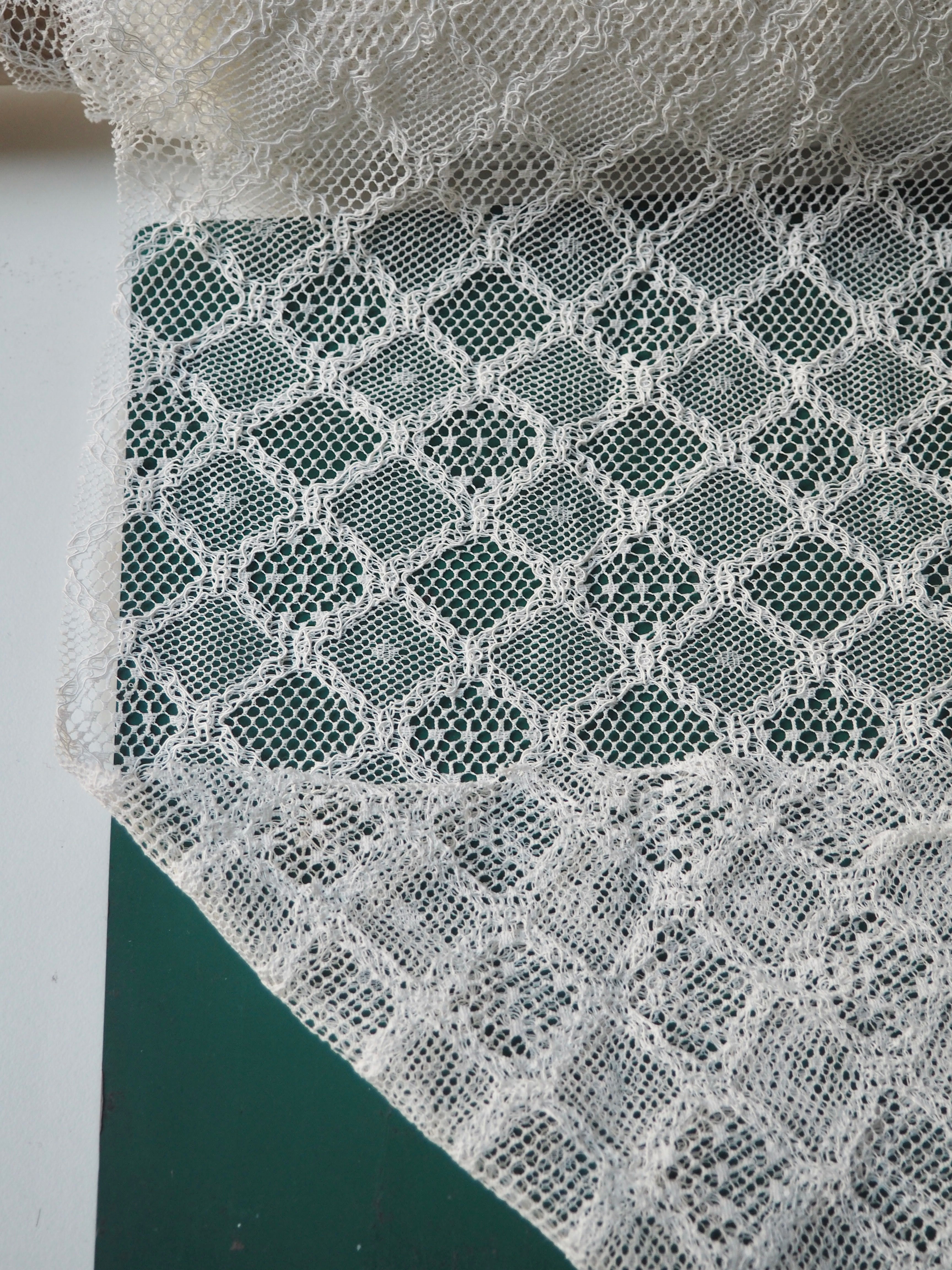 This ex-designer fabric is an exquisite lace. It is delicate, with a corded lattice design. In a soft, slightly off-white shade with a flat finish. It's lightweight and has such a lovely textured handle. Drapes so well and has a gentle structure. Would make a gorgeous dress or top overlay!