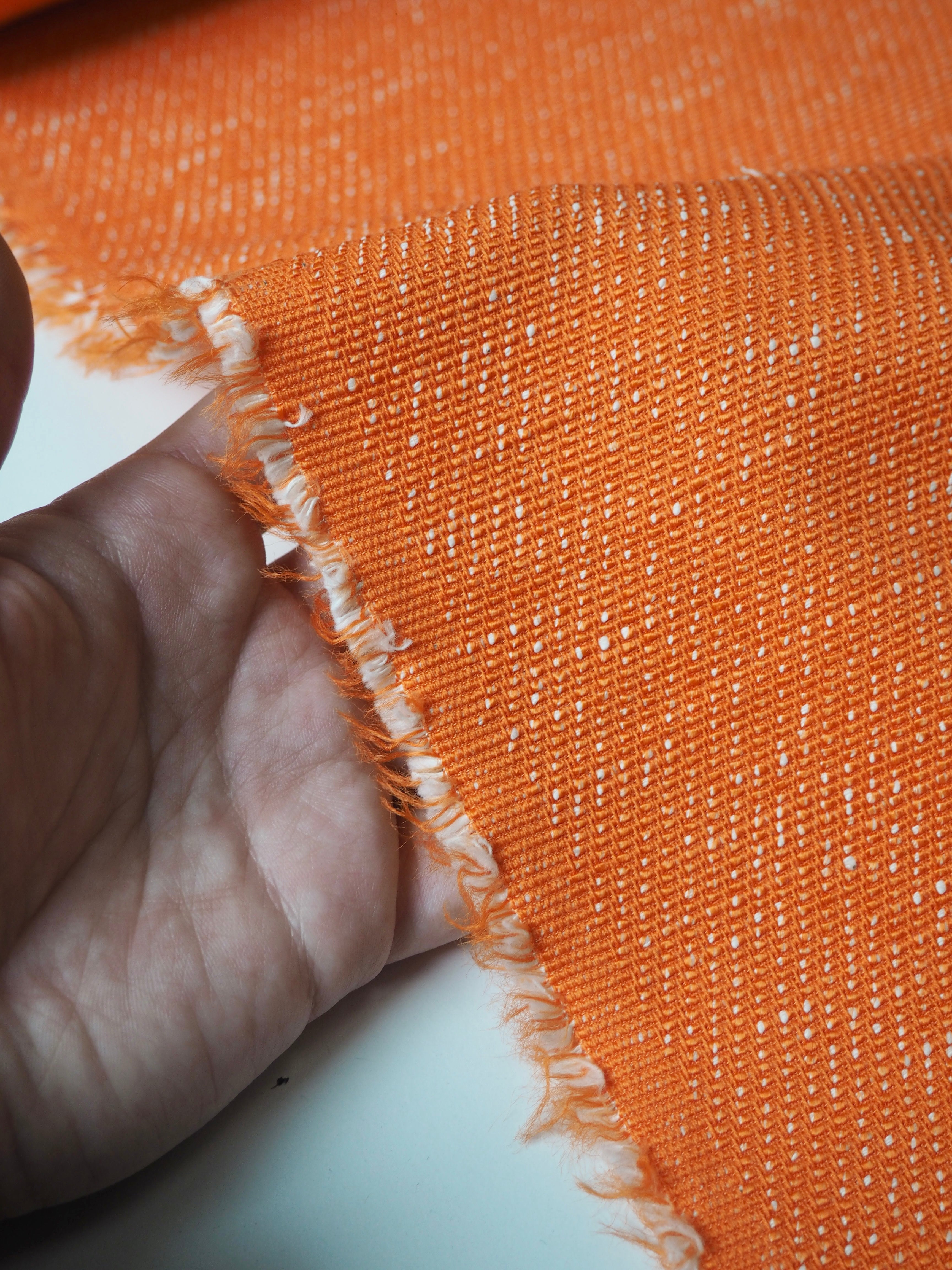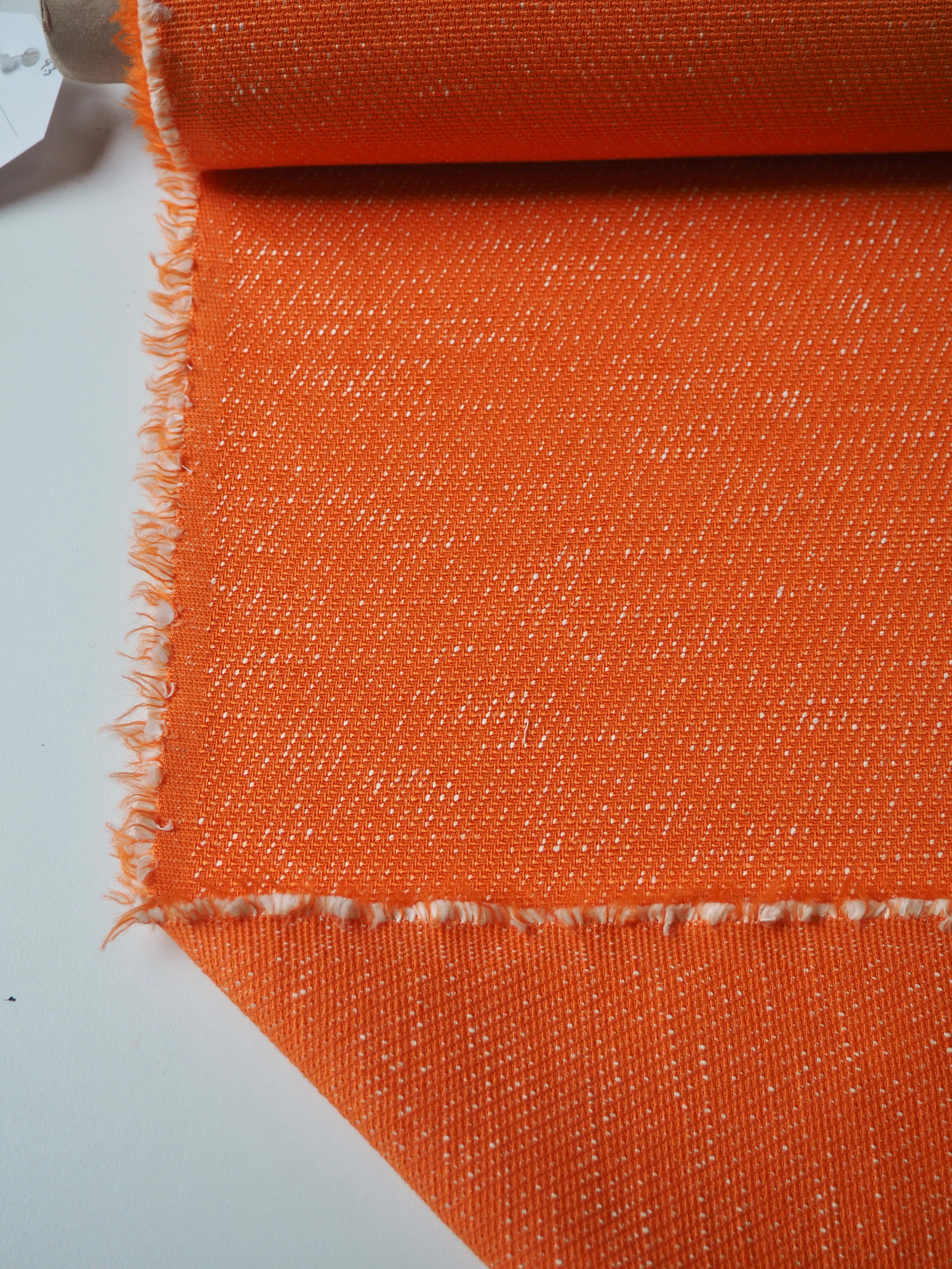 This ex-designer fabric is a cotton tweed. It has a tweed-like weave, which is sturdy and beautifully finished. Has a lovely risen texture that pairs wonderfully with the cotton/viscose blend. Very comfortable and breathable, with a gentle structure. Opaque and medium weight. In a rich orange colour. The perfect cloth for a lightweight jacket, blazer, or even home furnishings!