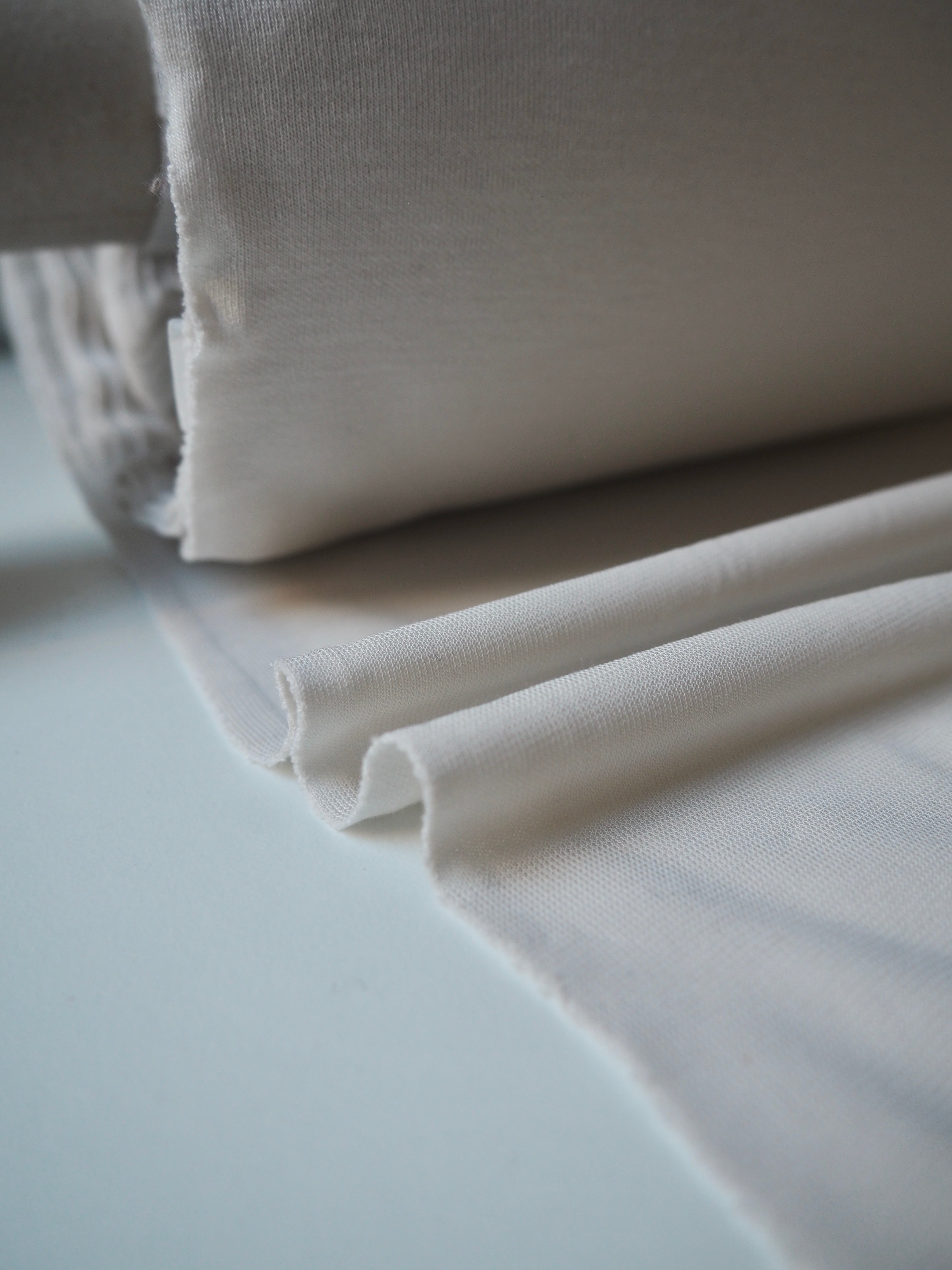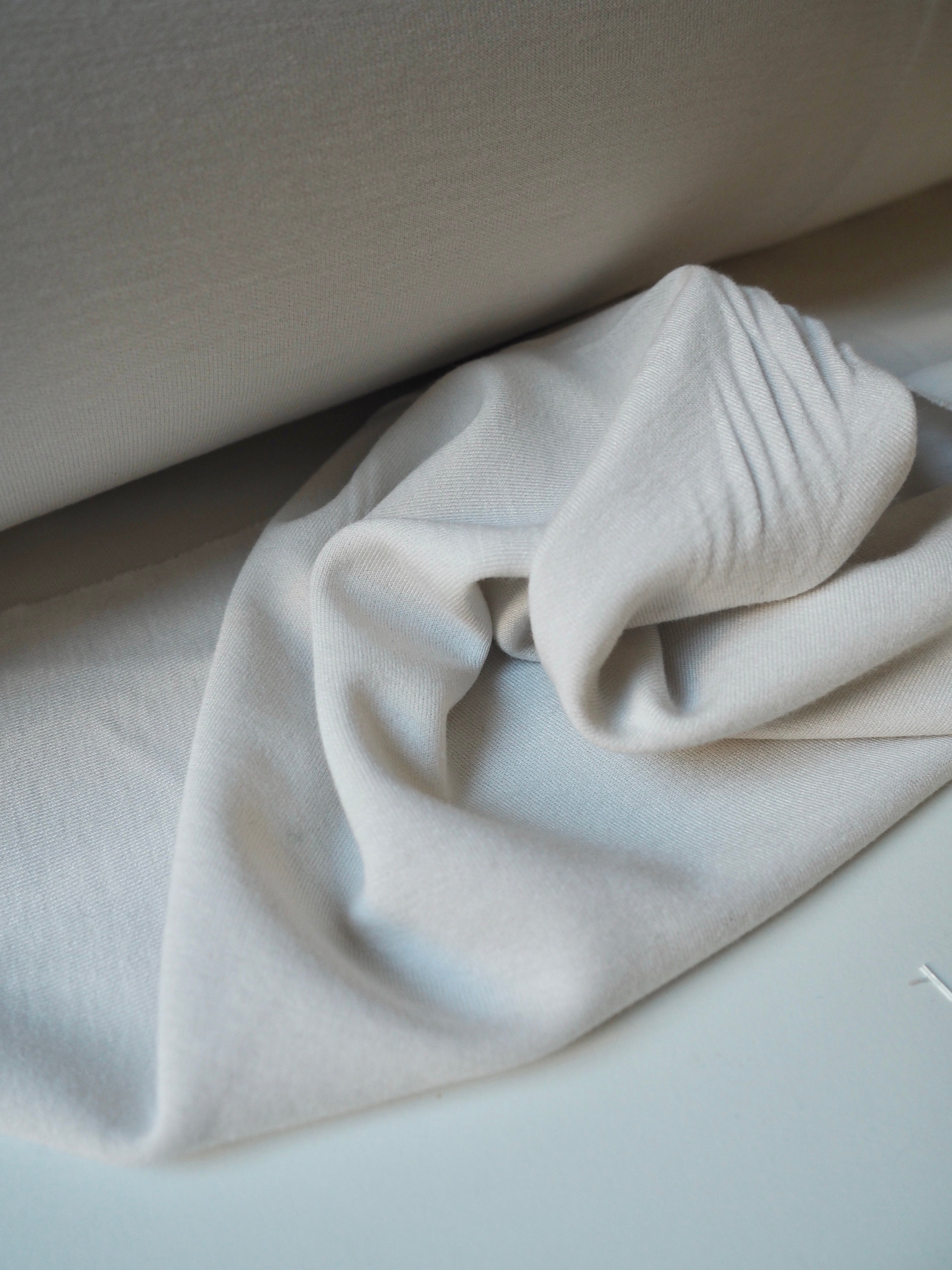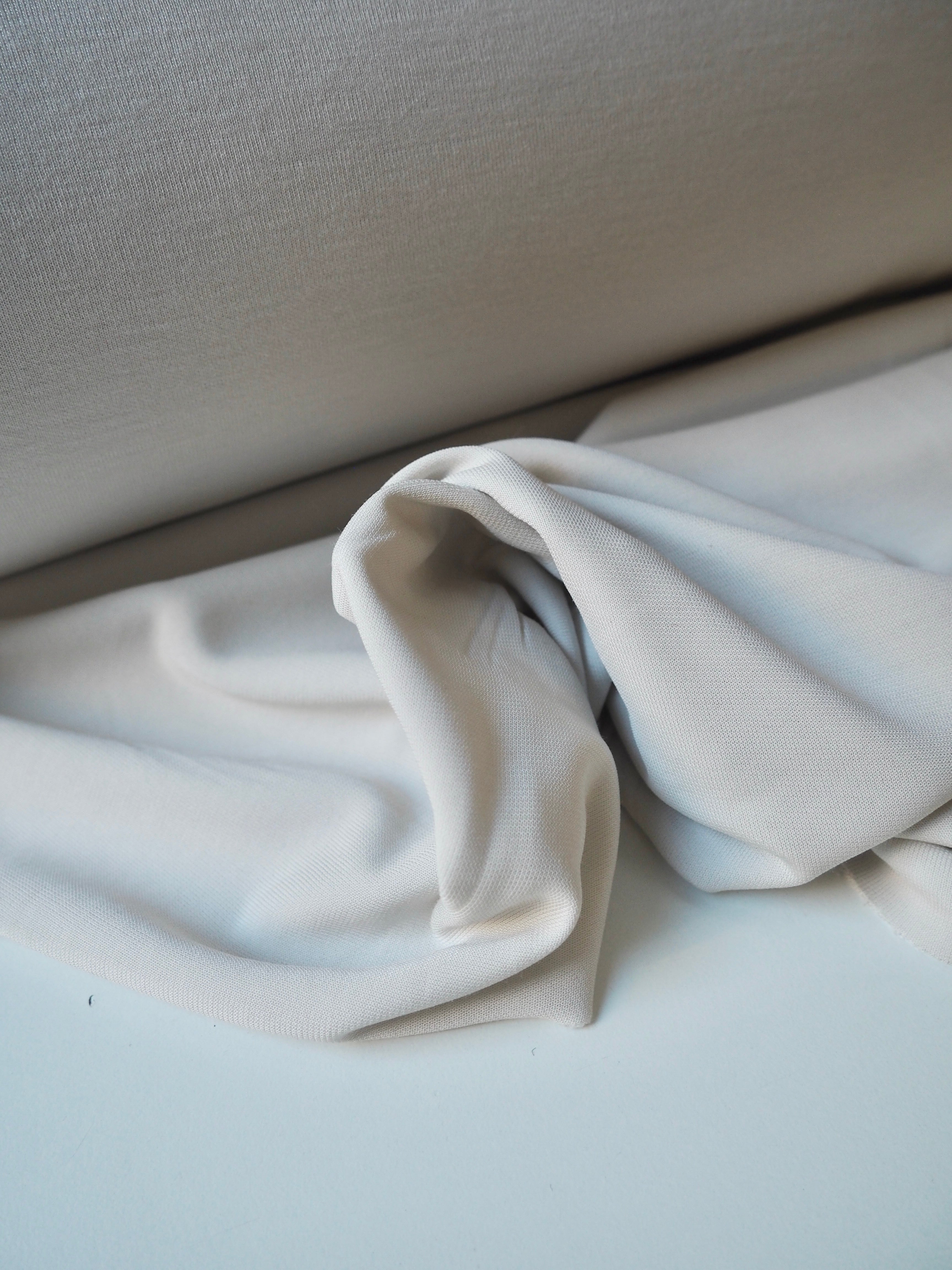 This ex-designer fabric is a jersey. It's a double jersey with one side in viscose and the other in nylon. It has a beautiful drape that’s quite swishy, and a soft and slightly slinky handle. Quite lightweight! Has about 20% stretch both ways, and great recovery. Mostly opaque, only slightly sheer in the light. Perfect for tops or a skirt!