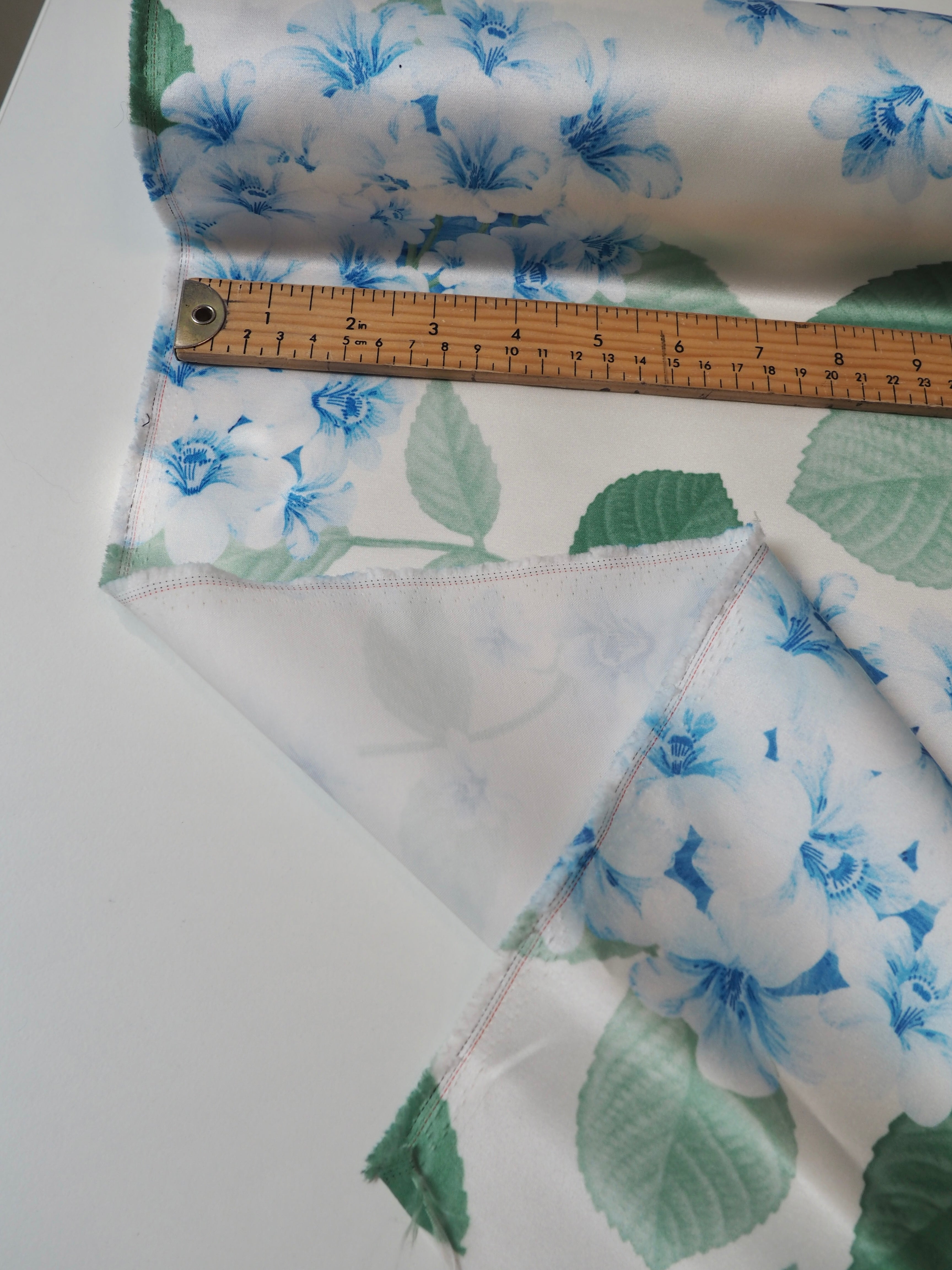 This ex-designer fabric is a satin. Pale blue flowers are large printed over a white background. It's a bespoke print from a well-known London designer. It is medium weight and falls beautifully with a lovely satin sheen. Pre-interfaced for extra structure. Opaque with a smooth handle. Great for garments that need a bit of structure, like a skirt, fitted dress, or even a jacket!