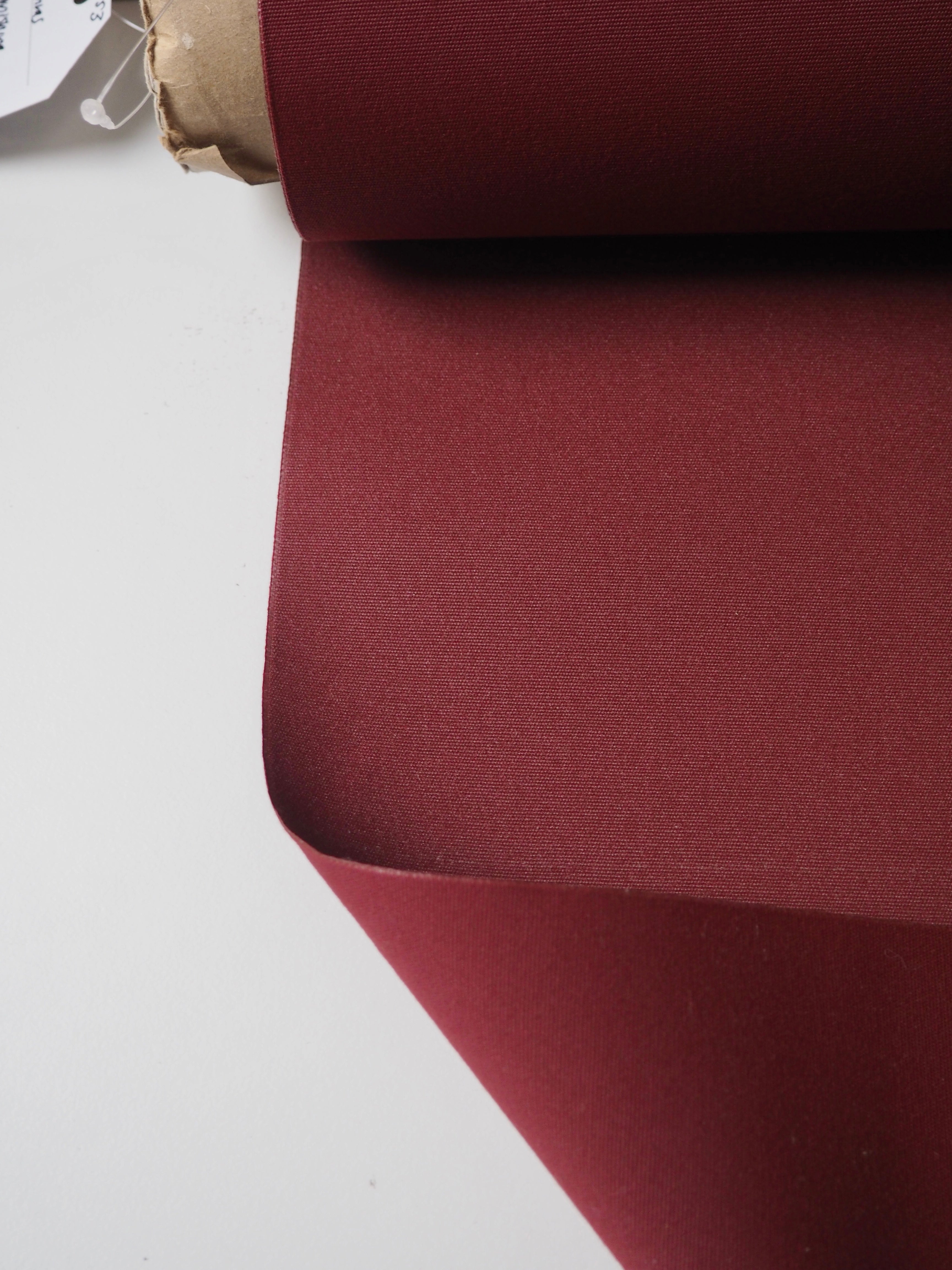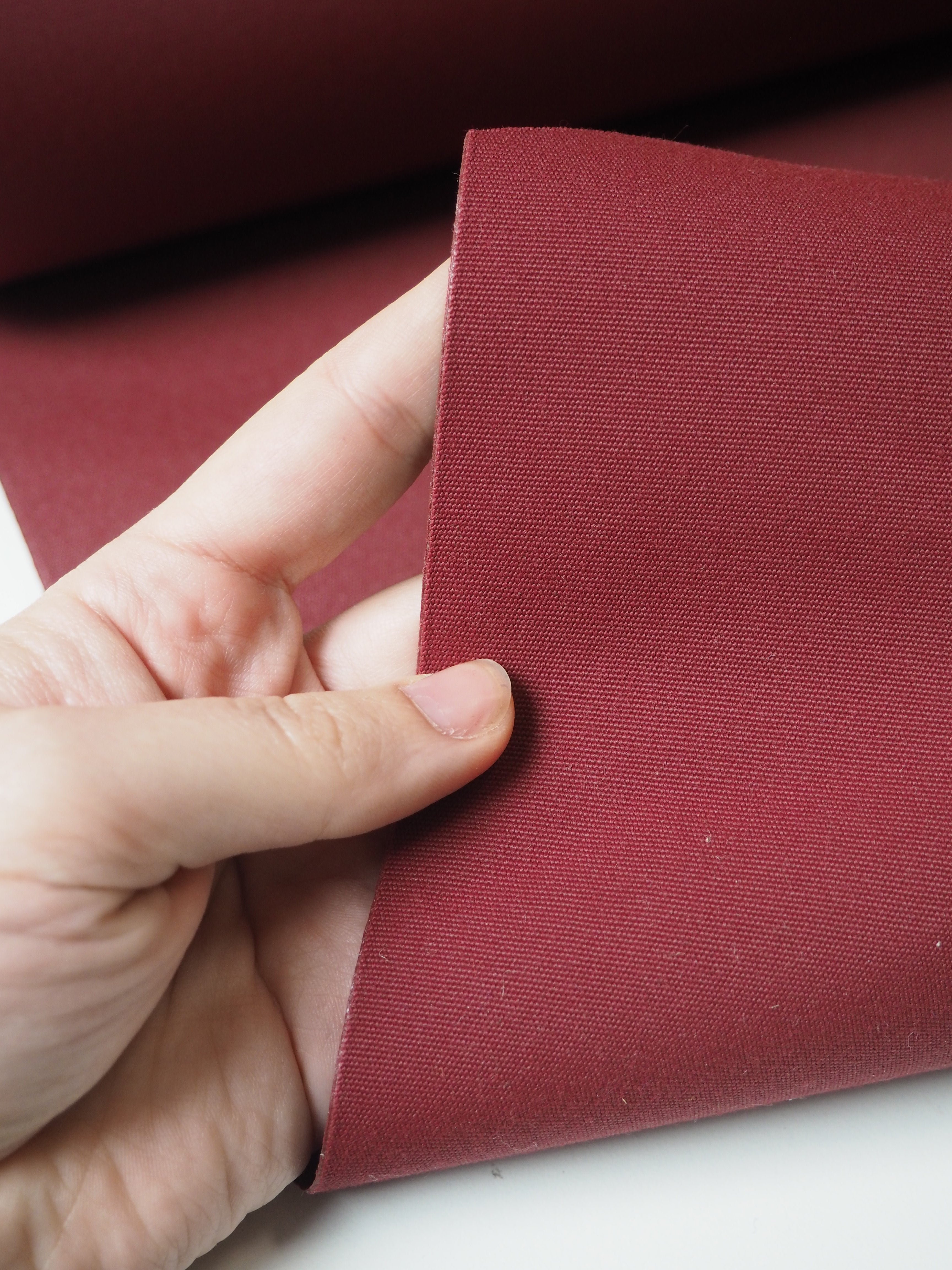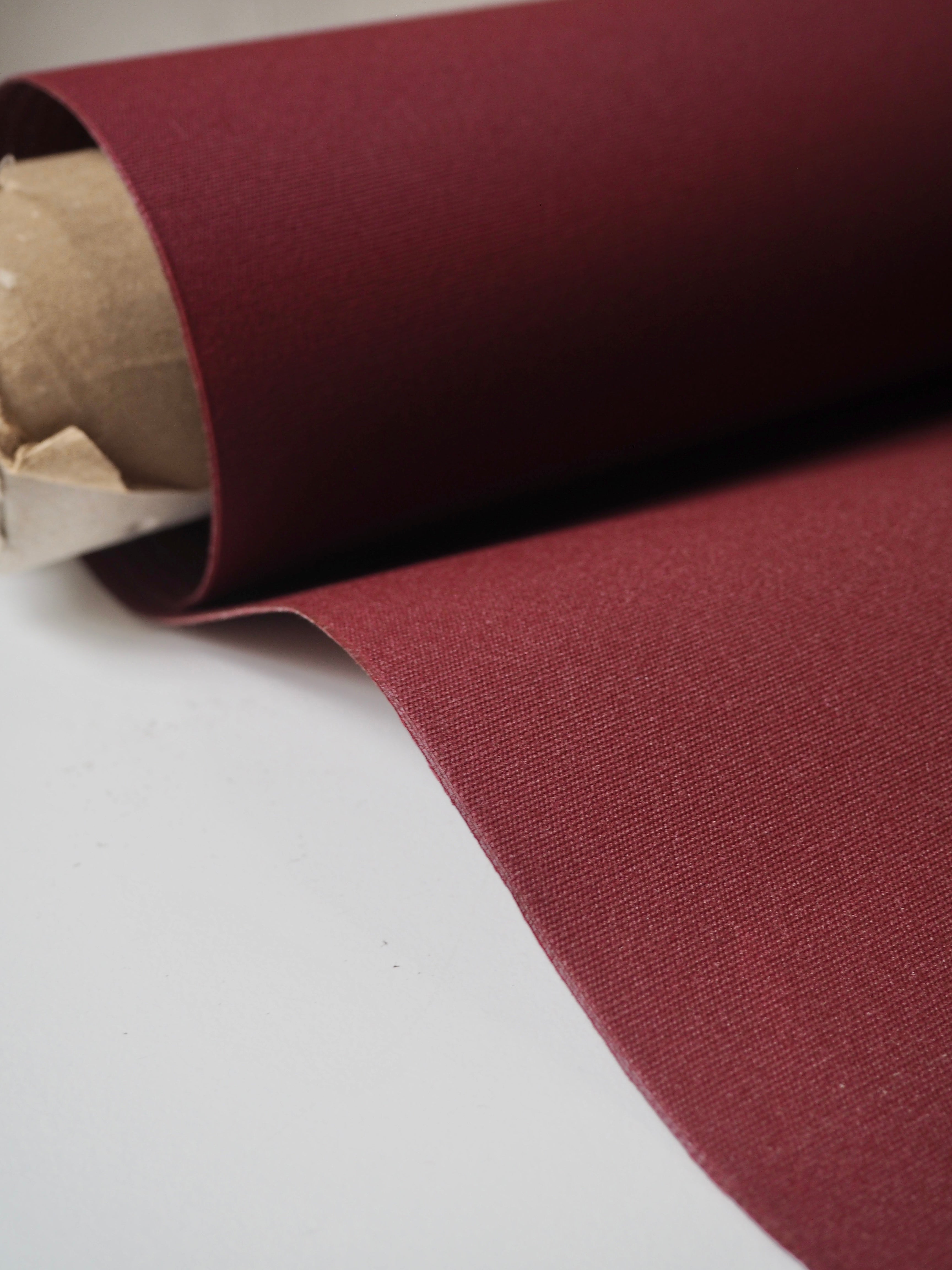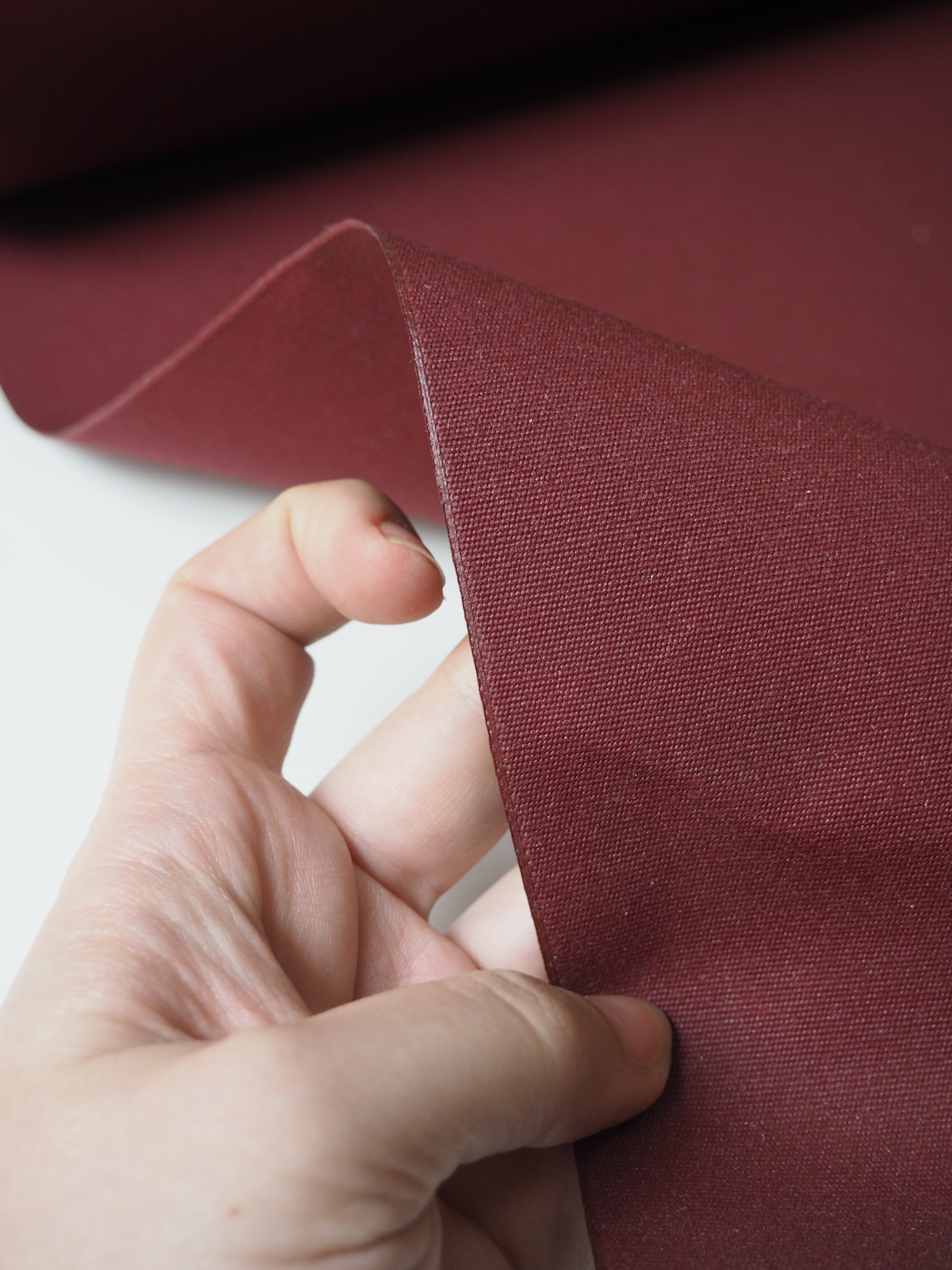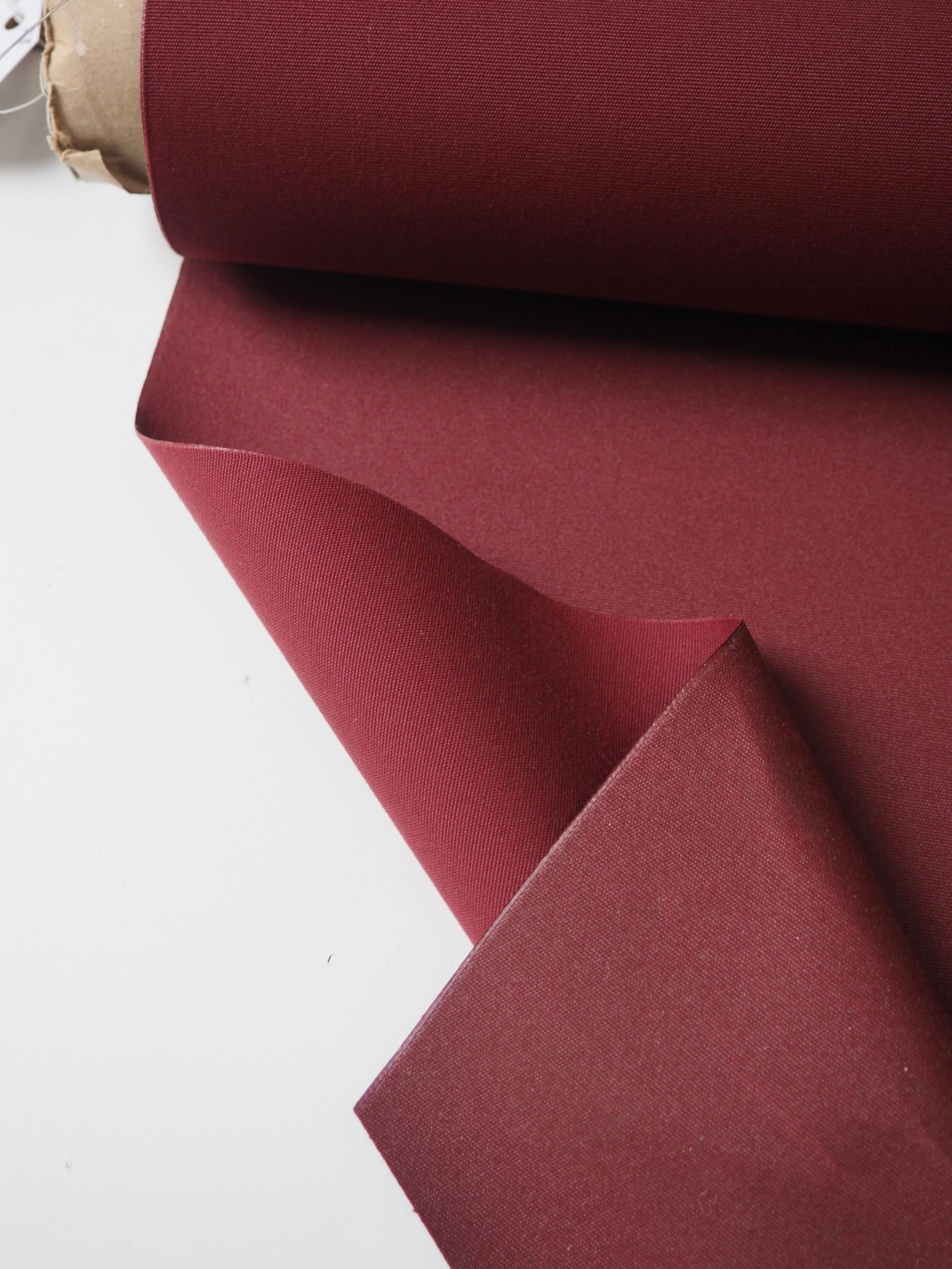 This ex-designer fabric is a canvas. It's dark red with a coated backing. Lightweight with a typical canvas weave and sturdy handle. It's a very structured canvas made for furnishing projects, but can be used as you like!