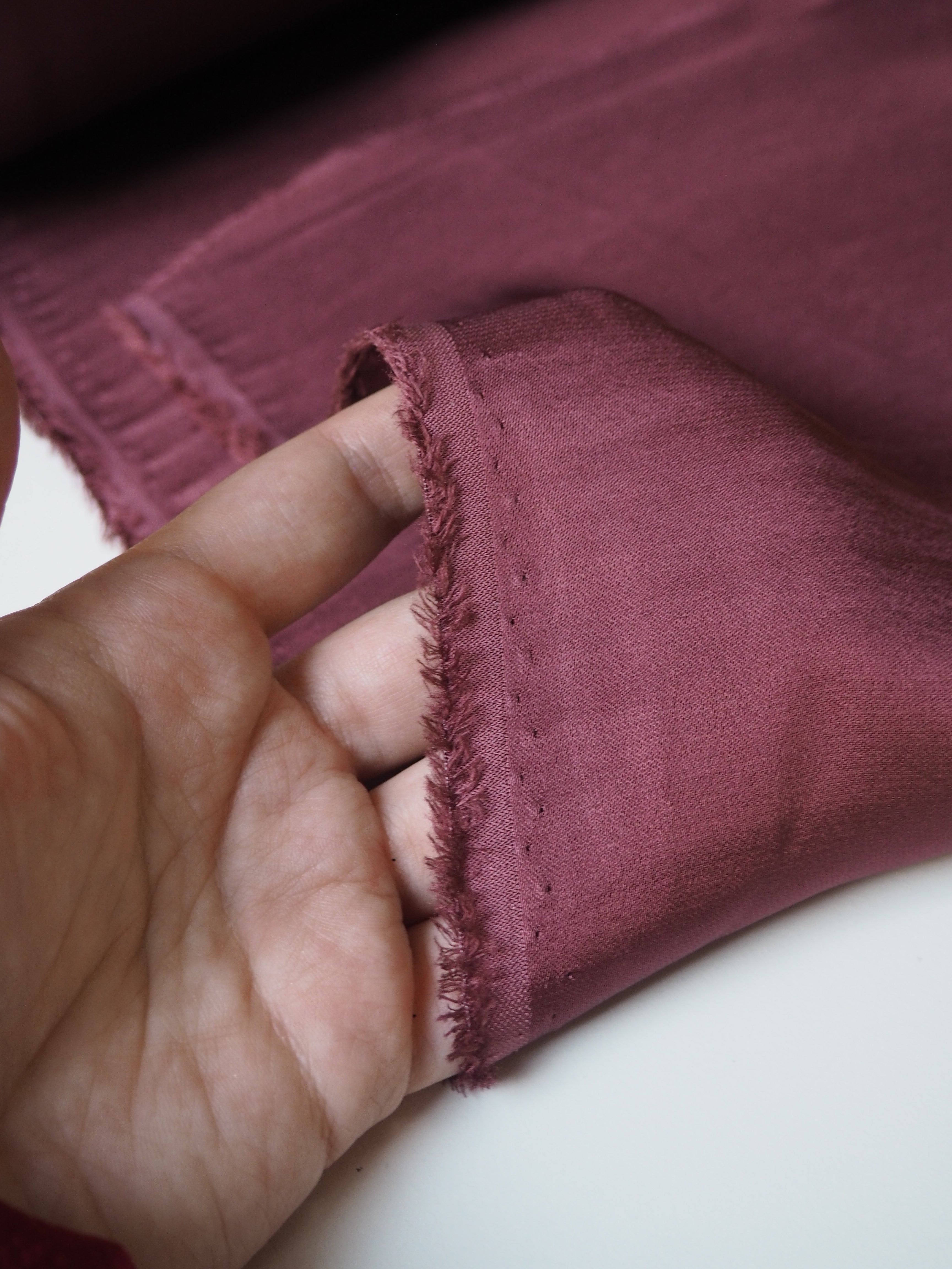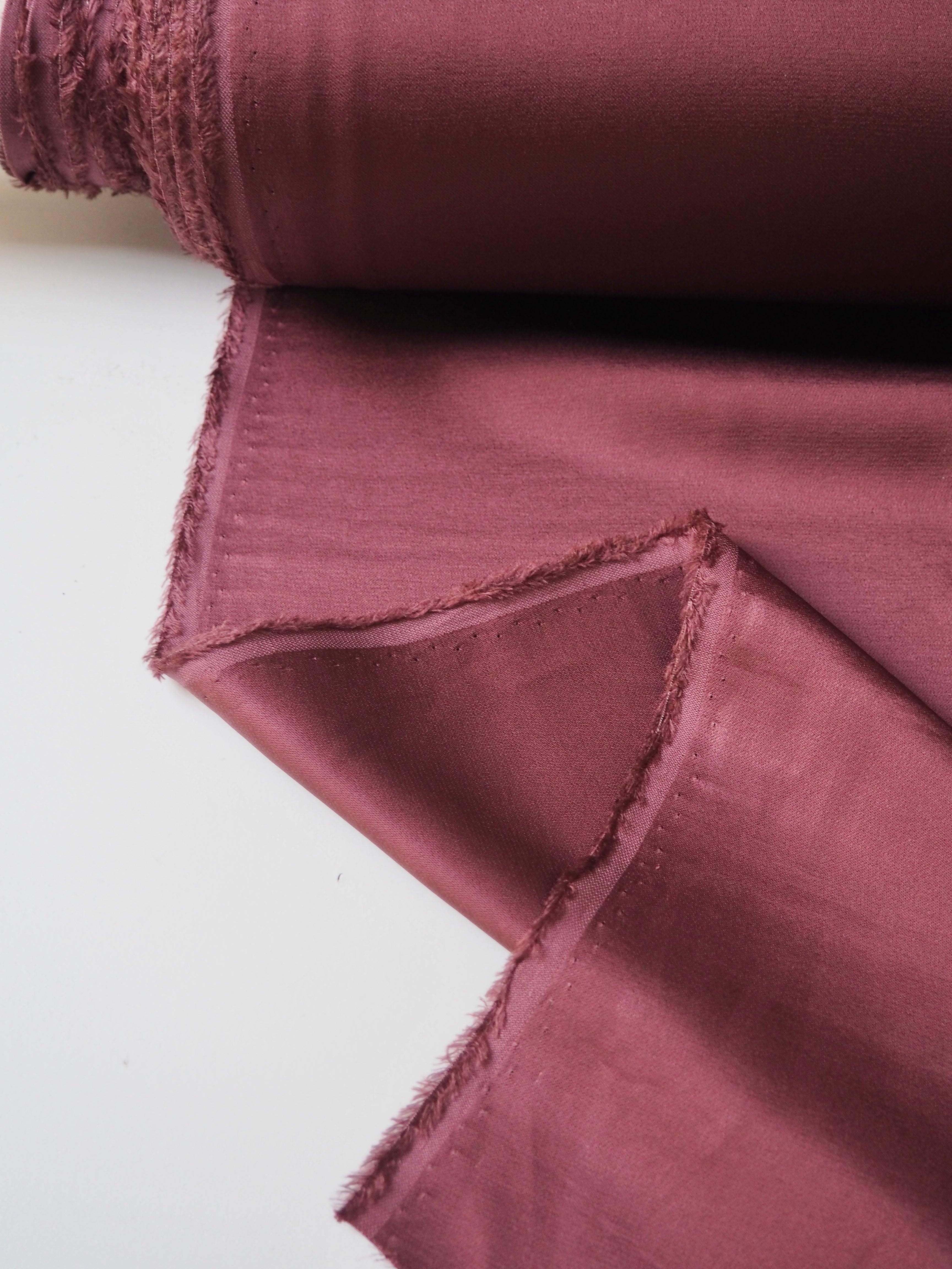 This ex-designer fabric is a crepe satin. It's in a rosewood pink shade, with a light weight. It has a very smooth handle, slinky feel, and great movement and drape. Has a lovely satin sheen on the topside, with a gentle crepe reverse. The sides could be used interchangeably. Has such a lovely handle, and is fully opaque. Perfect for dresses or swishy trousers!