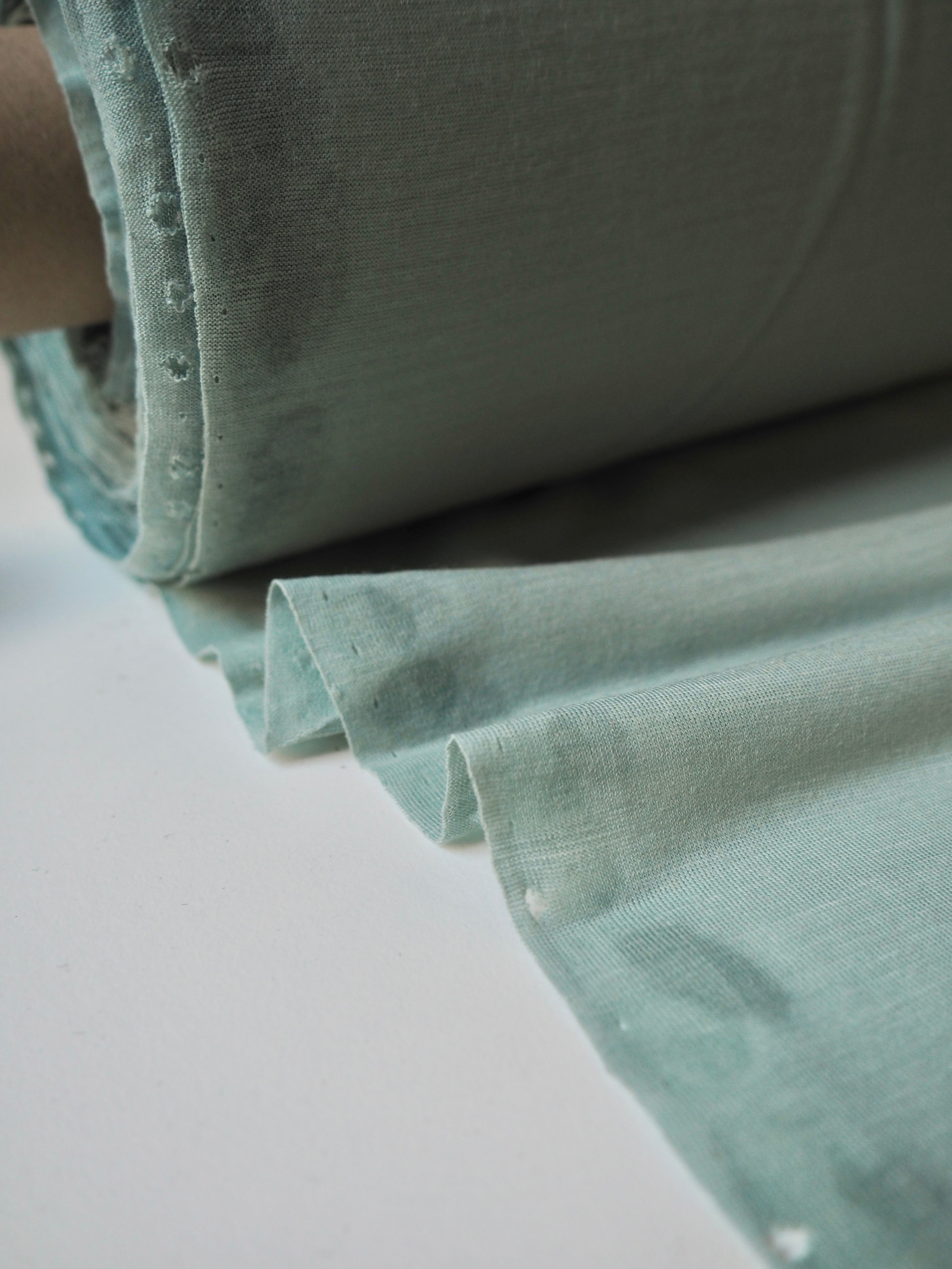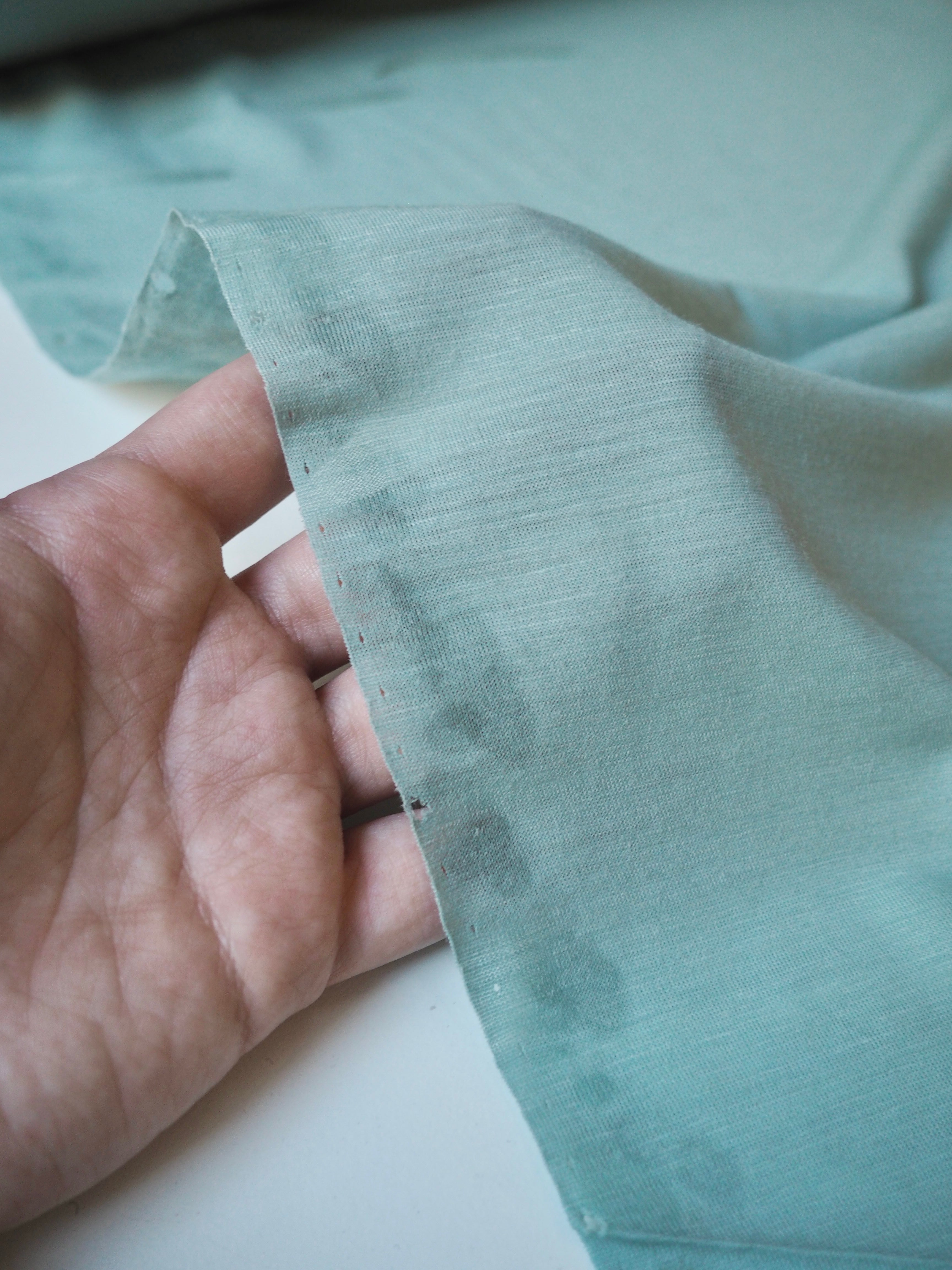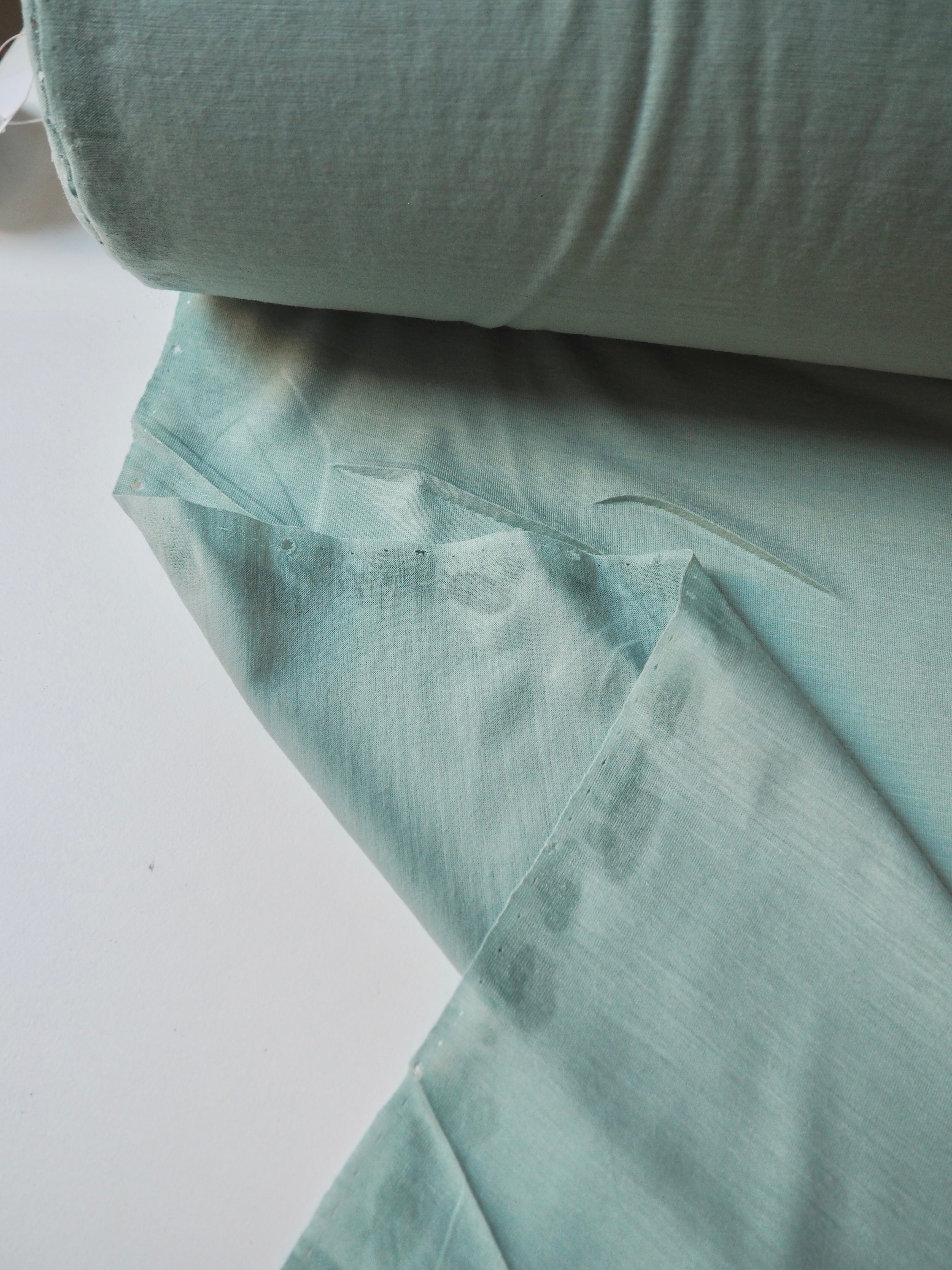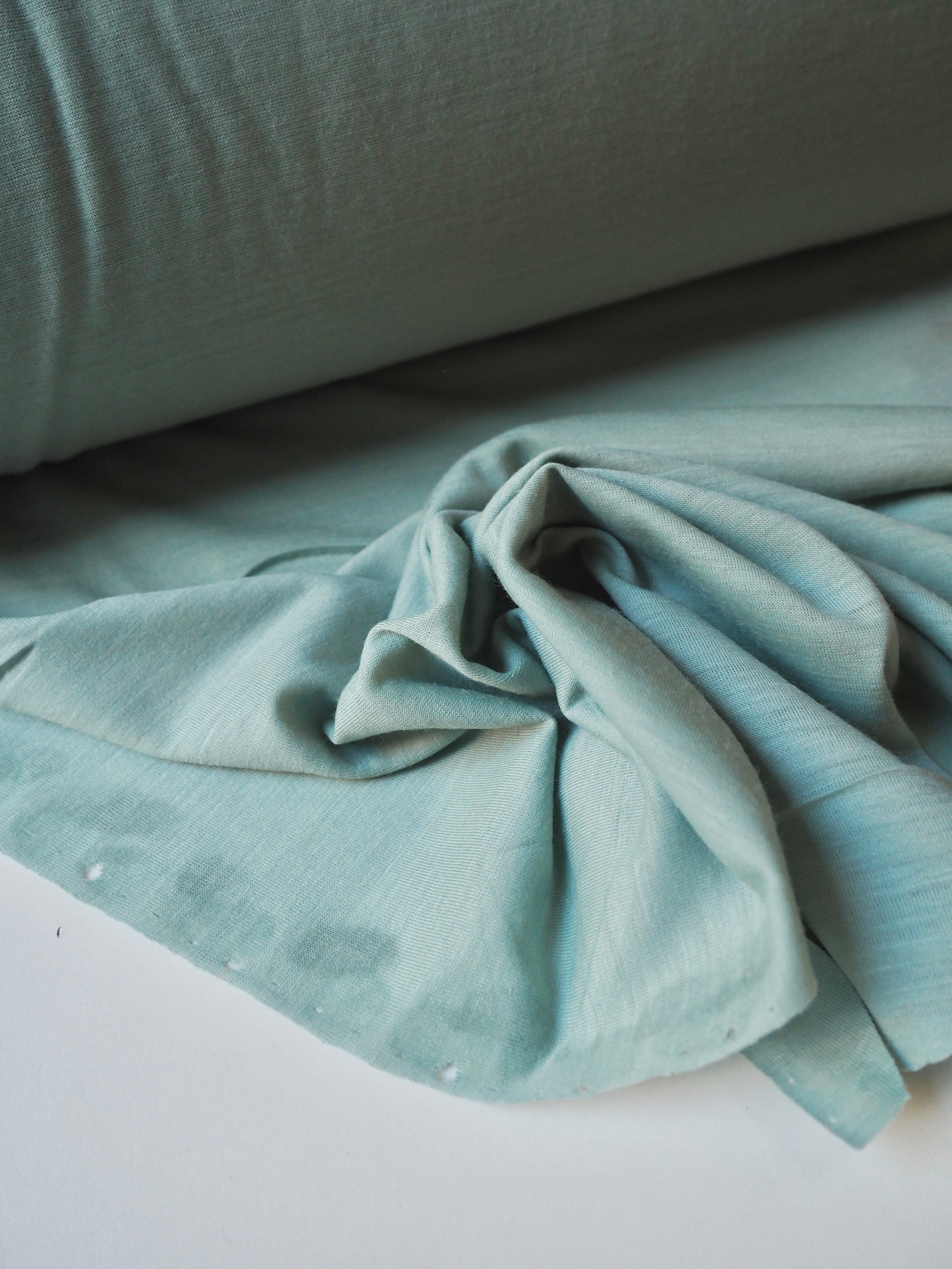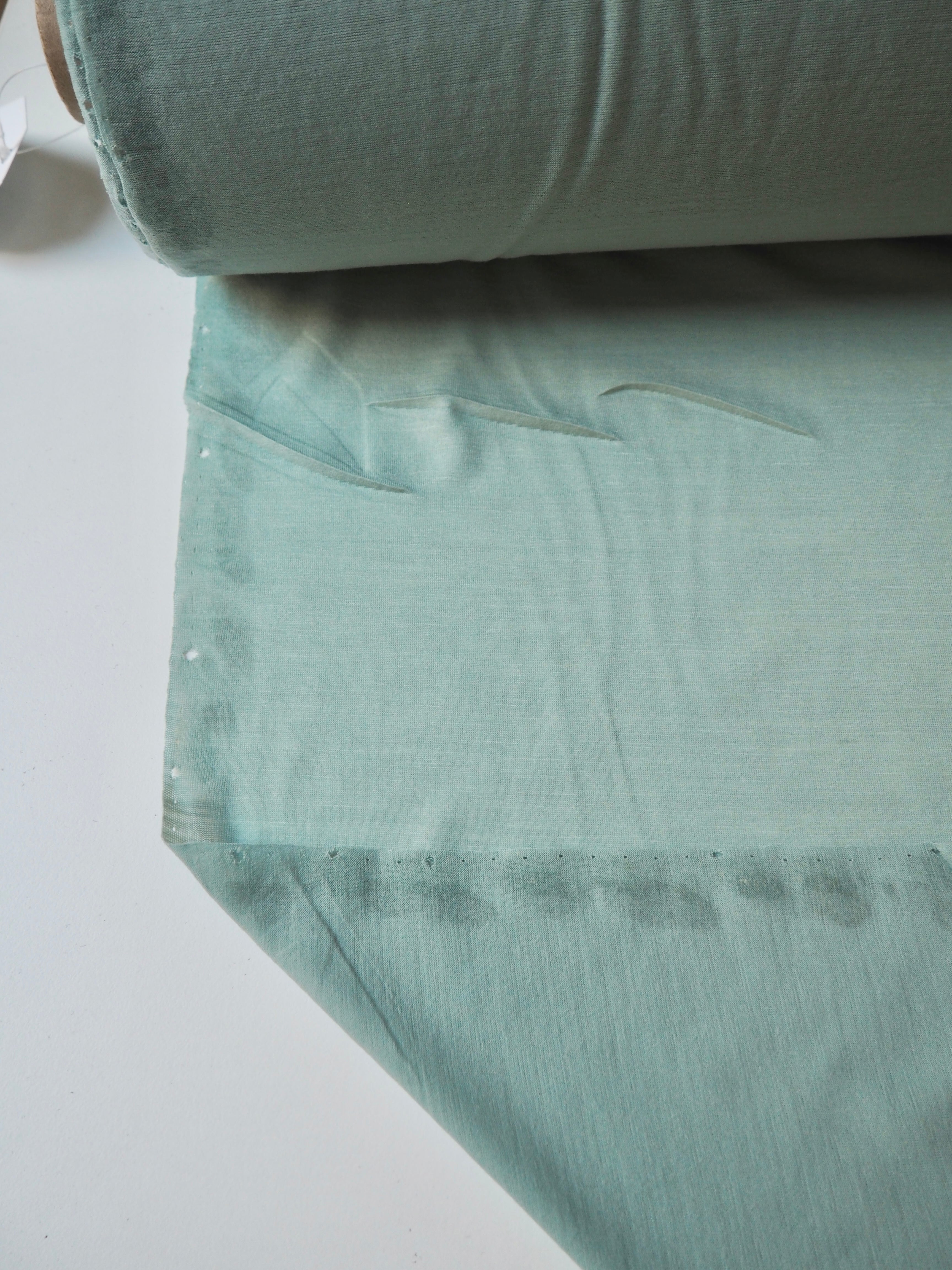 This ex-designer fabric is a wool jersey. This t-shirt jersey is a finer weight, in a super warm wool blend. Lightweight with a gentle drape. It's slightly sheer, and has a lovely light wool handle. Ideal for layering staples!
