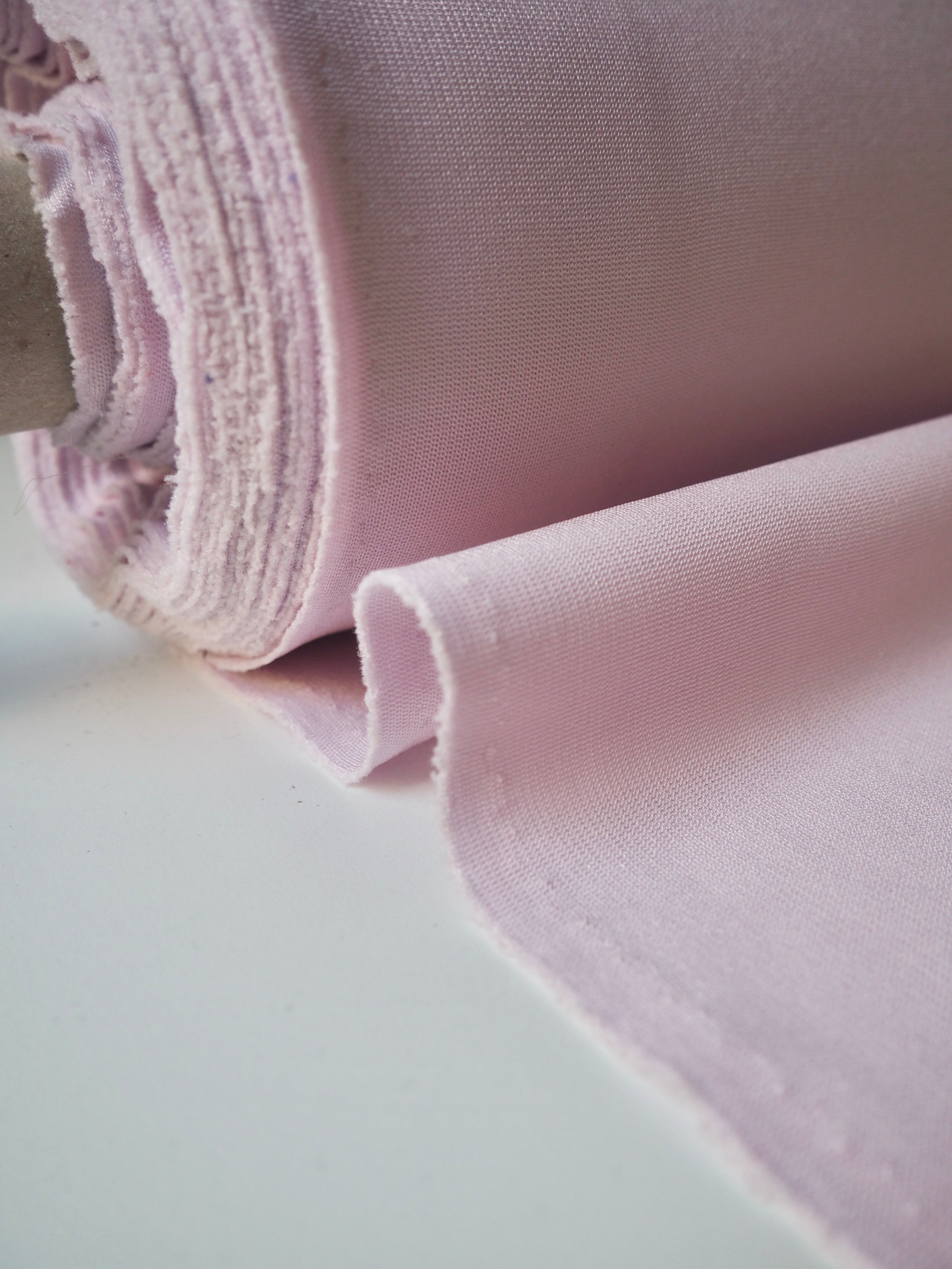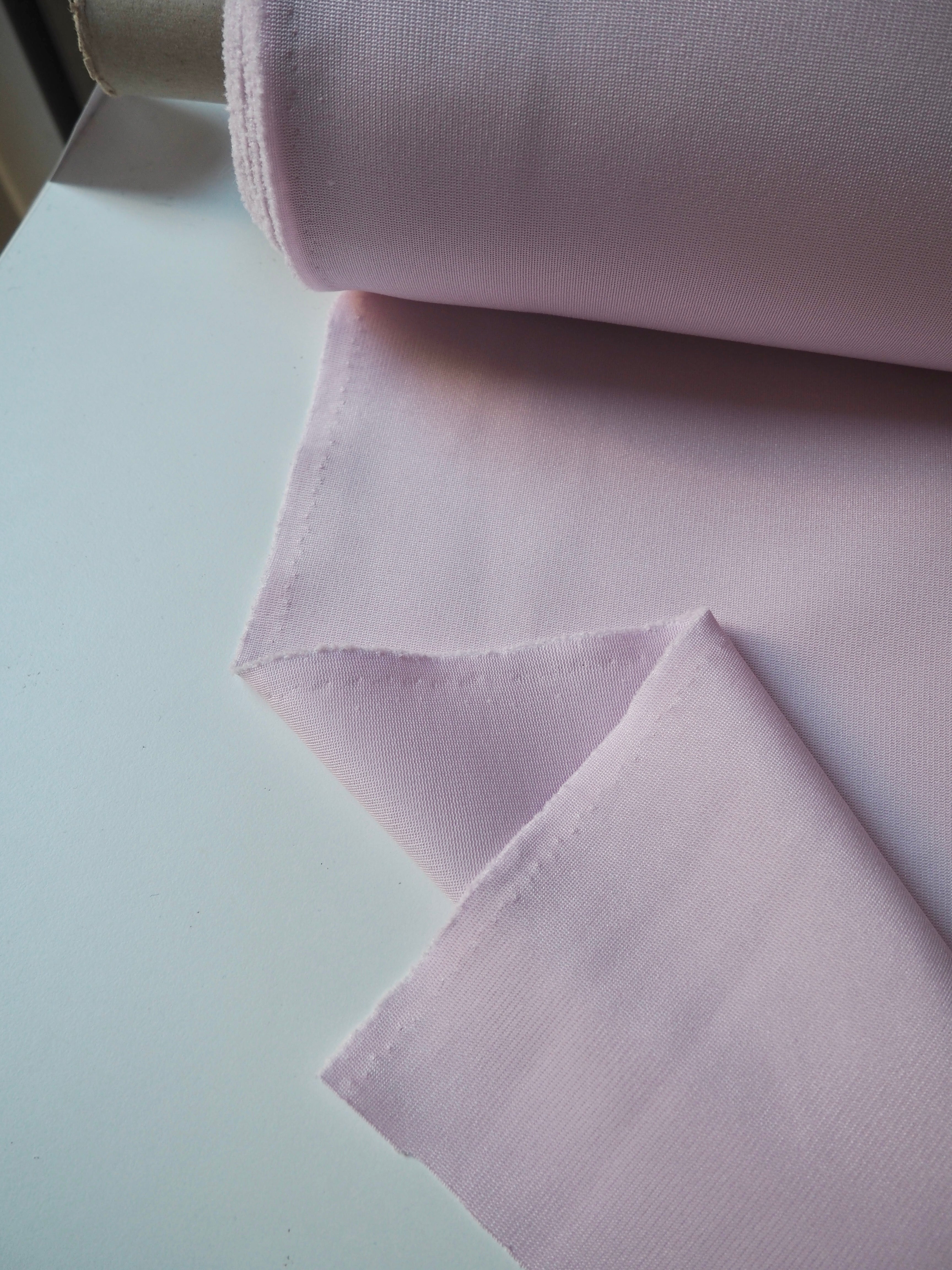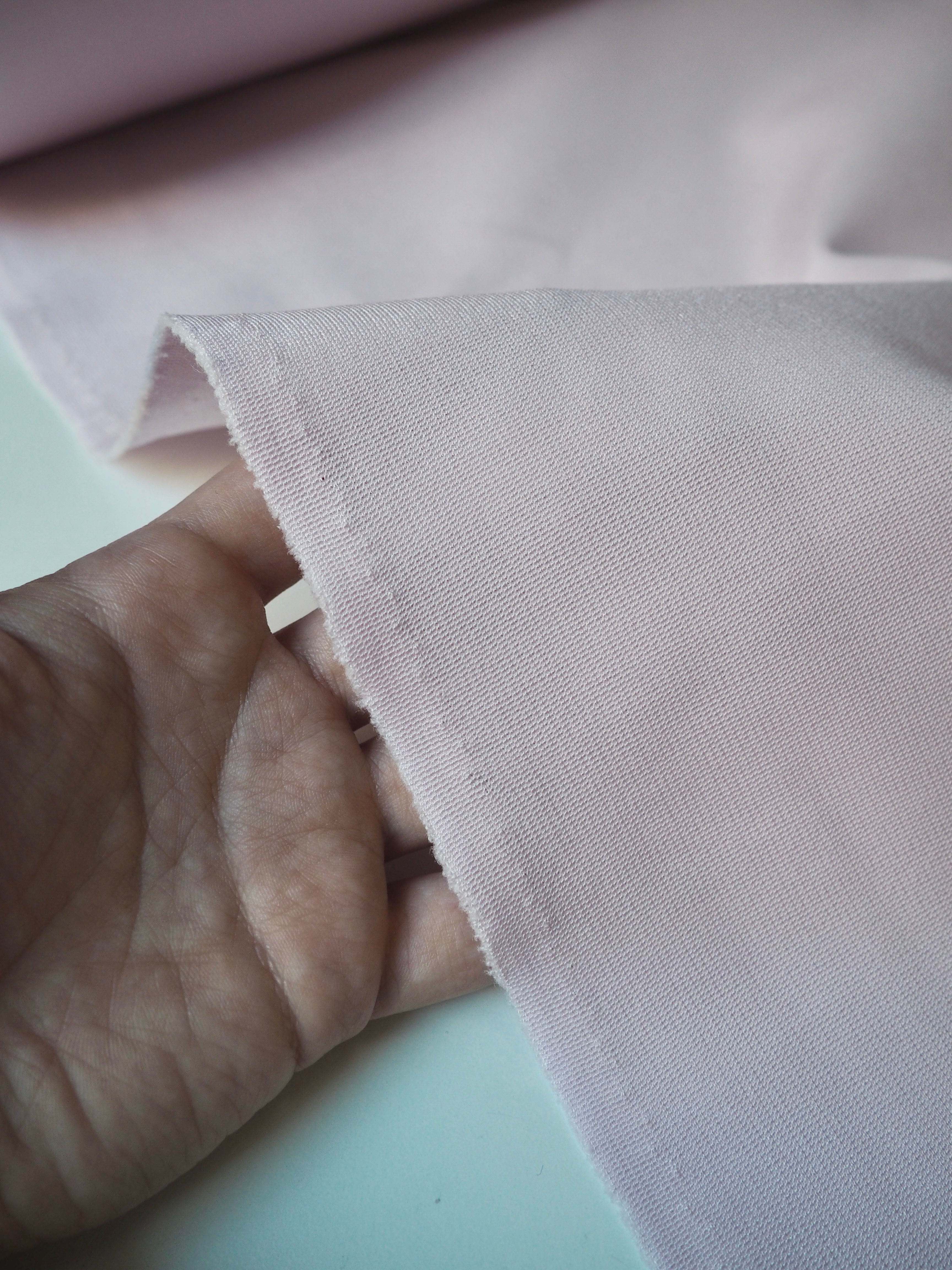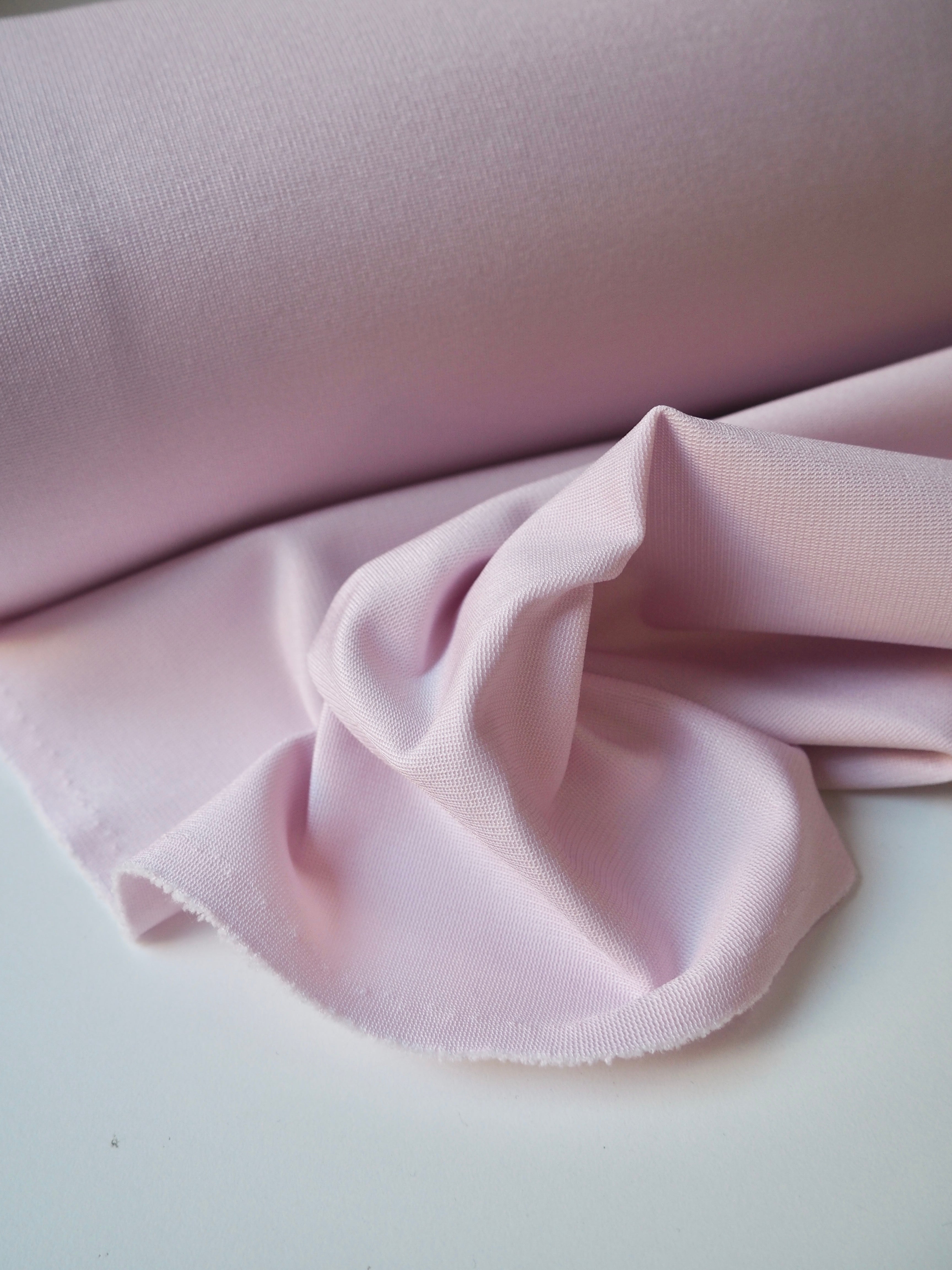 This ex-designer fabric is a jersey. Ponte di Roma is a double interlock jersey with a medium weight. It has a great structure and this one is sturdy with a light and lovely sheen finish. Has strong 50% stretch both ways, and great recovery. Perfect for bodycon dresses!
