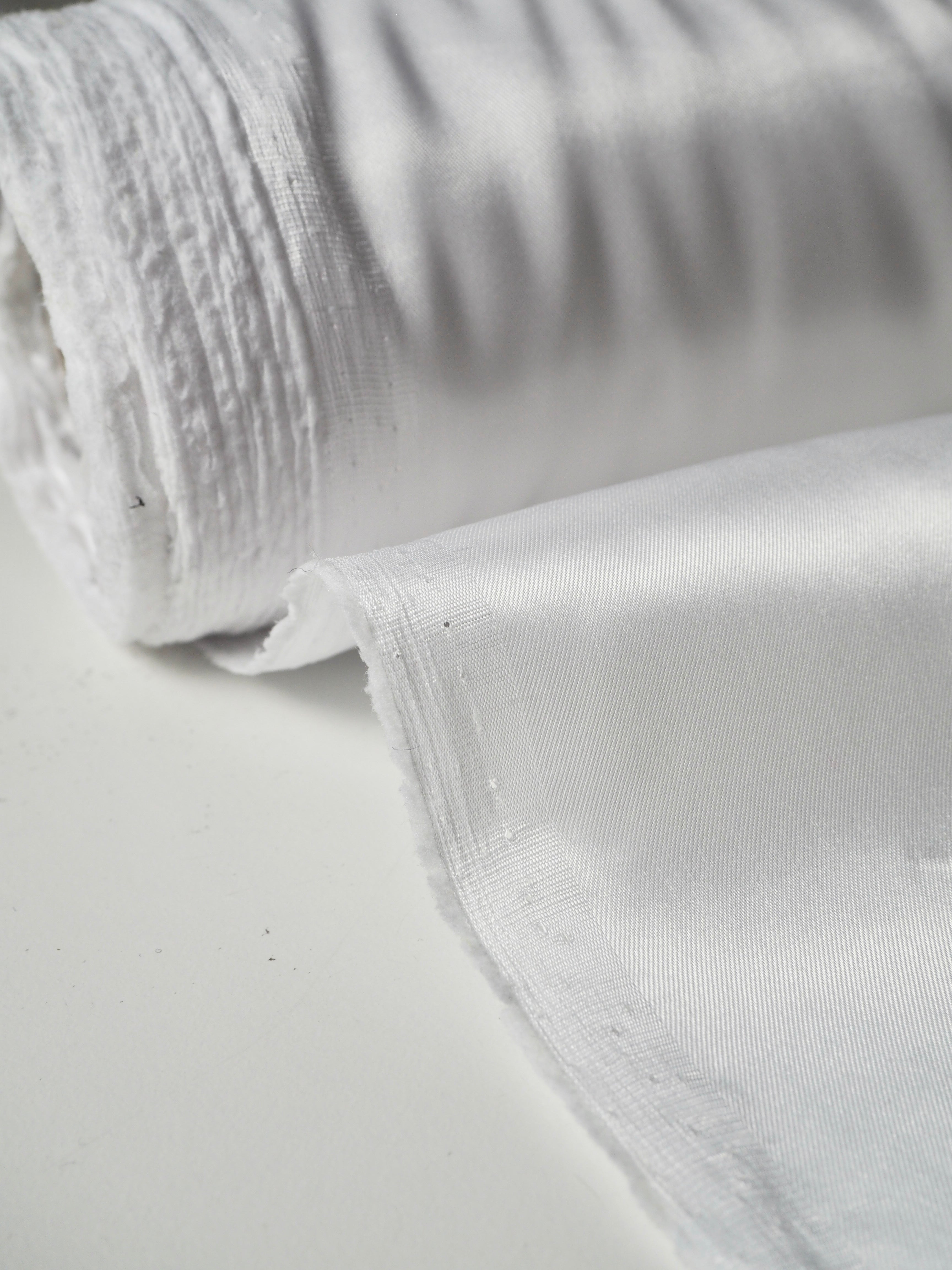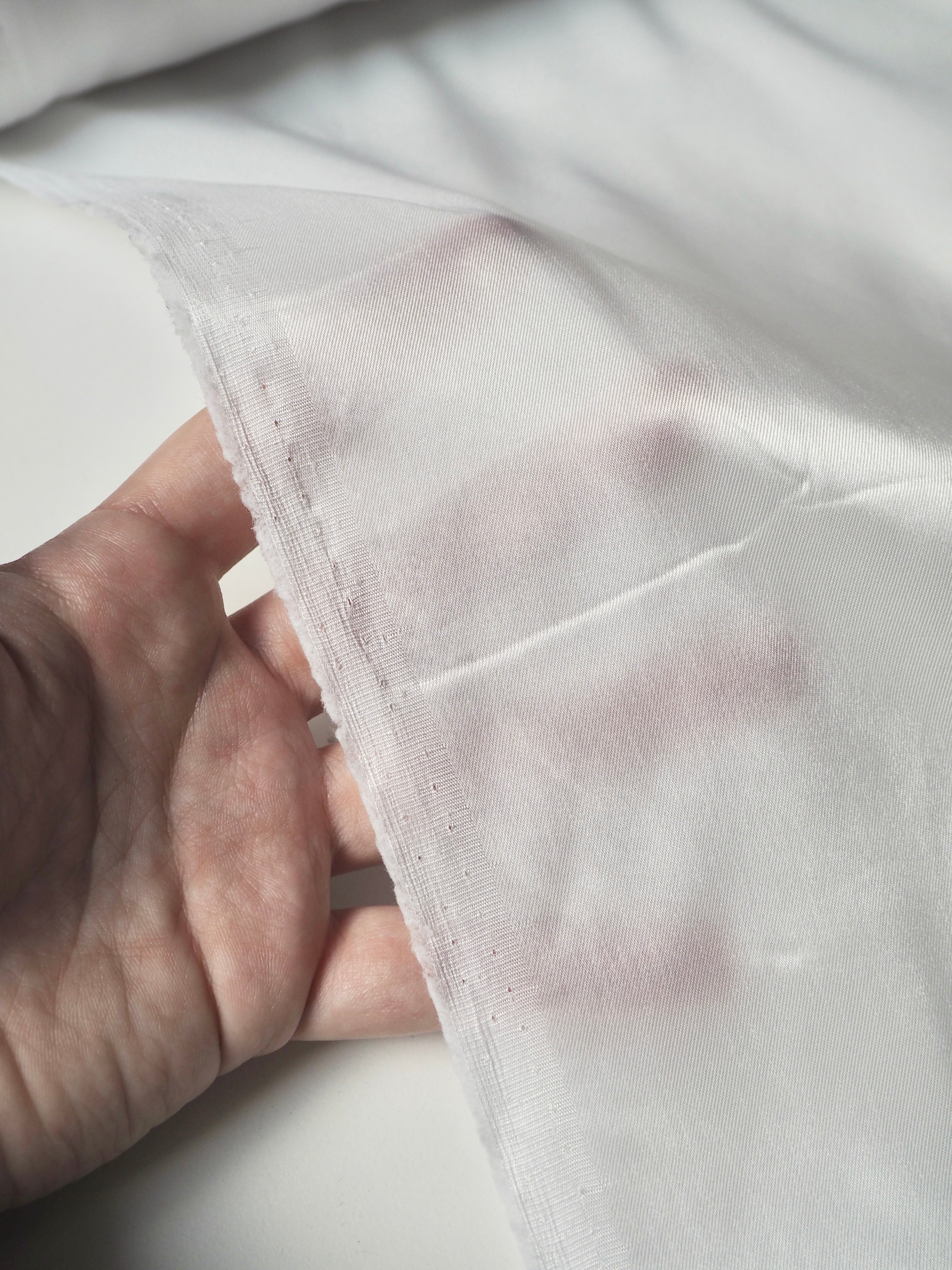 This ex-designer fabric is a lining. It has a subtle twill weave in a soft acetate fibre. Has about 10% stretch, width-ways. Lightweight with a gentle structure and light satin finish. Holds shape quite well, and is more sheer than opaque. Ideal for lining any garment, especially for bridal!