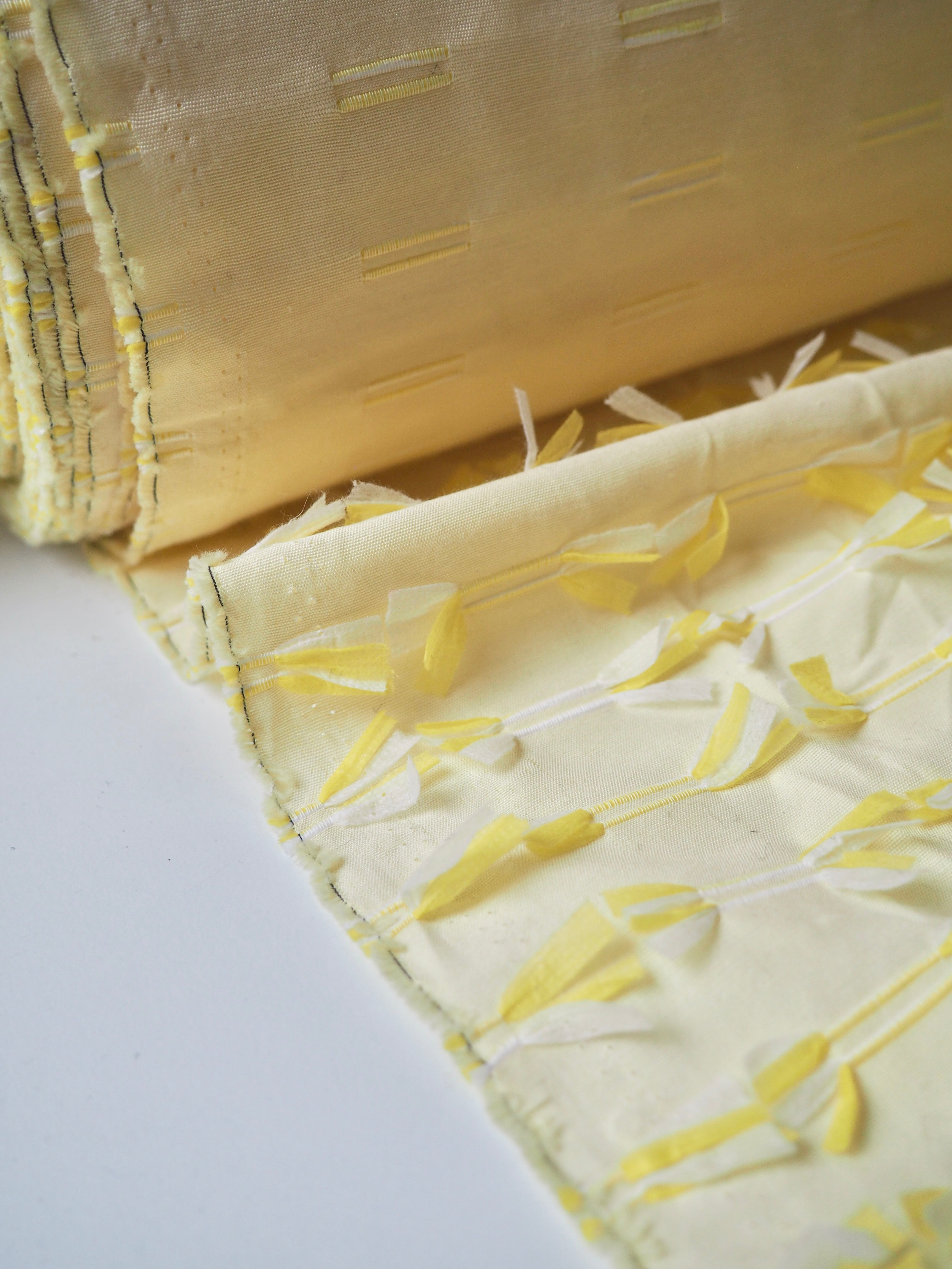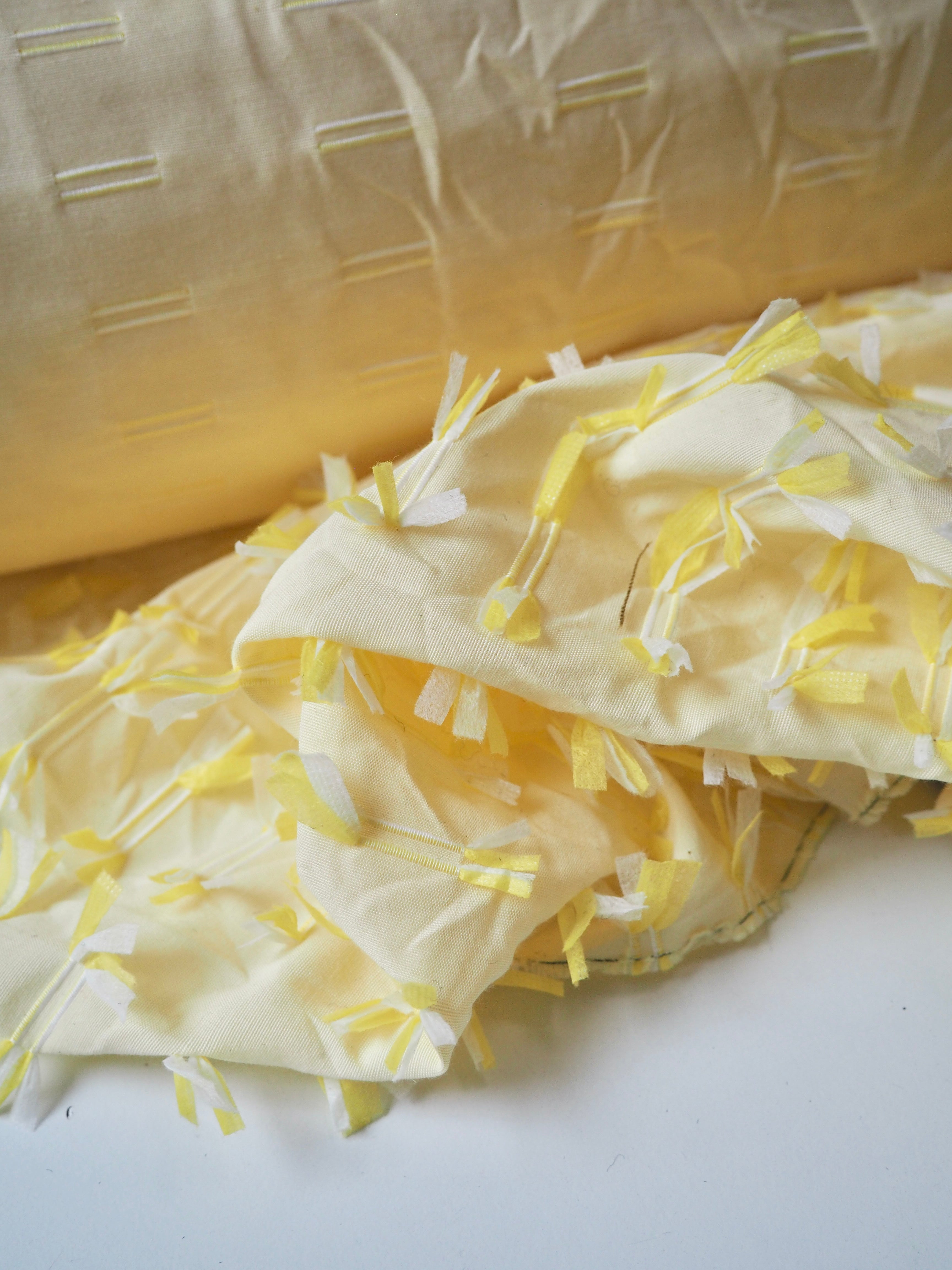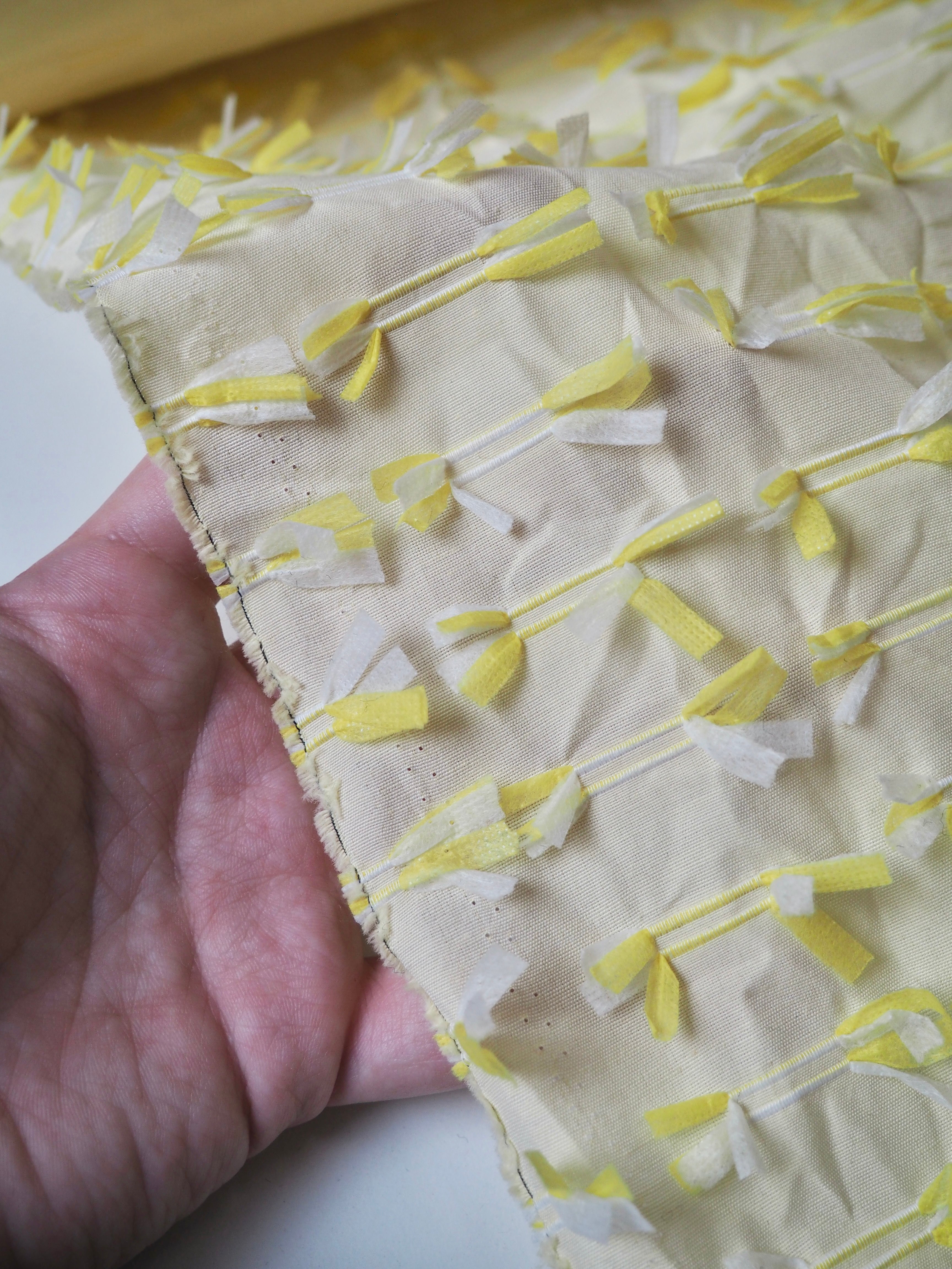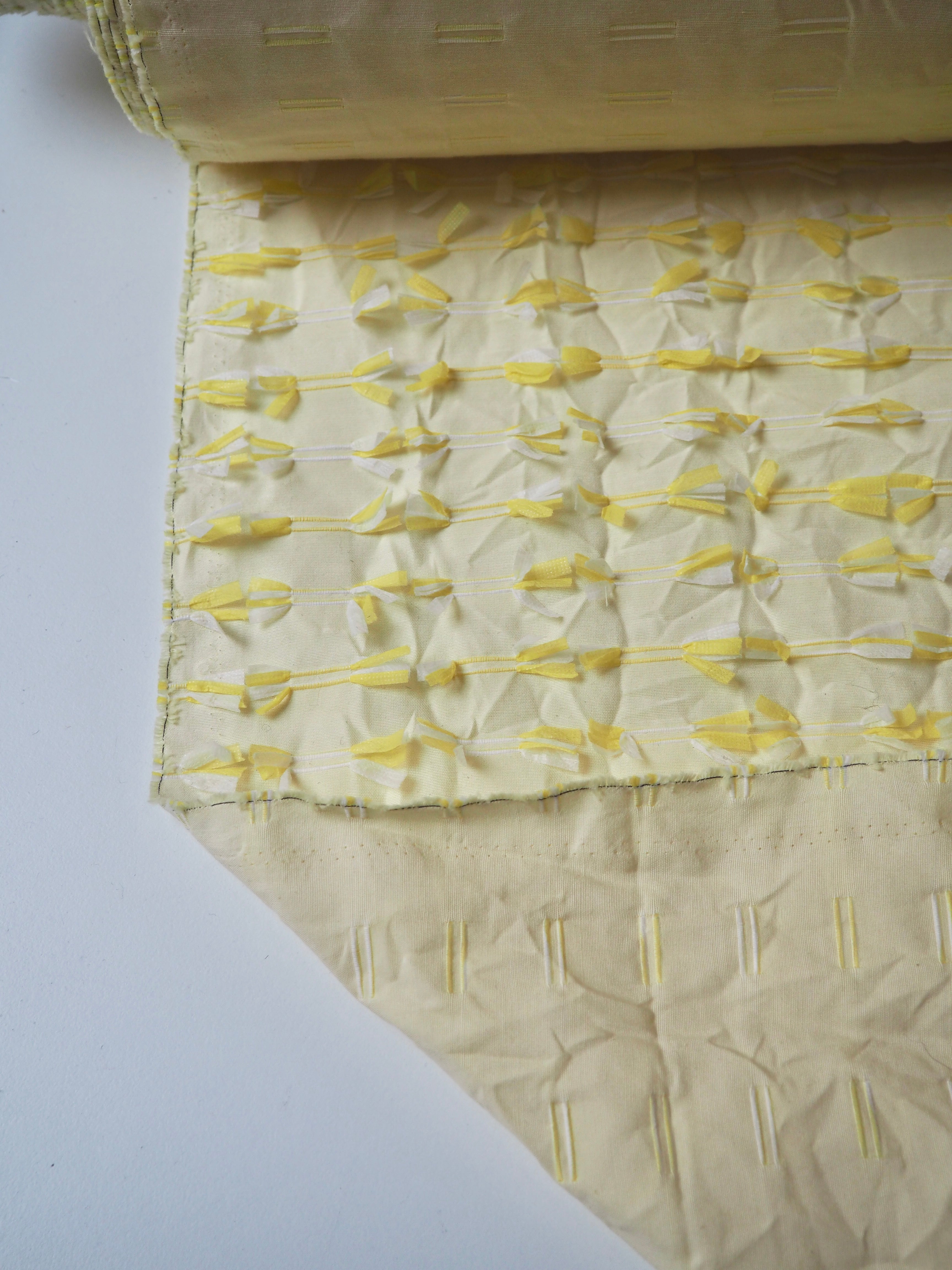 This ex-designer fabric is an embroidered cotton. Yellow and white poly threads are embroidered into buttonhole-like lines on one side of this yellow plain weave cotton, with a fringed finish on the other side. Either side can be used! A versatile cloth that's very unique. Soft and with a slight structure and textured handle. Light to medium weight and almost fully opaque. Would look incredible on a top or shift dress!