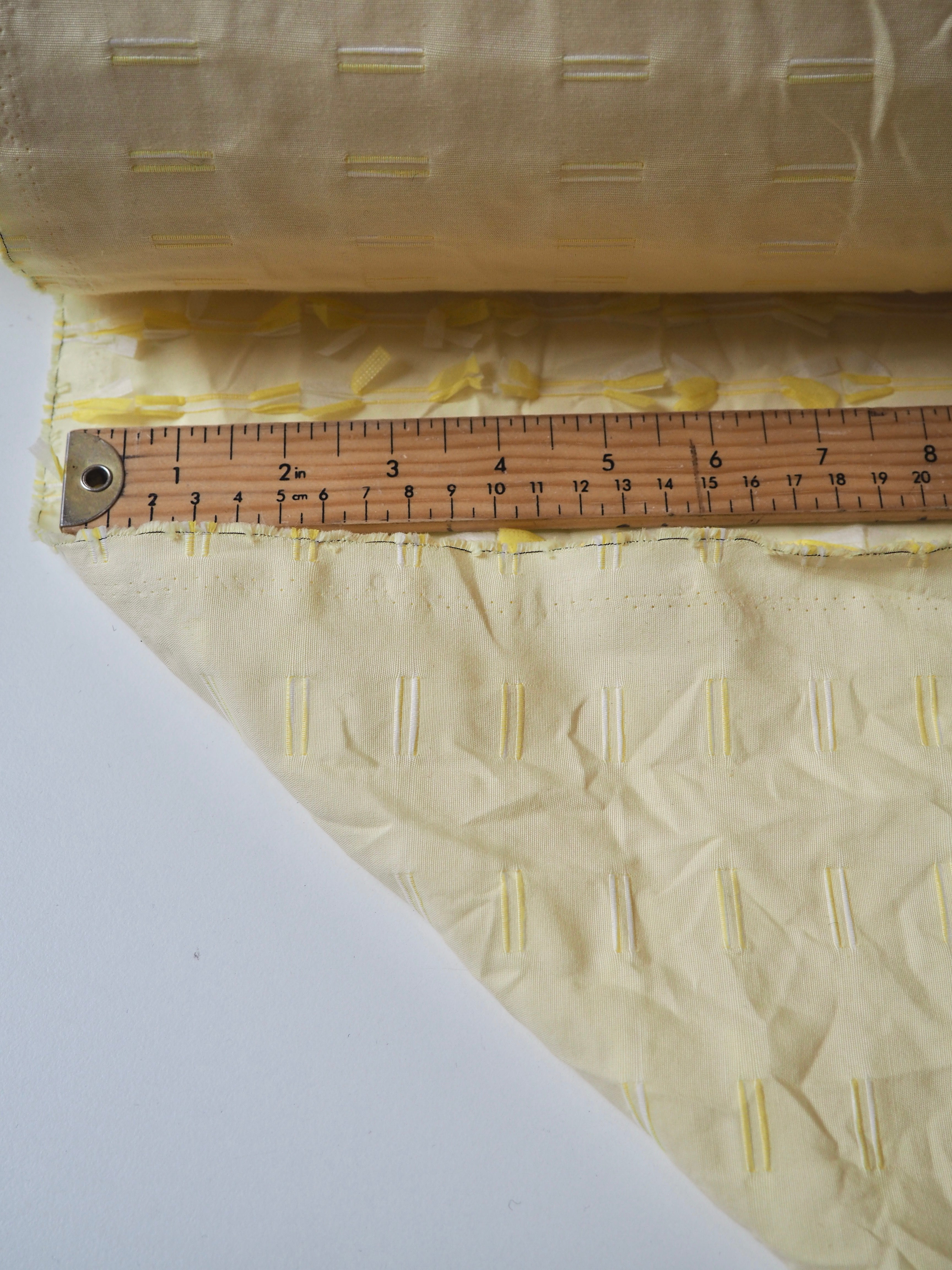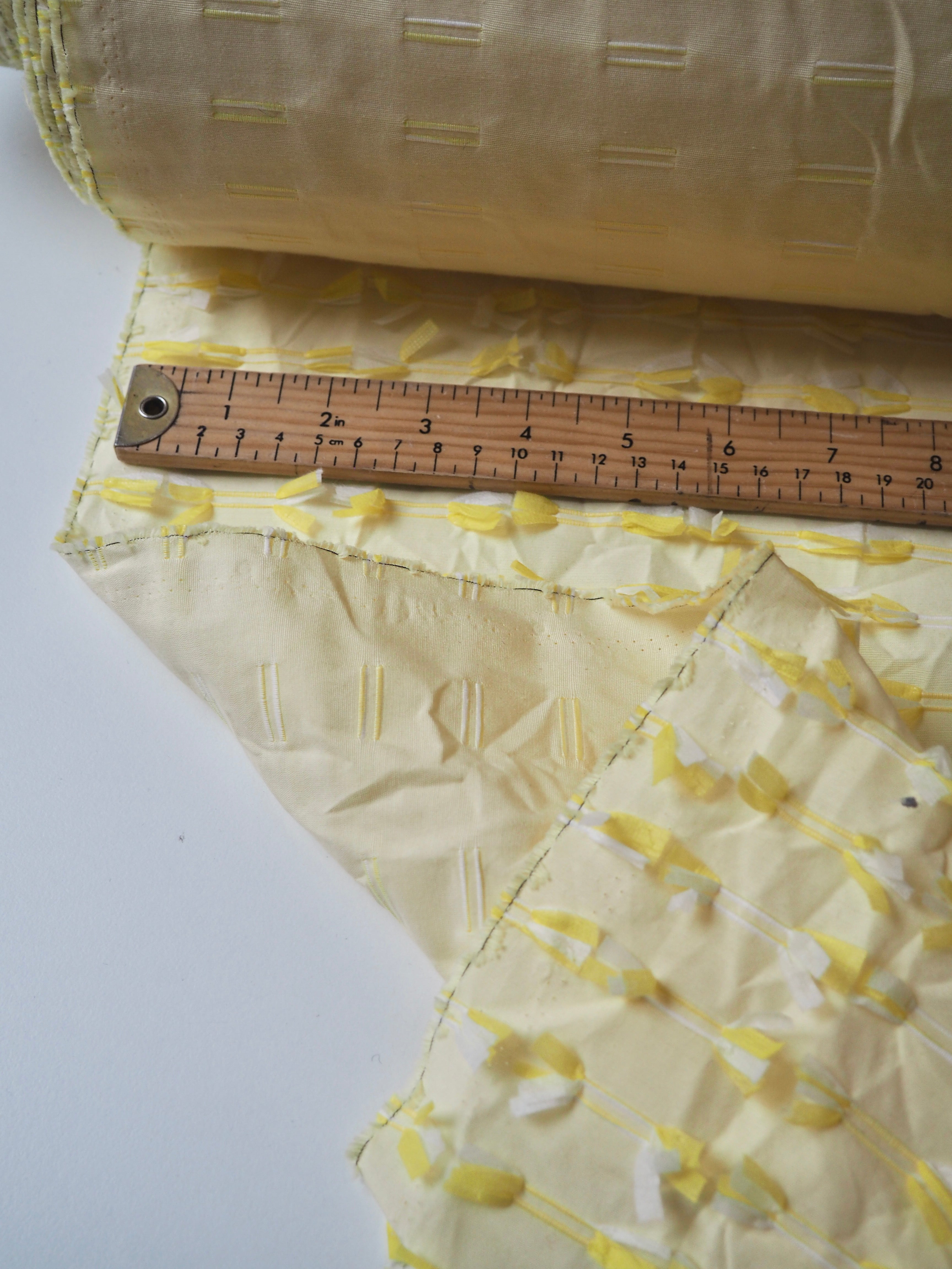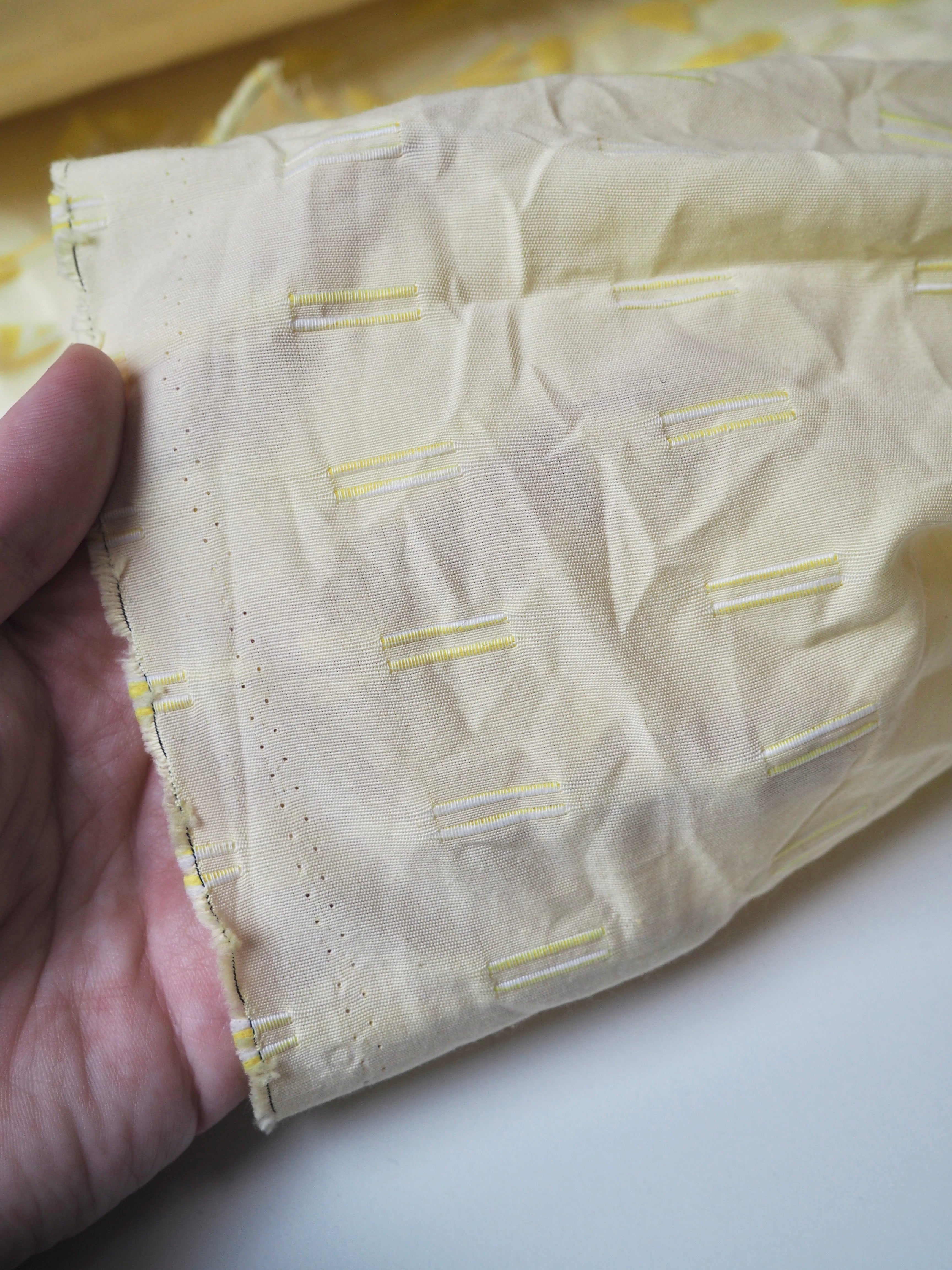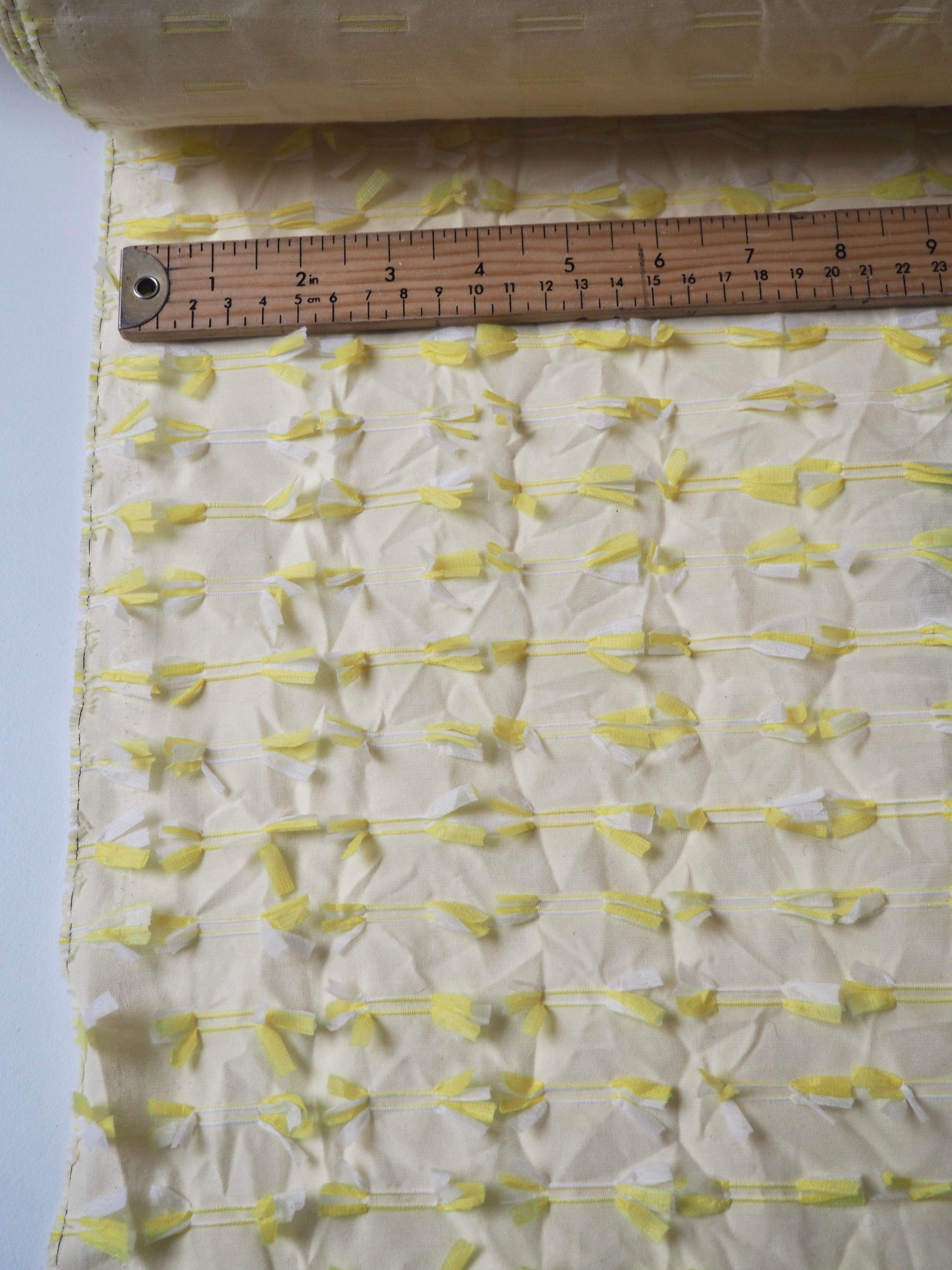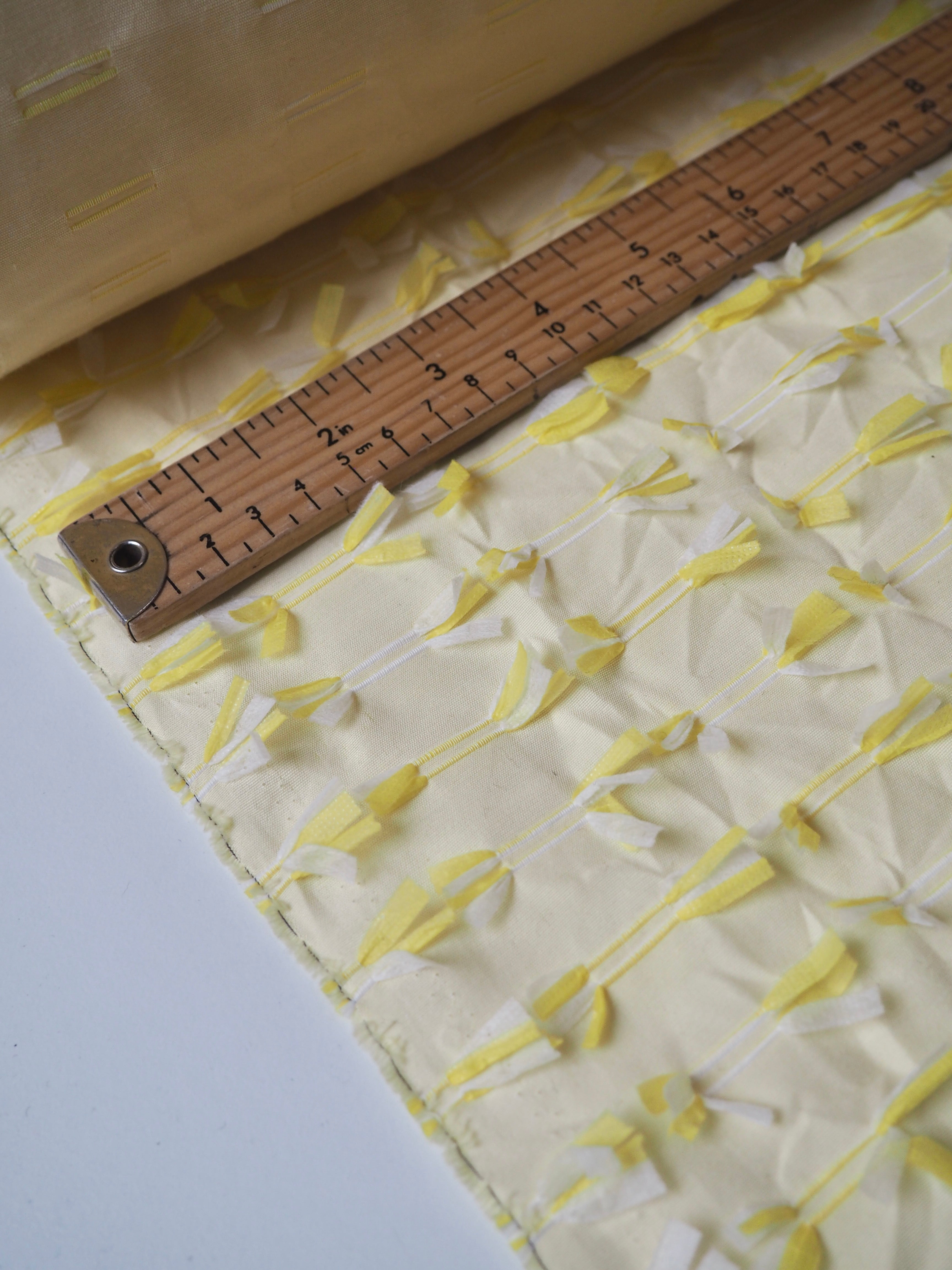 This ex-designer fabric is an embroidered cotton. Yellow and white poly threads are embroidered into buttonhole-like lines on one side of this yellow plain weave cotton, with a fringed finish on the other side. Either side can be used! A versatile cloth that's very unique. Soft and with a slight structure and textured handle. Light to medium weight and almost fully opaque. Would look incredible on a top or shift dress!
