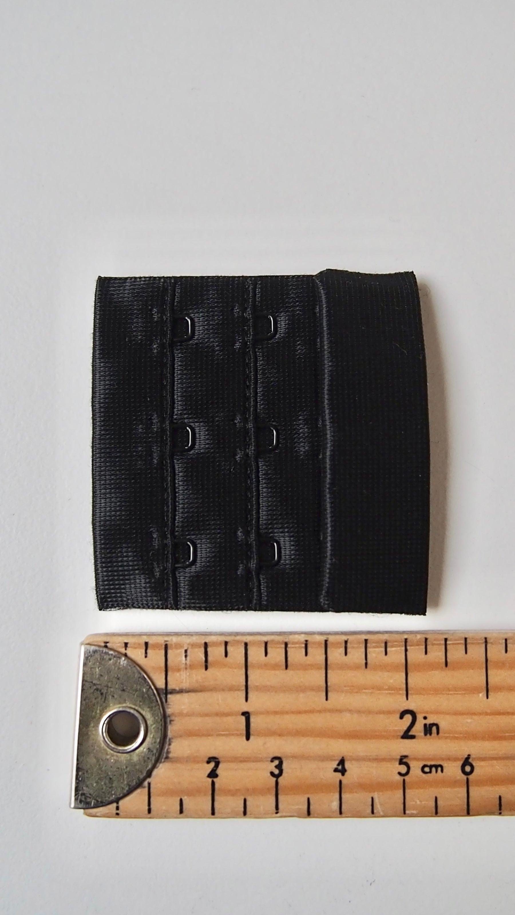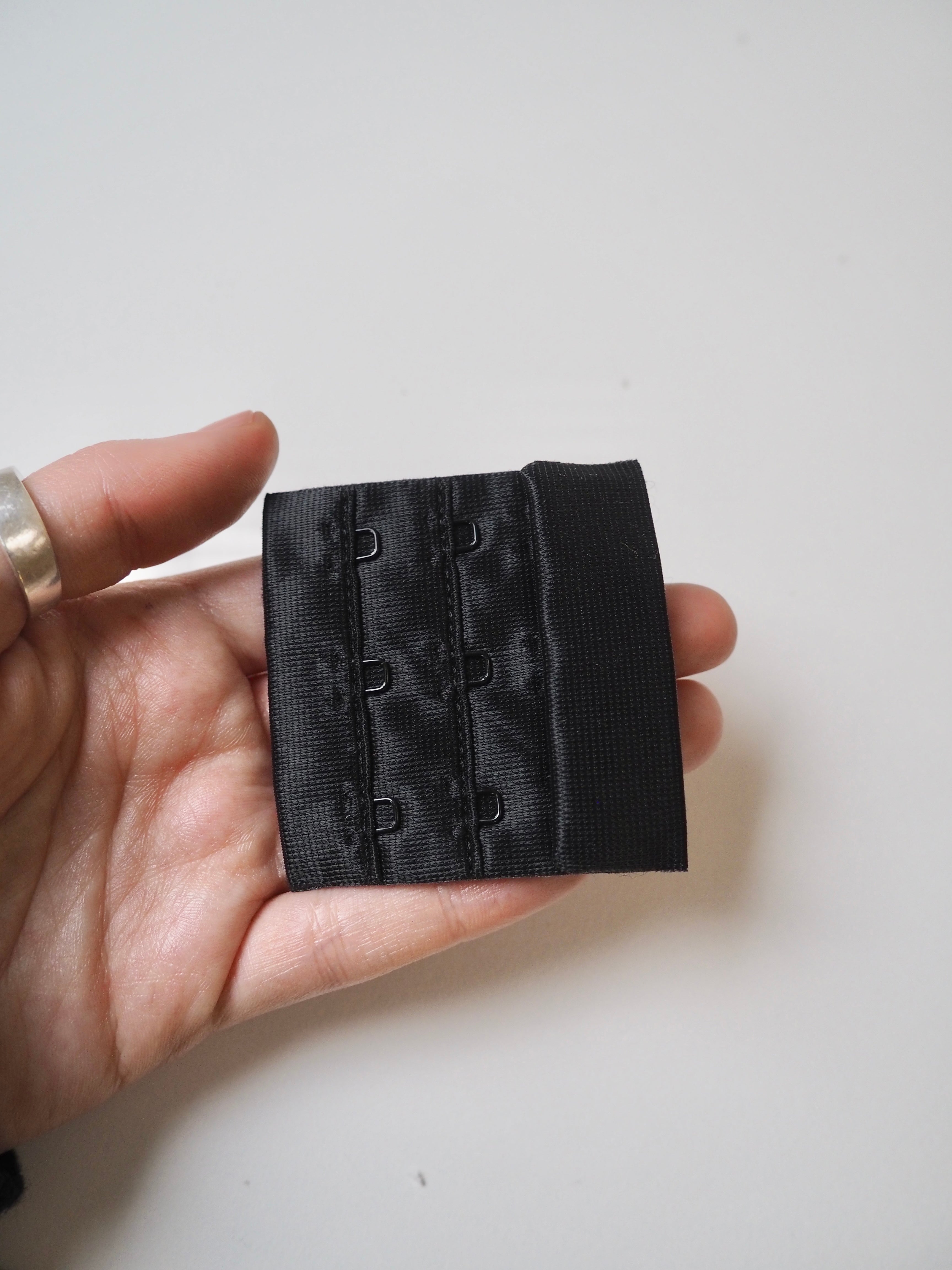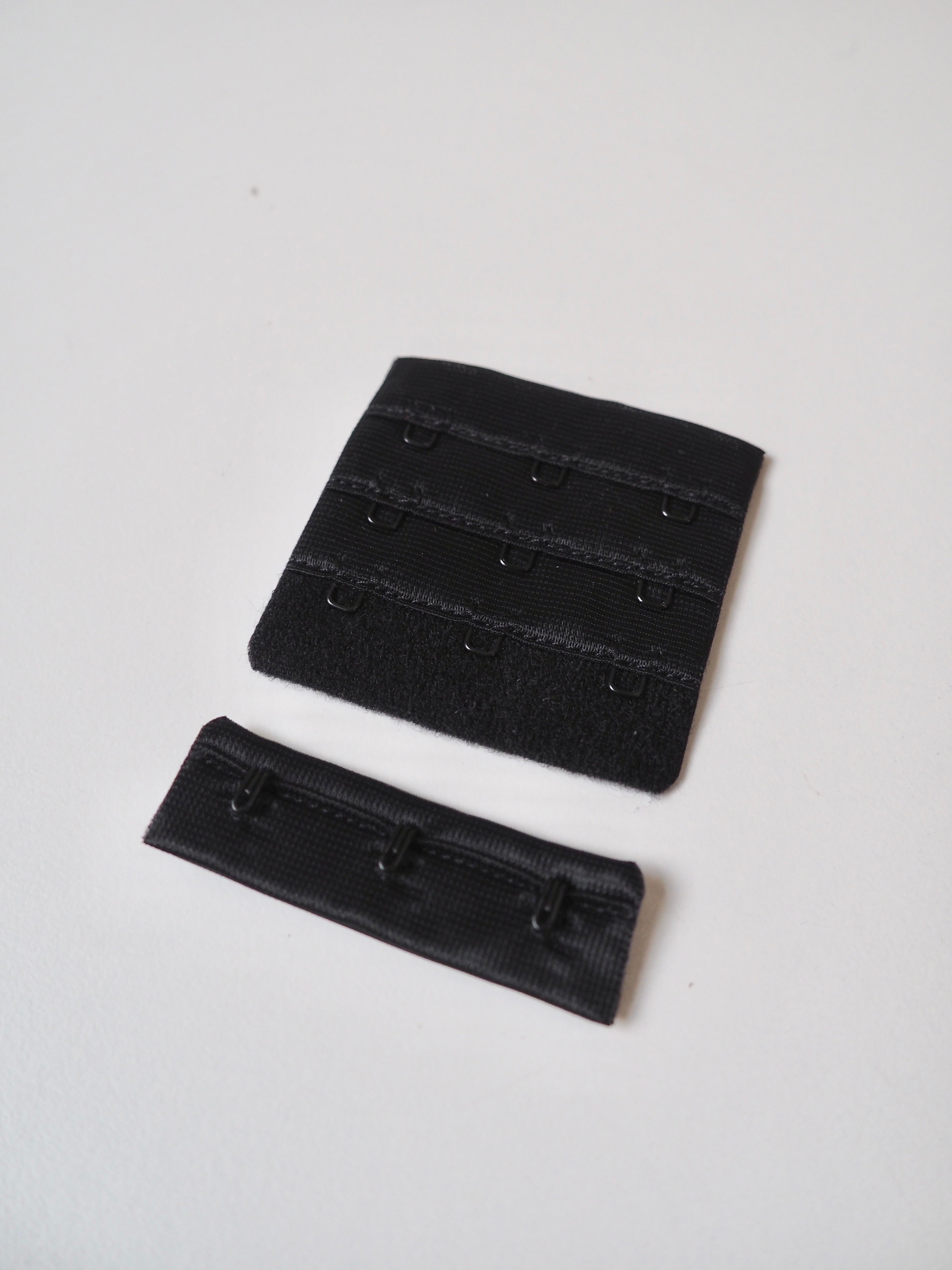 Bra hook and eye fastener. Plush material, soft to the touch. Three sets of eyes to one set of hooks. Three sets of eyes give 4cm of adjustable length. Perfect for bra making!