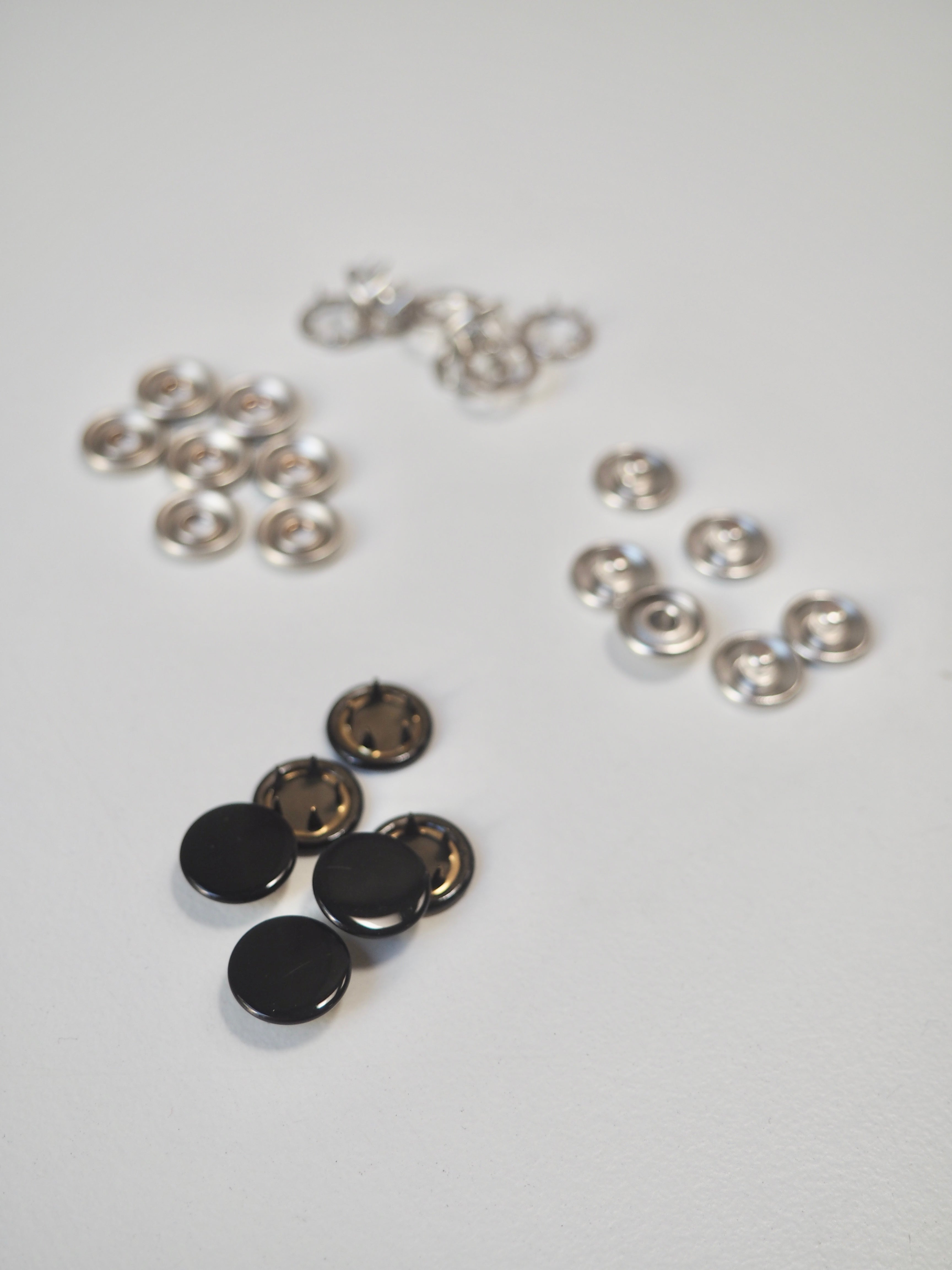 This ex-designer hardware is a press stud set. These press studs, also known as poppers or snaps, are all silver components, with a shiny black top piece. They usually require a die set/machine for the right size, but these kind with prongs can usually be attached with a hammer. Ideal for jackets and shirts, but could also be used in bag making!