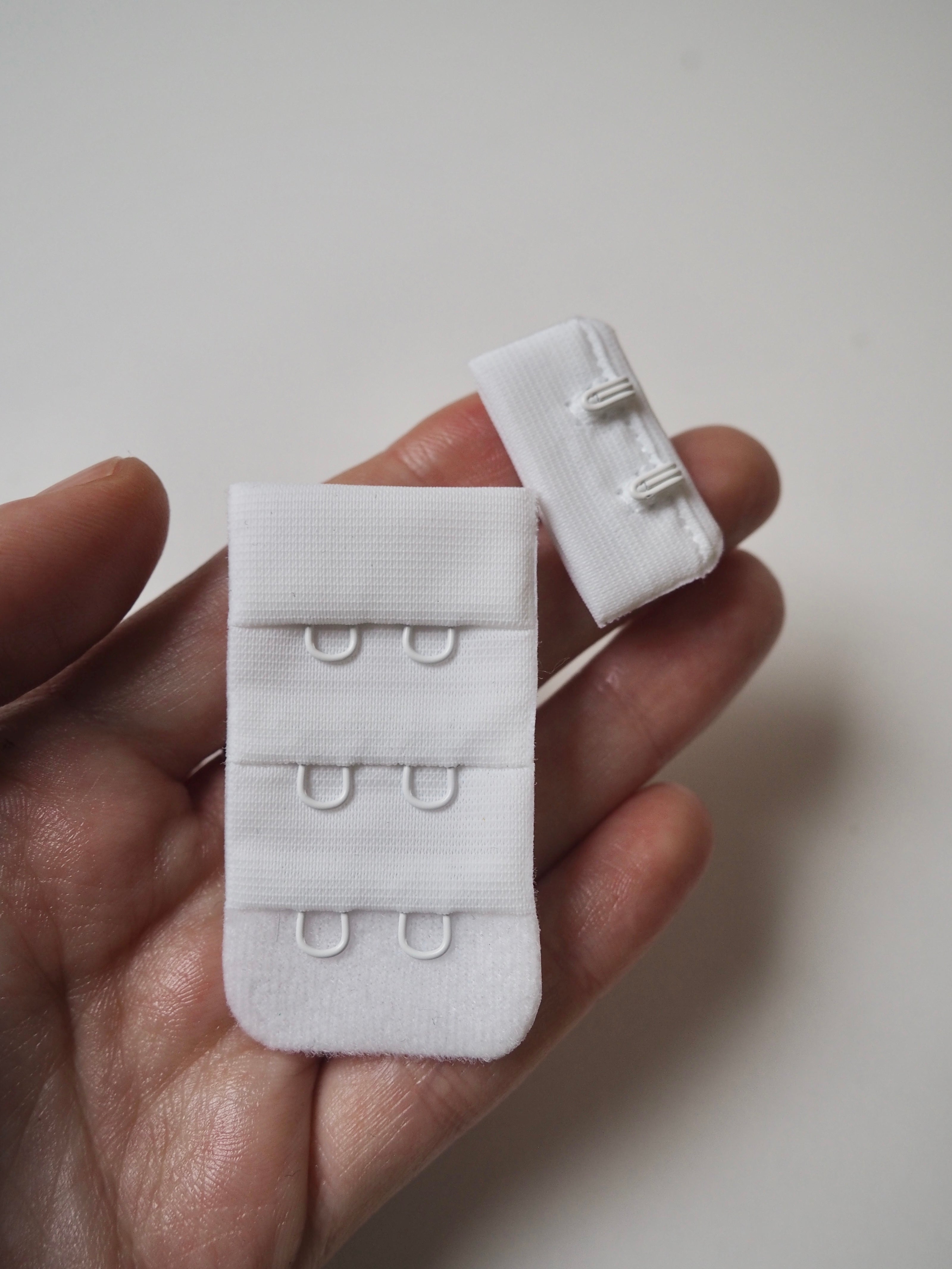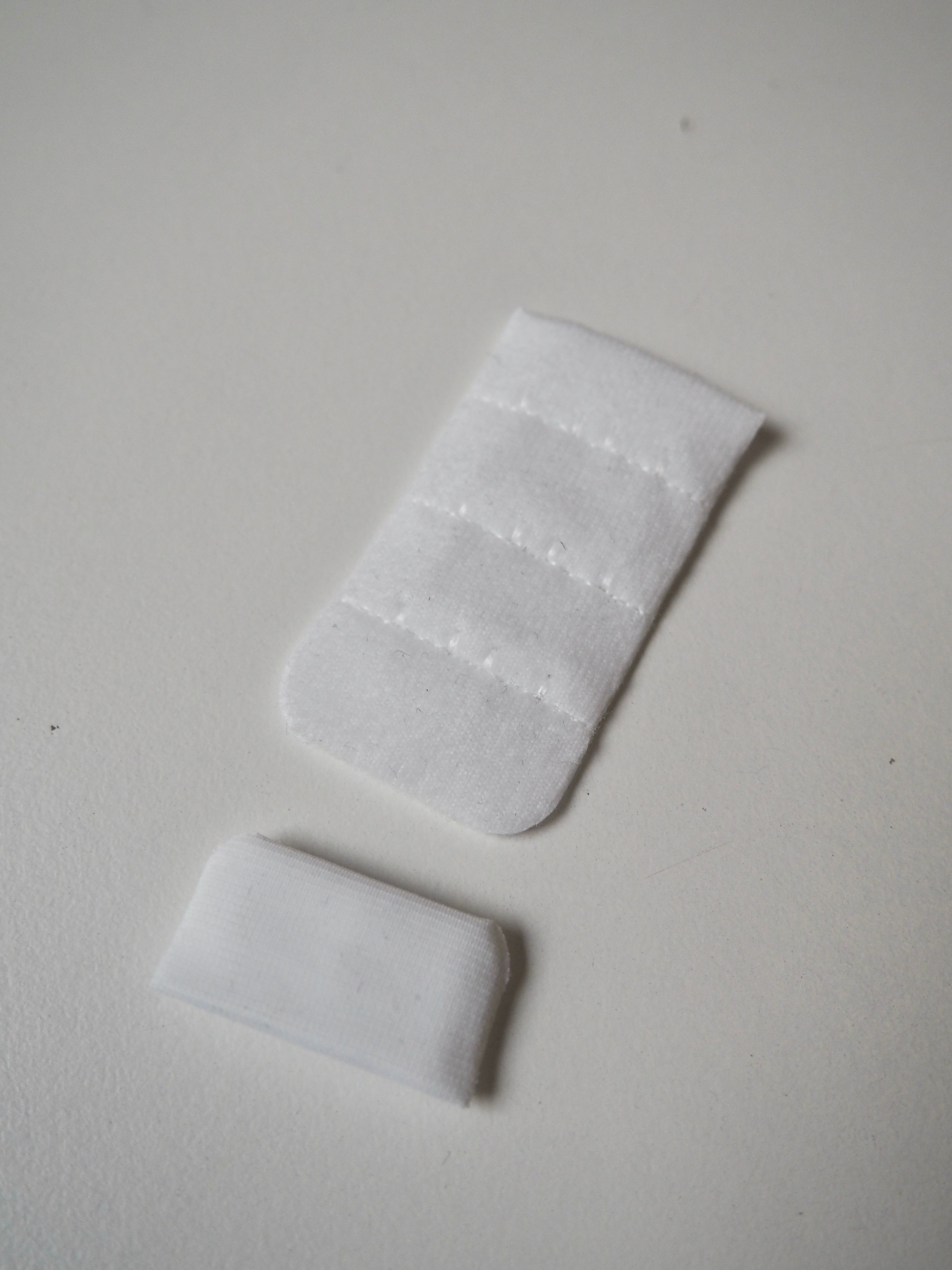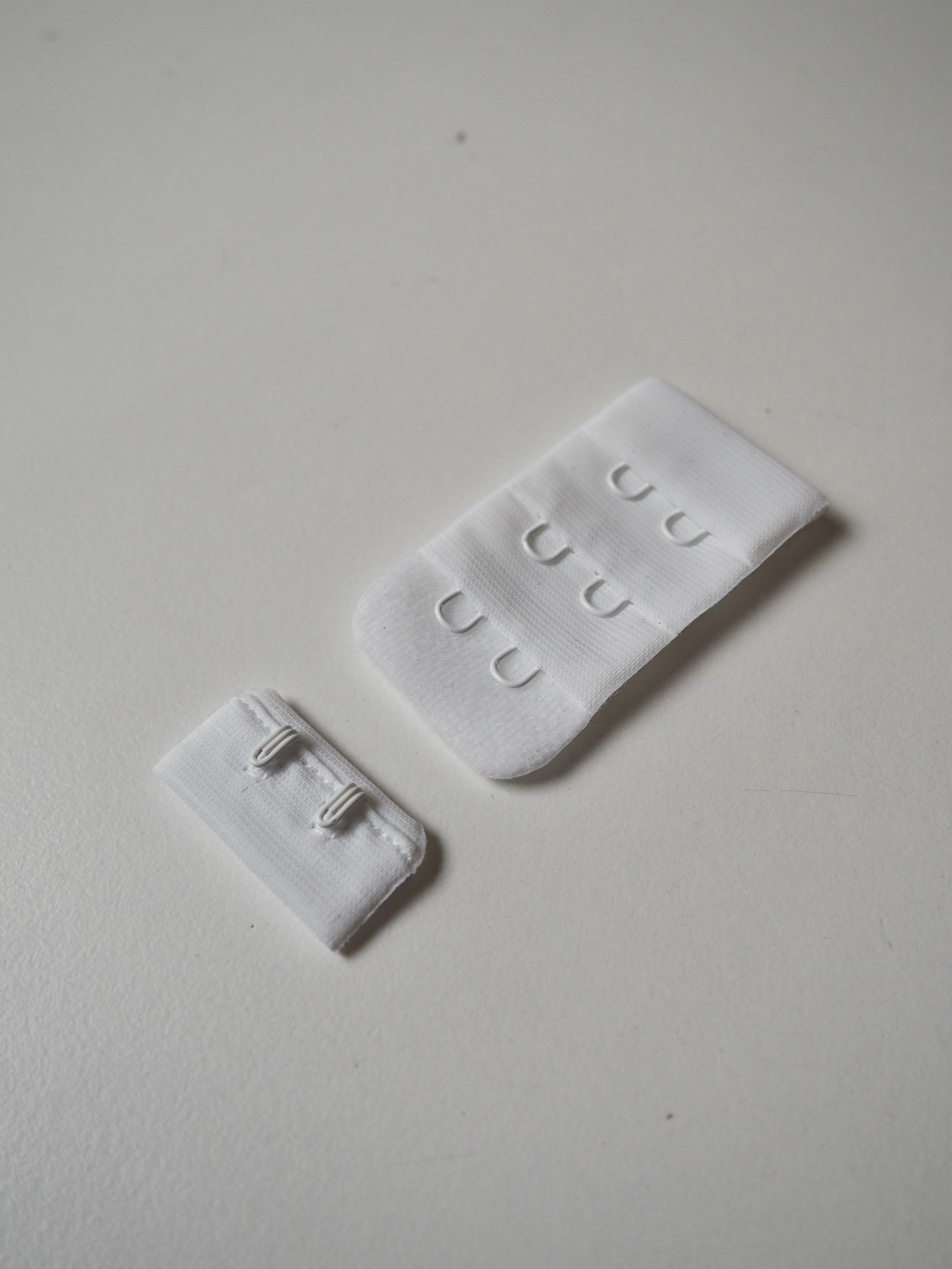 Bra hook and eye fastener. Plush material, soft to the touch. Three double hook and eyes give 4cm of adjustable length. One hook to three sets of eyes. Perfect for bra making!