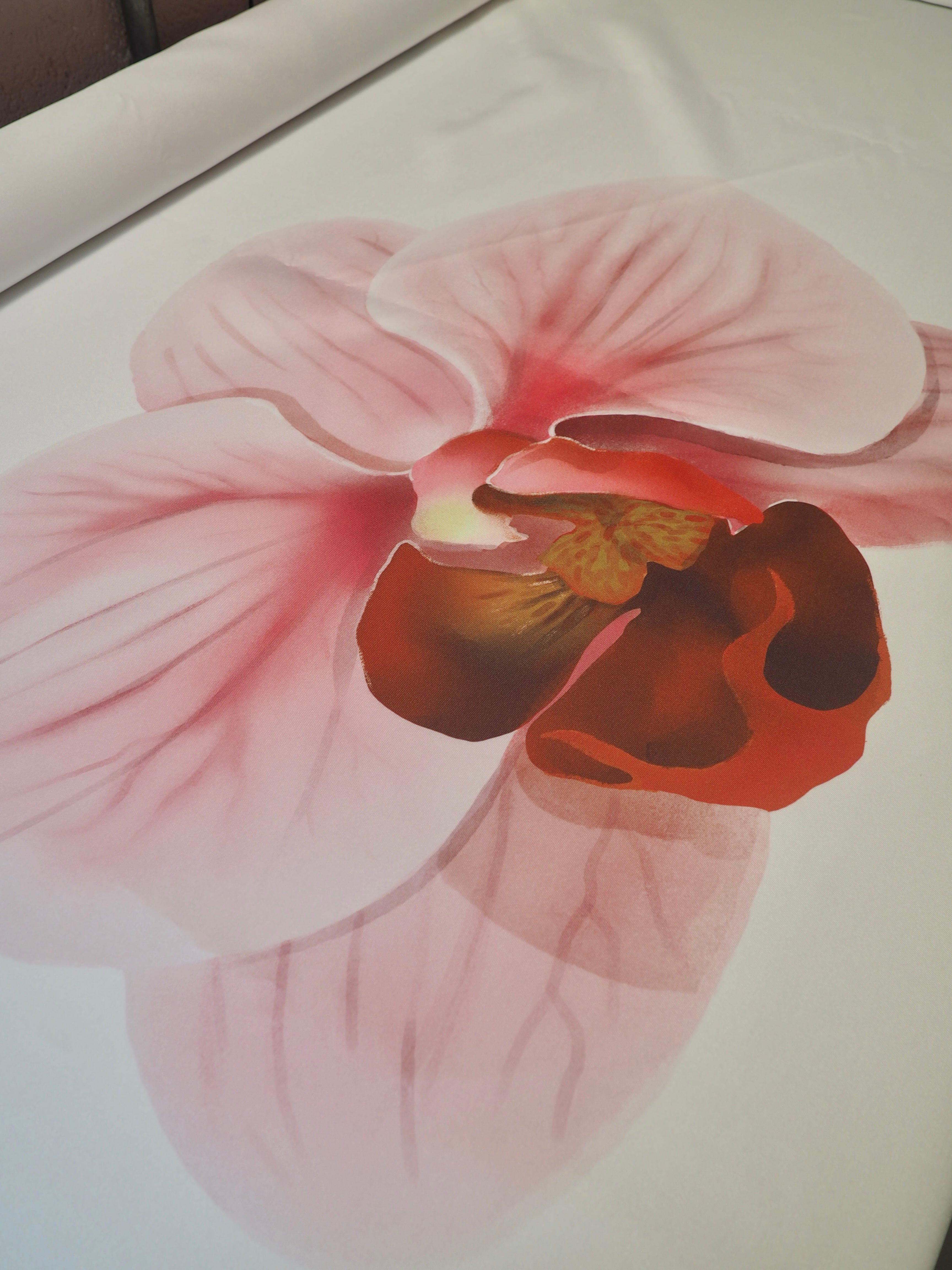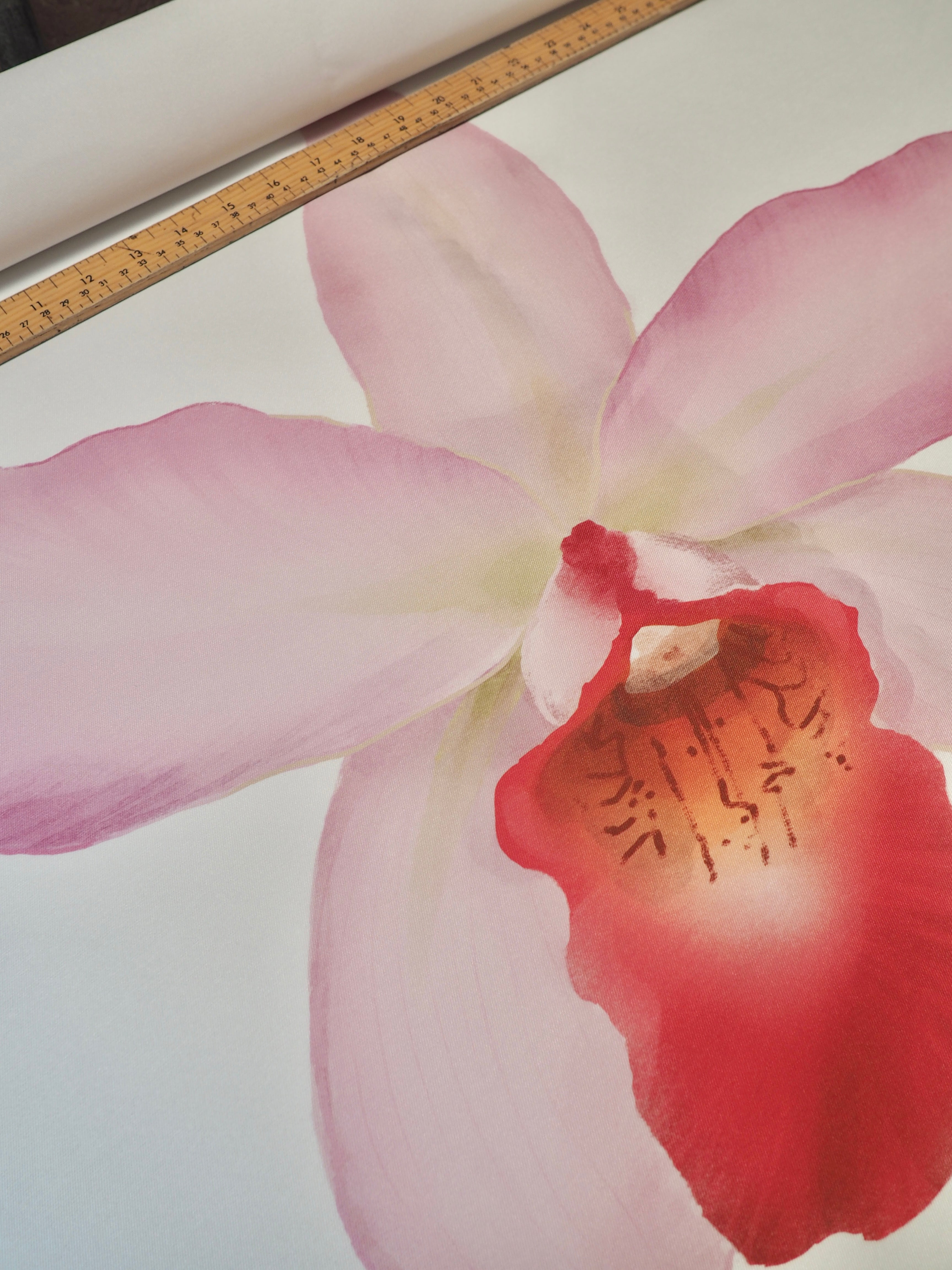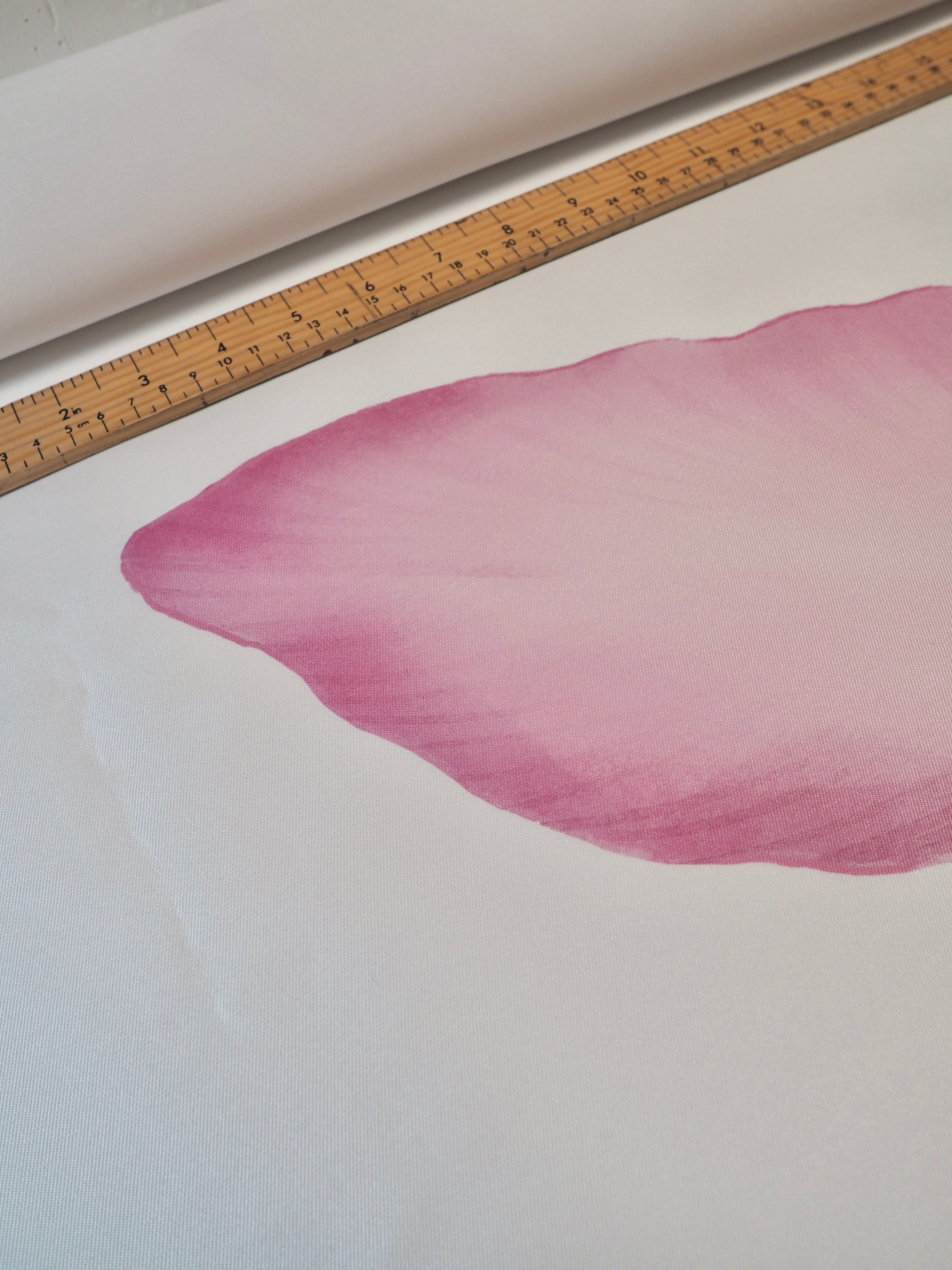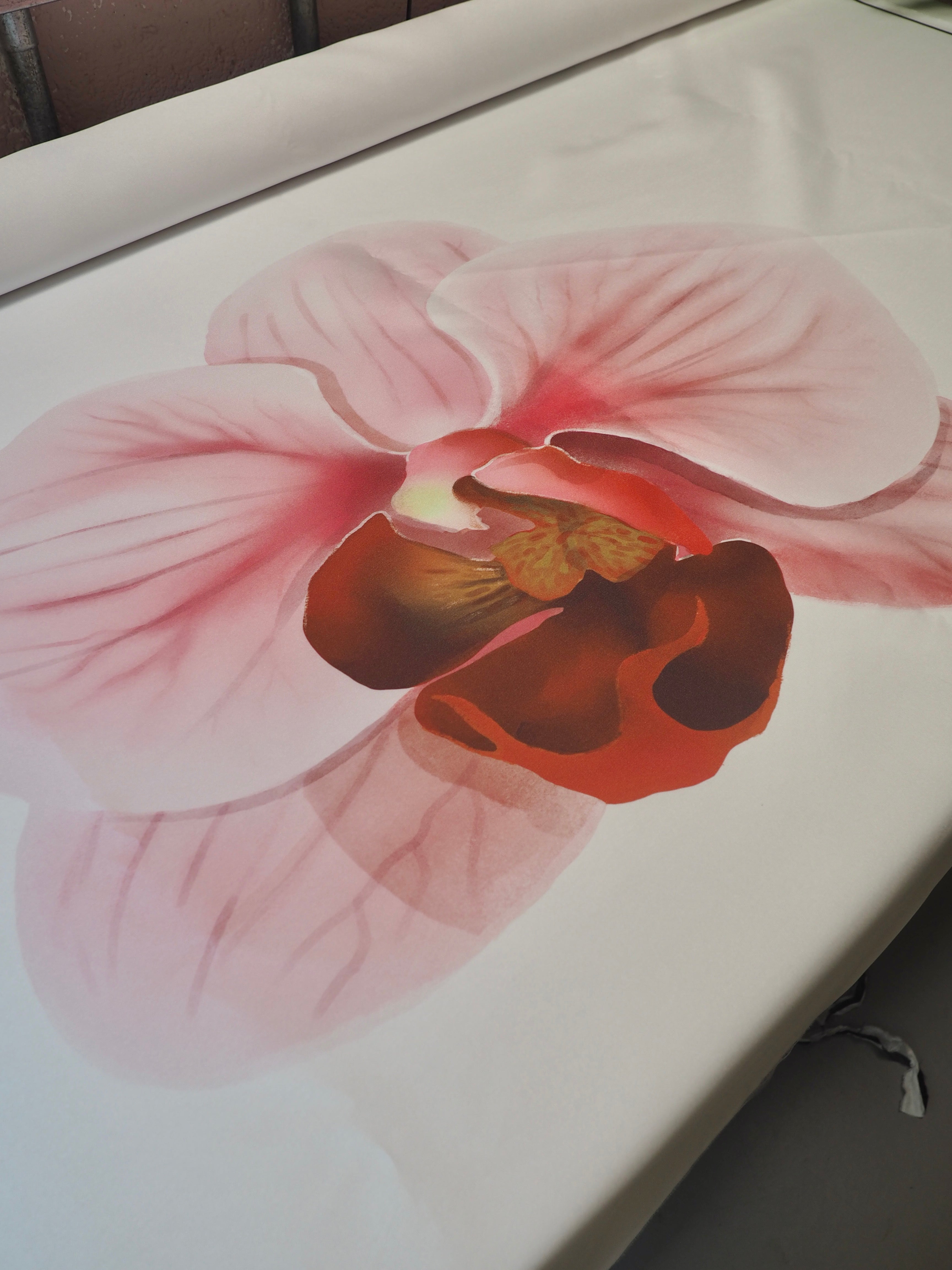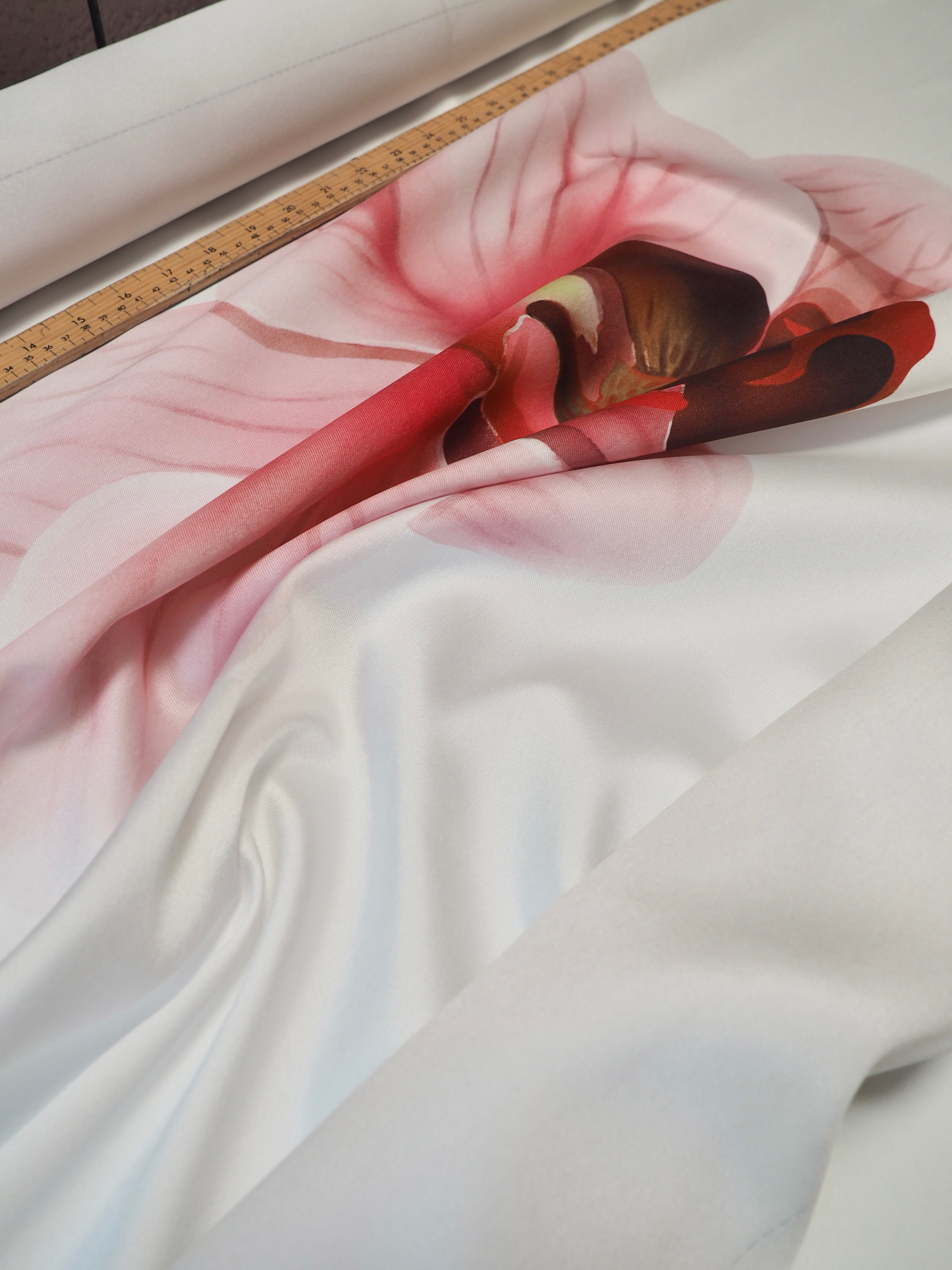 This ex-designer fabric is a satin twill. It's a bespoke print from a designer, printed into separate panels. Two different flowers, and varying in scale. It's a structured weave, with lovely colouring. It's fully opaque, with a smooth satin finish. Light to medium weight. Versatile for so many projects!