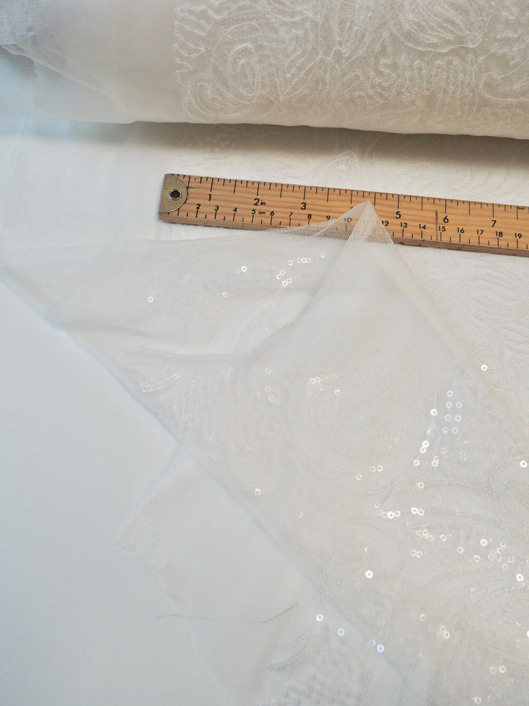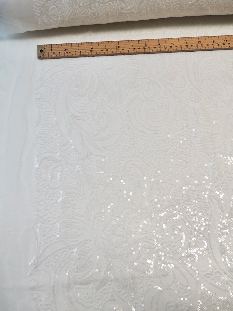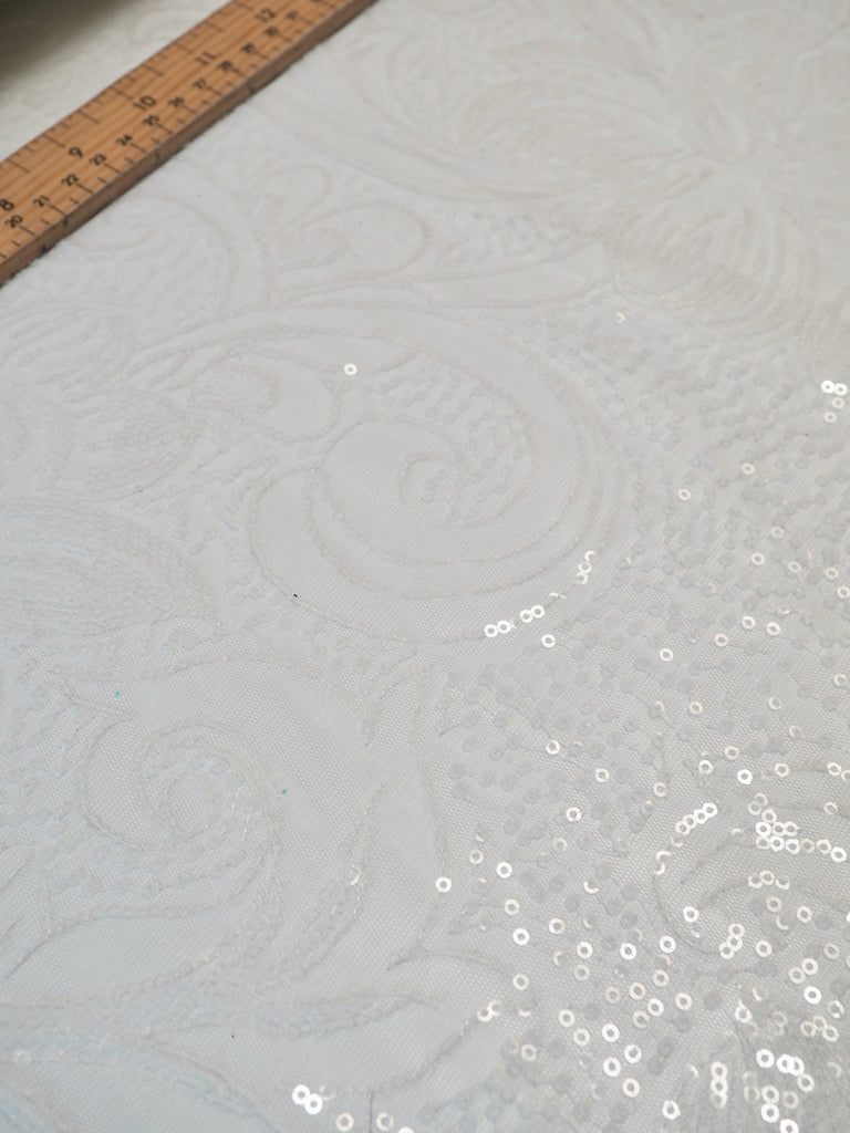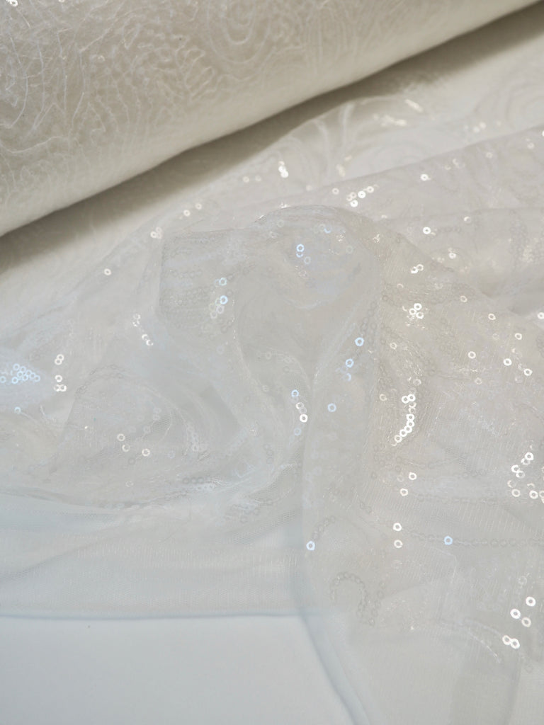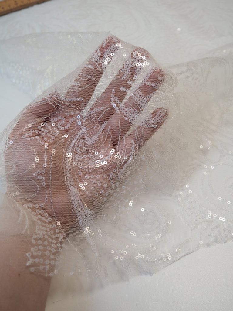 This ex-designer fabric is a glittering sequin tulle. White and translucent sequins are woven onto a white tulle. Has about 15% stretch, width ways. The sequins are amazing quality, and secured on very well for long wear. They are woven into a really beautiful floral and swirl design with light to medium coverage. Lightweight with a lovely drape. So beautiful in the light, and has such lovely movement! This fabric would be perfect for a fancy dress, or even a bridal look!