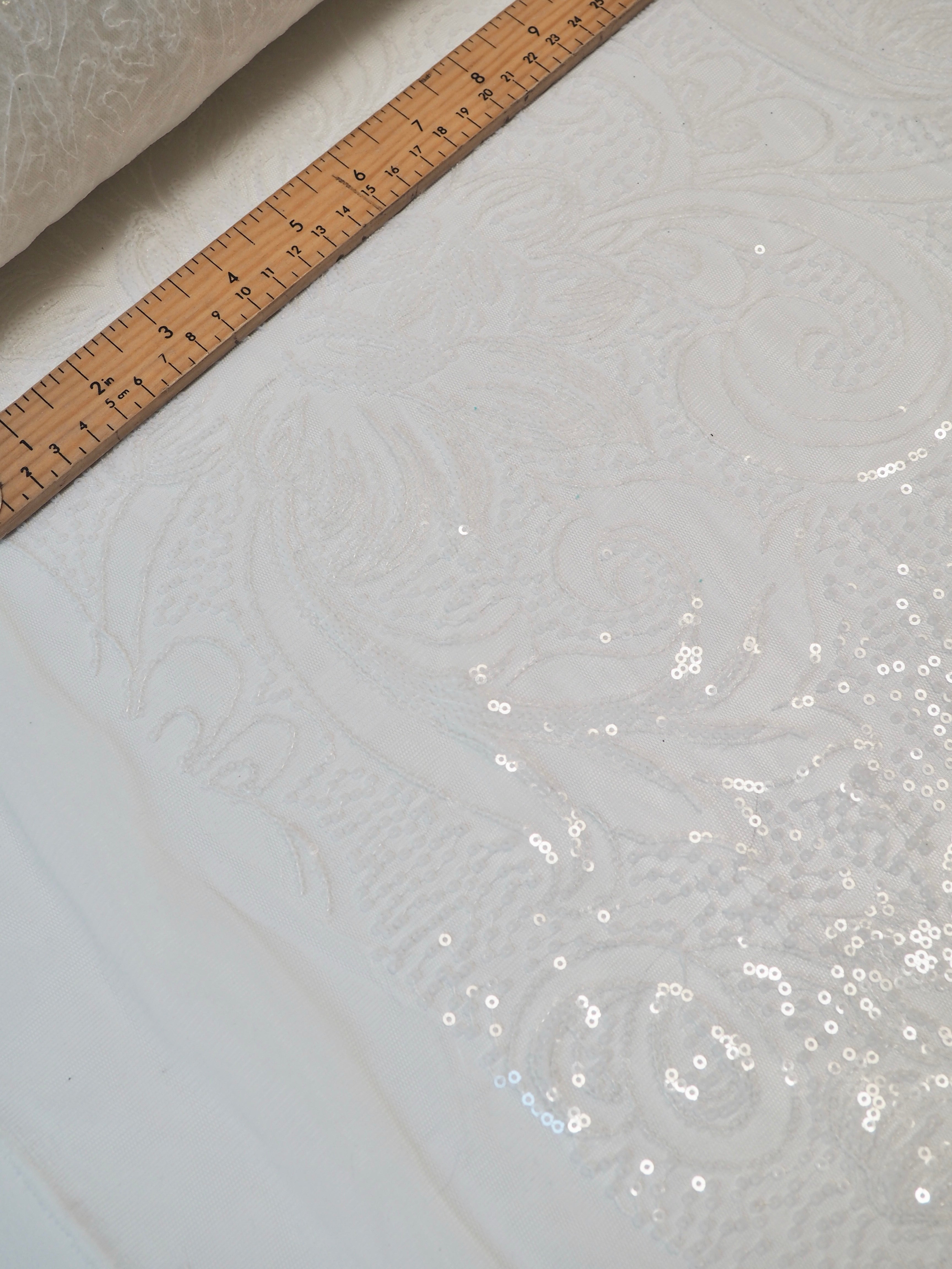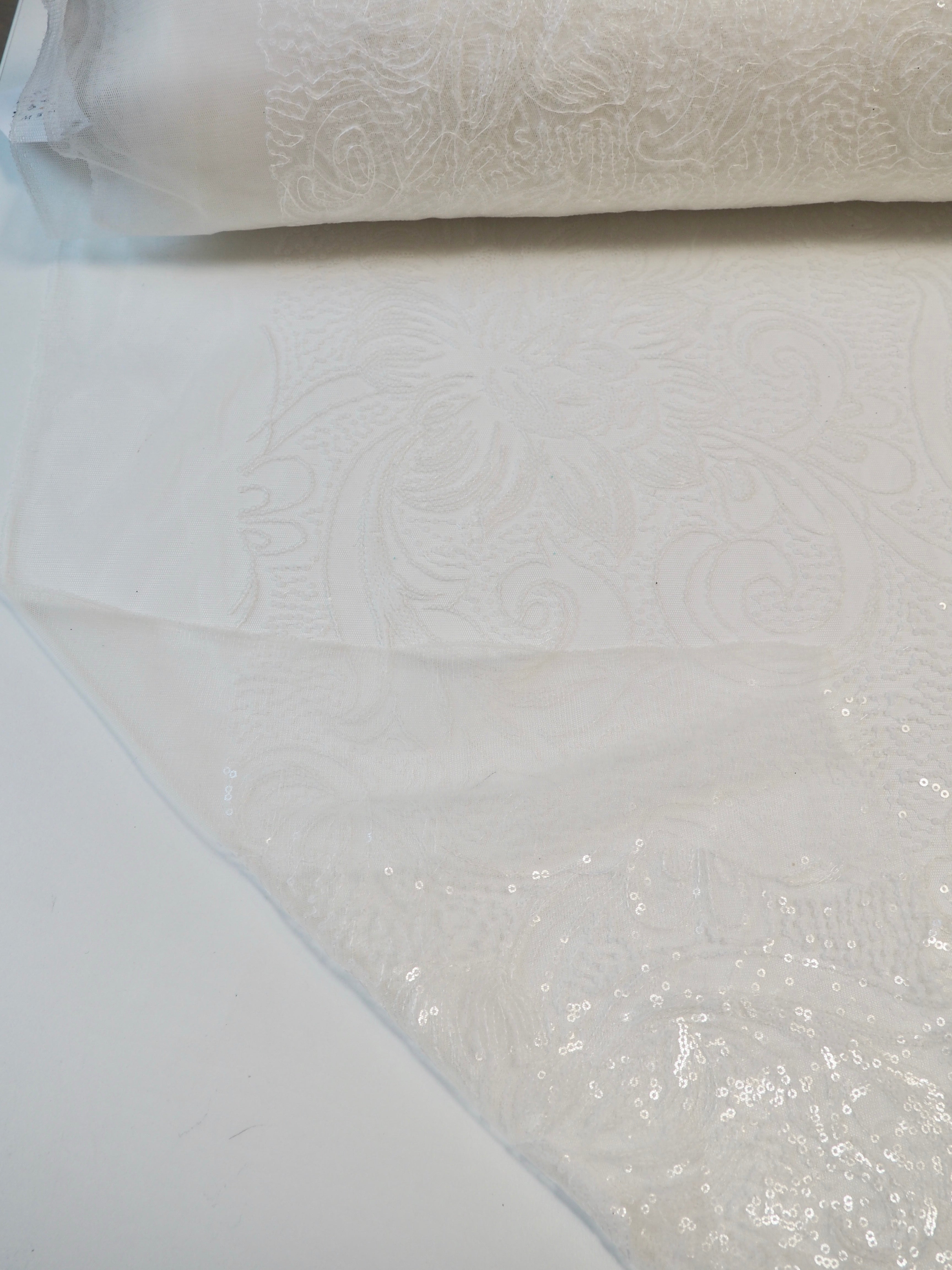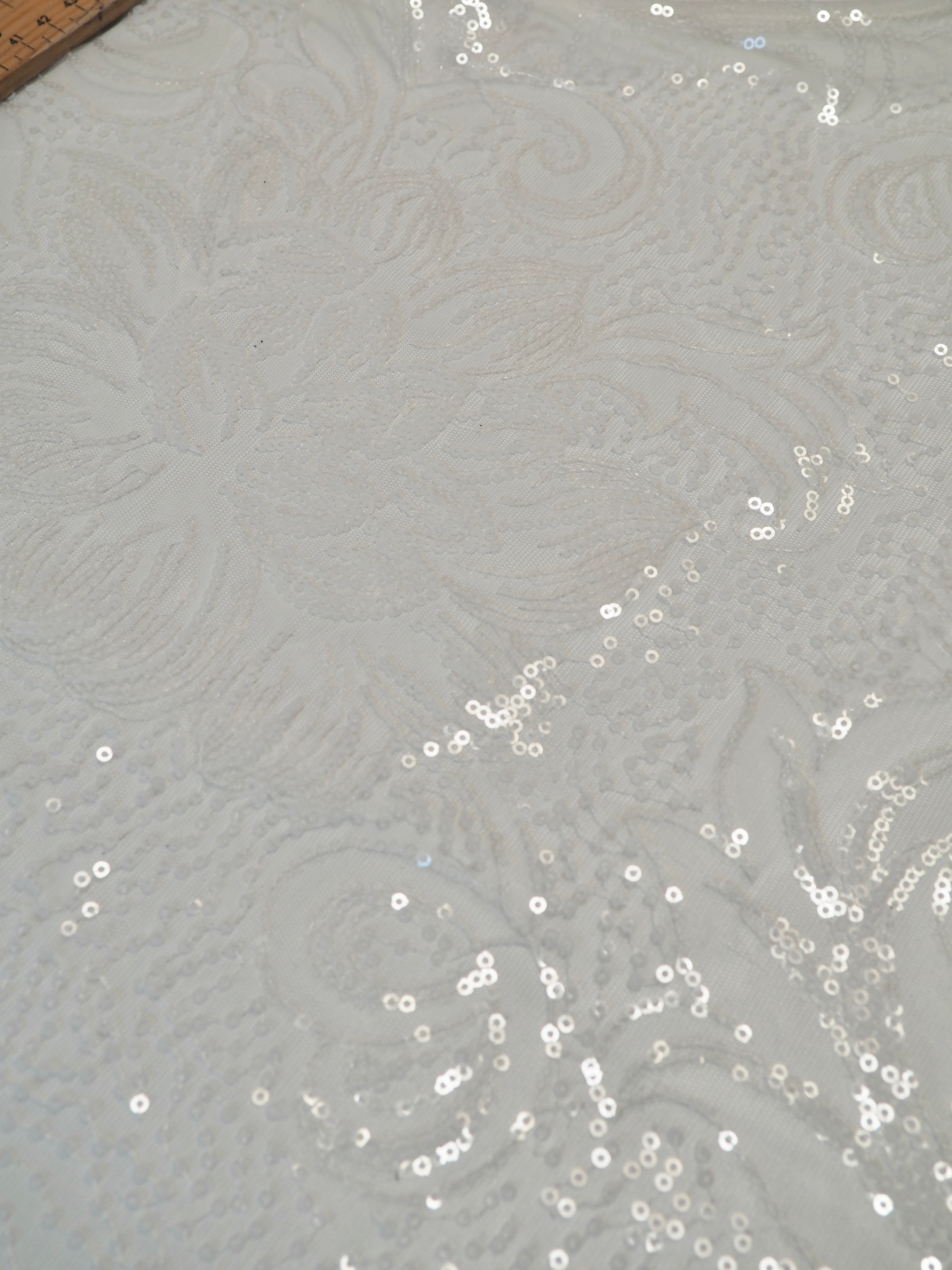 This ex-designer fabric is a glittering sequin tulle. White and translucent sequins are woven onto a white tulle. Has about 15% stretch, width ways. The sequins are amazing quality, and secured on very well for long wear. They are woven into a really beautiful floral and swirl design with light to medium coverage. Lightweight with a lovely drape. So beautiful in the light, and has such lovely movement! This fabric would be perfect for a fancy dress, or even a bridal look!