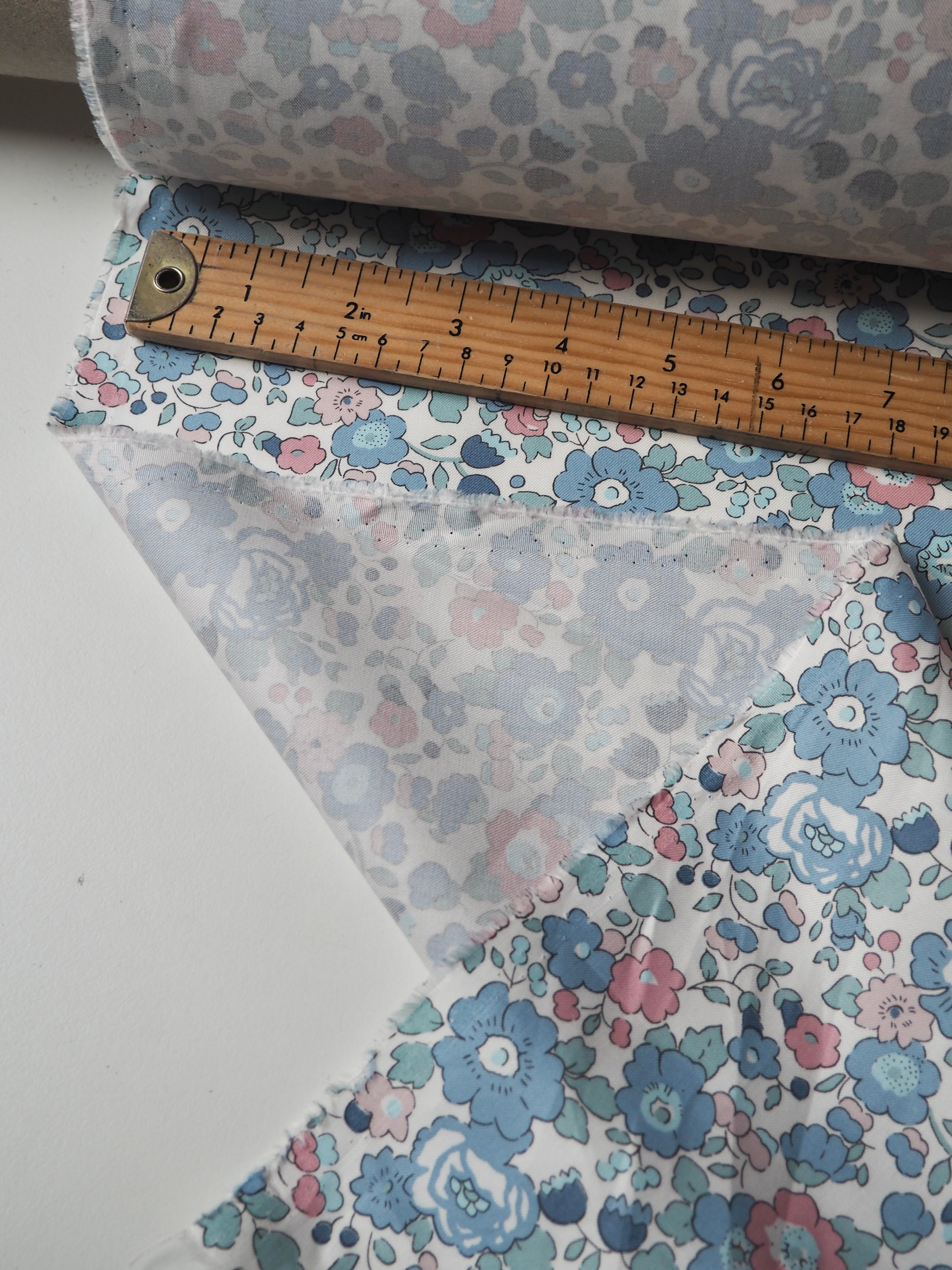 This ex-designer fabric is a classic Liberty cotton twill. It's a classic Betsy medium scale floral print. A top-quality Liberty cotton in a light to medium weight. Soft with a lovely drape and slight crispness. Has a wonderful cotton handle and a slight sheen. Fully opaque! We would love to see a light jacket or bag!