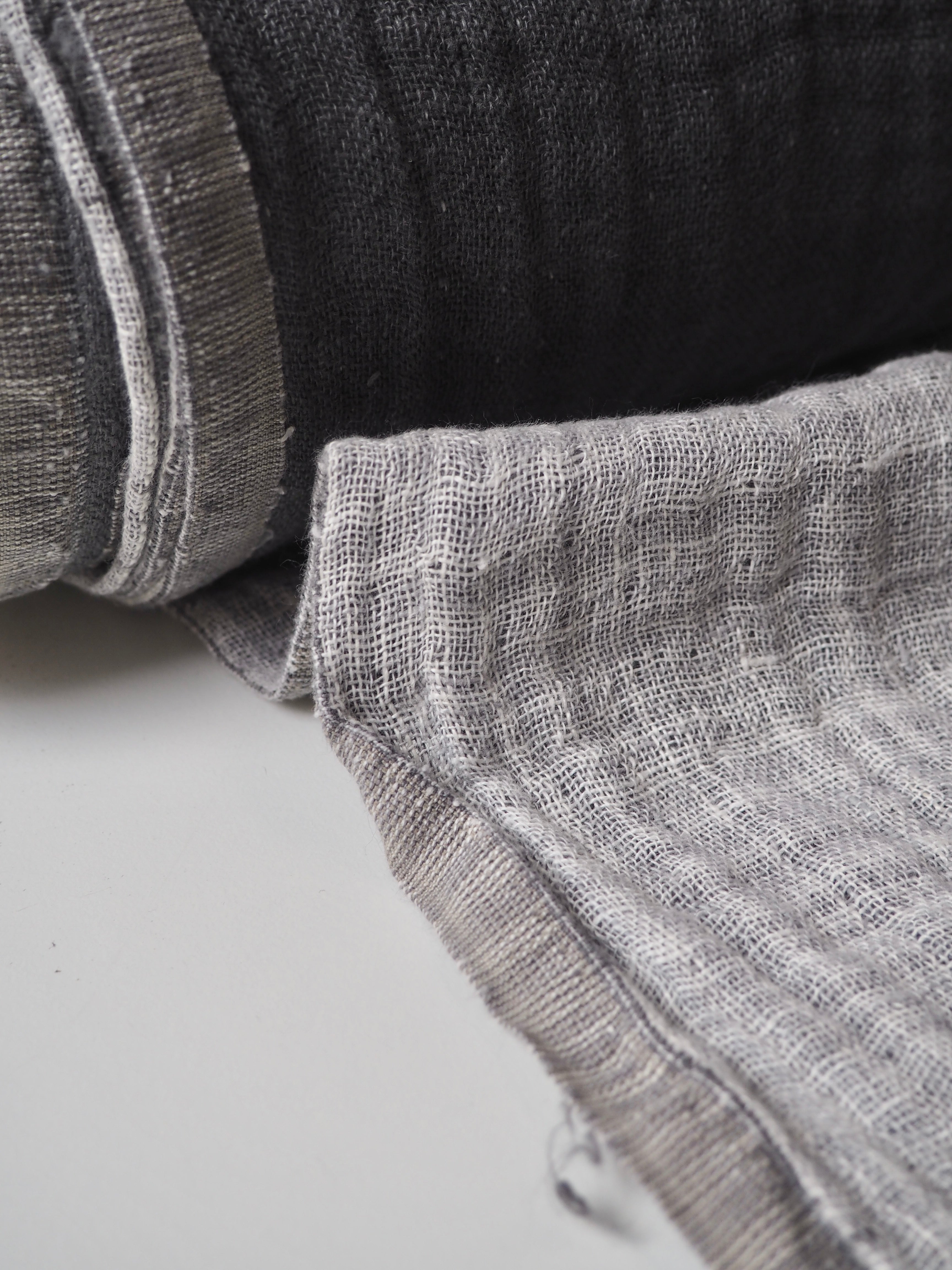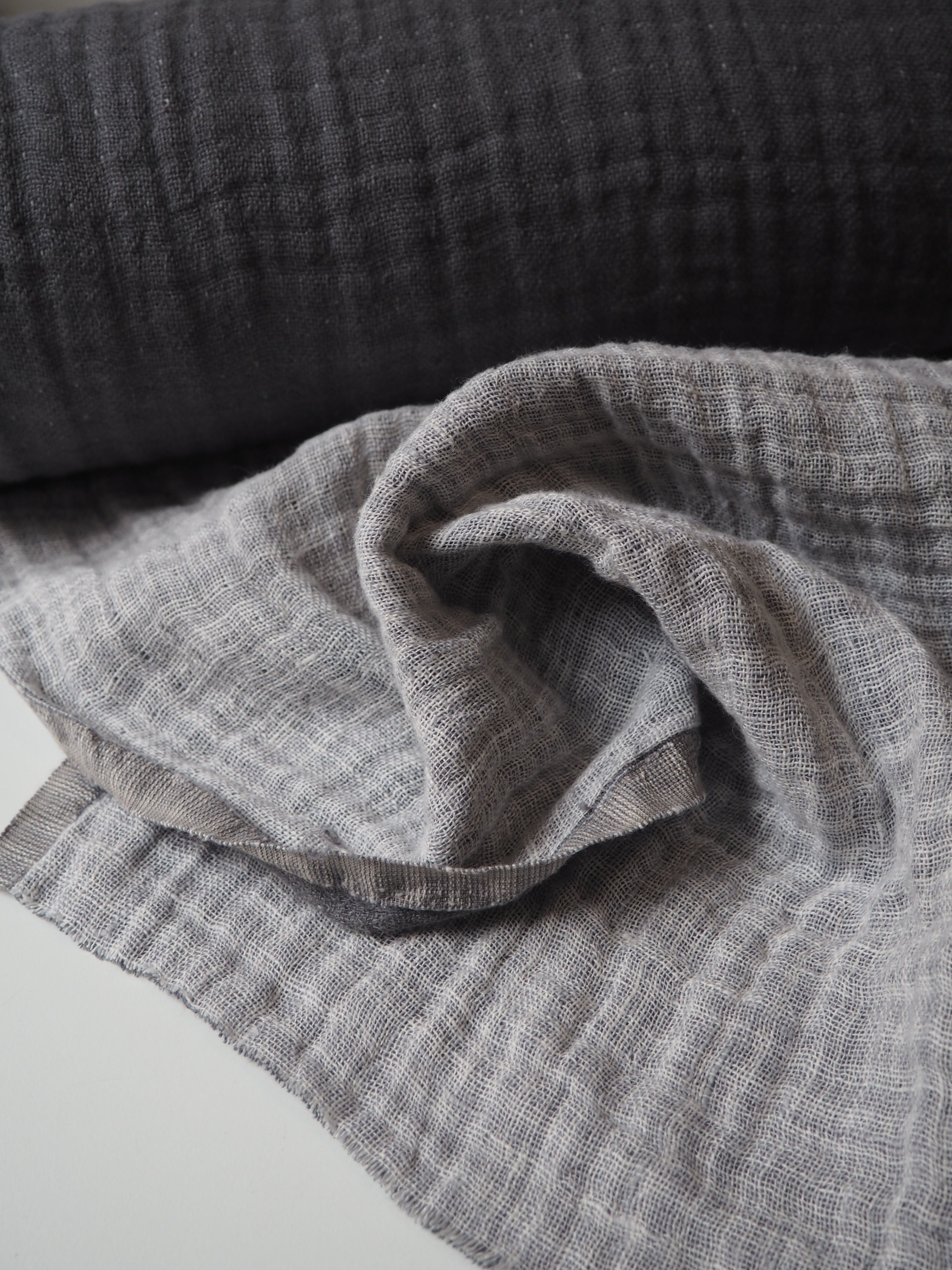This ex-designer fabric is a double linen. It has a looser weave, with a lovely gauze-like texture in a medium weight. It's two layers, grey and white, woven together gently. Very soft and fully opaque, and beautiful quality. Has a soft structure, but still drapes nicely. From a home interiors company. Great for cushions, a light jacket, or as a throw!