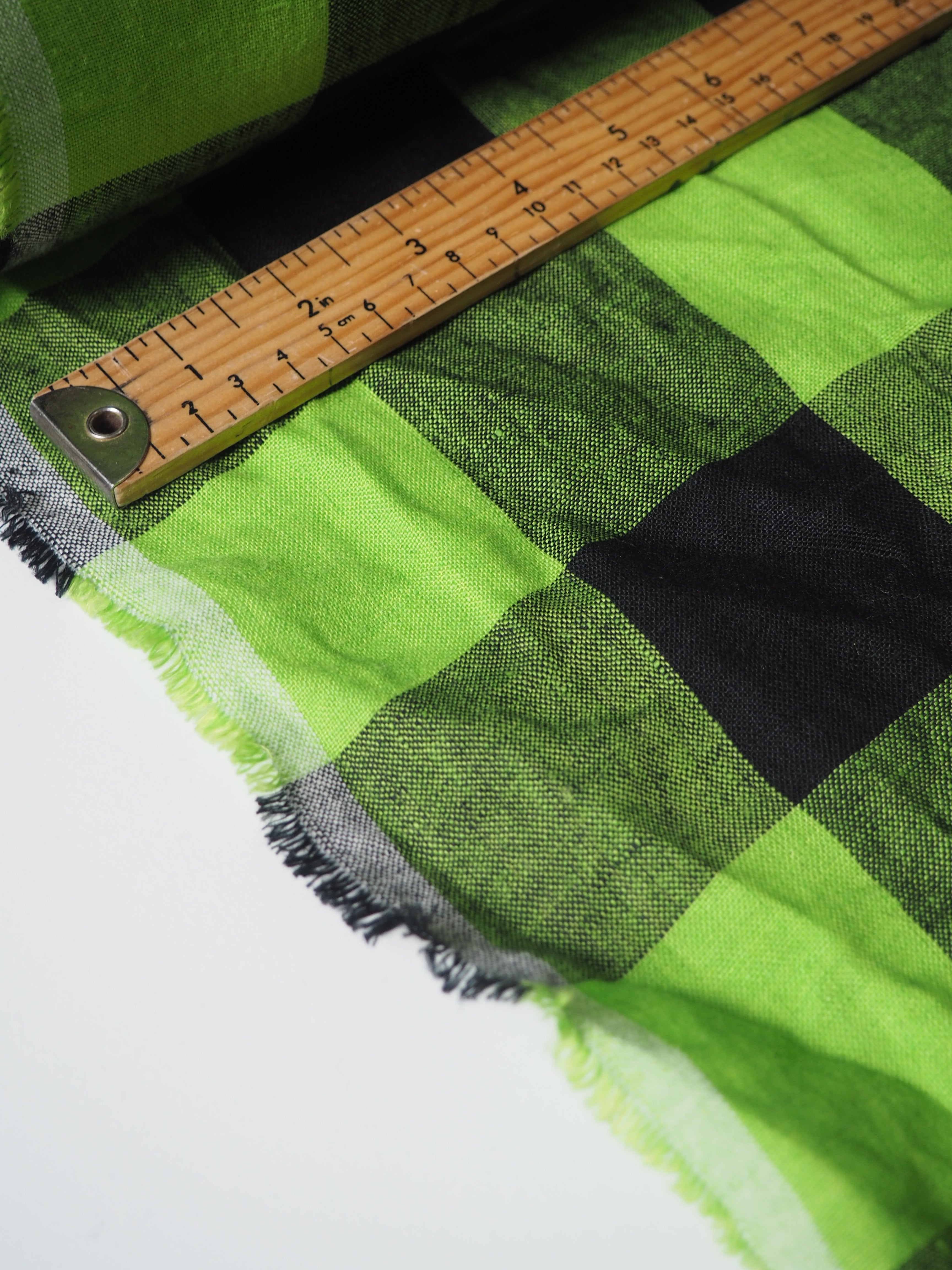 This ex-designer fabric is a lovely linen. It's a green and black colourway, in a jumbo gingham pattern. It has a soft and gentle linen weave with a typical linen texture, and a brilliant handle that's so wearable. Lightweight with a gentle structured drape, and fully opaque. From popular London-based brand Beyond Nine. Lovely for a bias dress of skirt, summer tops or Everyday Trousers, or even a tablecloth and napkin set!