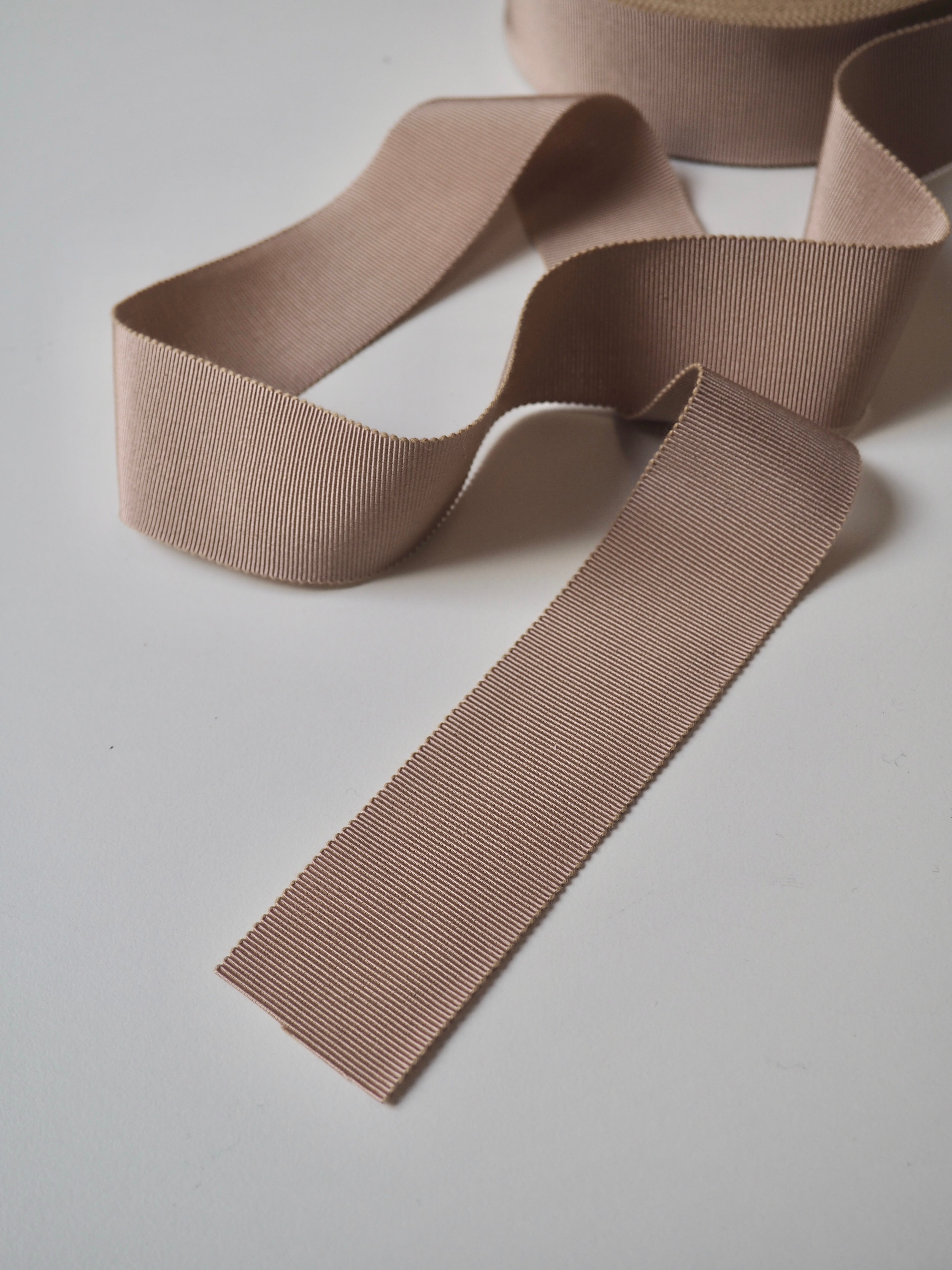 This ex-designer trim is a grosgrain ribbon. It is double-faced, so both sides are ridged. Light weight with a decent sturdy structure with a sateen finish and perfect for a variety of projects. Would look so lovely as a shoulder strap, handles for a tote bag, or even for gift wrapping!