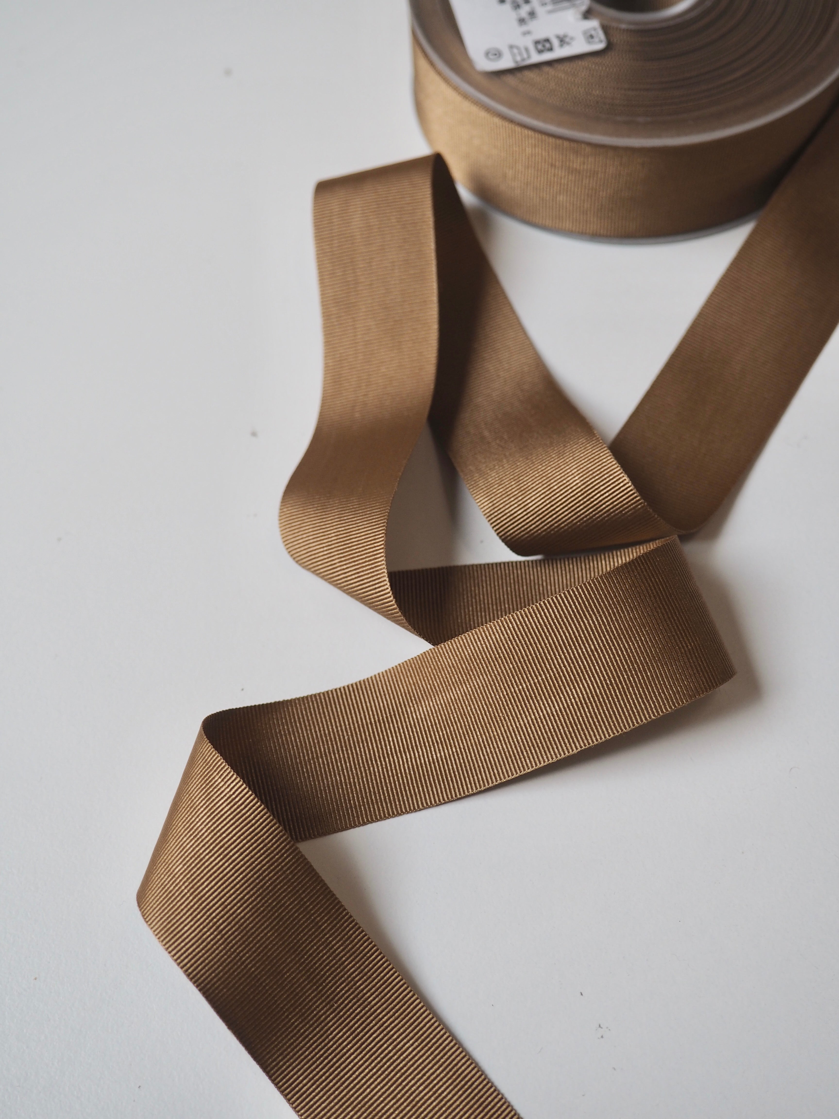 This ex-designer trim is a grosgrain ribbon. Both sides have a ribbed weave that runs width-ways across the ribbon, with a slight sheen finish. It has a soft drape so would be perfect as straps for a dress or even to wrap presents!
