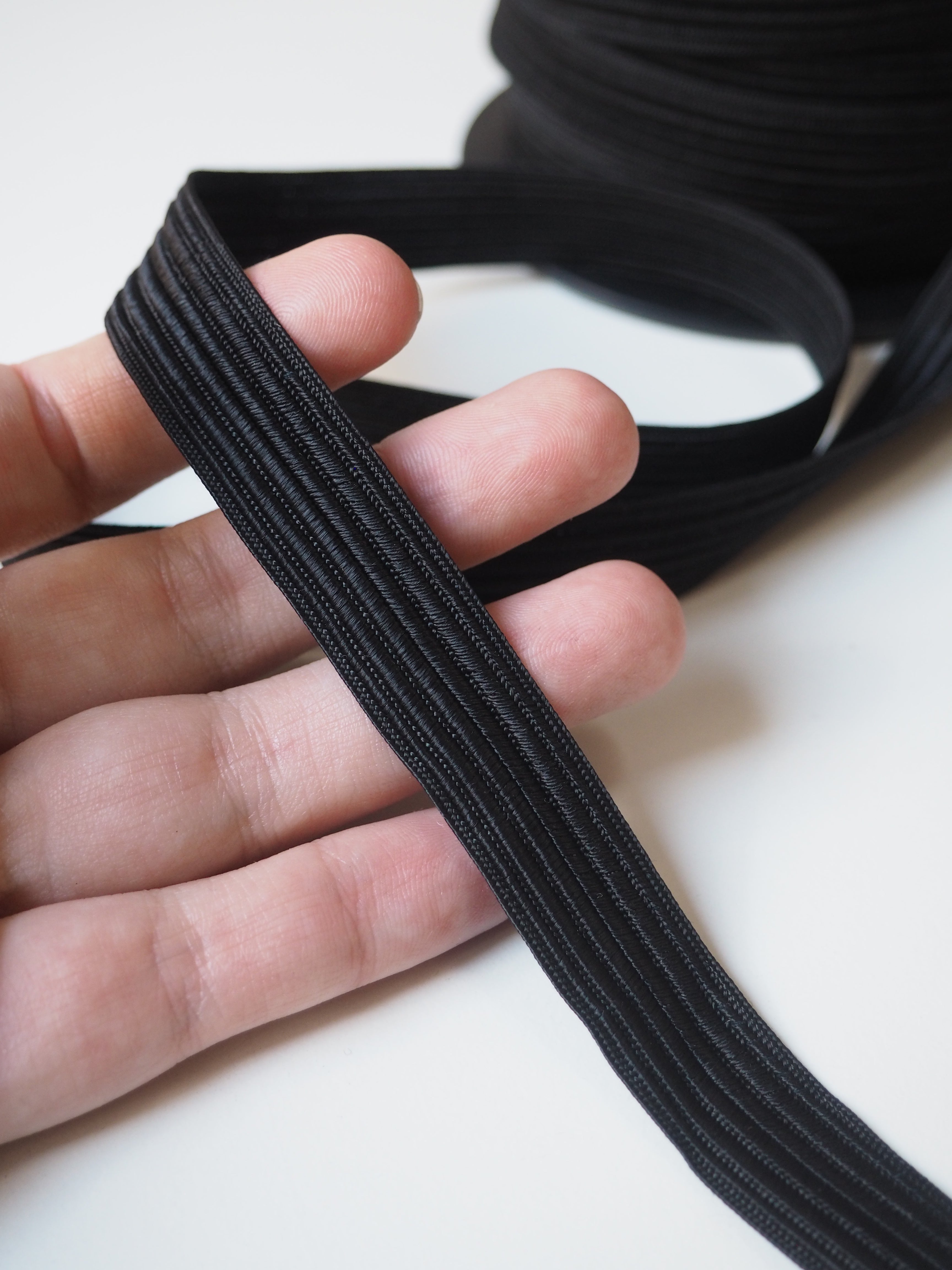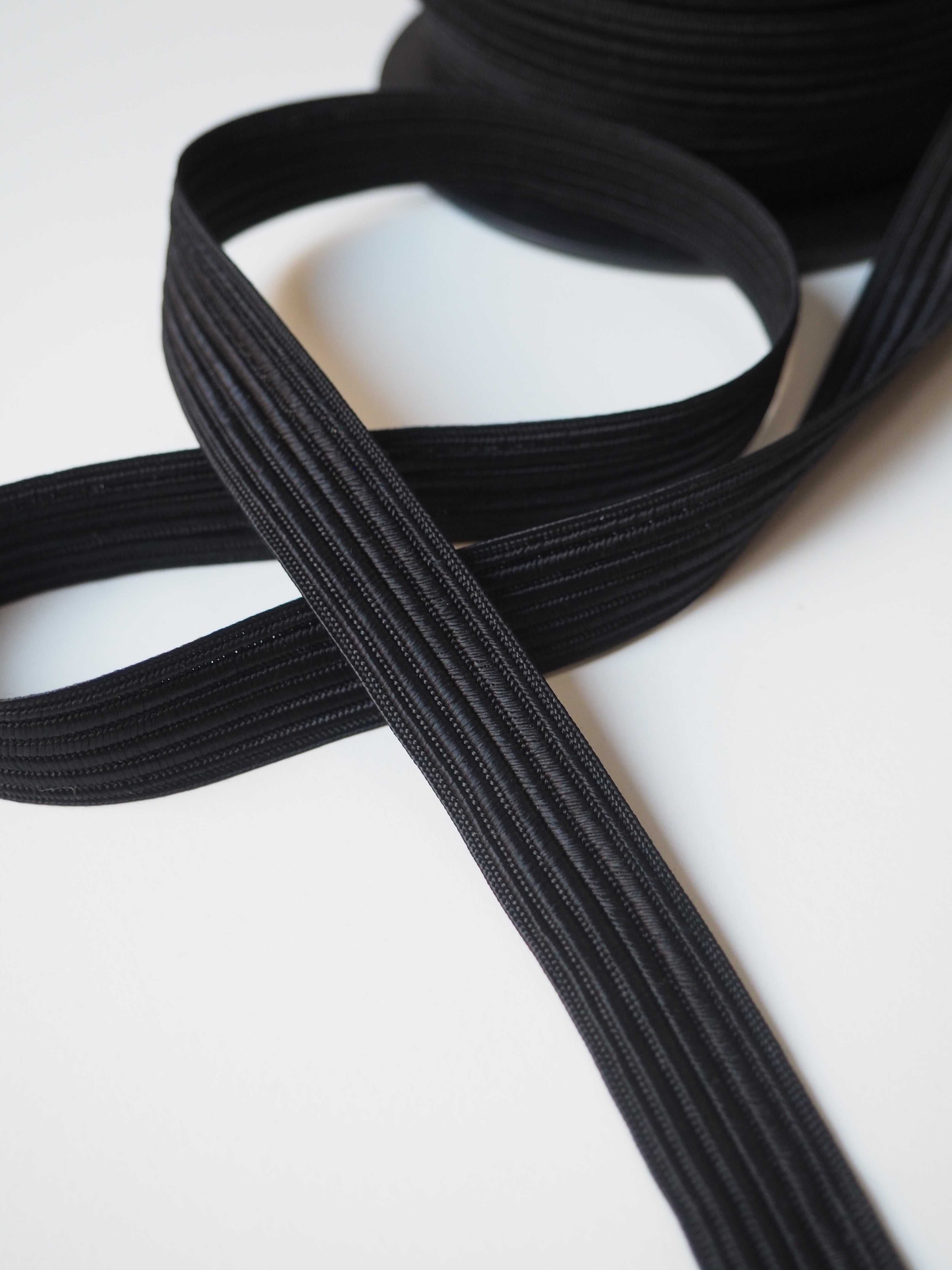 This ex-designer trim is a flat cording. In a shiny finish, it's woven into a flat raised cording, with a striped weave, in classic black. Sturdy but still flexible. Non-stretch and perfect for top stitching onto garment for a sophisticated or military look, or for home accents!
