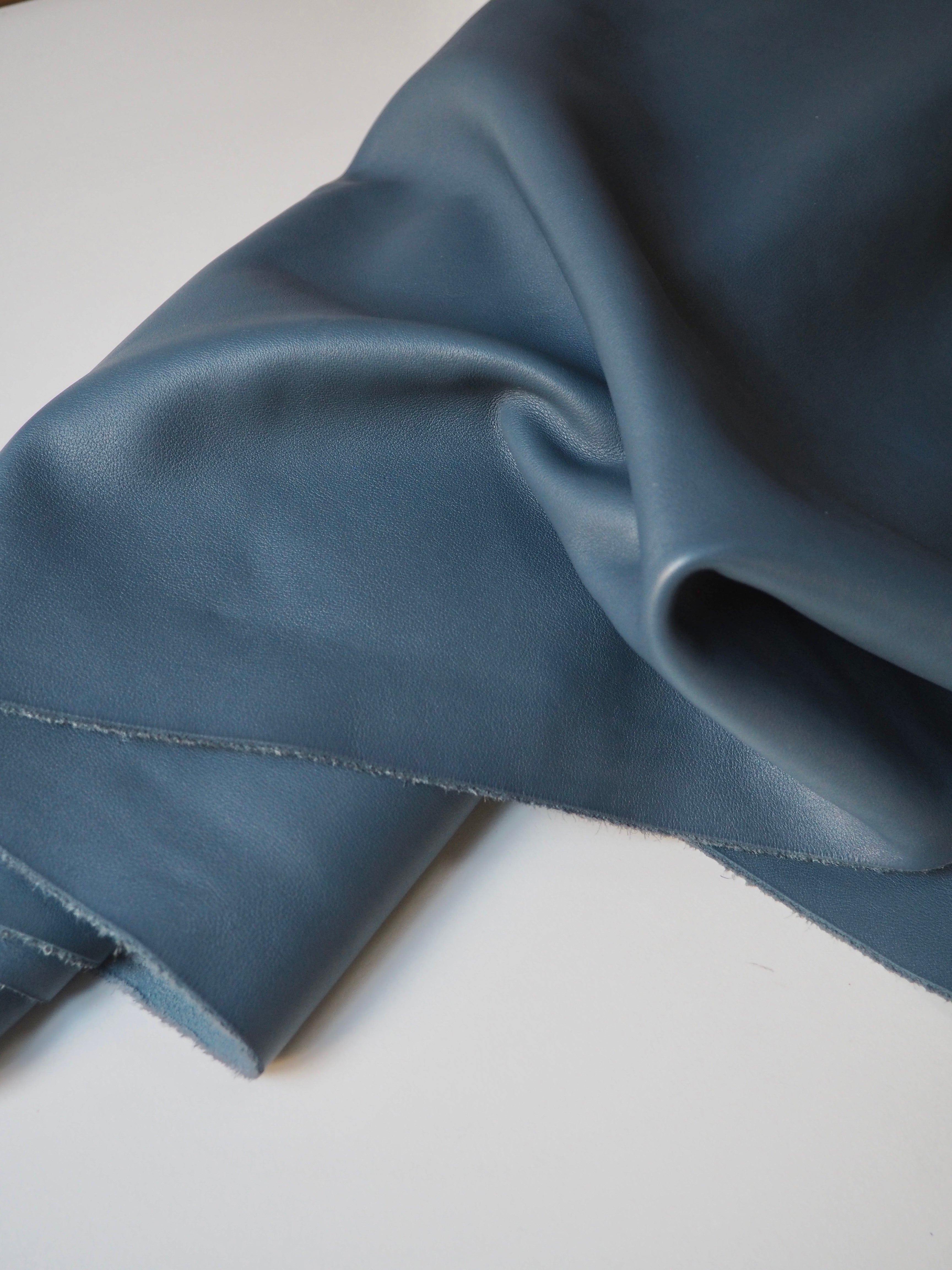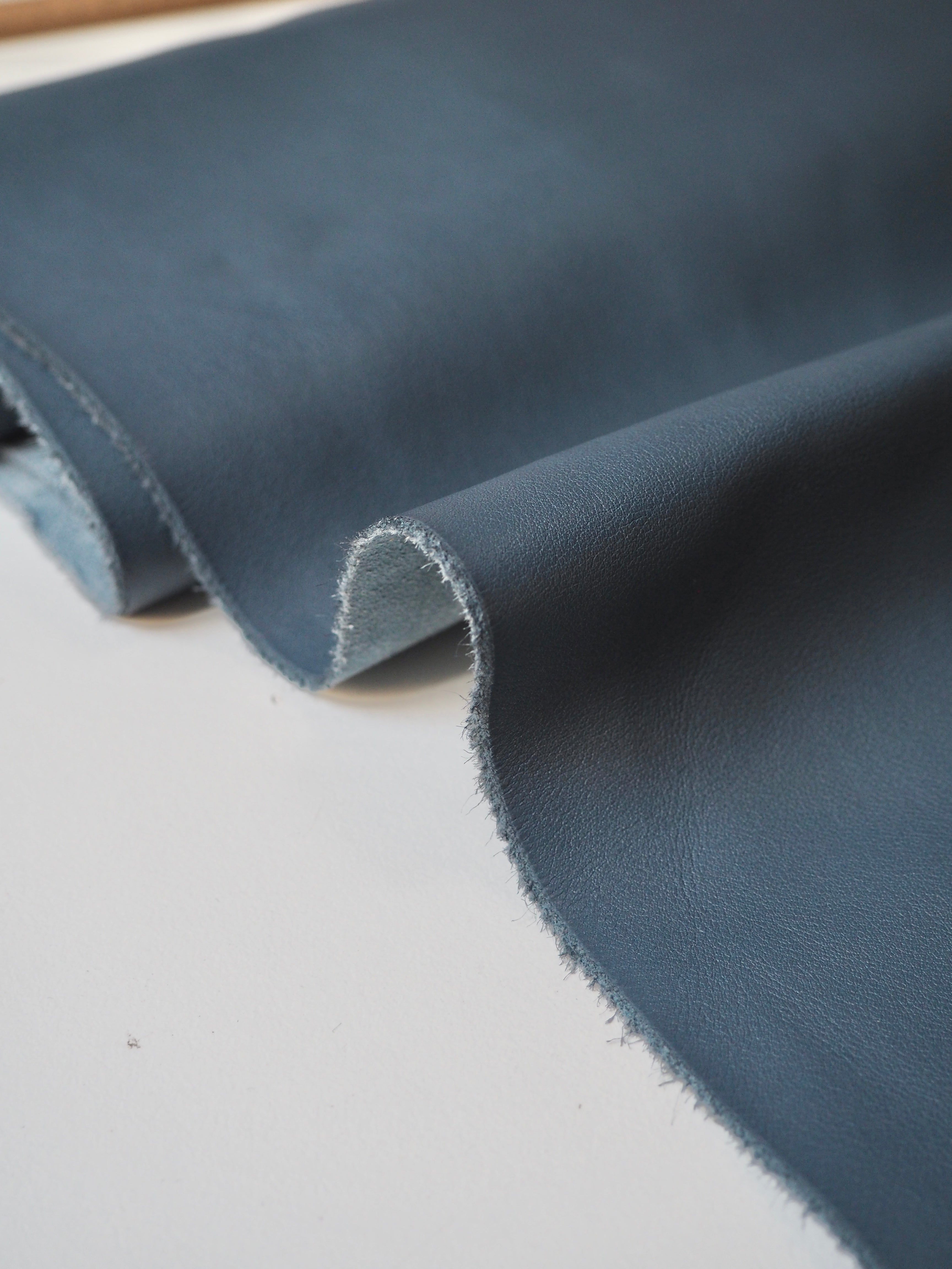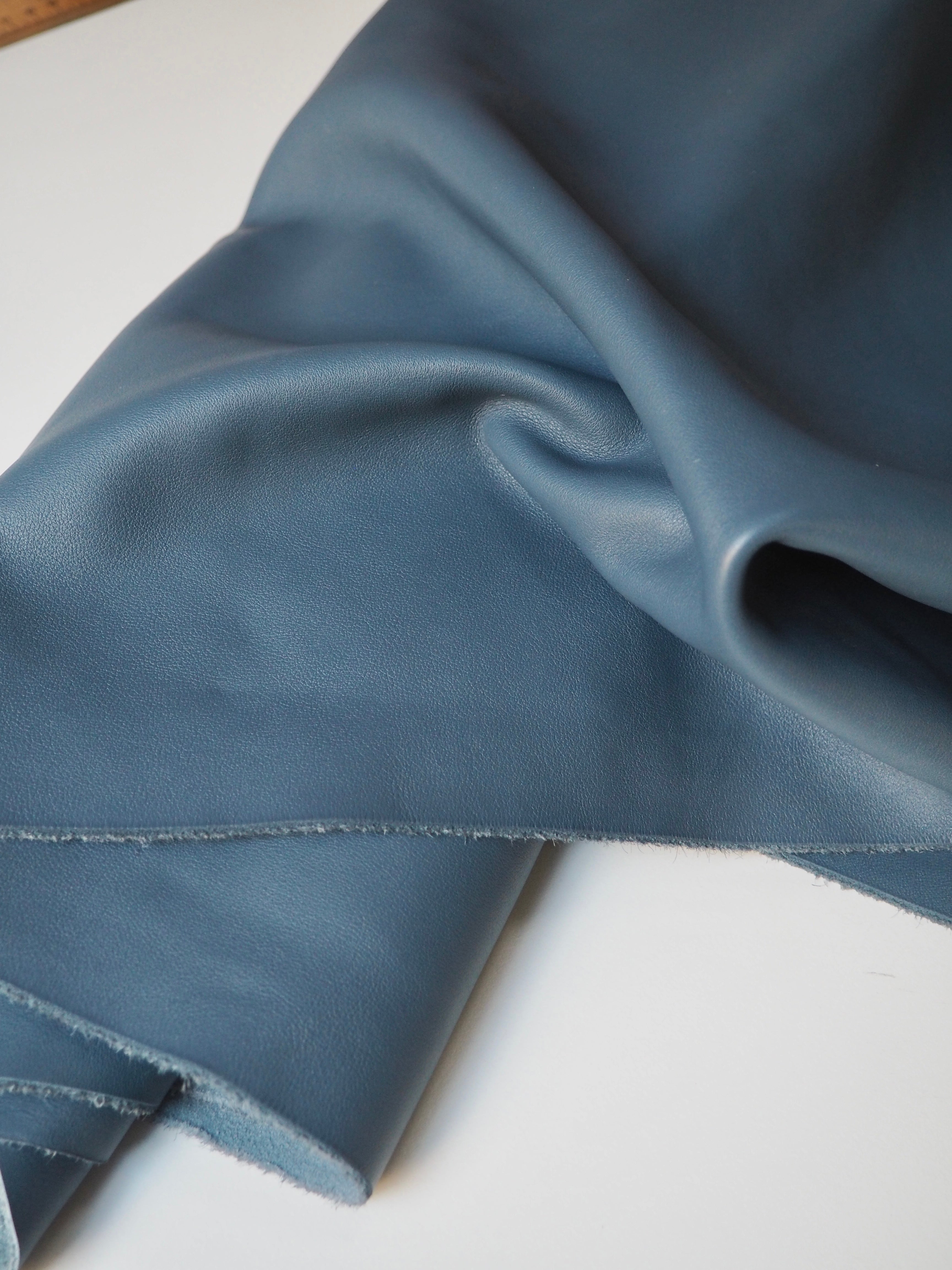 This ex-designer leather is a calfskin. It's a top grain leather with a smooth finish, a sturdy handle, and nice medium weight. Has a medium structure, with a bit of flexibility. In a dusky blue colour. We would love to see this made up into a bag or purse!