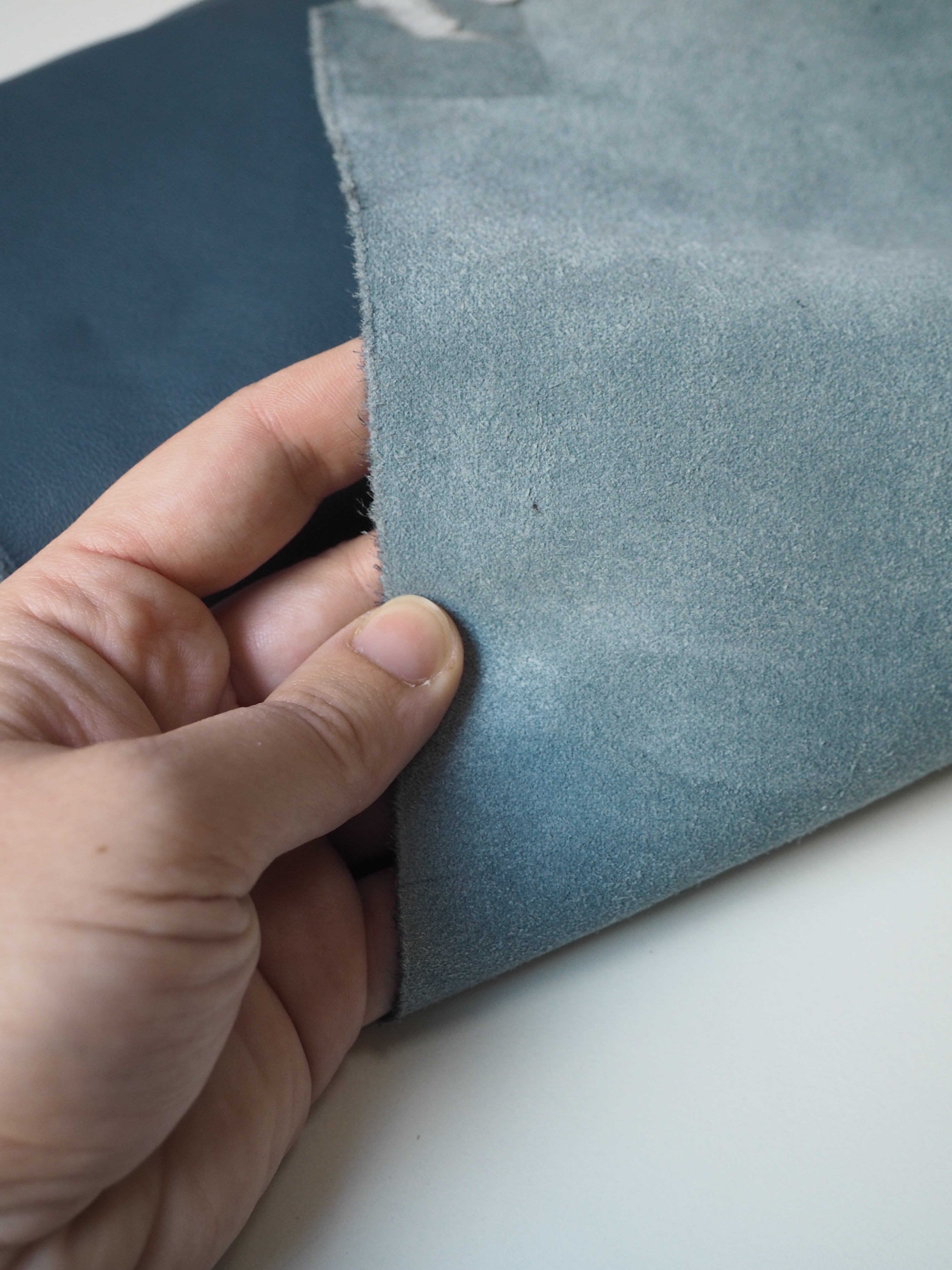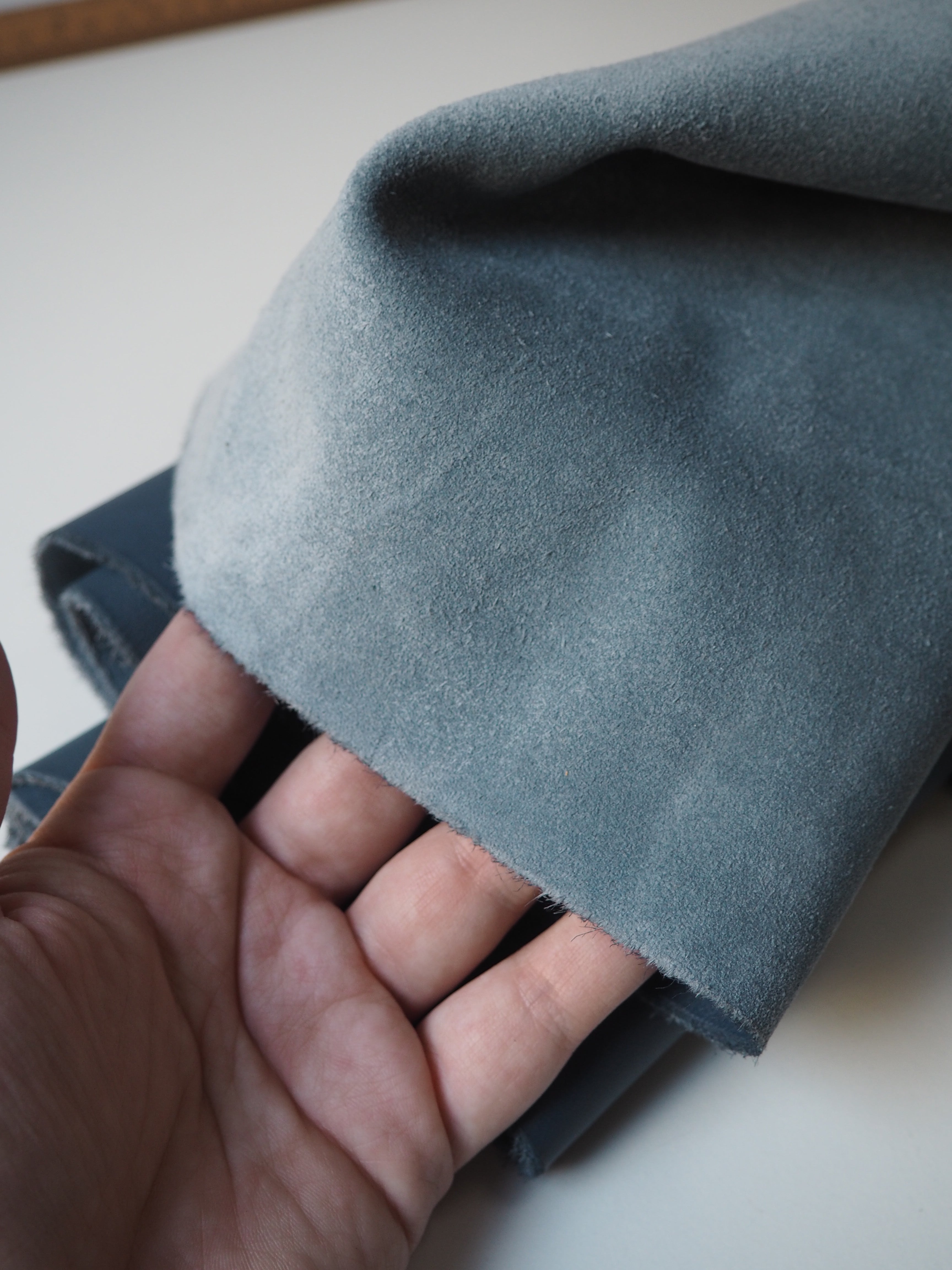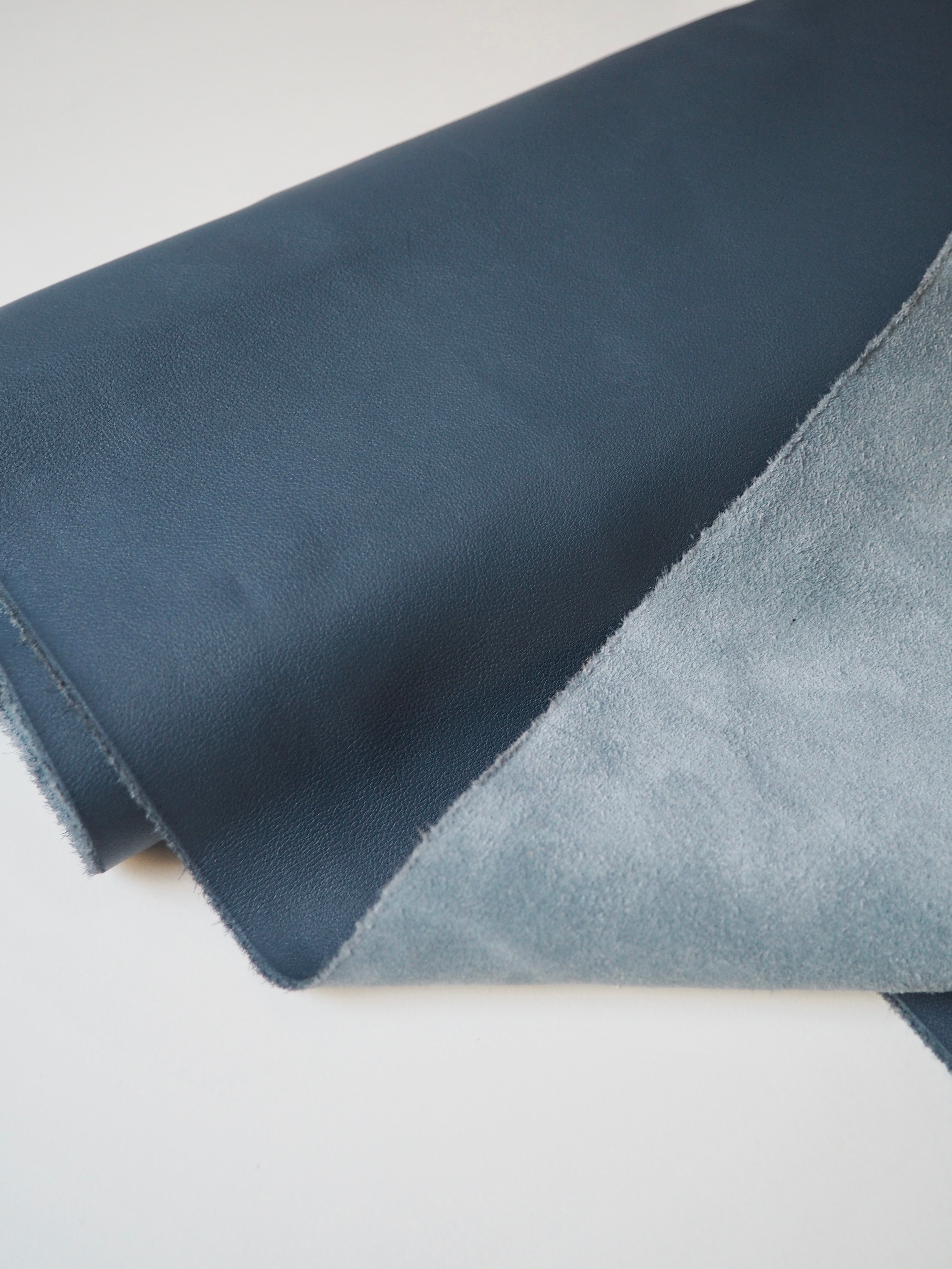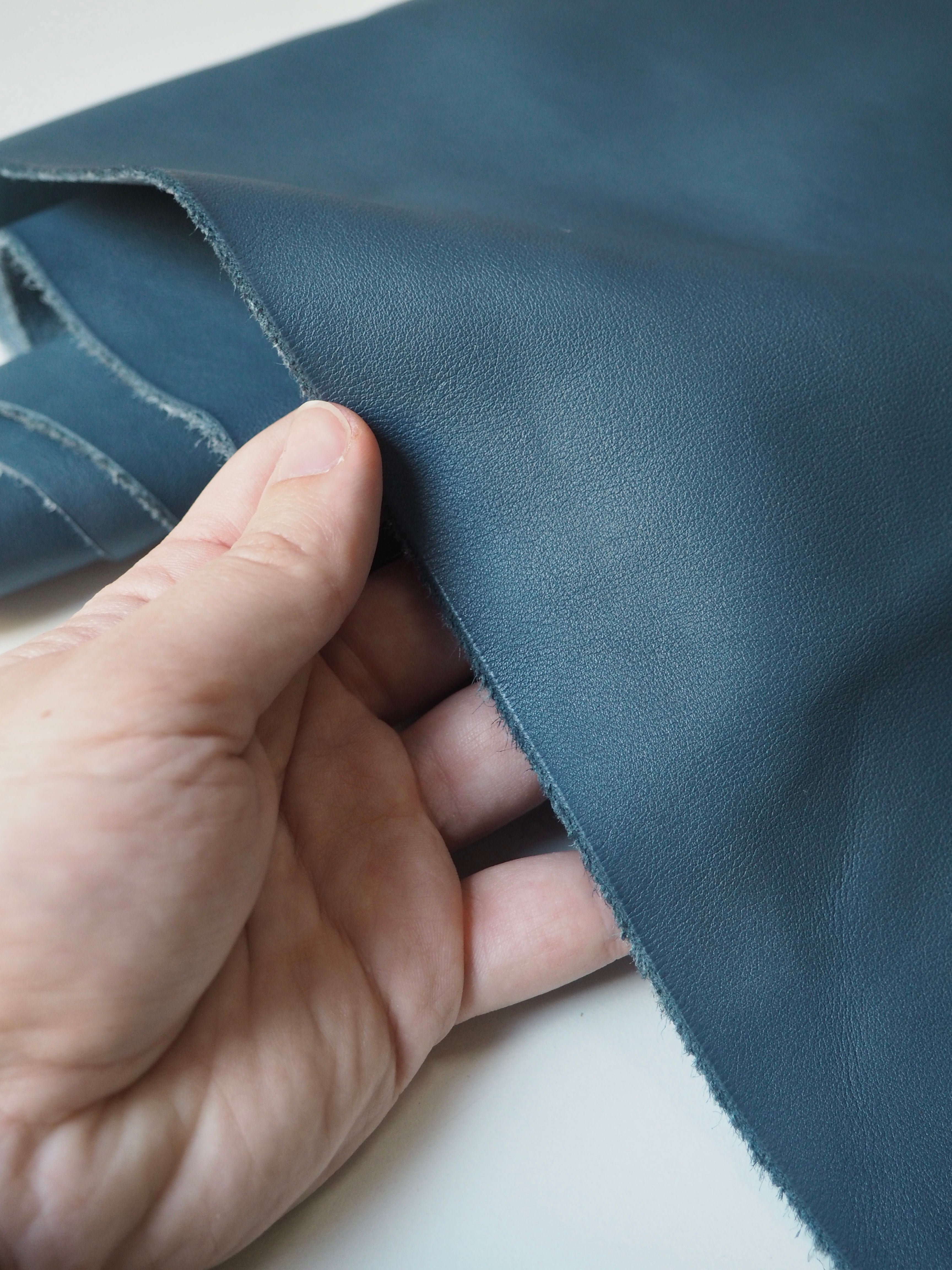 This ex-designer leather is a calfskin. It's a top grain leather with a smooth finish, a sturdy handle, and nice medium weight. Has a medium structure, with a bit of flexibility. In a dusky blue colour. We would love to see this made up into a bag or purse!