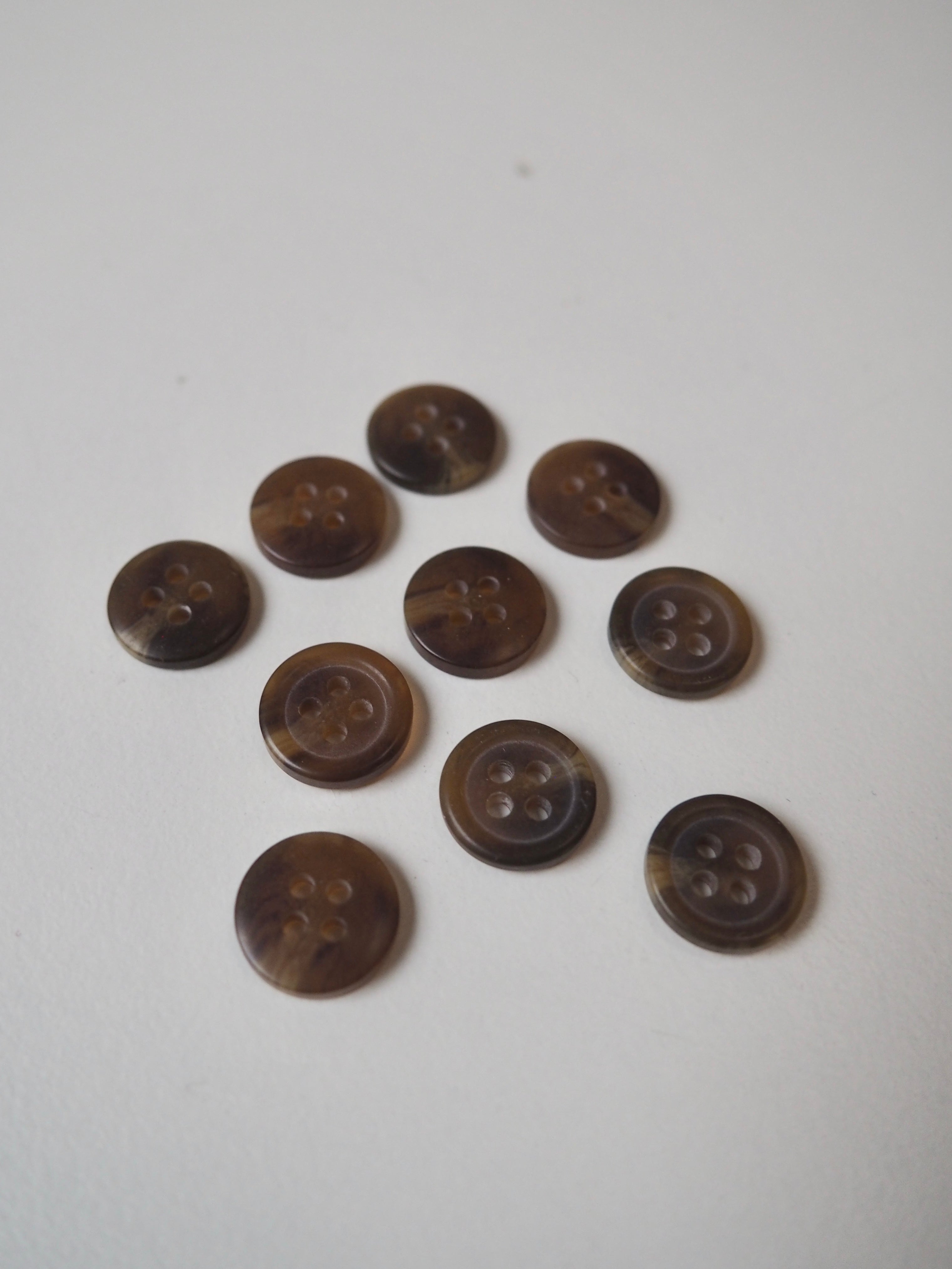This ex-designer trim is a 4-hole rimmed plastic button. They have a natural pattern on their surface blending a light and dark brown to mimic horn. Perfect size for shirts.