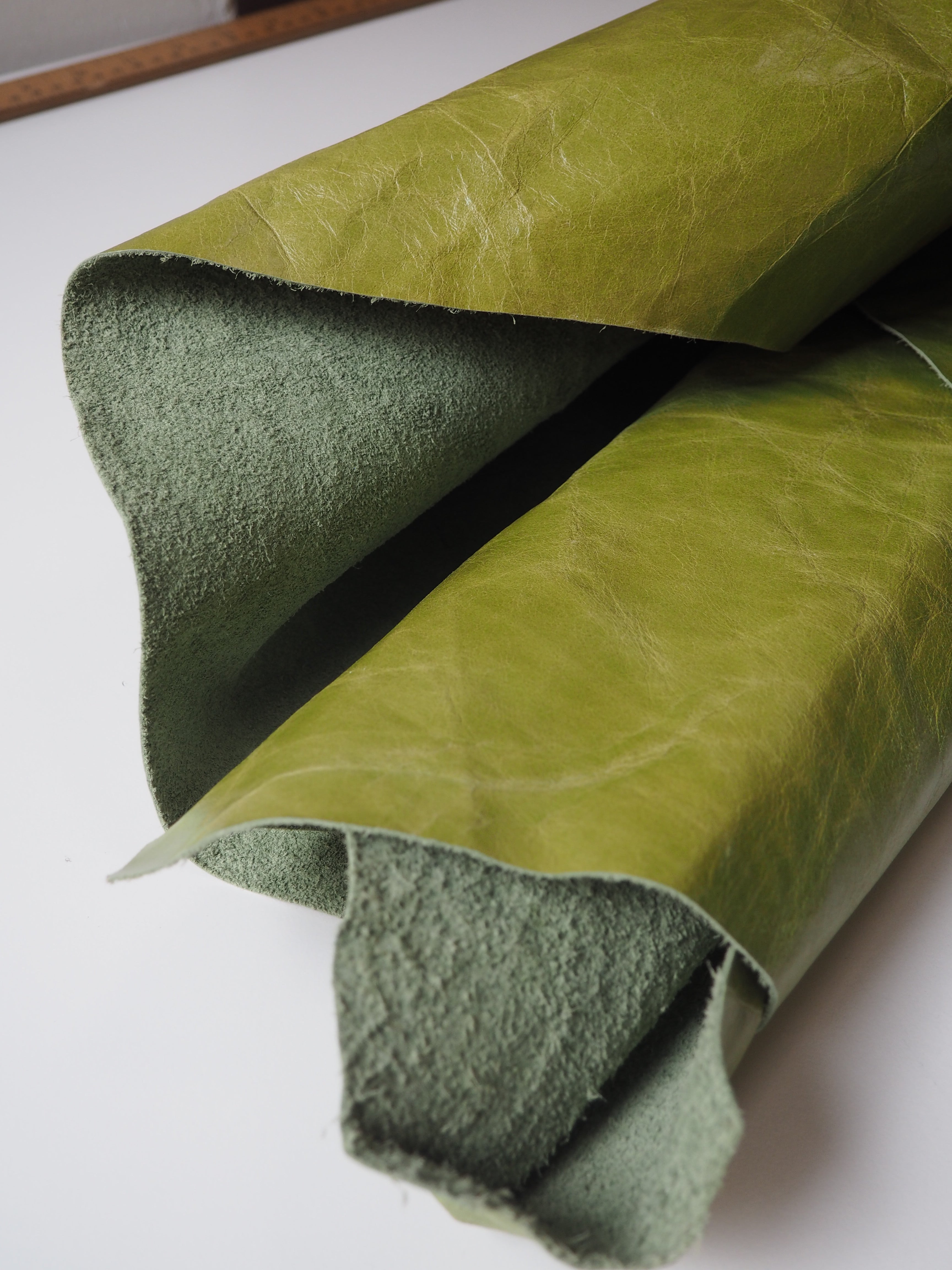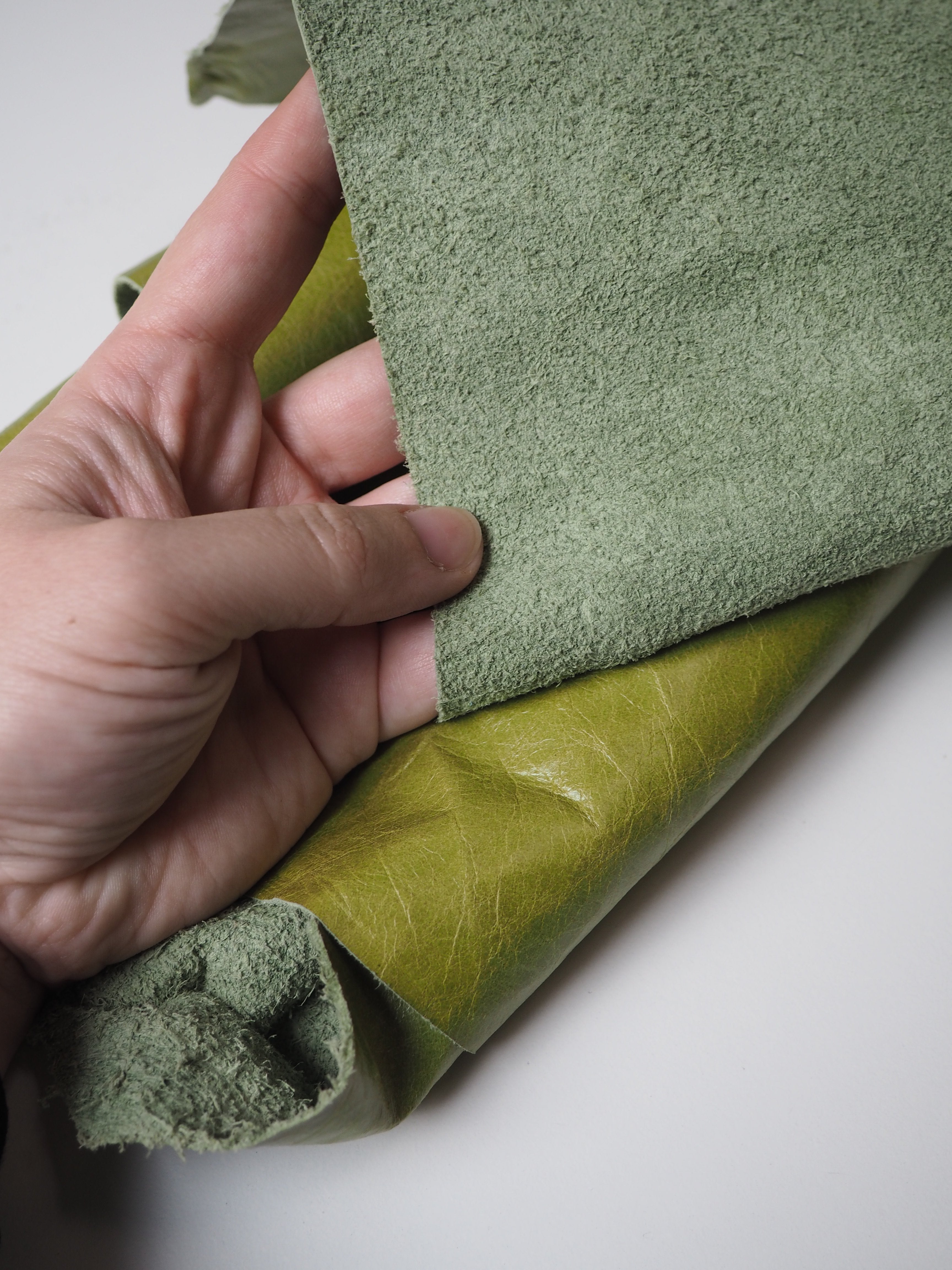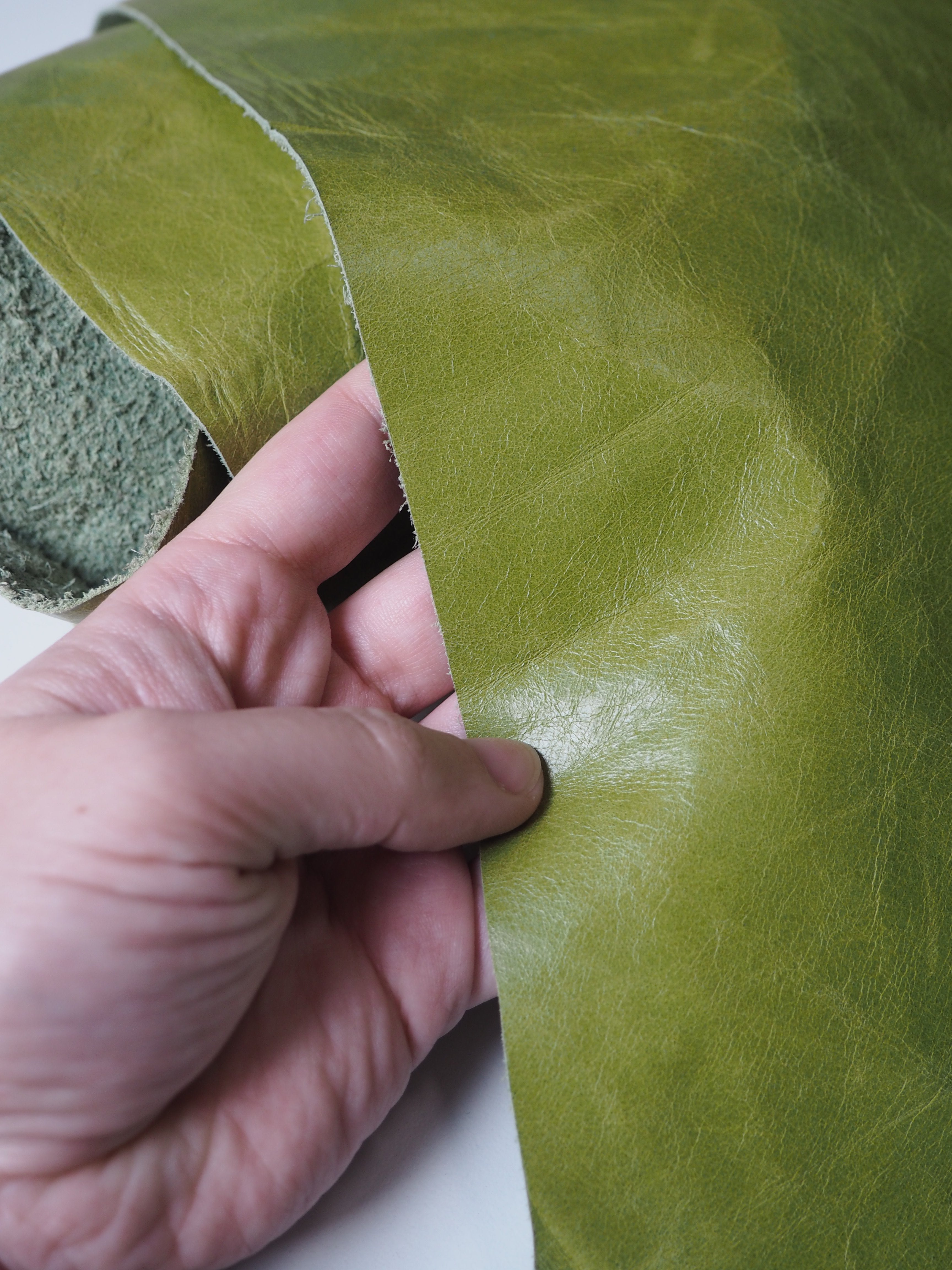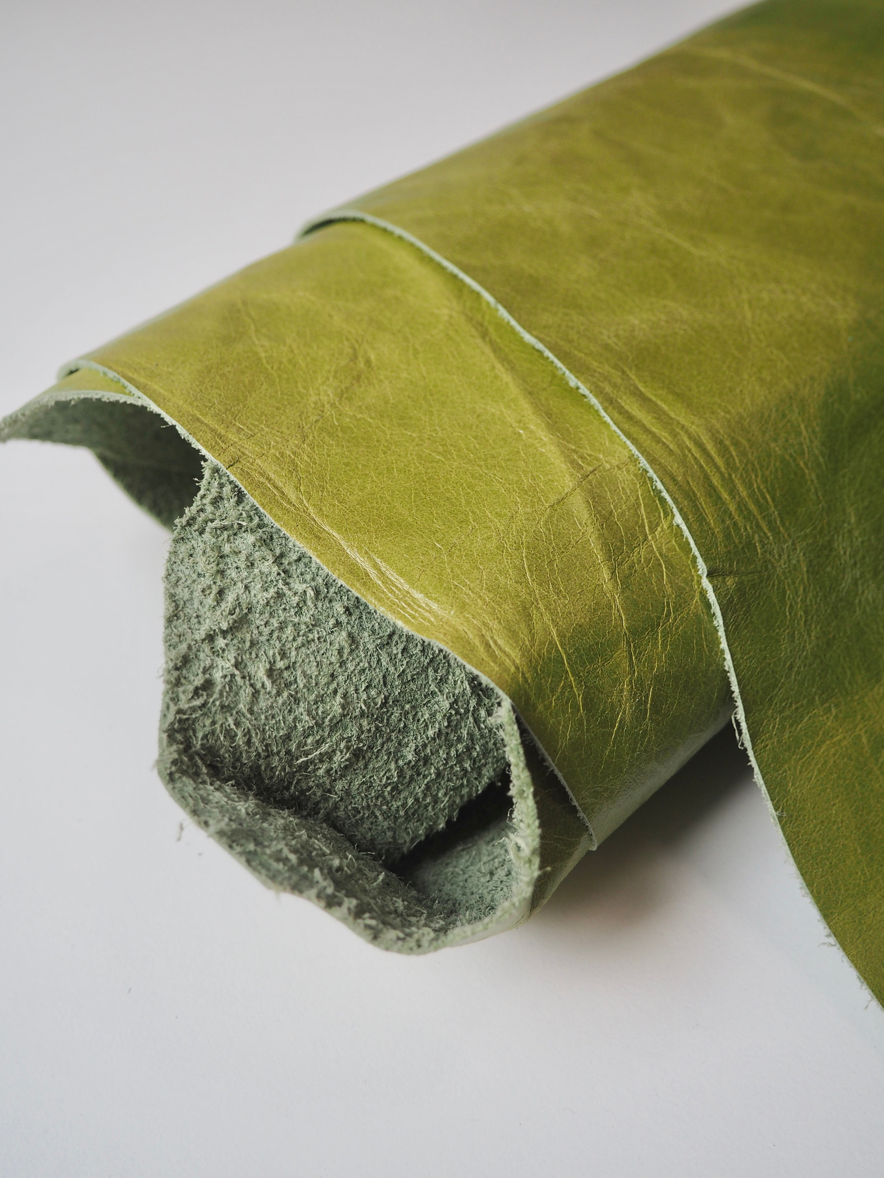 This ex-designer leather is a calfskin. It has a distressed finish, with a slightly textured handle, and light to medium weight. In a true apple green colour. We would love to see this made up into a jacket or bag!