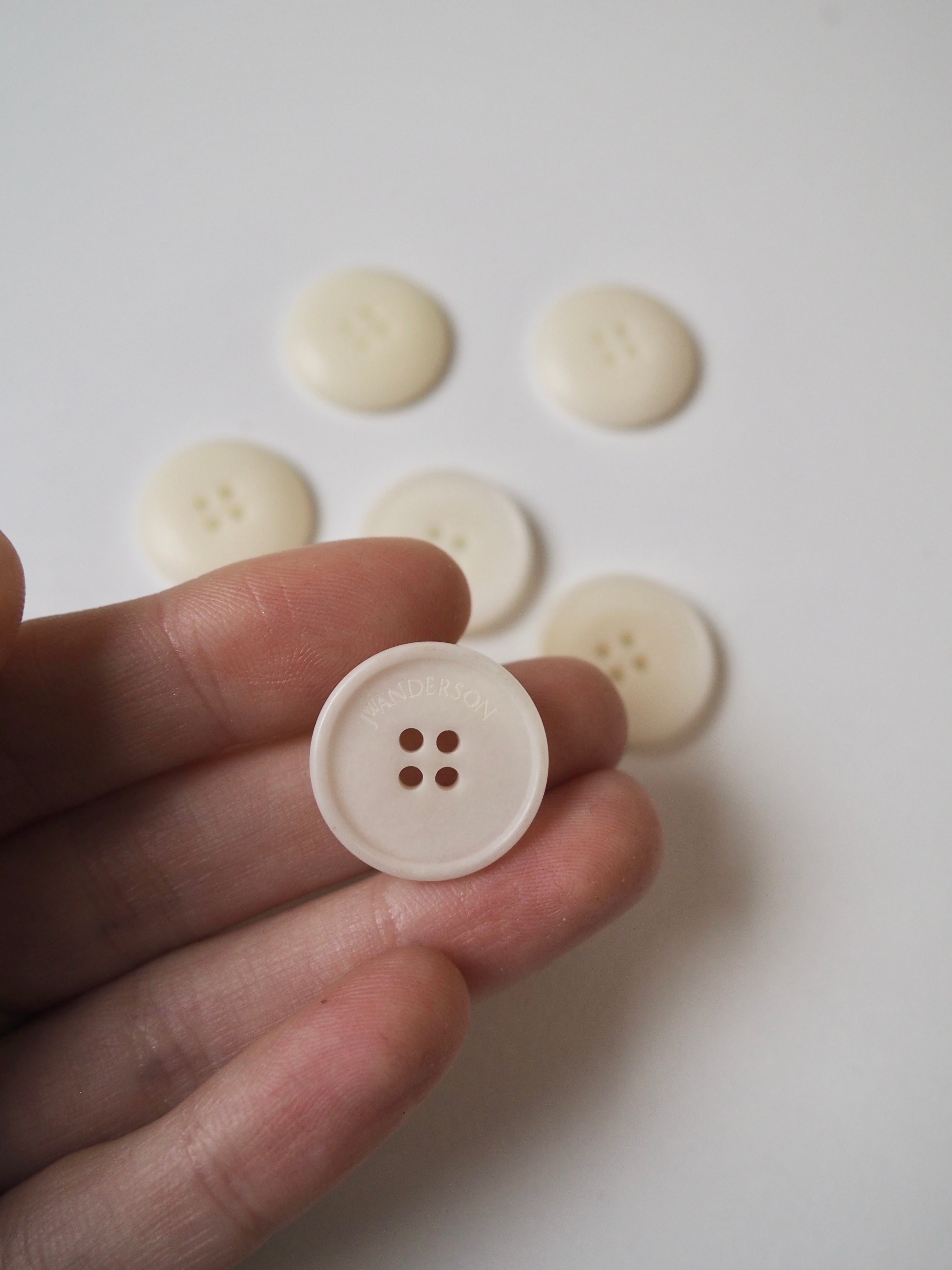 This ex-designer trim are 4-hole corozo buttons with a rimmed edge and an engraved brand name. They are a natural cream colour. Corozo is a sustainable alternative to traditional horn or plastic buttons. Made from the nuts of the Tagua Palm, corozo buttons are completely natural and biodegradable. They can be dyed many different colours and have a lovely wood-like grain. Perfect size for shirts, jackets and cardigans.