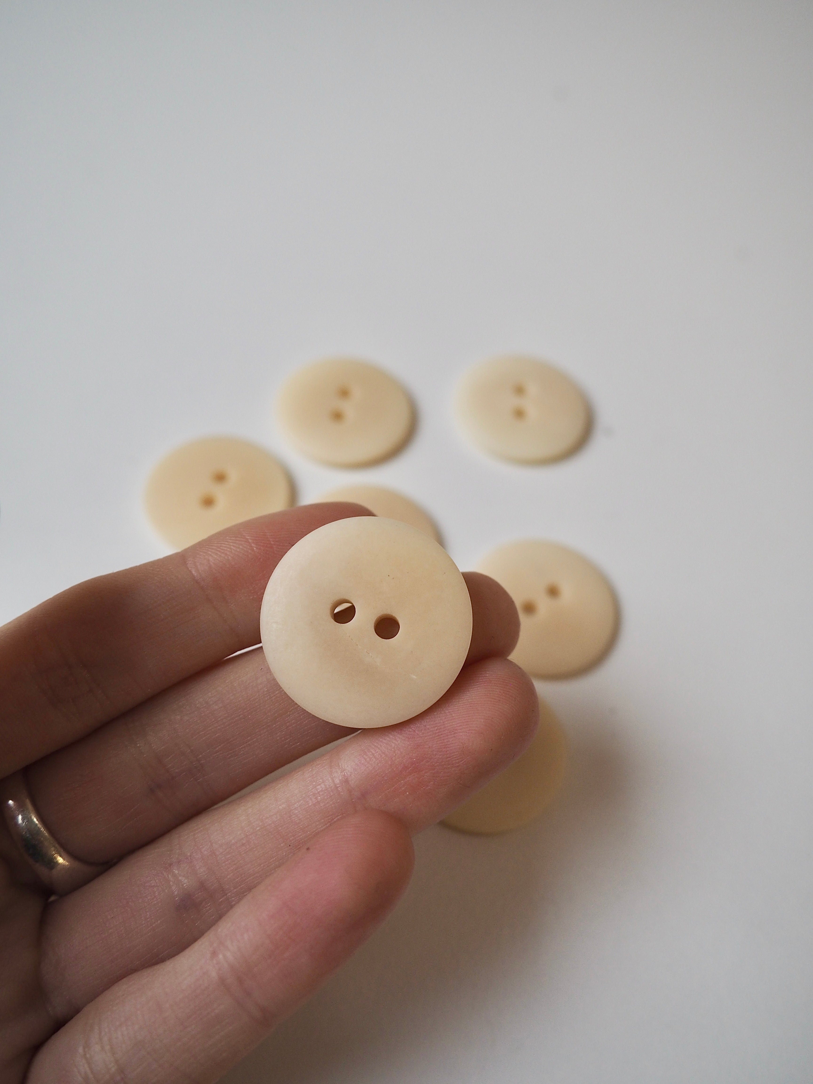 This ex-designer trim are corozo buttons, 2-hole, flat on one side and slightly domed on the other. They are a natural yellowy dark cream colour. Corozo is a sustainable alternative to traditional horn or plastic buttons. Made from the nuts of the Tagua Palm, corozo buttons are completely natural and biodegradable. They can be dyed many different colours and have a lovely wood-like grain. Perfect size for coats, jackets and cardigans.
