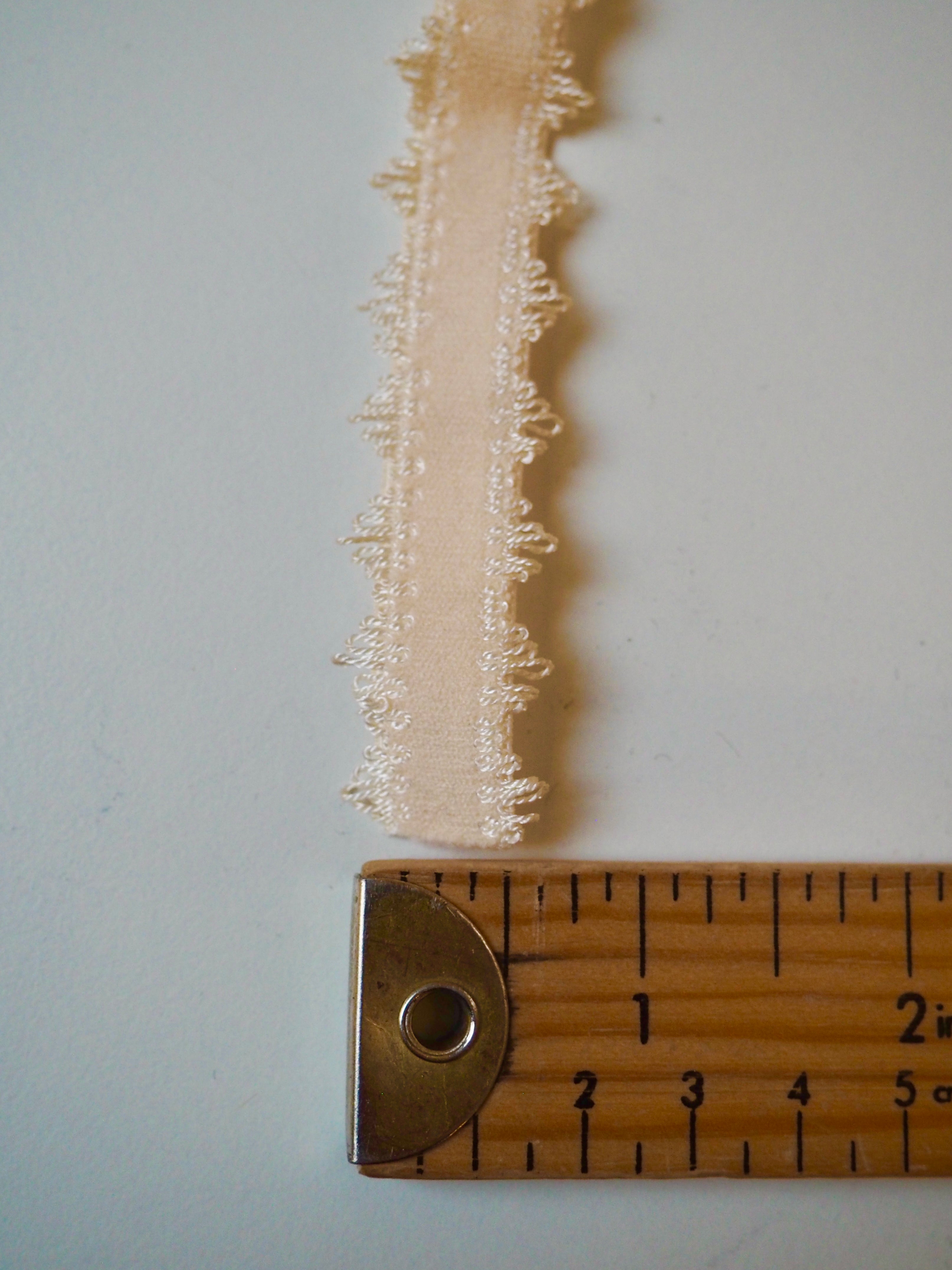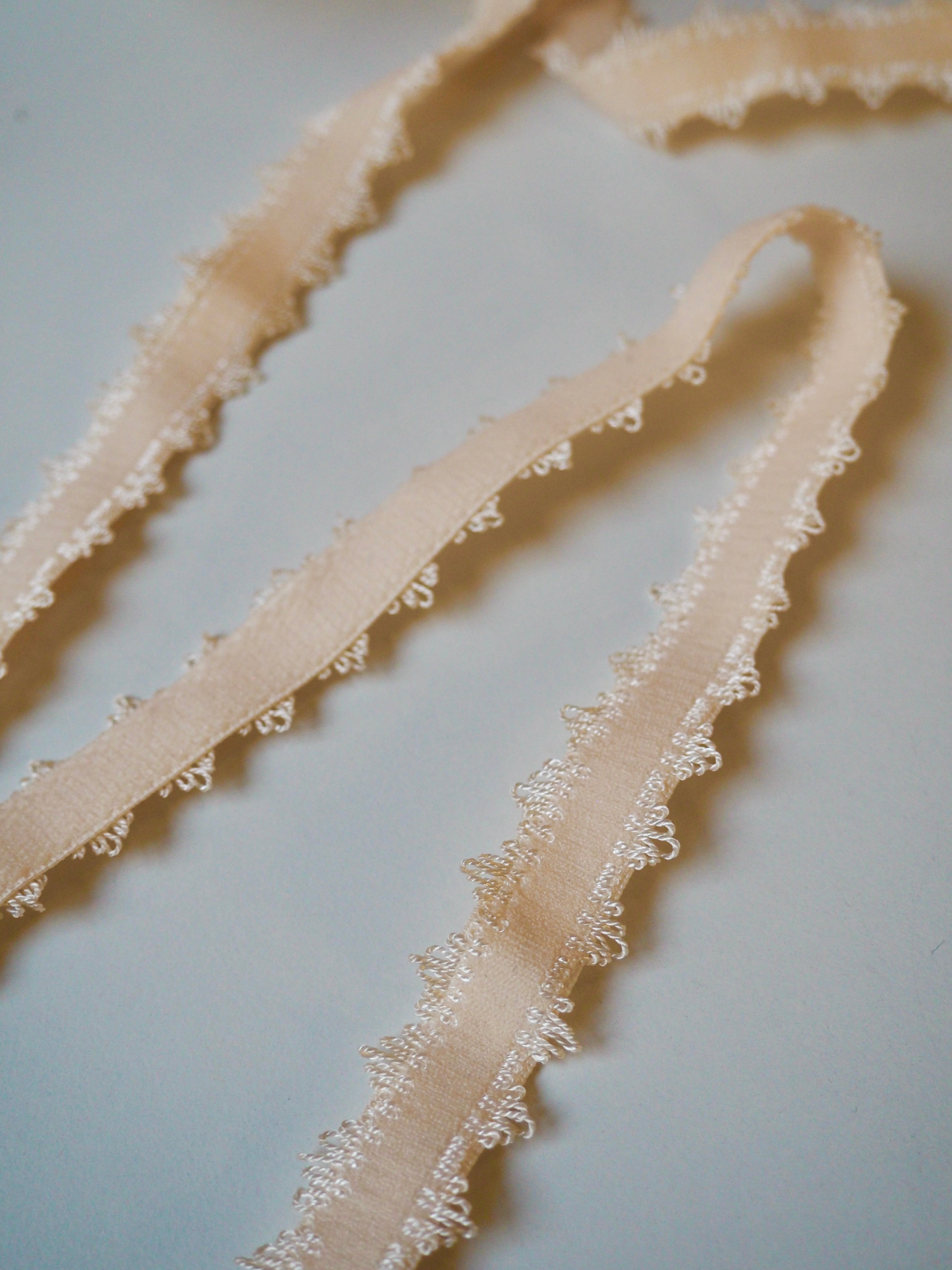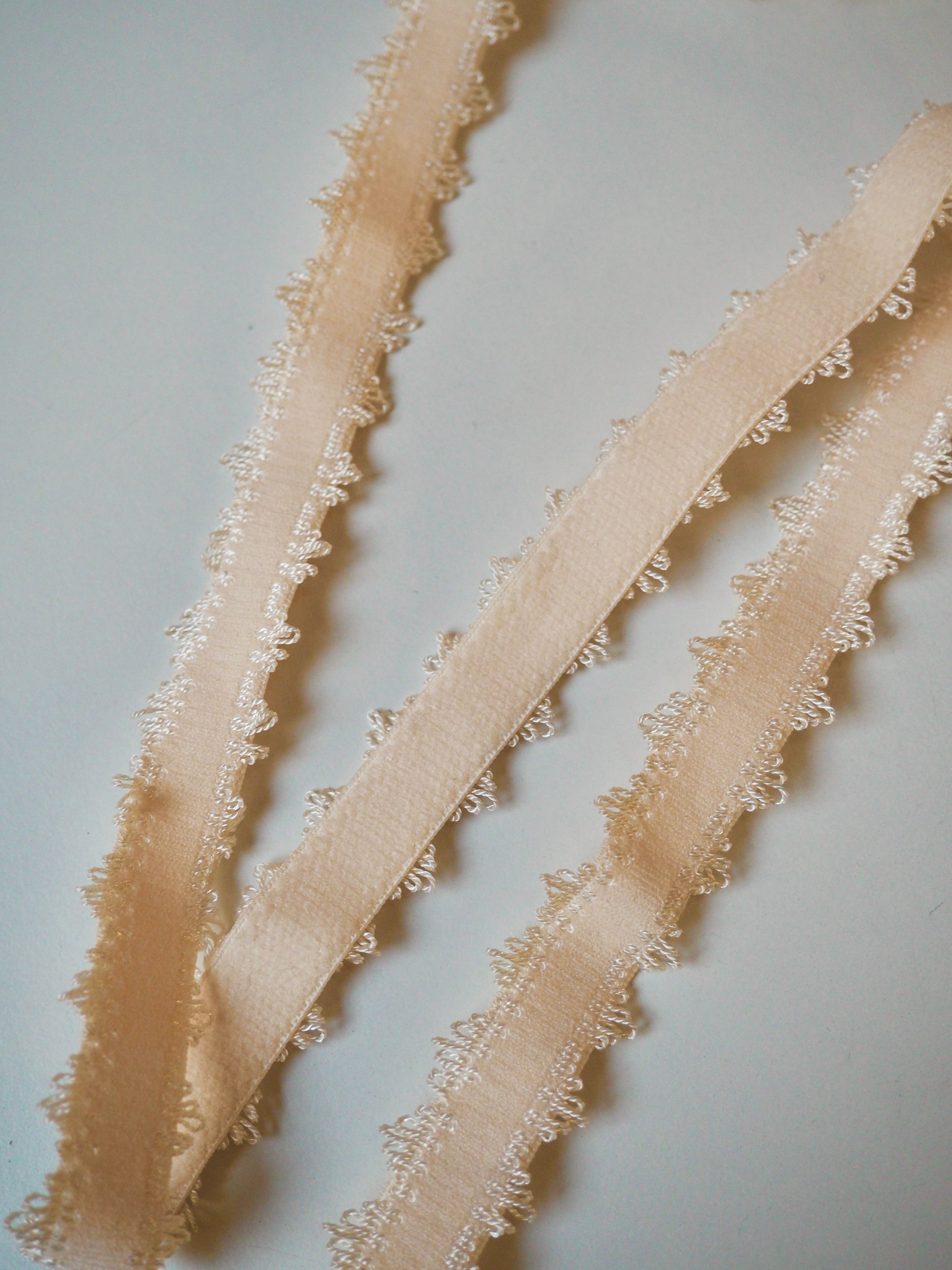 This dead stock trim is a pale peach colour elastic. It’s a strong elastic suitable for straps with great recovery and super soft to the touch. Both edges are finished with lace like loops. Perfect for bra straps and lingerie!