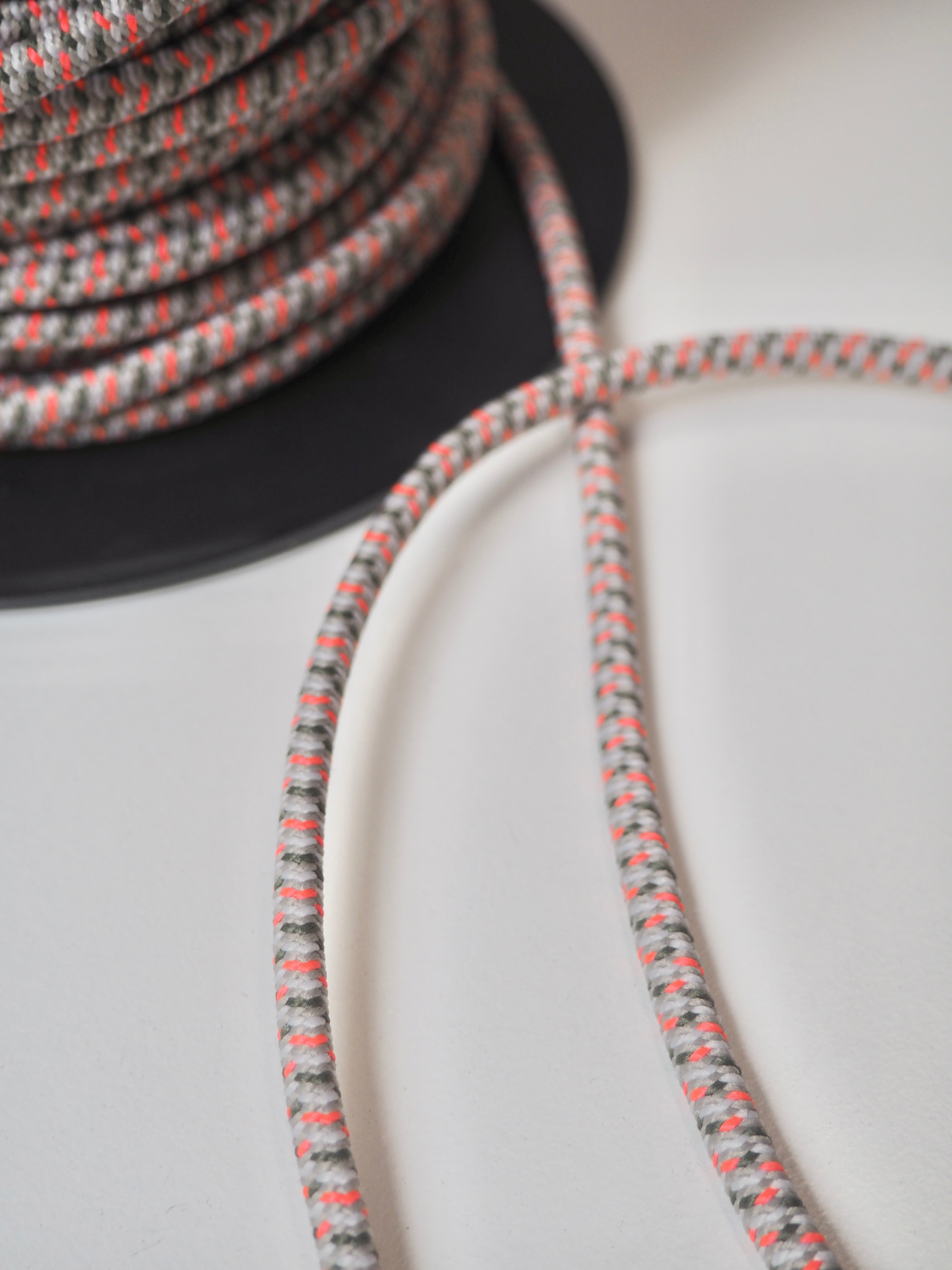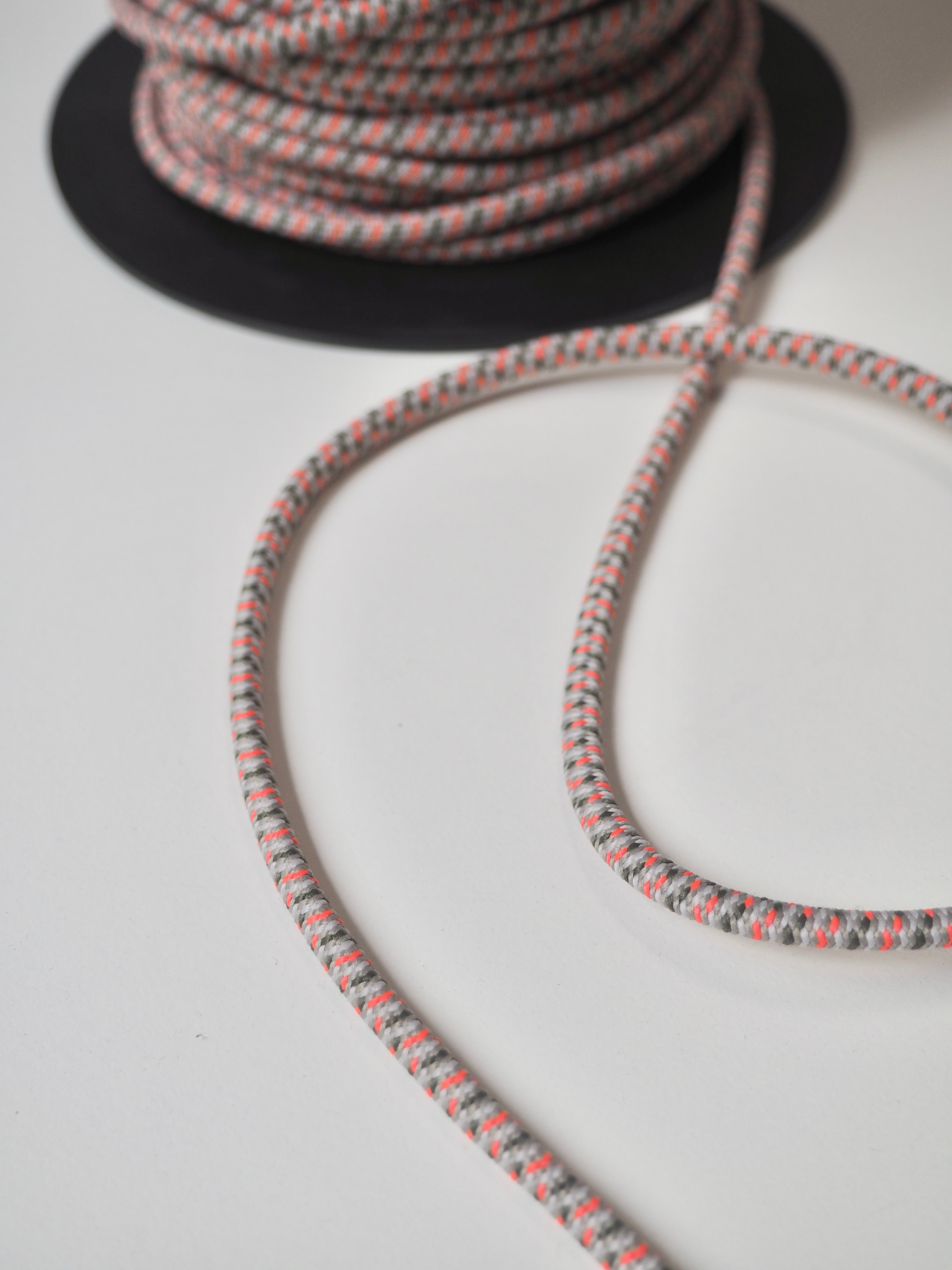 This ex-designer trim is a unique braided cord. It's a bright pink, green, and light grey colourway. It's quite stretchy, at least 50%. Perfect for ties on home furnishings, for bags and accessories, or as a drawstring on a garments