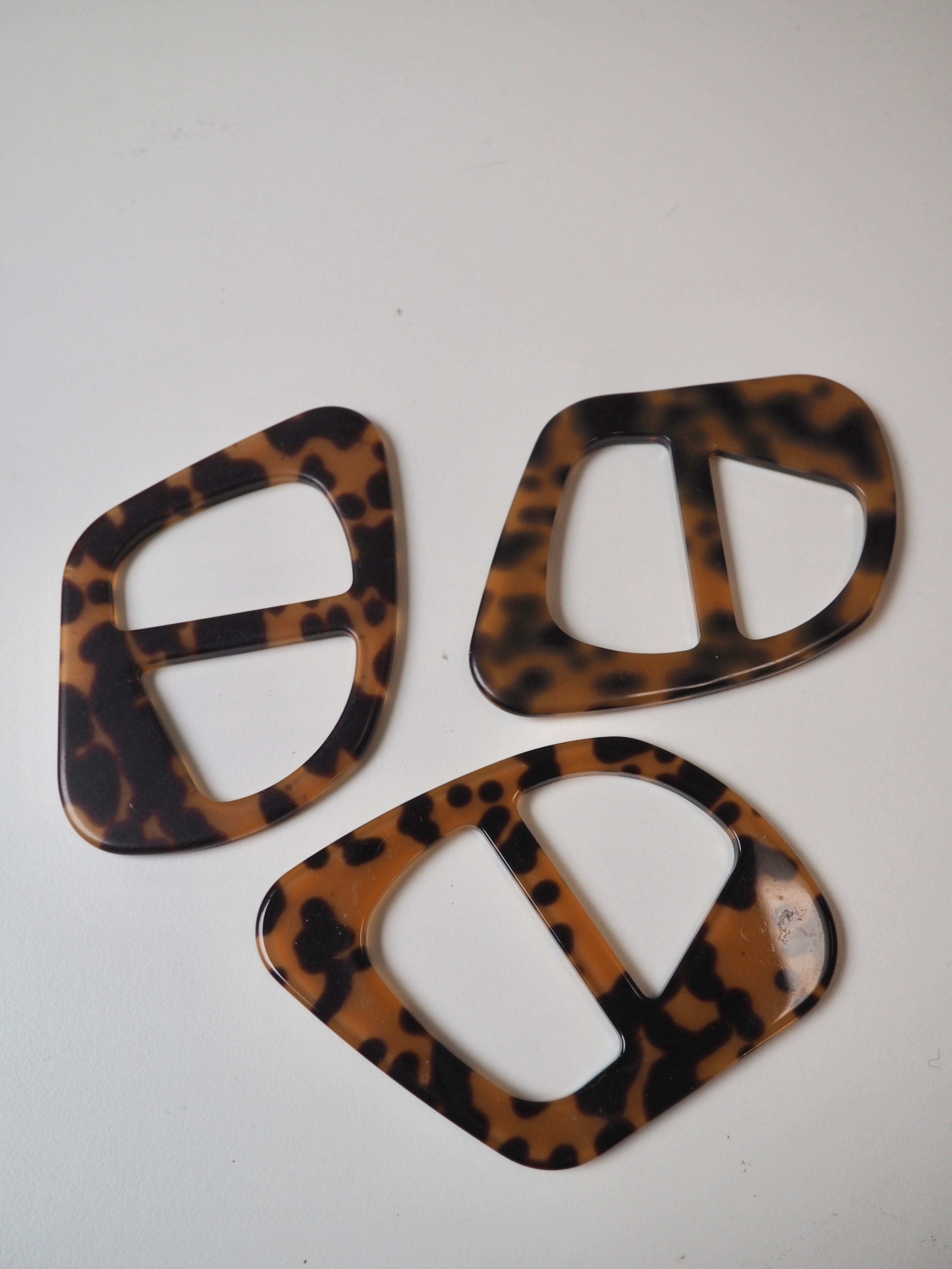 This deadstock trim is a plastic buckle, perfect for adding a special detail to garments! They could be used for coats, dresses, jumpsuits, bags, belts - they're perfect for adding an extra detail to your me-mades. They are a tortoise shell pattern and a lovely organic asymmetrical shape. No needle, so only works as a slider style buckle.