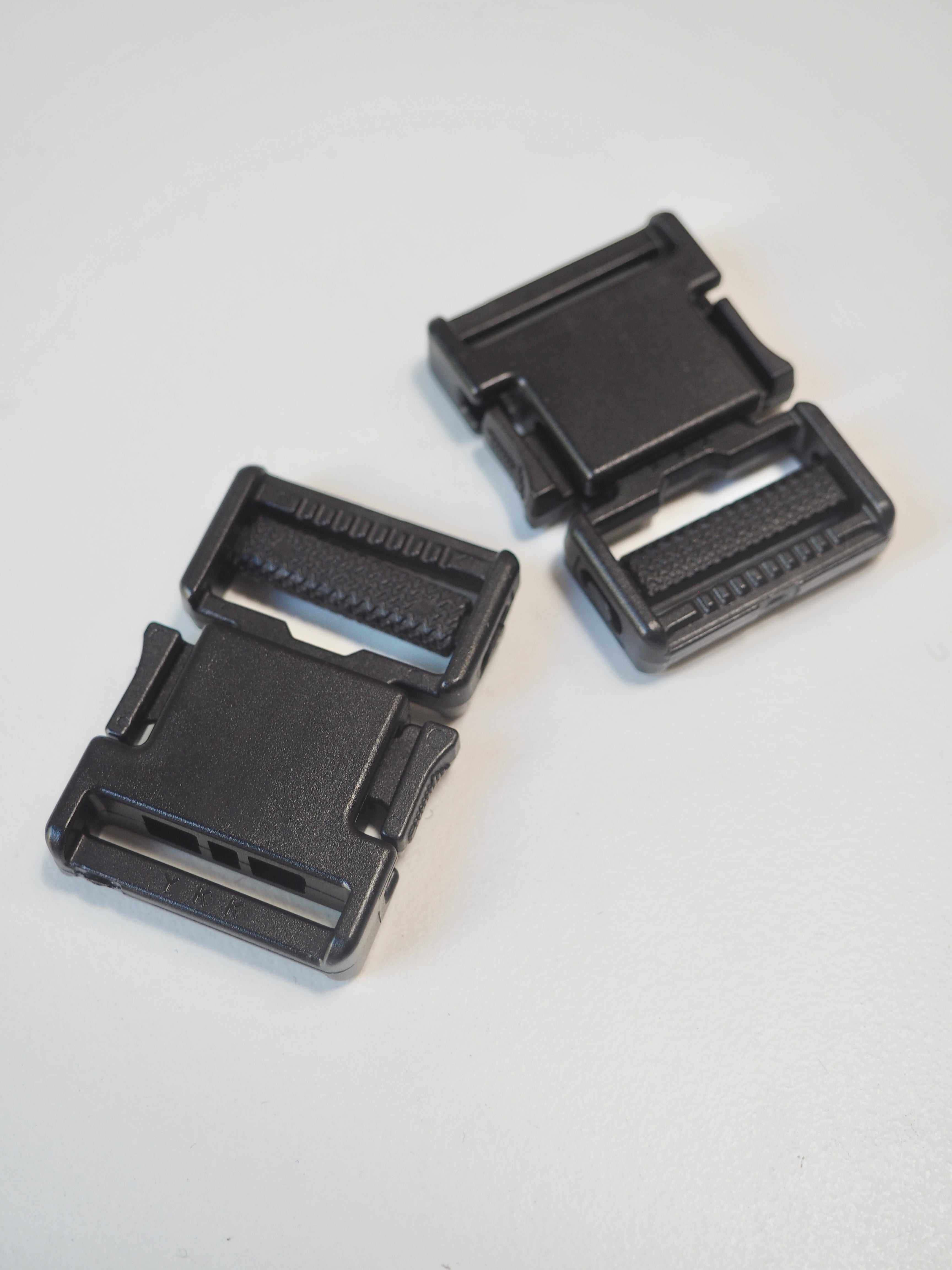 This ex-designer hardware is a buckle. It's a plastic side release buckle, easy to use, with side adjuster and squared shape. It also has a slider with textured ridging that grasps onto a strap well. It's lightweight and a great addition to a garment, accessory, or even for luggage use!