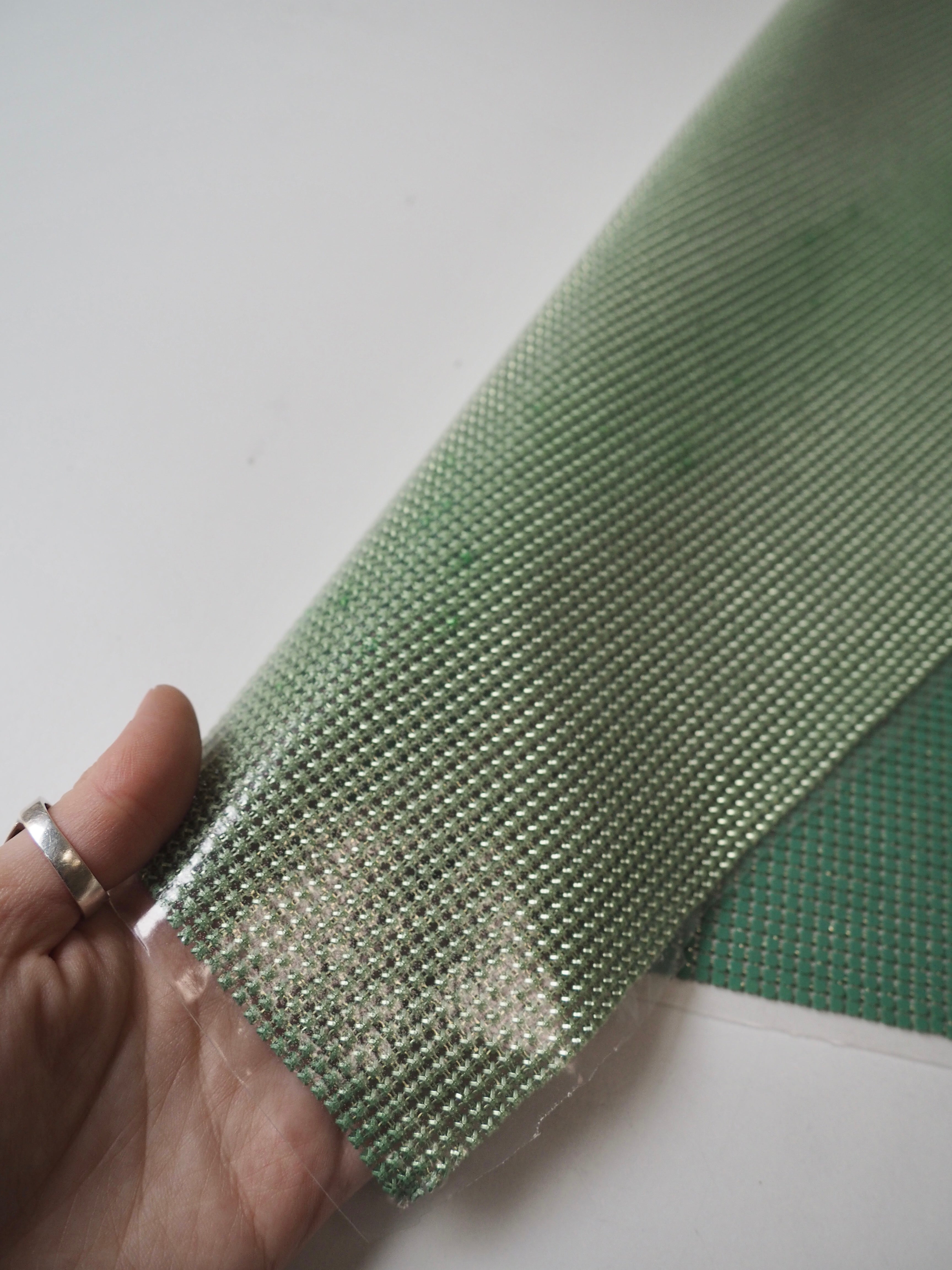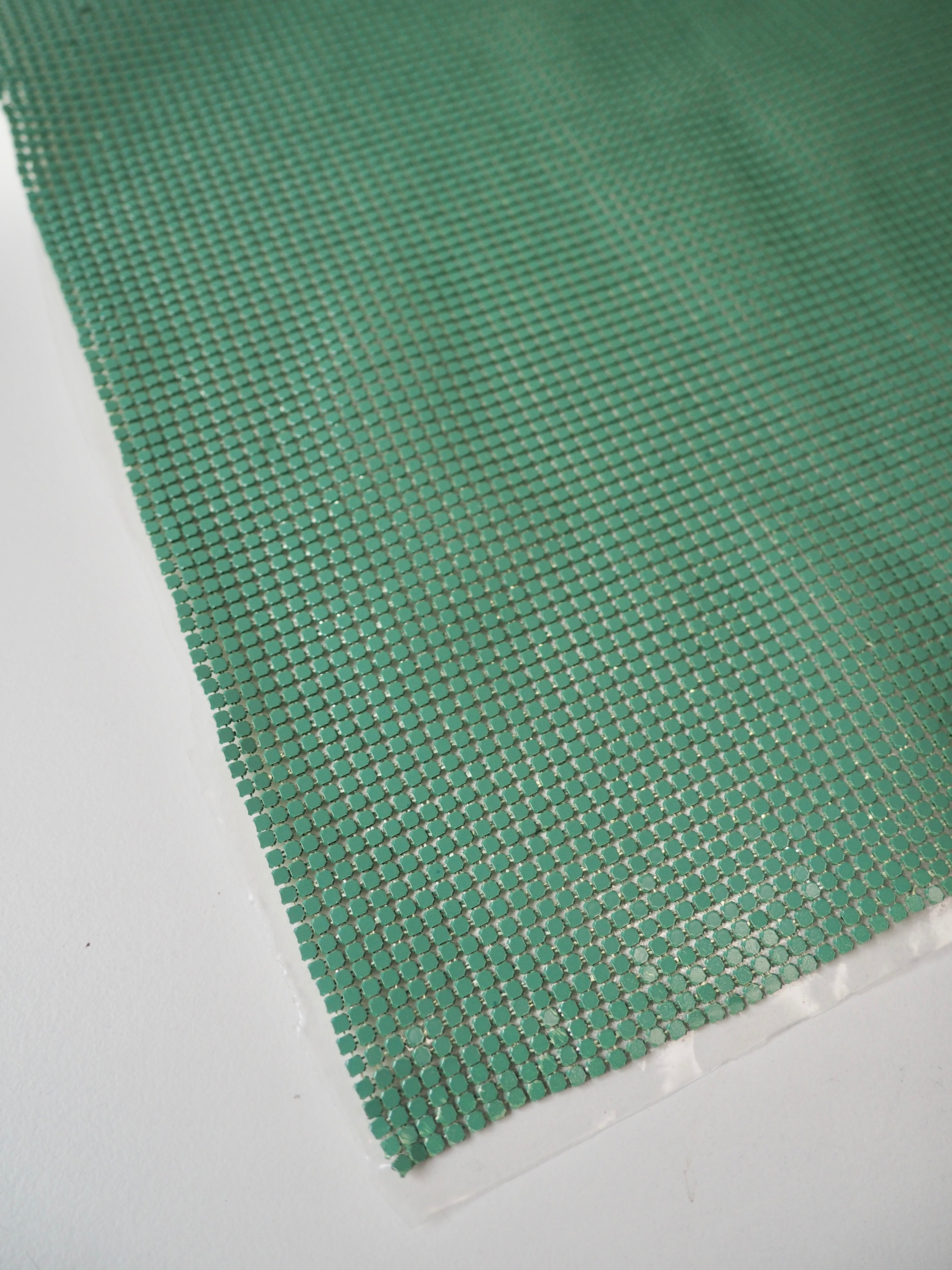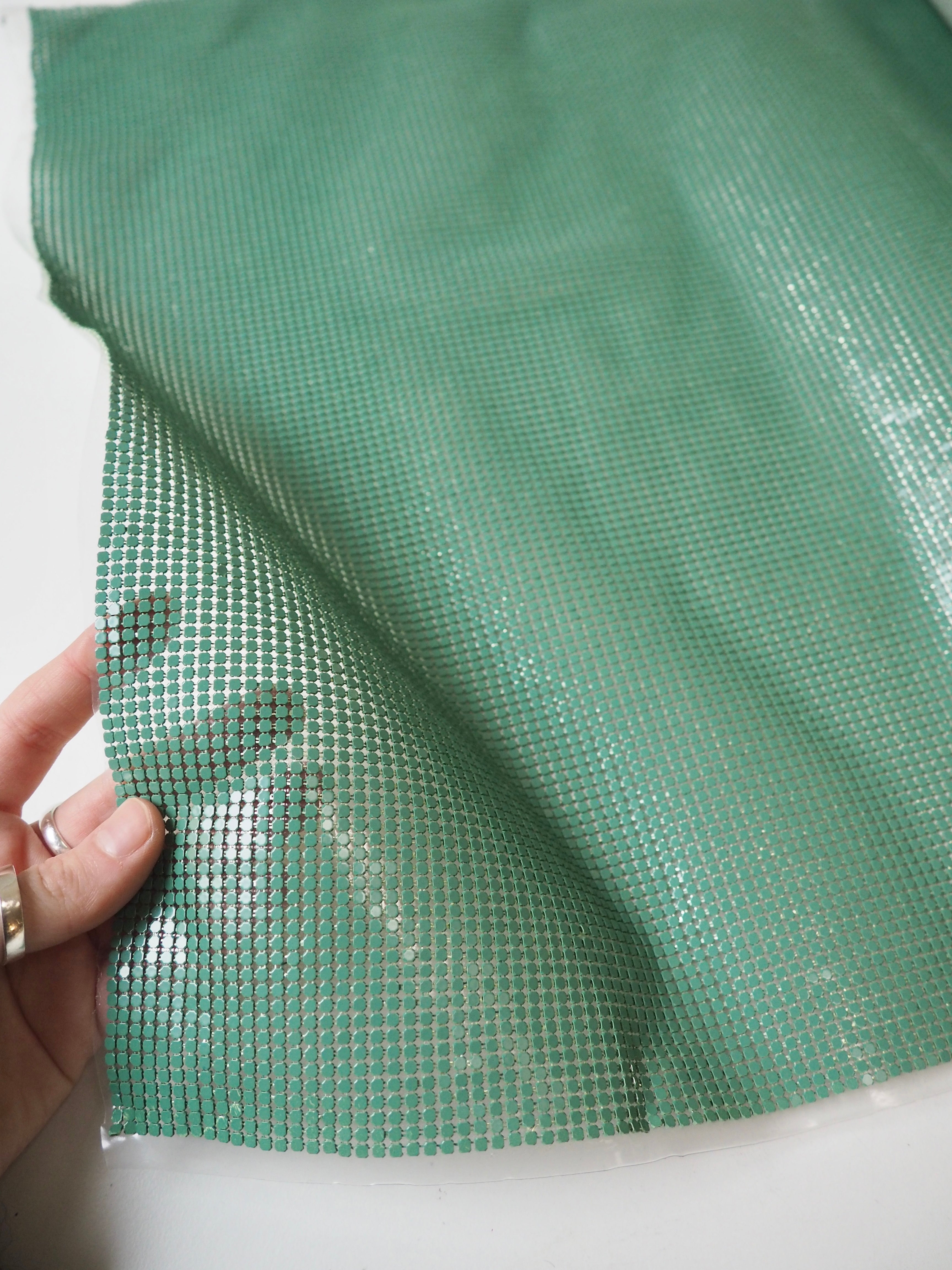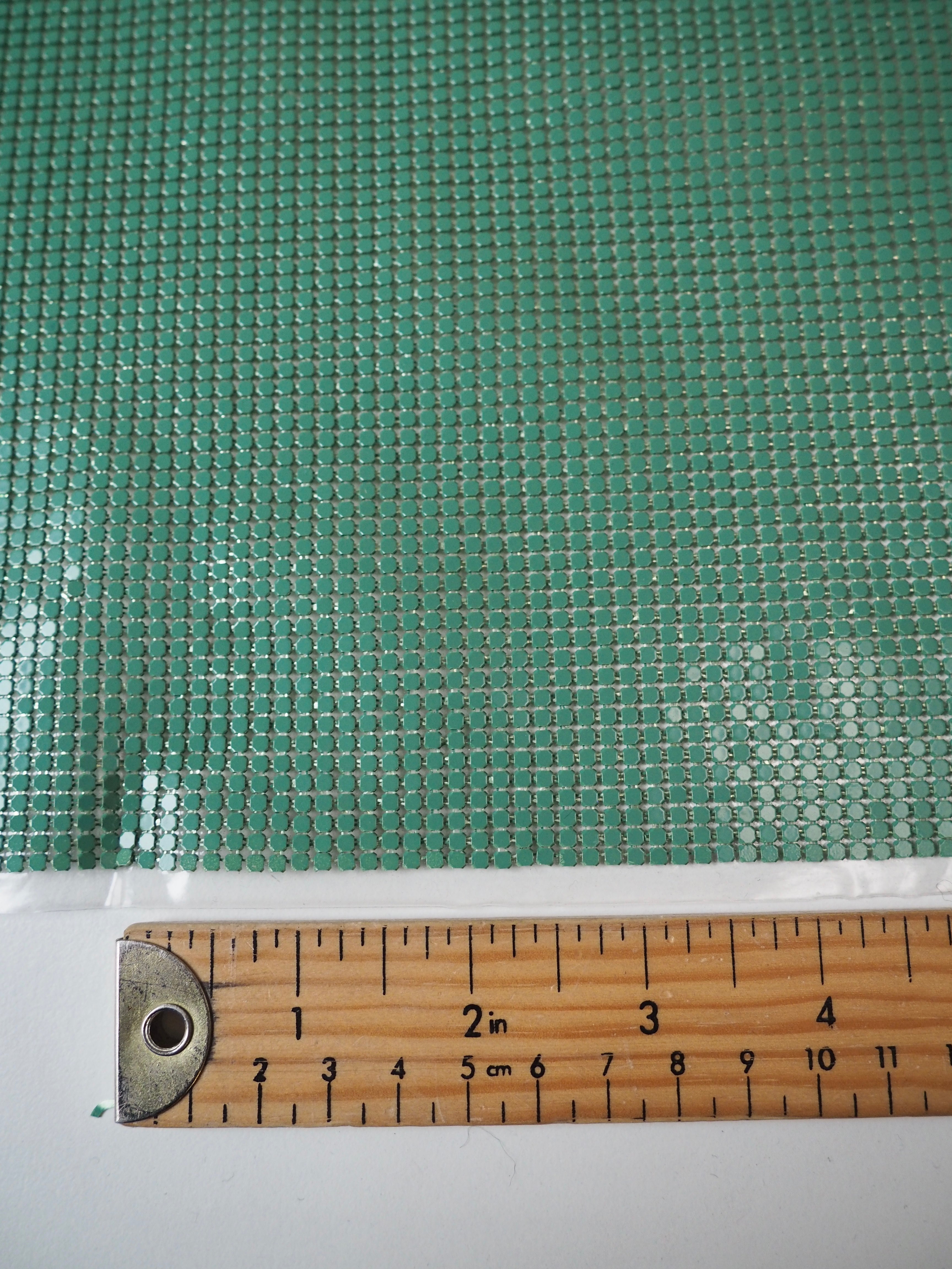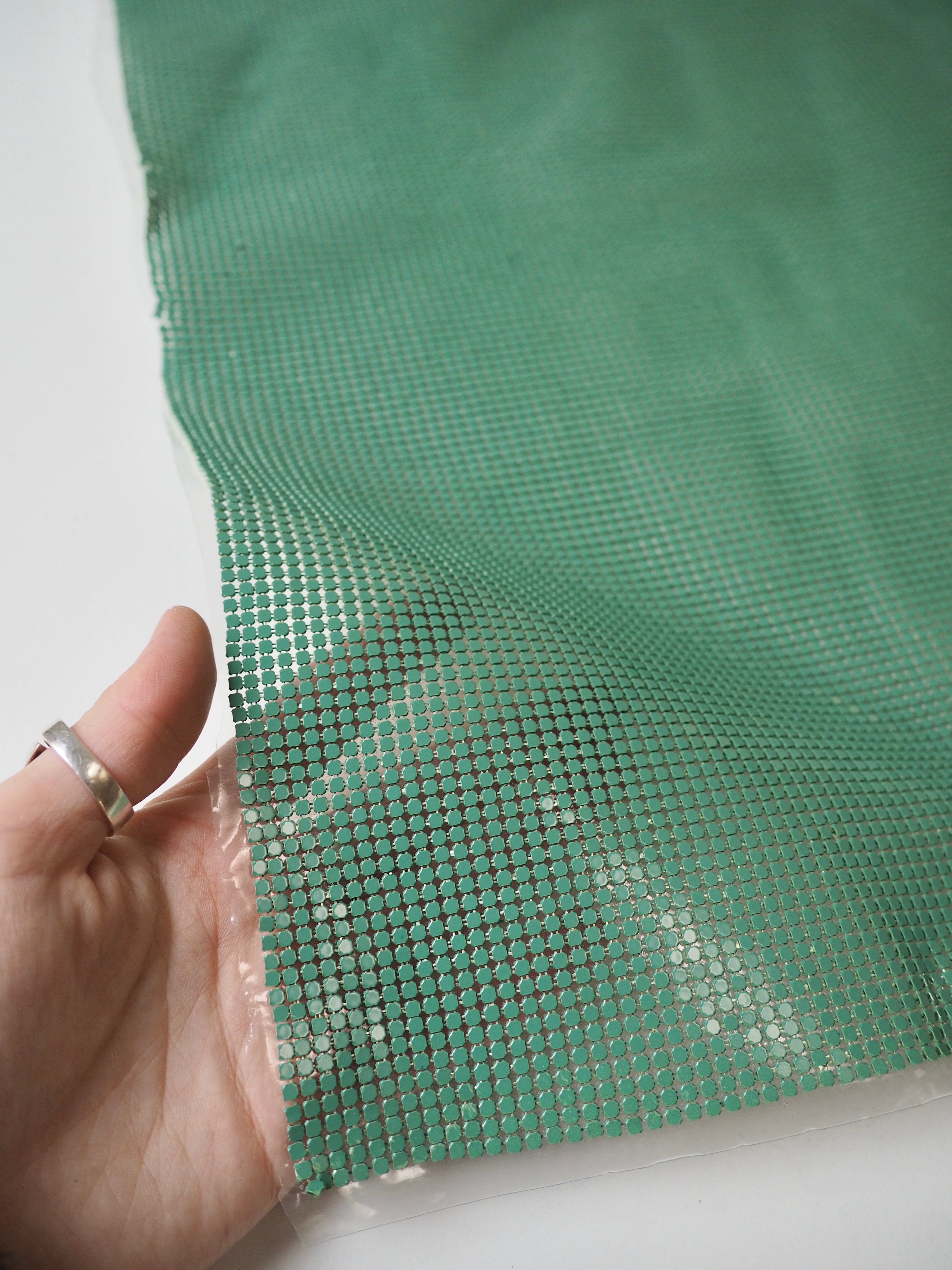 This ex-designer trim is a gorgeous green chainmail. Bright green shiny beadlike chains are meshed together with a matching backing and bonded onto a clear thin plastic backing. The backing secures them into a more rigid but still bendable surface. Medium to heavy weight, with 0.2cm links. Best hand sewn together. We are seeing very 90s chainmail small evening bags and clutches!