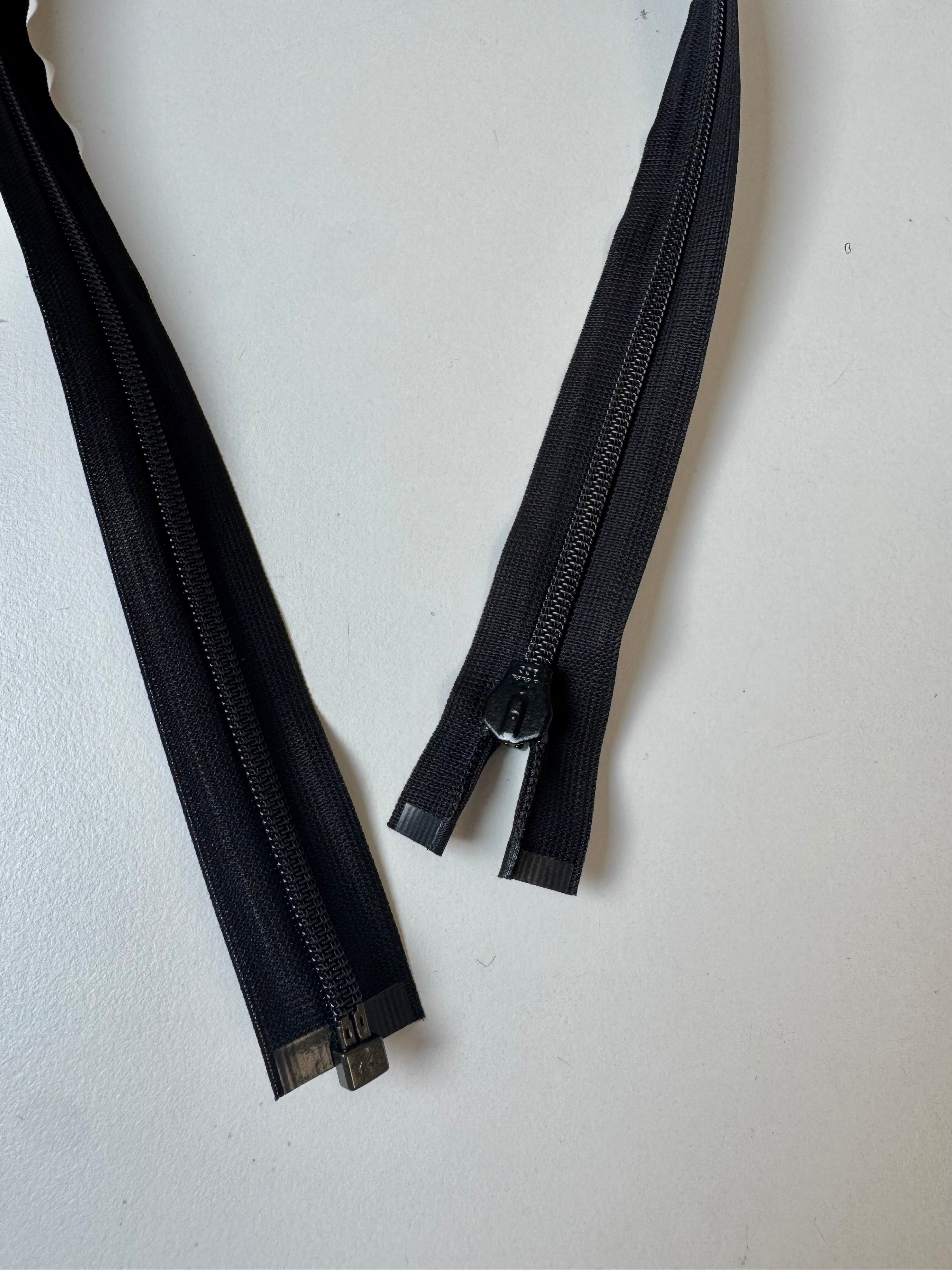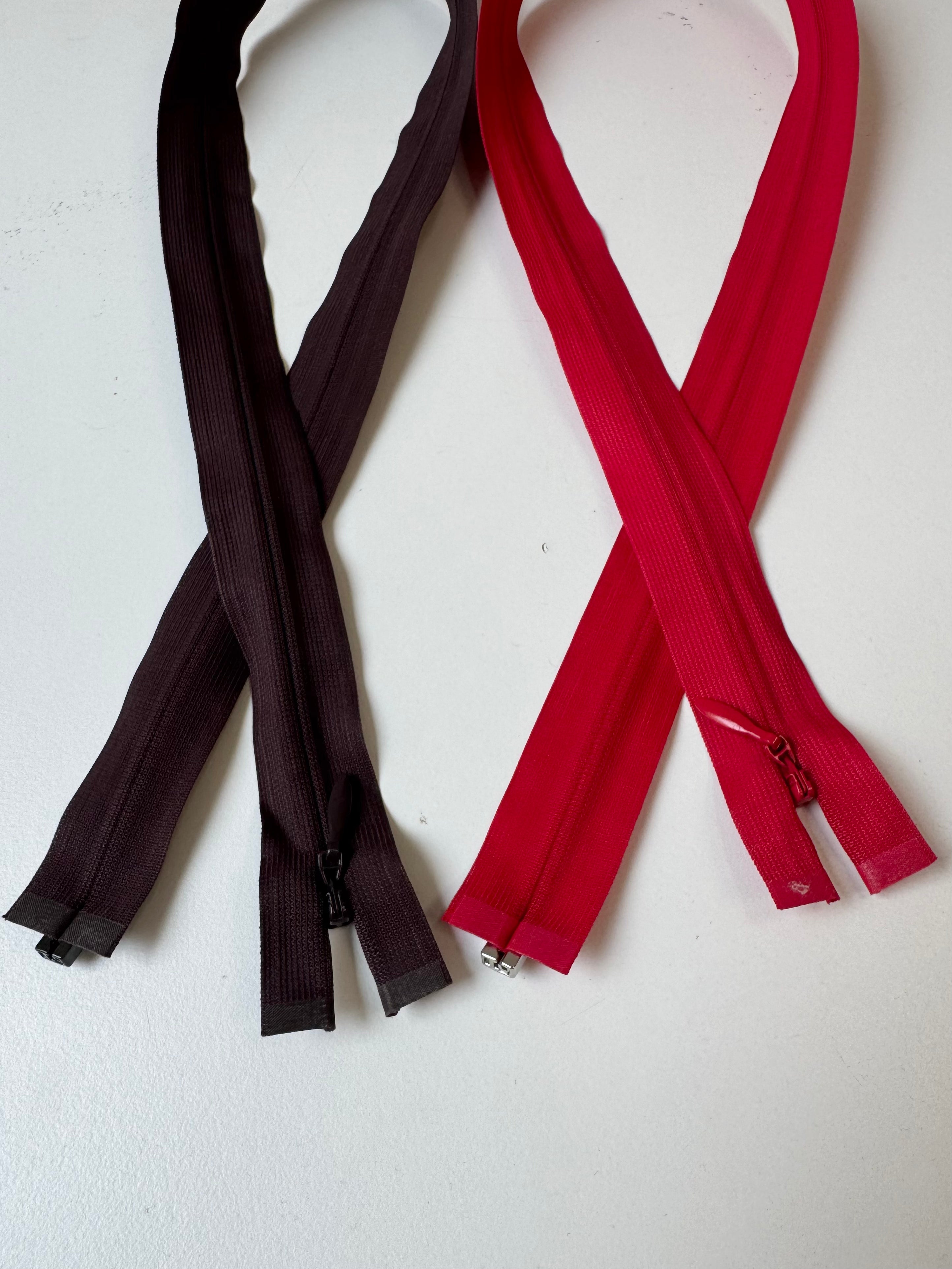 Ex-designer deadstock YKK open ended invisible zips with tonal plastic teeth and metal pull. Perfect for using as a hidden closure!