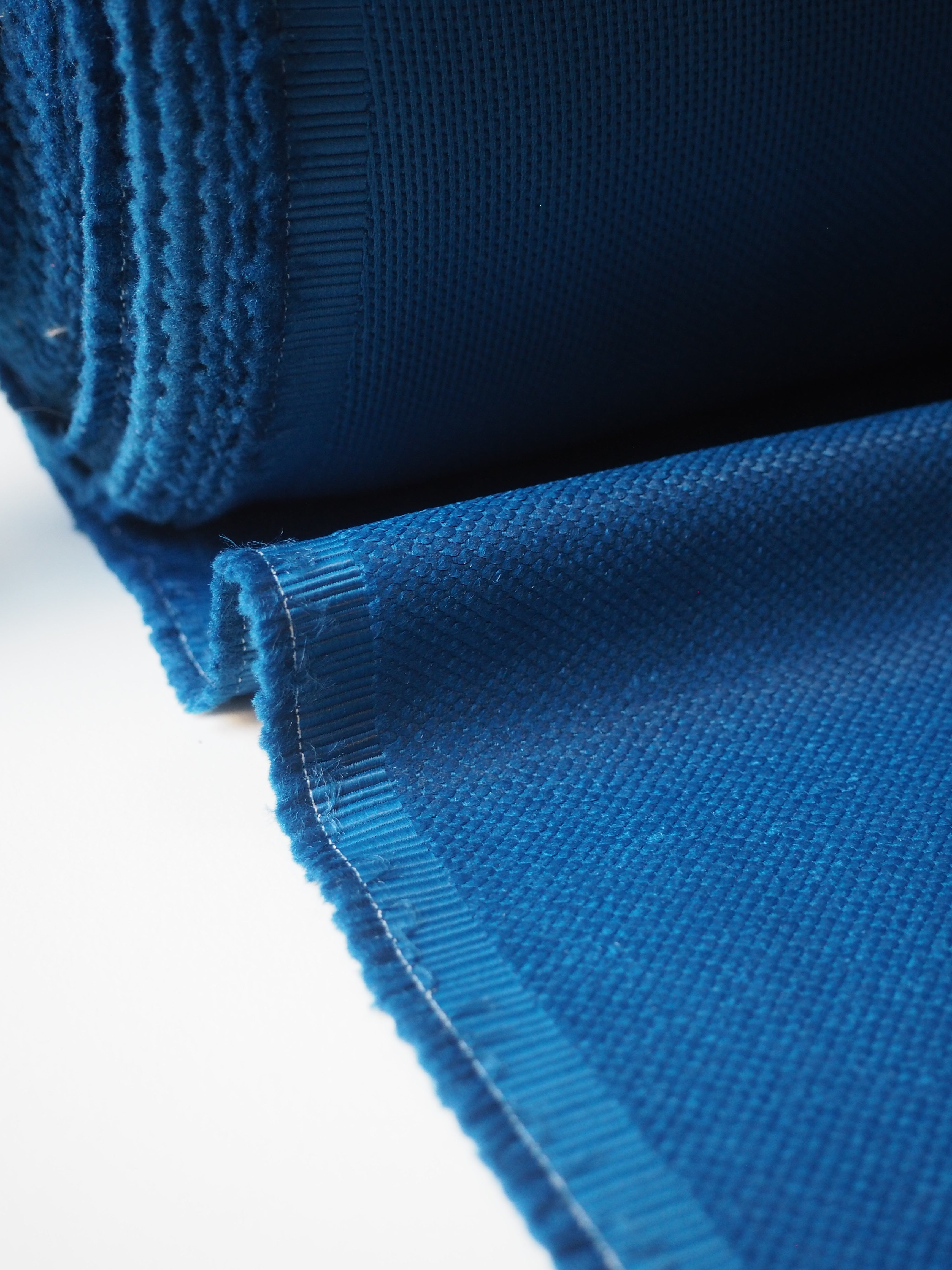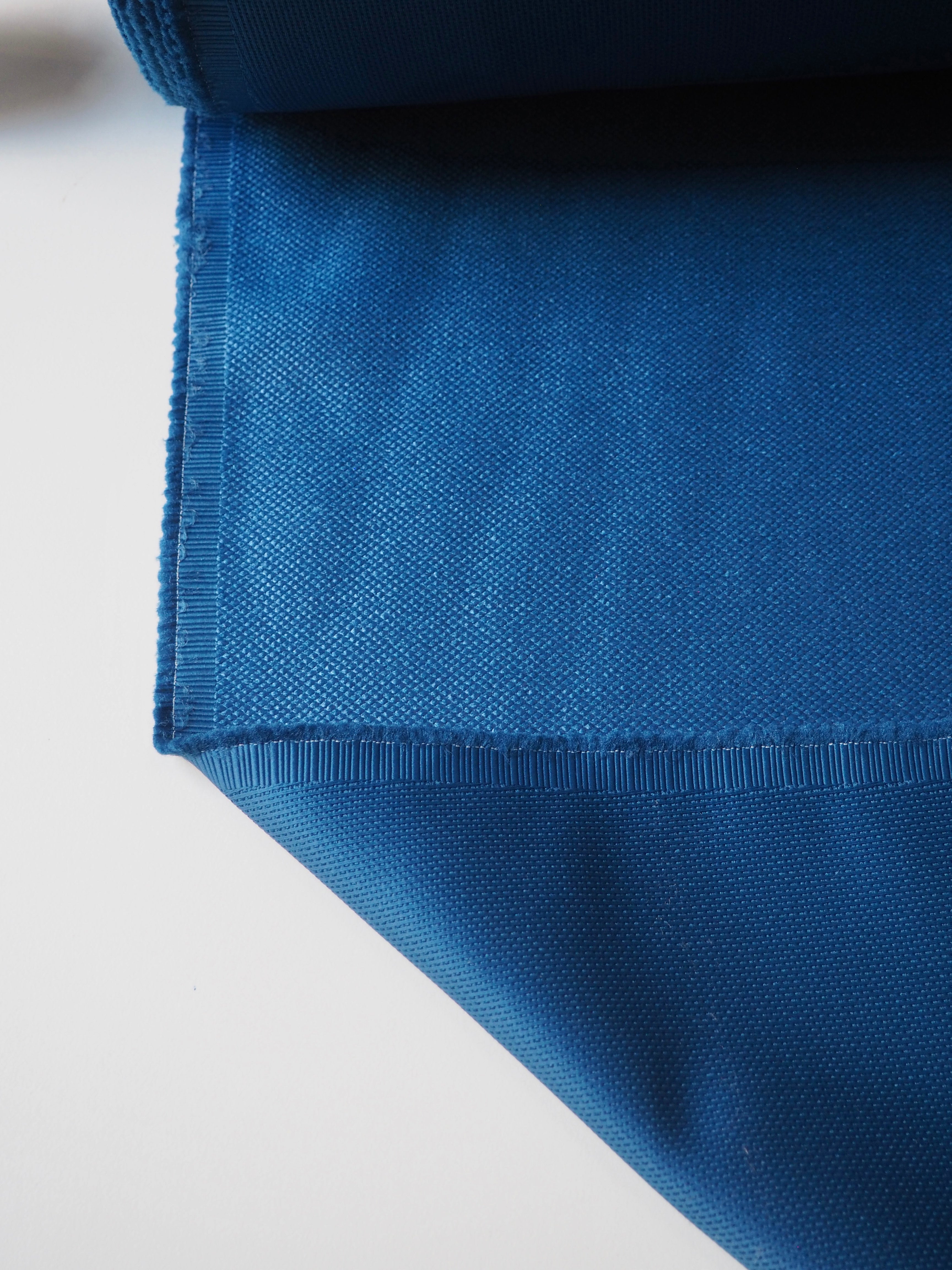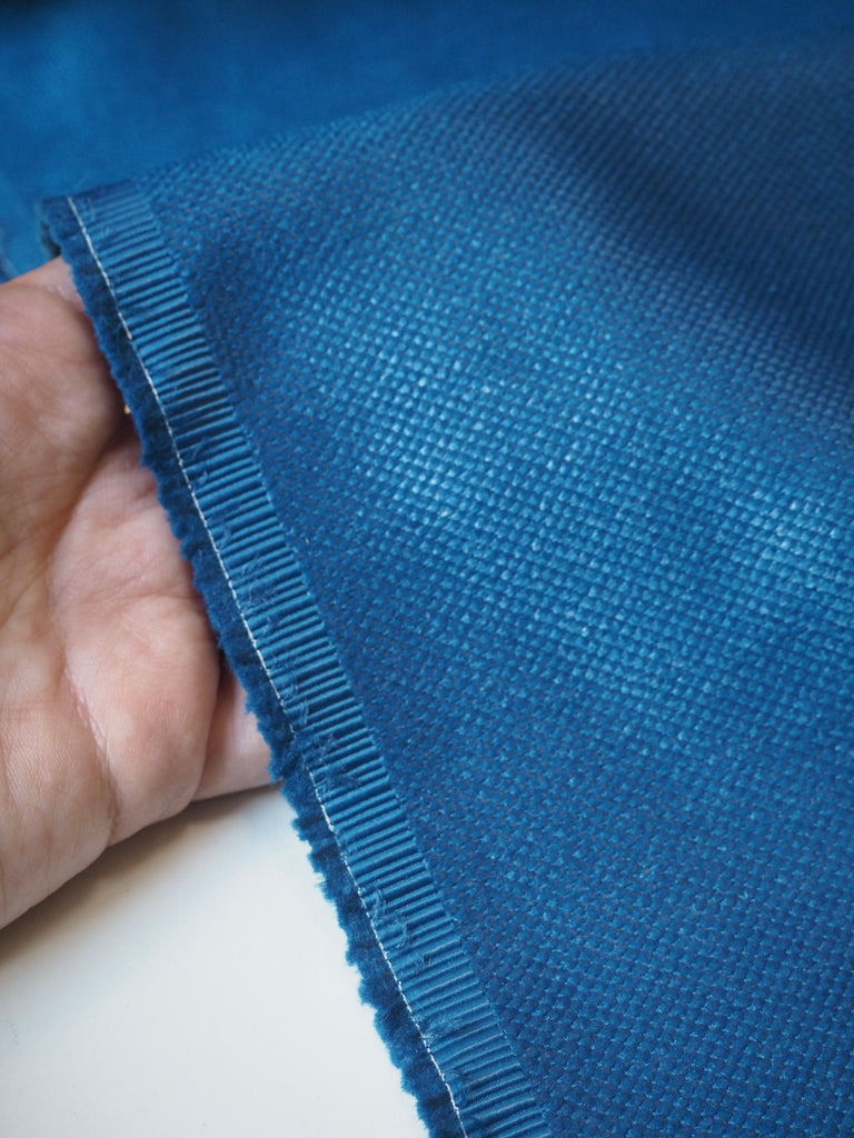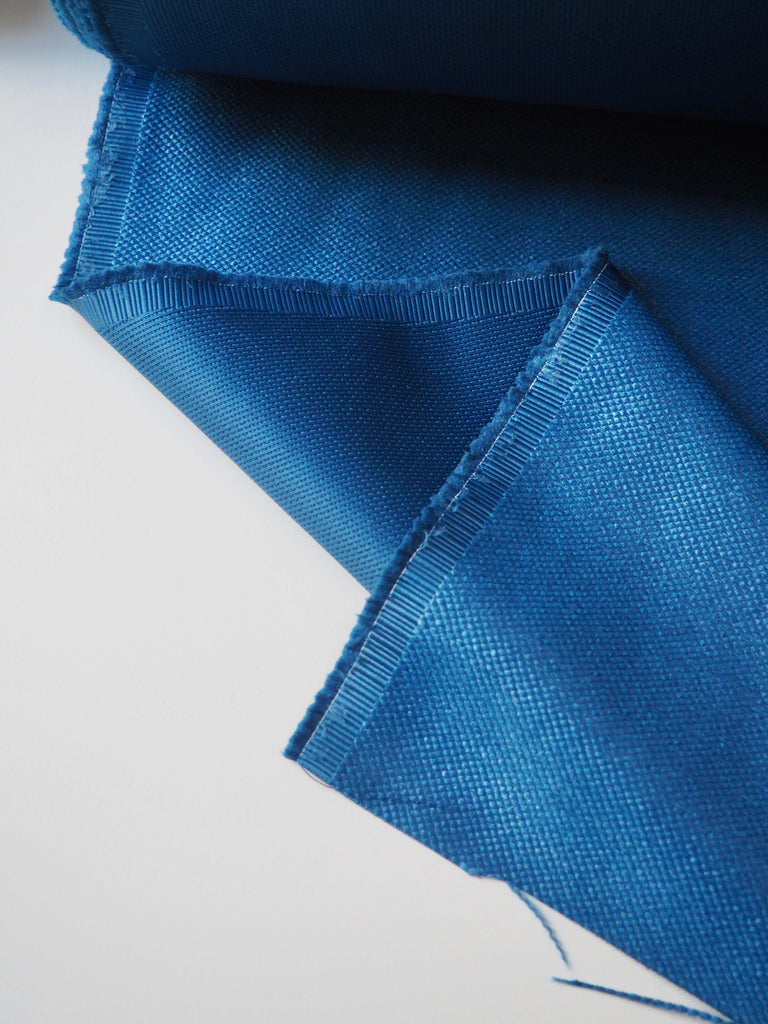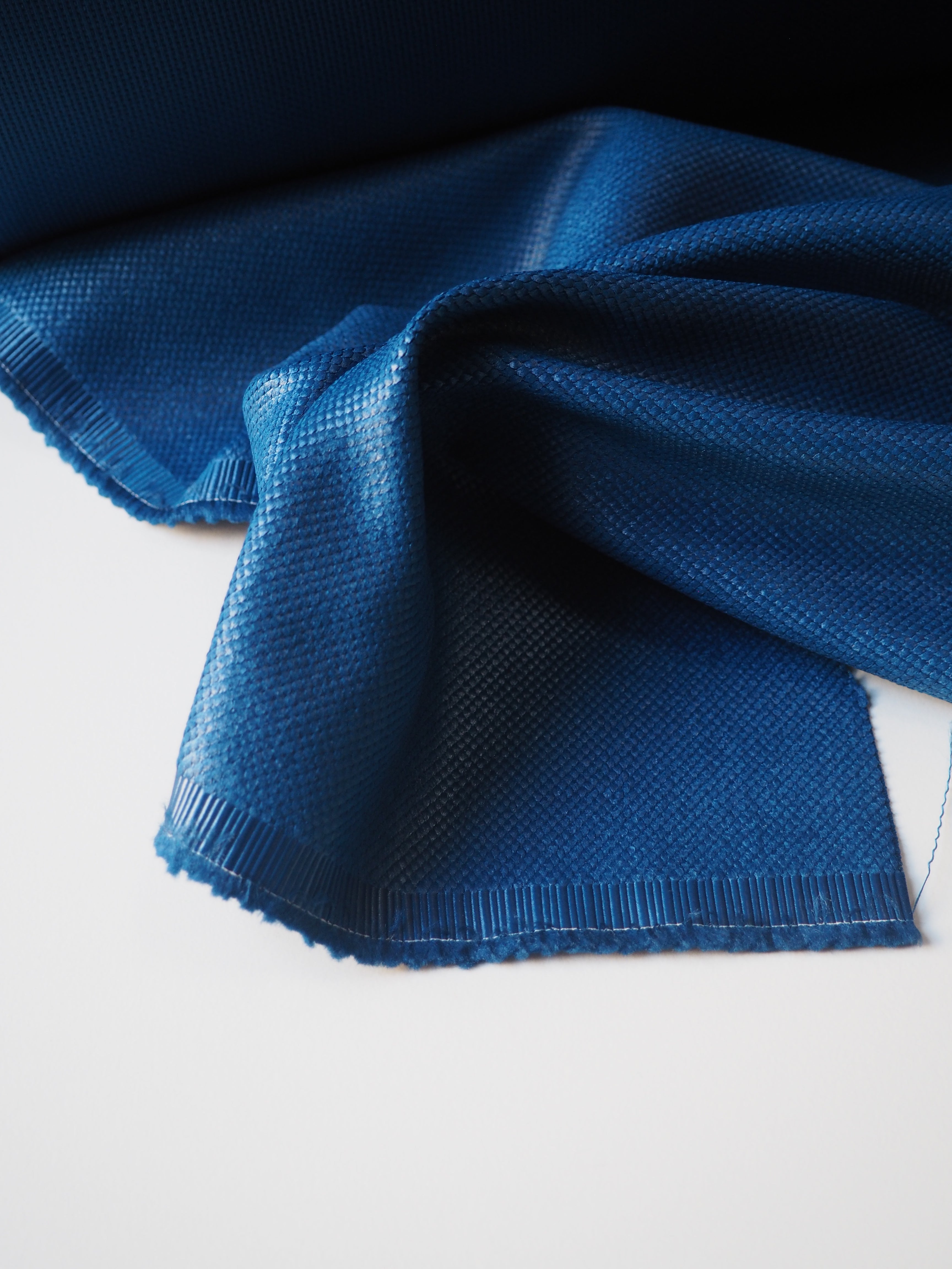 This ex-designer fabric is a jacquard. It's a dotted weave, almost like a golf ball, with a sateen finish. It's medium weight and slightly sponge-y in texture. Opaque and has a soft structure to play with. Great for jackets, or even furnishings!