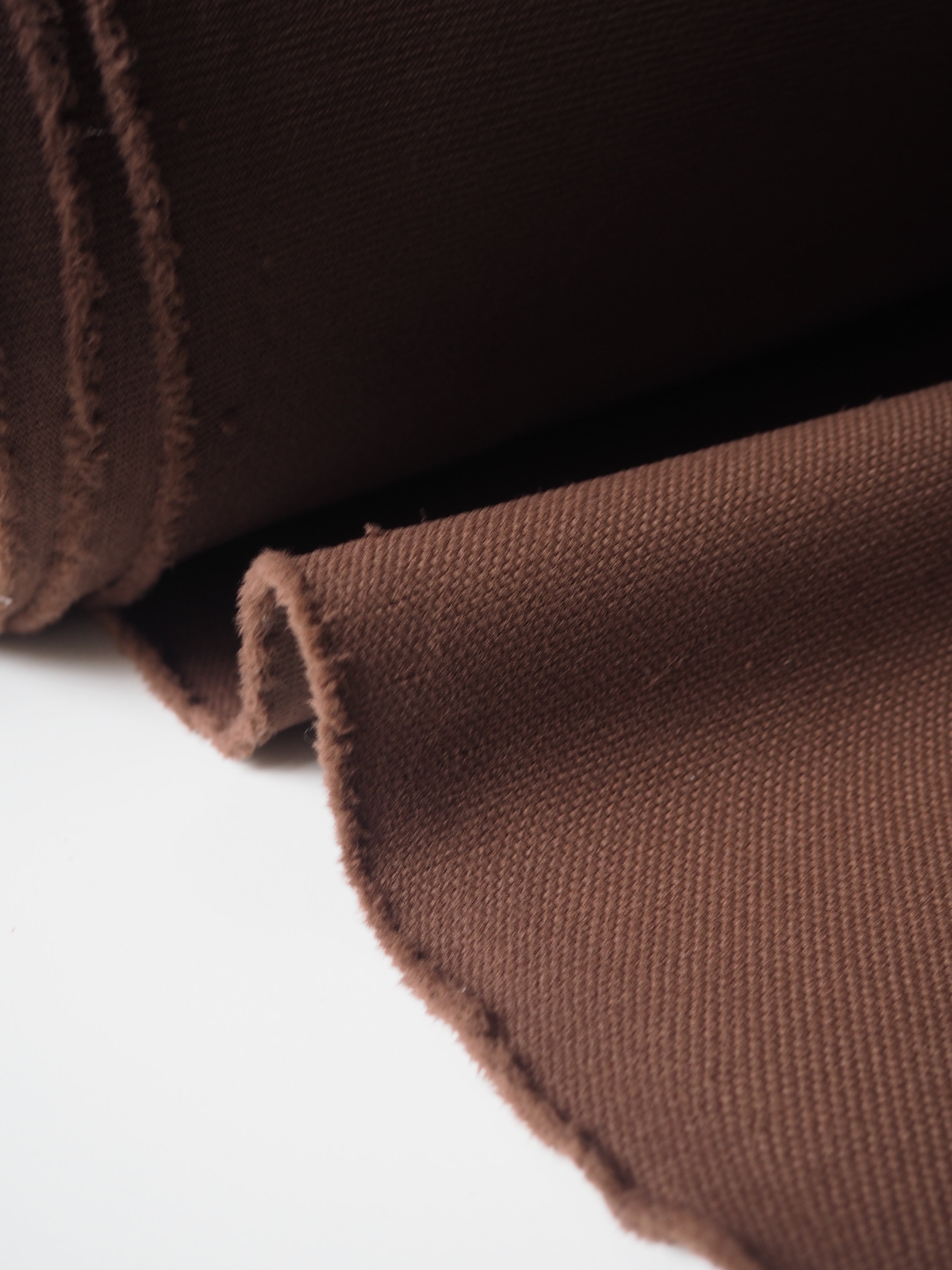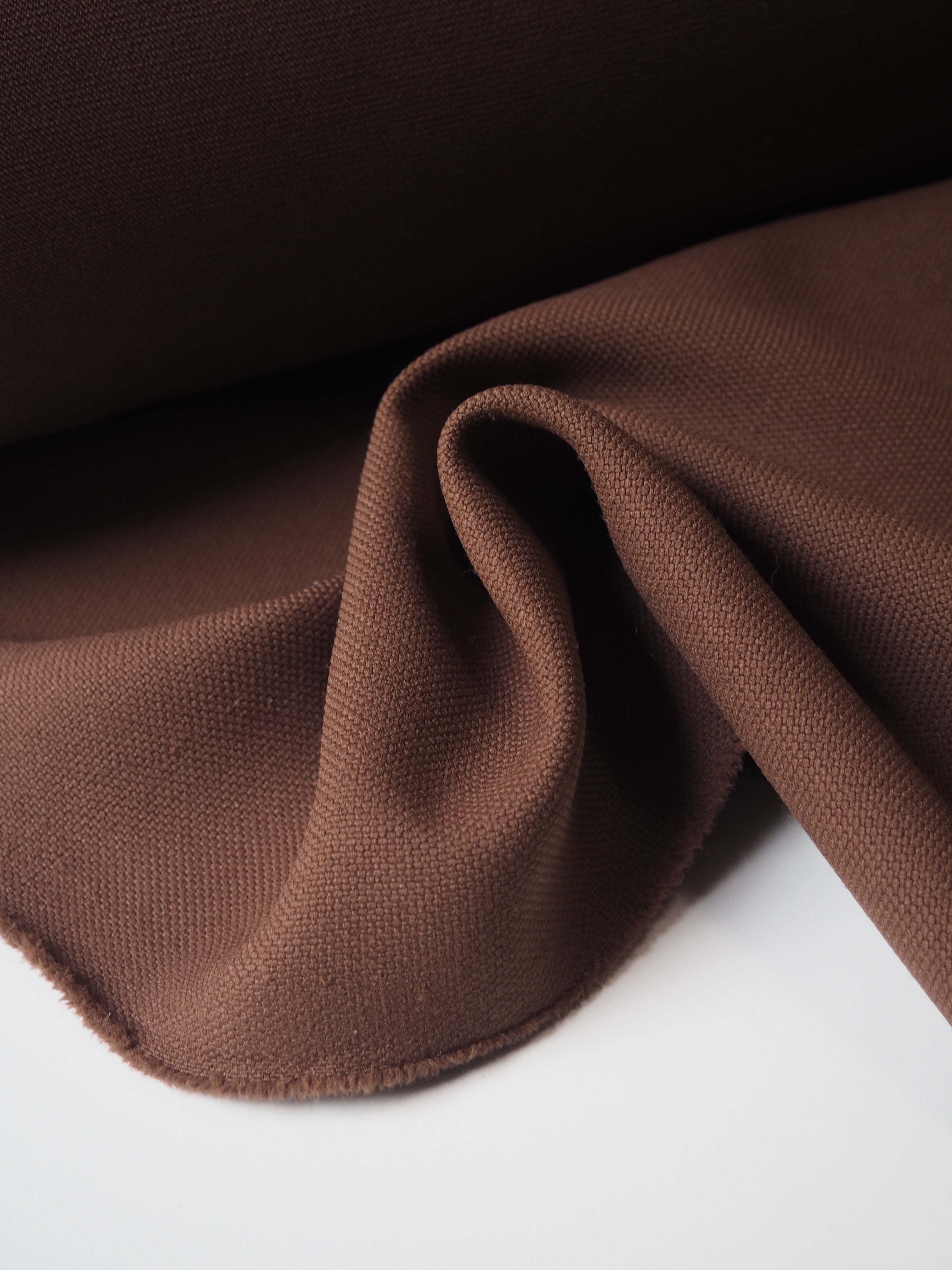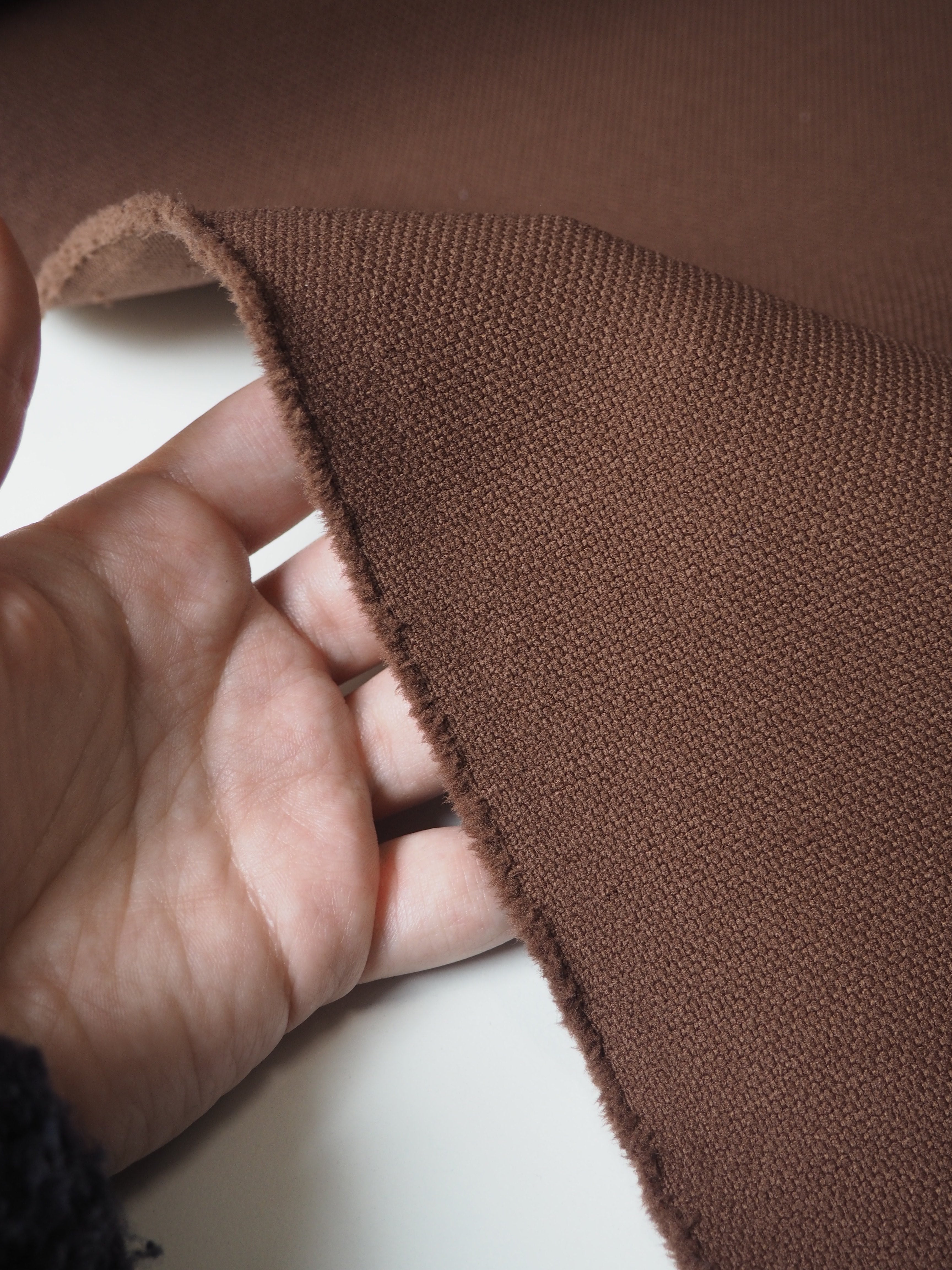 This ex-designer fabric is a jacquard. It has a subtly textured topside and a twill-like woven reverse. It's medium weight with a soft and bouncy handle. Has a gentle 5-10% stretch. Opaque with a good structure to play with. Would be good for a tote bag or boxy jacket!