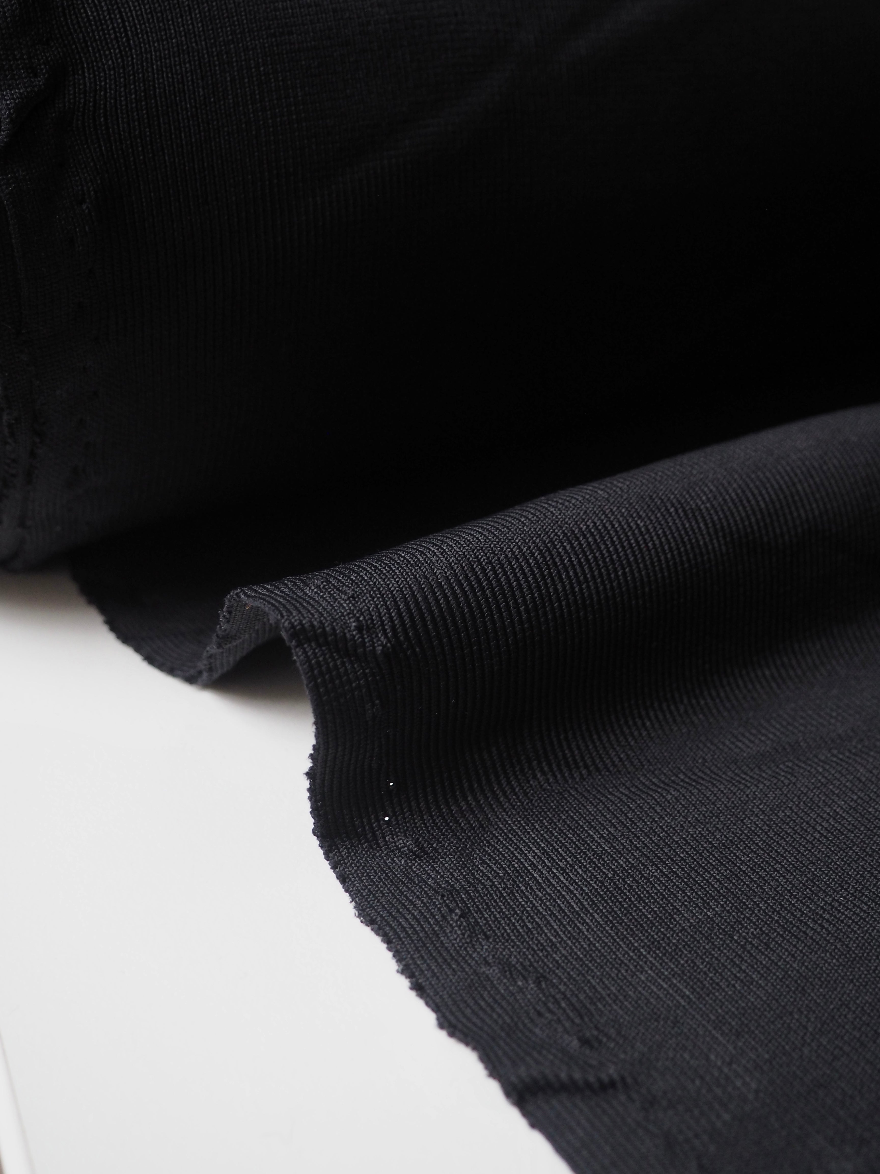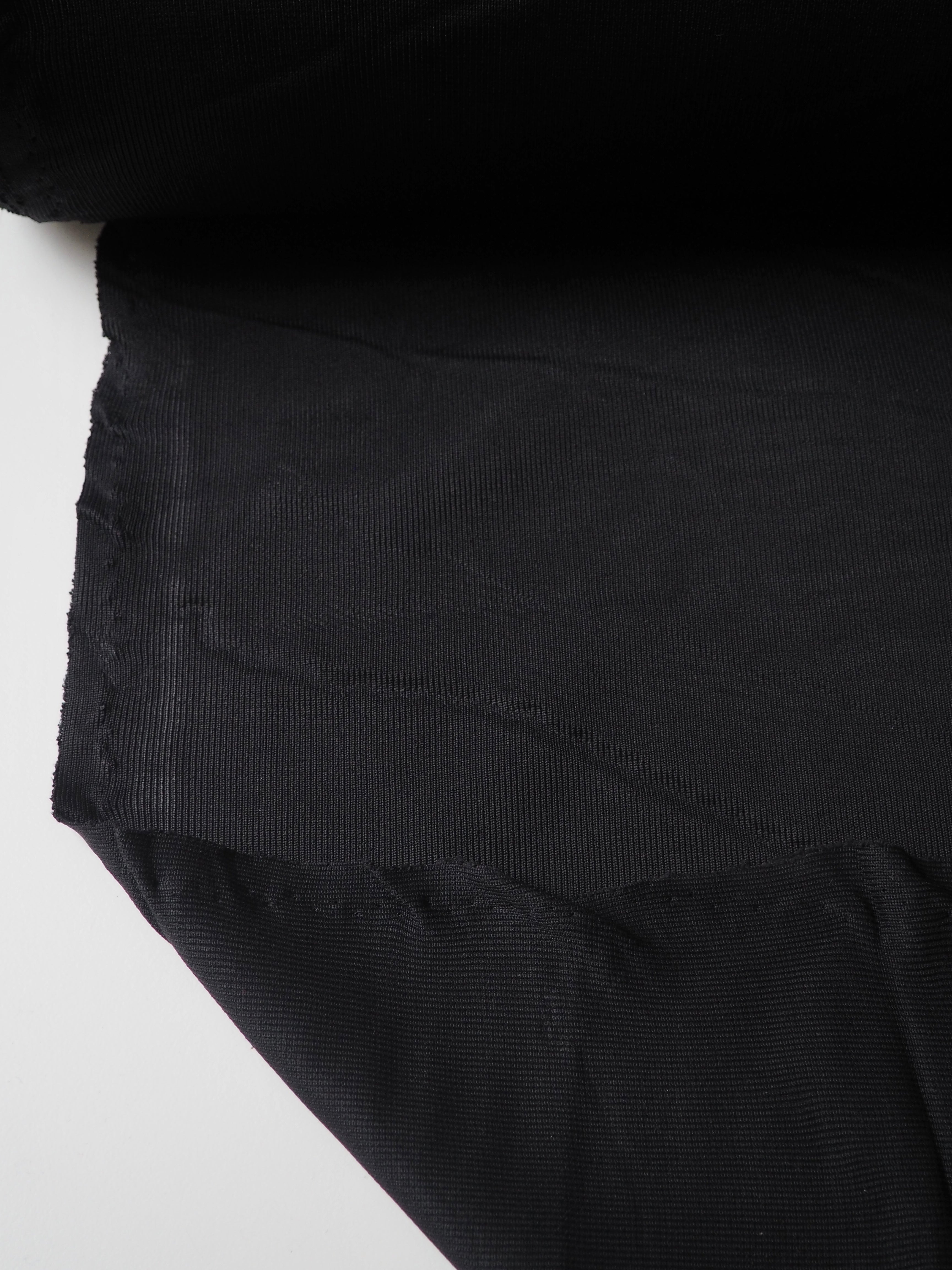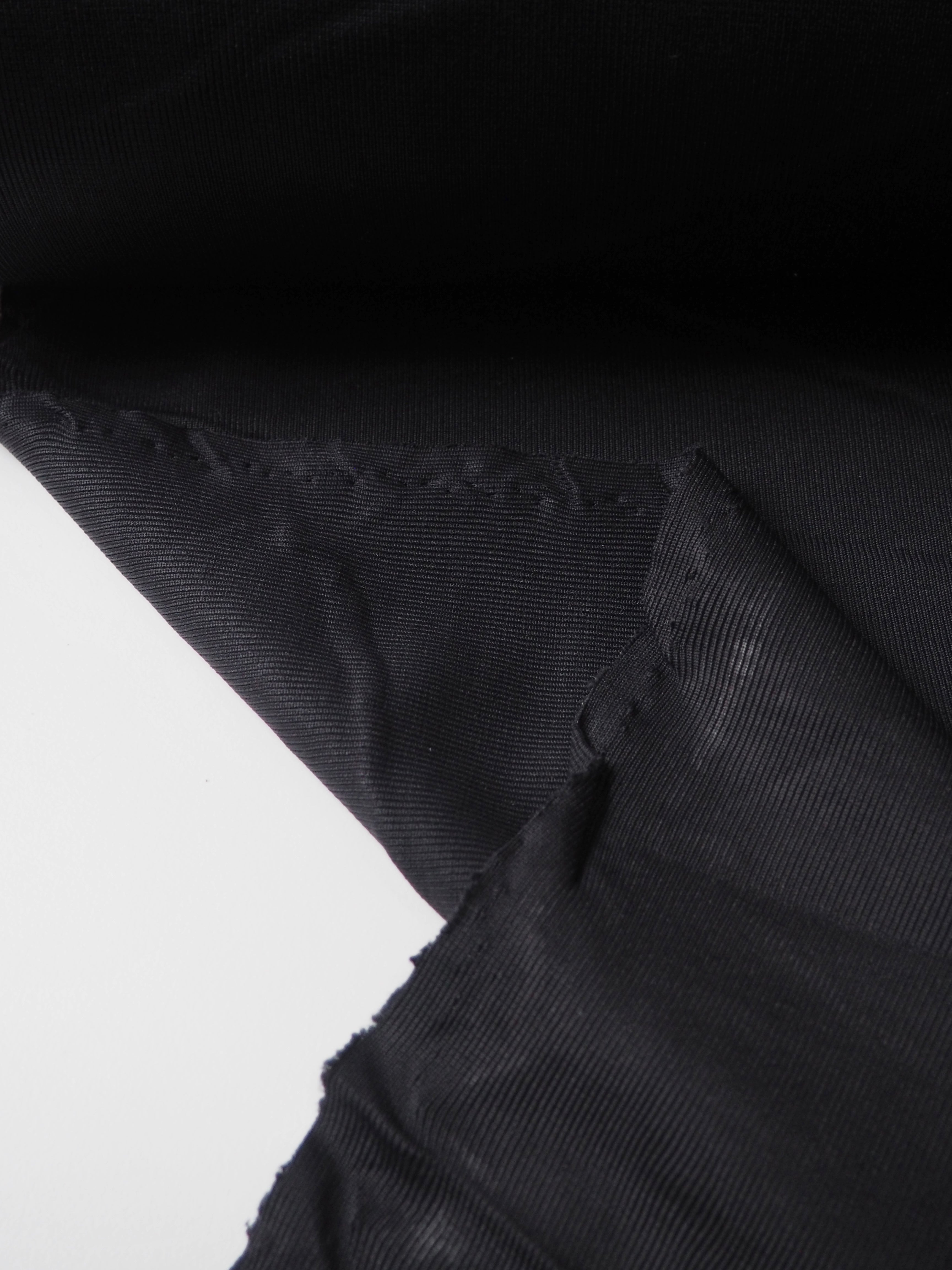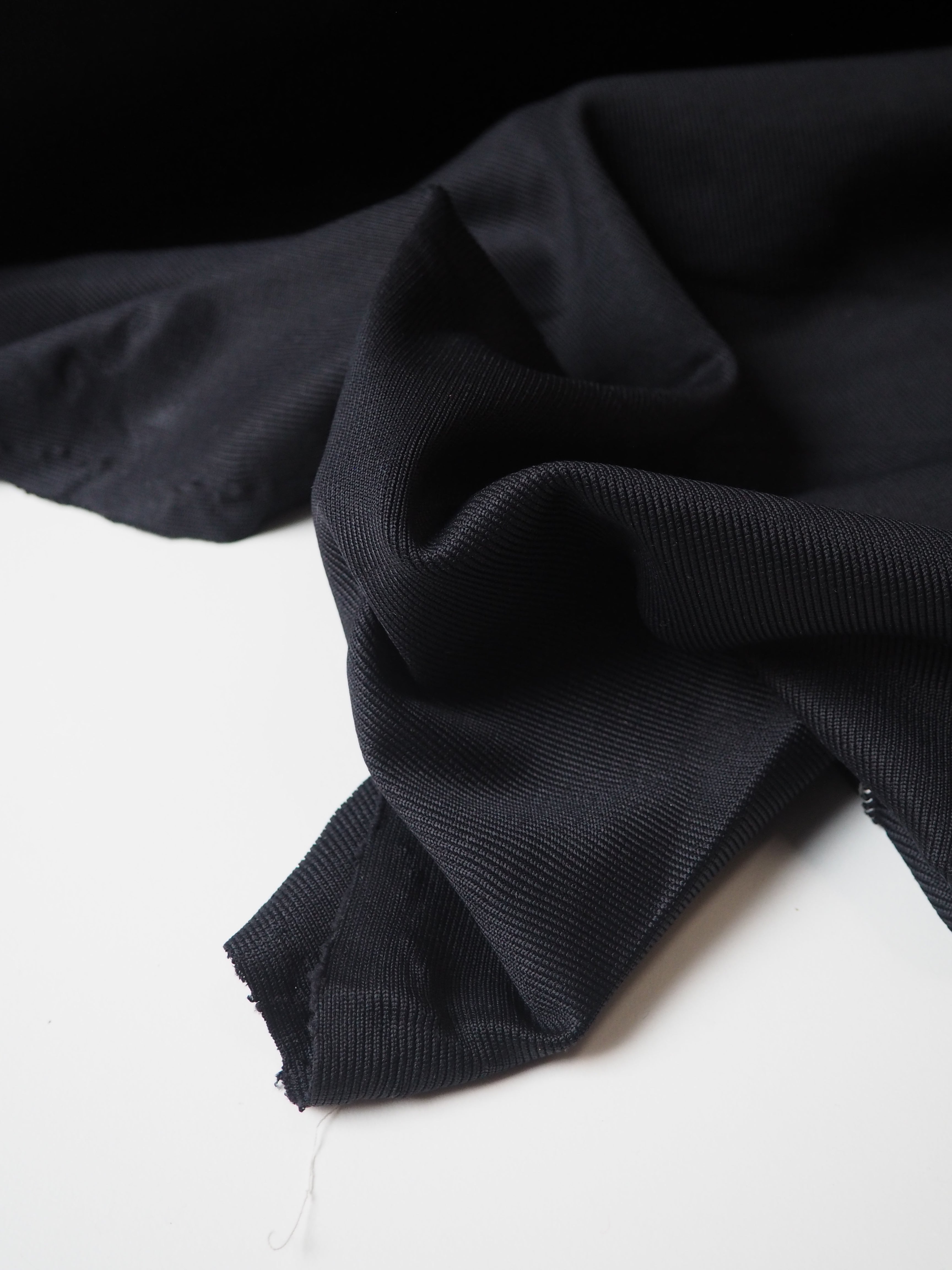 This ex-designer fabric is a rib knit jersey. It's a 1x1 rib knit structure, with a heavier handle. Medium weight with a good structure, and slightly heavier drape. Has a gentle sheen finish and a more resistant stretch, about 20%. Ideal for a pullover!